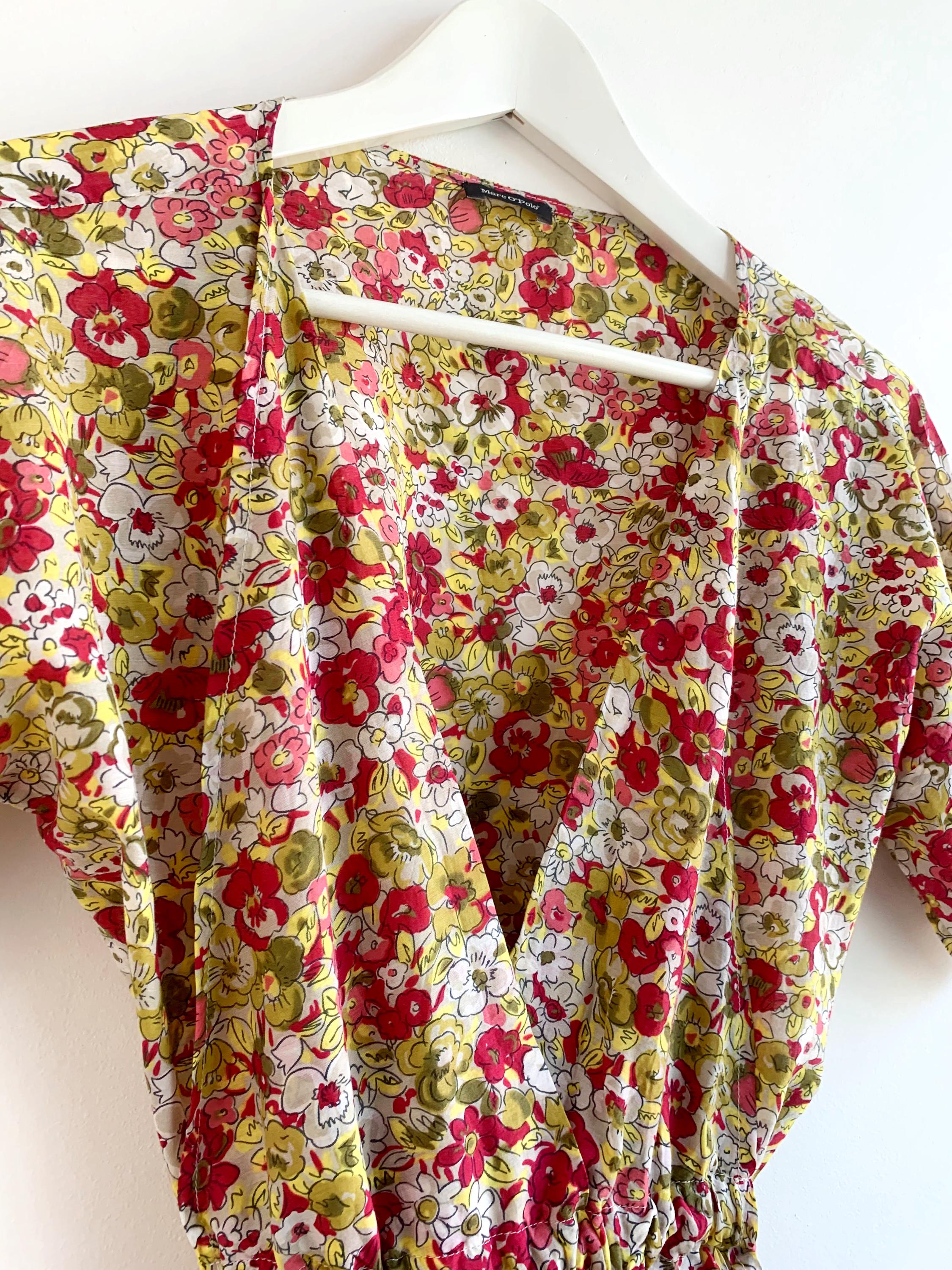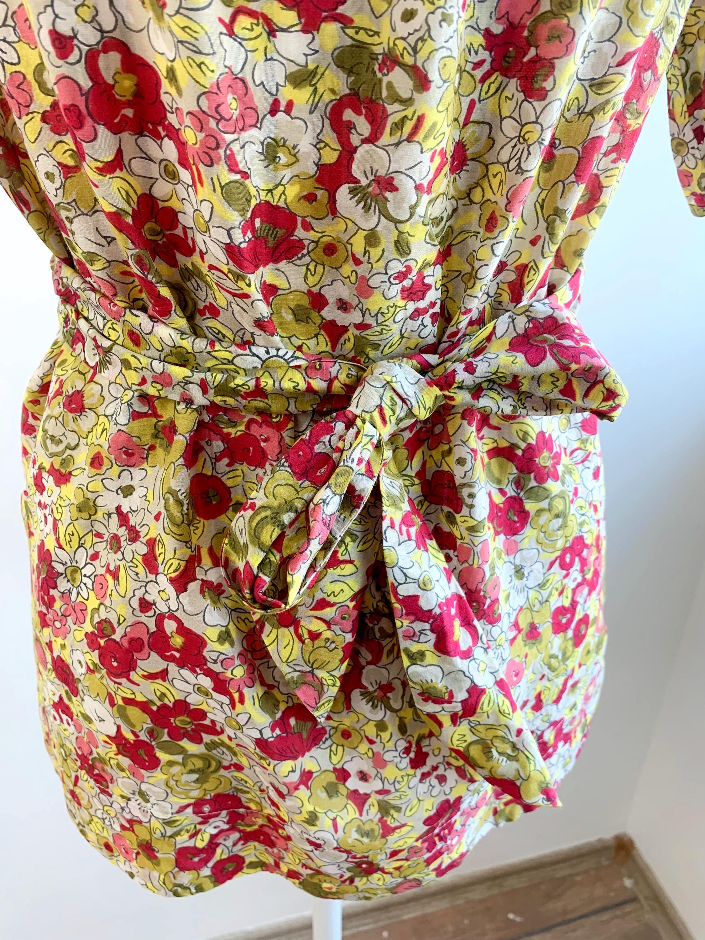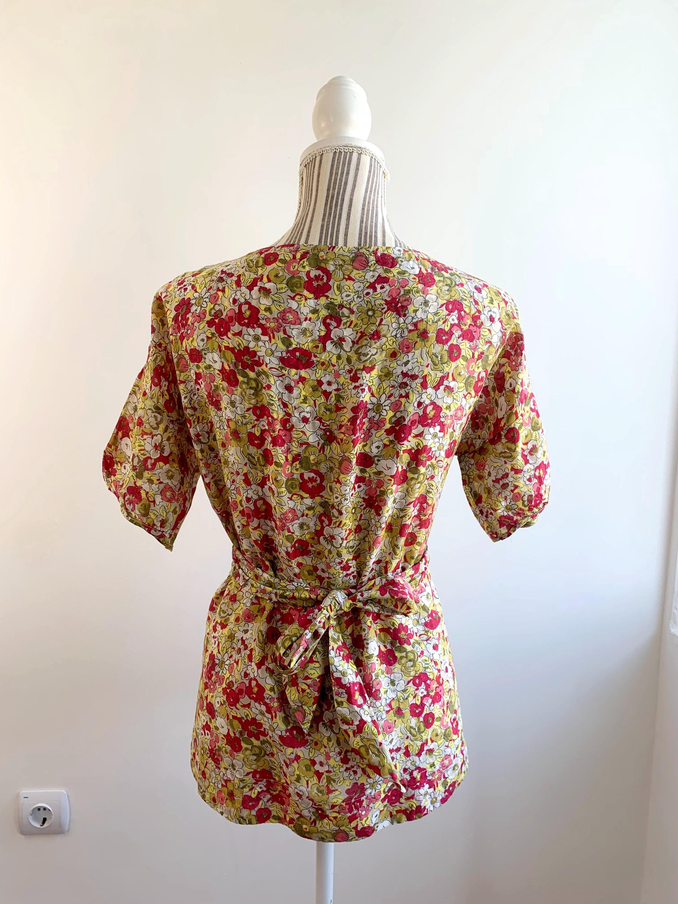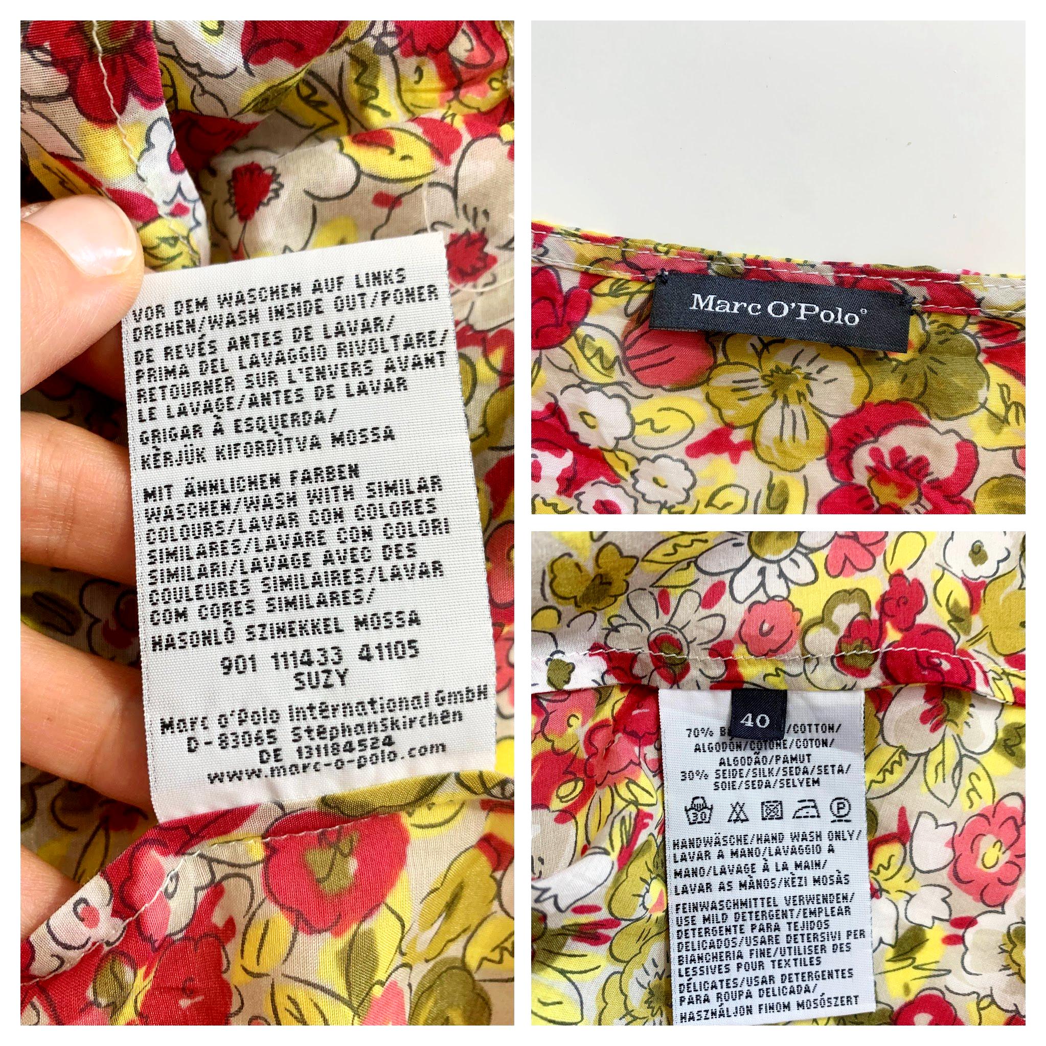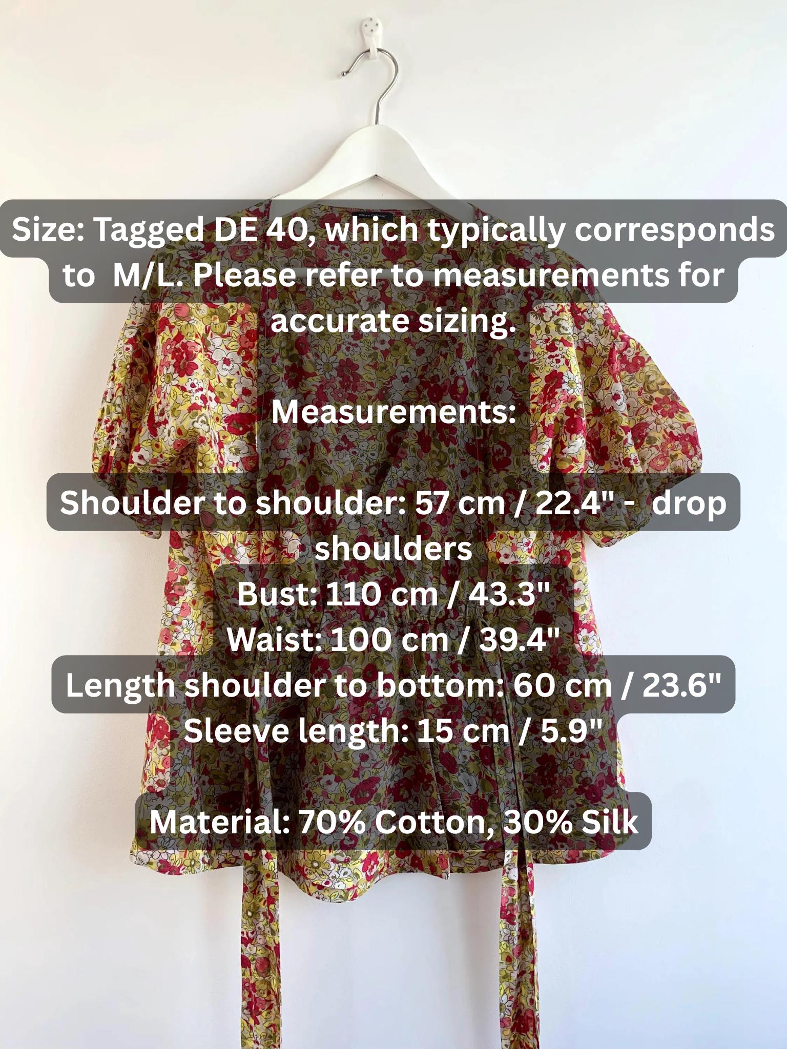 This charming vintage Marc O'Polo cotton and silk wrap style pullober blouse is a delightful find for anyone who loves unique, feminine pieces with a touch of nostalgia. Featuring a vibrant ditsy floral print in shades of red, yellow, and green, this feminine top embodies a cheerful cottagecore aesthetic perfect for spring and summer. The relaxed, short-sleeved silhouette with its elasticated waist offers a comfortable yet flattering fit, while the subtle V-neck creates an elegant neckline. The fabric is all natural with it's 70% cotton and 30% silk, this belted shirt provides luxurious feel, making this stulling piece a must have for the summer season. Whether you're dressing it up for a garden party or keeping it casual for a sunny day out, this versatile blouse is sure to become a beloved addition to your vintage wardrobe.