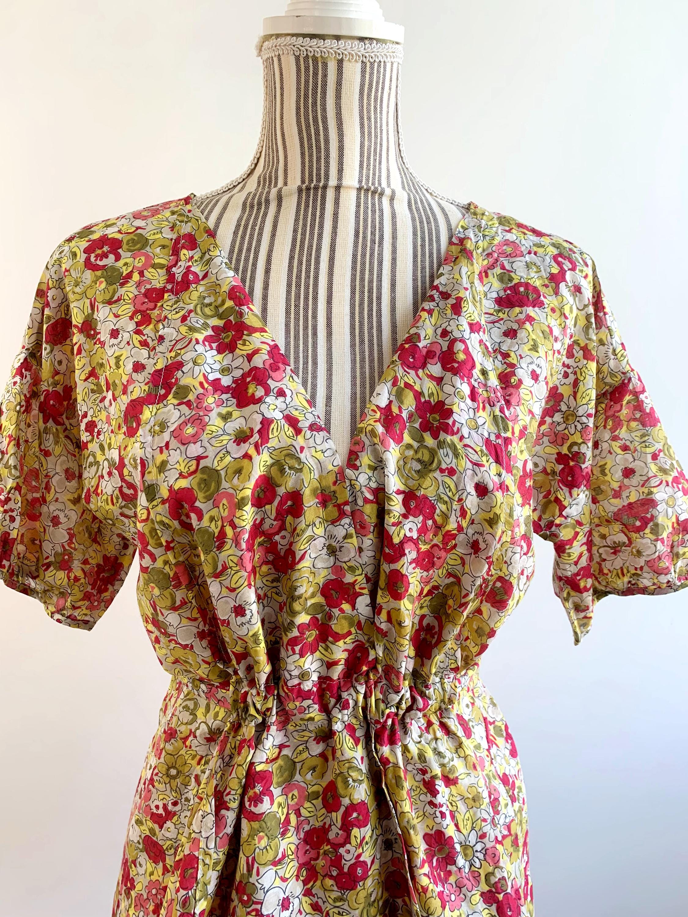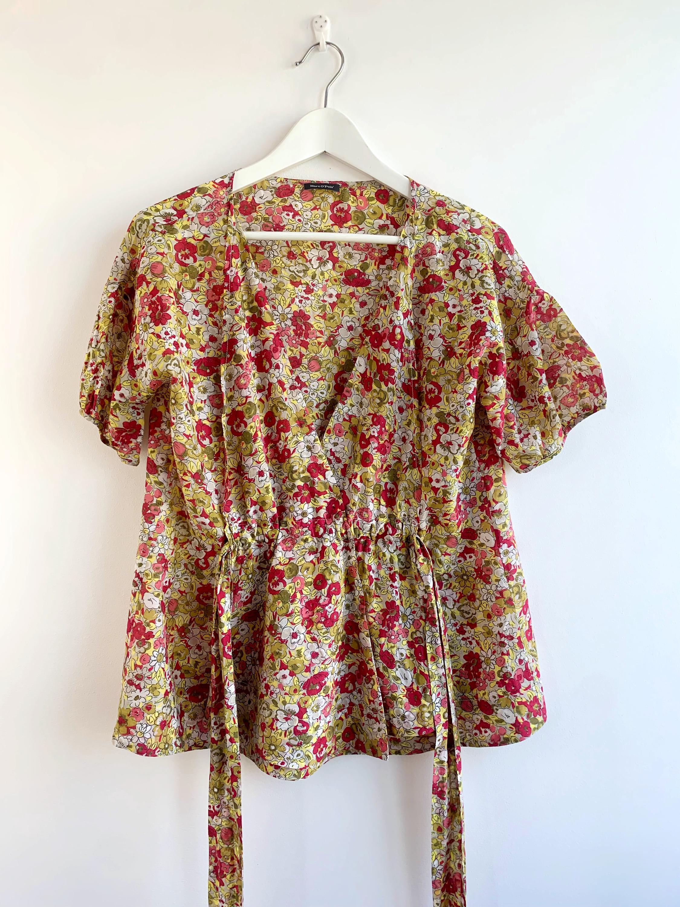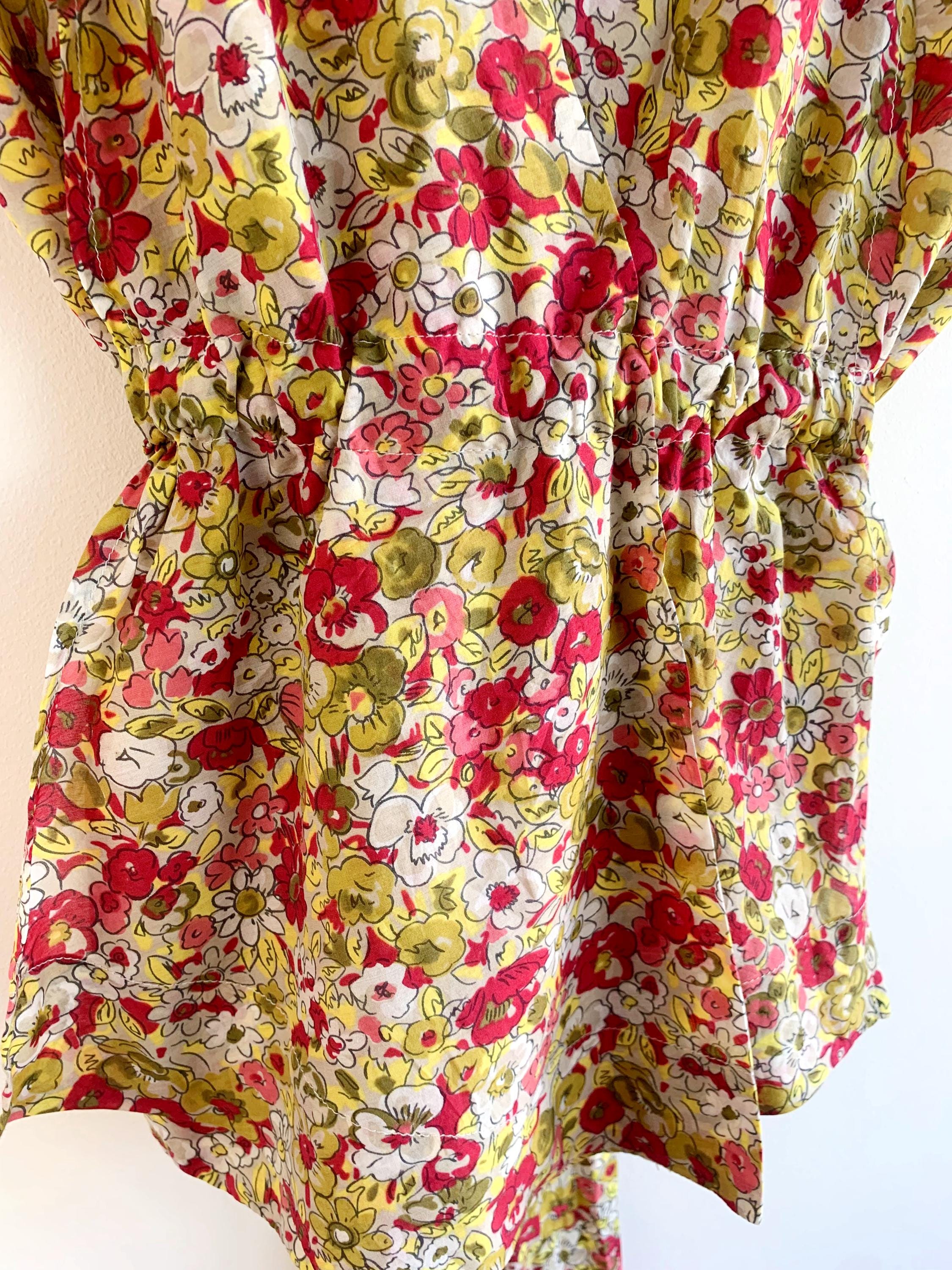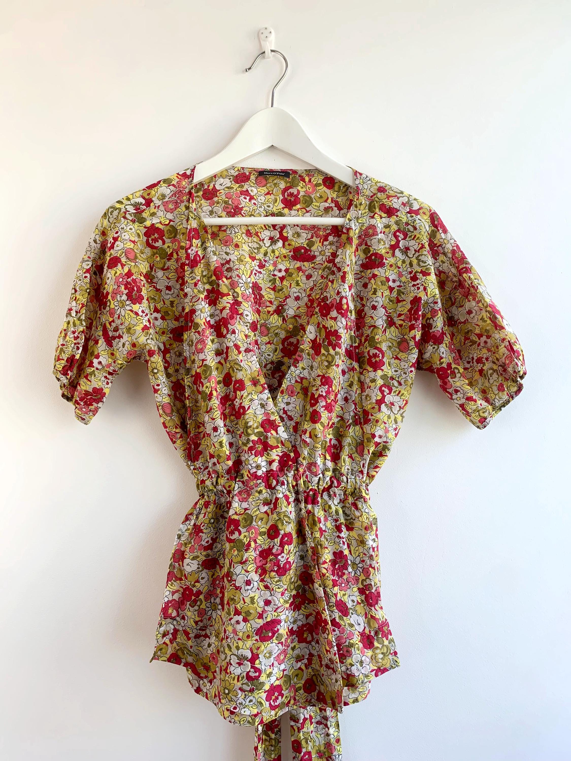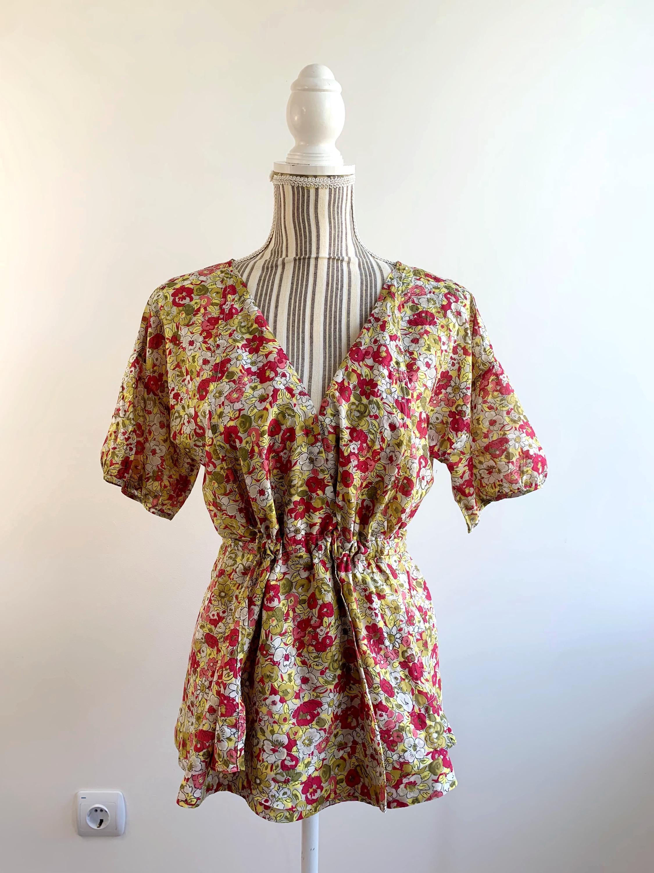 This charming vintage Marc O'Polo cotton and silk wrap style pullober blouse is a delightful find for anyone who loves unique, feminine pieces with a touch of nostalgia. Featuring a vibrant ditsy floral print in shades of red, yellow, and green, this feminine top embodies a cheerful cottagecore aesthetic perfect for spring and summer. The relaxed, short-sleeved silhouette with its elasticated waist offers a comfortable yet flattering fit, while the subtle V-neck creates an elegant neckline. The fabric is all natural with it's 70% cotton and 30% silk, this belted shirt provides luxurious feel, making this stulling piece a must have for the summer season. Whether you're dressing it up for a garden party or keeping it casual for a sunny day out, this versatile blouse is sure to become a beloved addition to your vintage wardrobe.