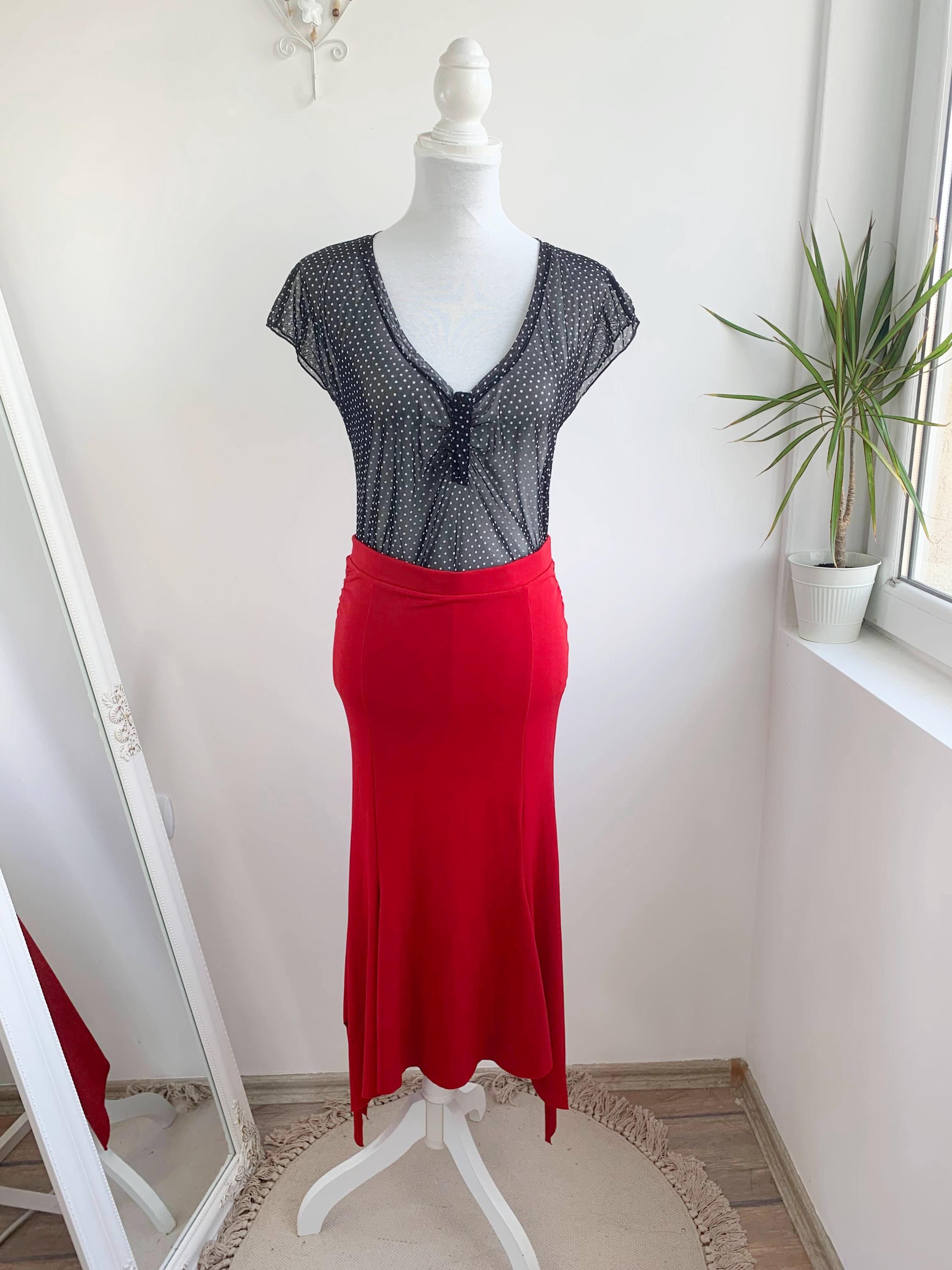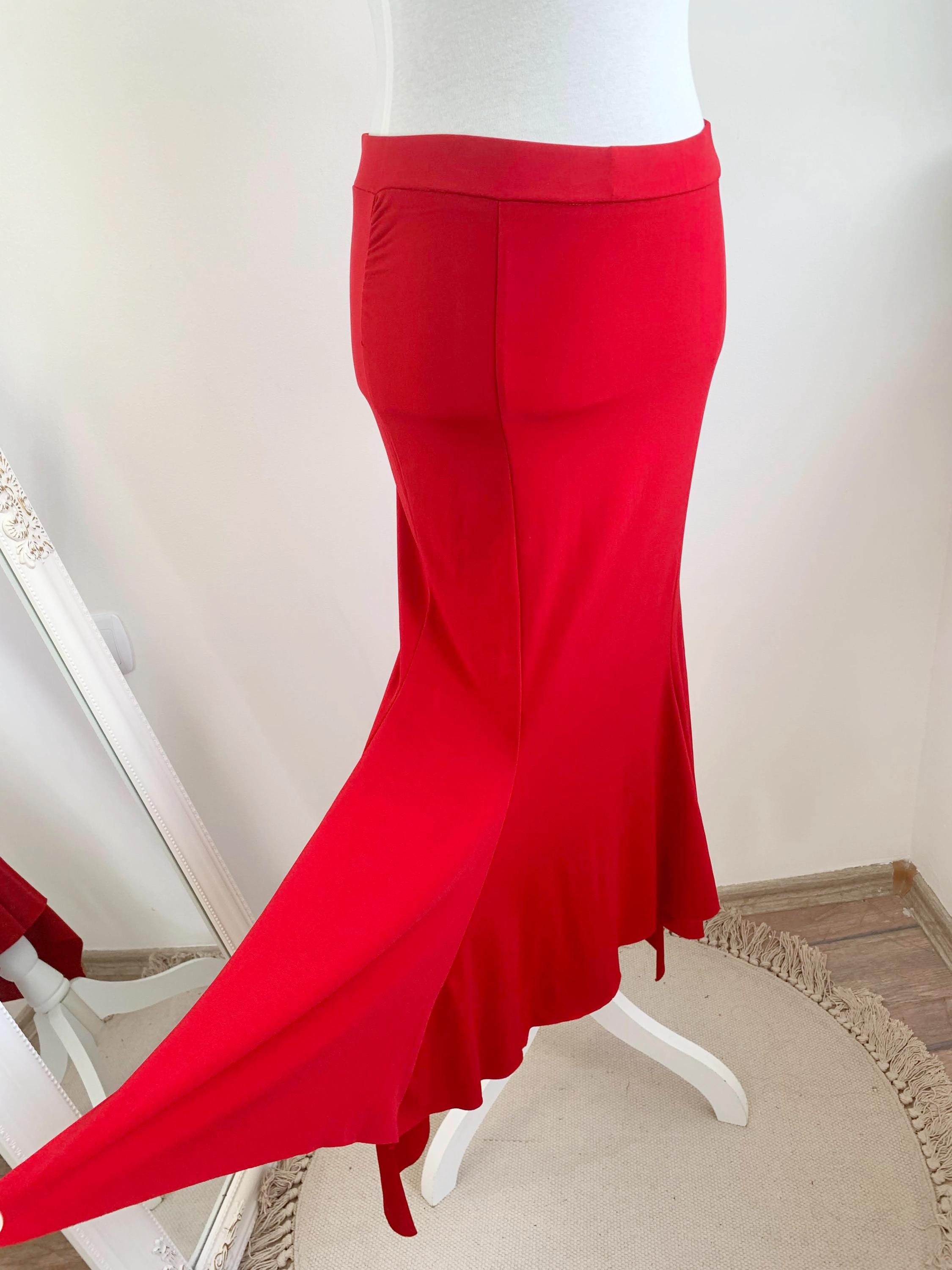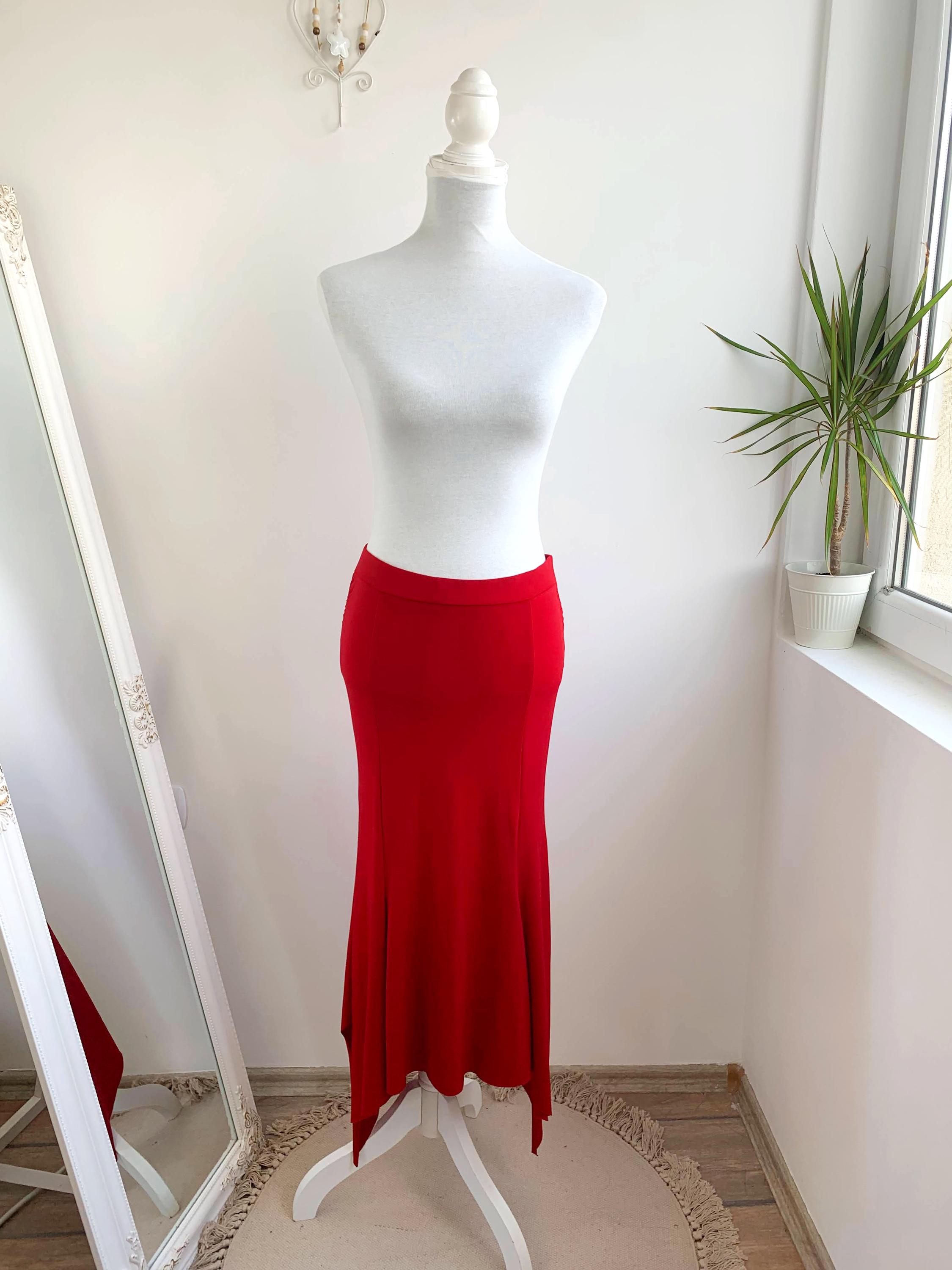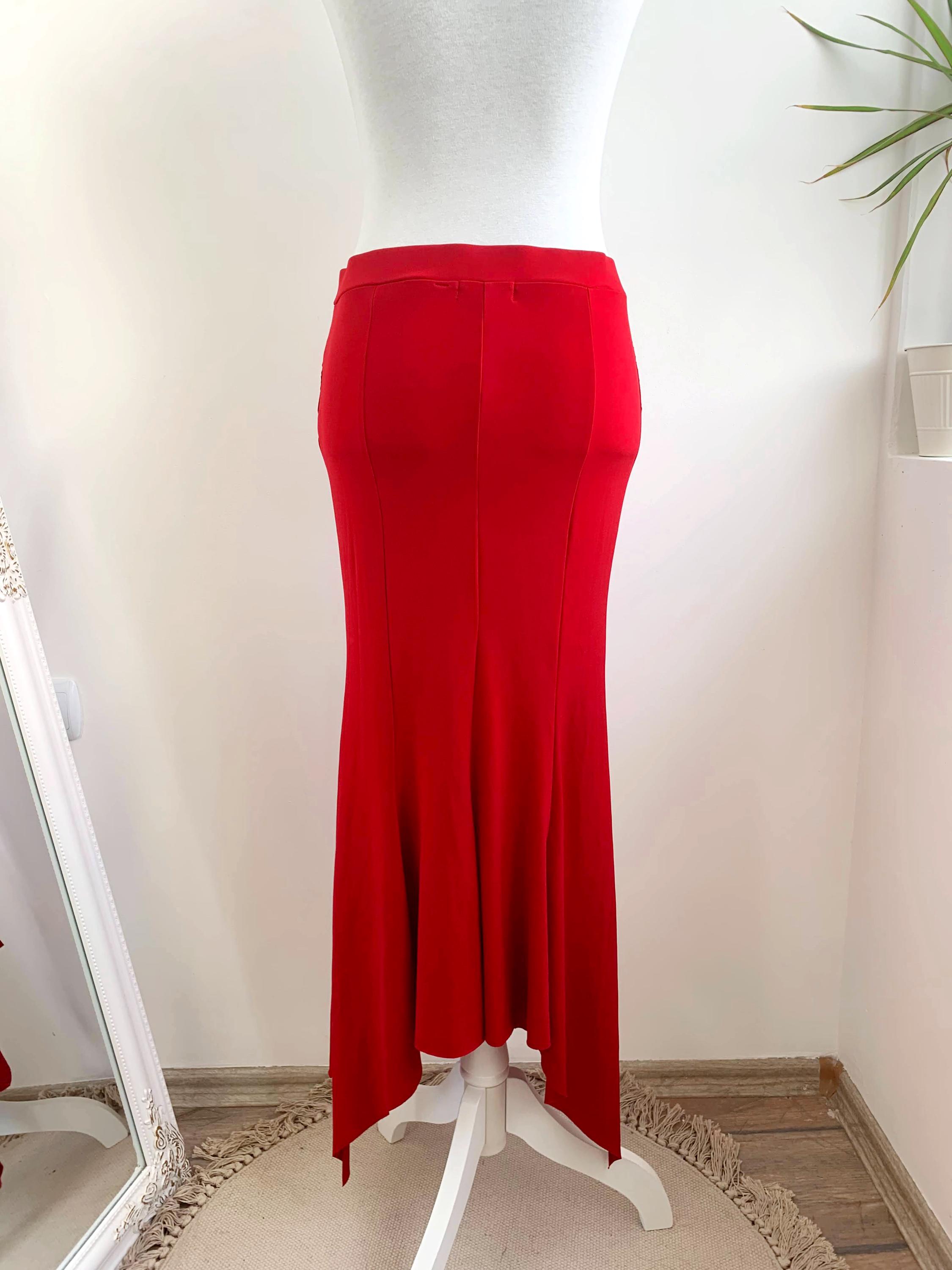 Unleash your inner goddess with this stunning vintage red maxi skirt in size 38/40 S/M. This high-waisted skirt features a sleek, figure-hugging mermaid silhouette that flares out dramatically at the knees into a beautiful asymmetrical, handkerchief hem. With it's elasticated waist and stretchy fabirc it beautifuly embraces your curves. The vibrant red color and elegant shape make it an absolute showstopper. Crafted from a stretchy polyester and elastane blend, this skirt offers a comfortable and flattering fit that moves gracefully with you, making it perfect for dancing the tango, a special evening out, or a glamorous party. It's a timeless piece that combines vintage allure with modern style, ensuring you'll make a bold and unforgettable statement.