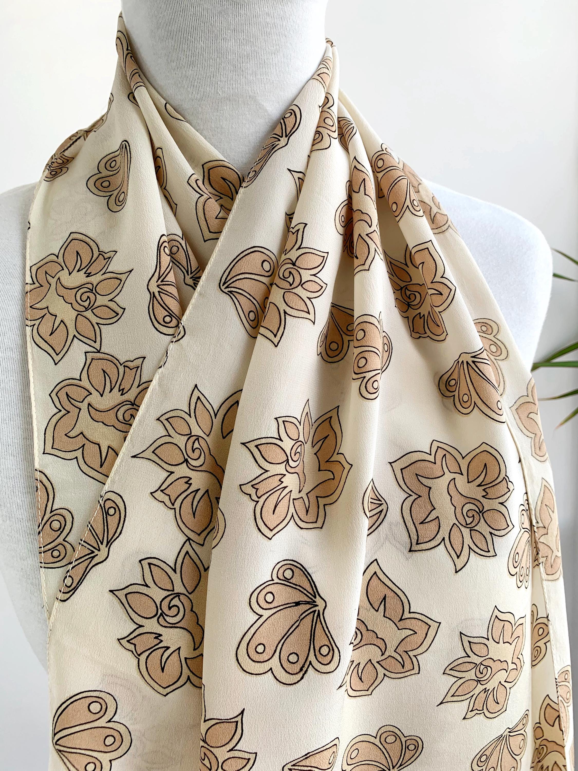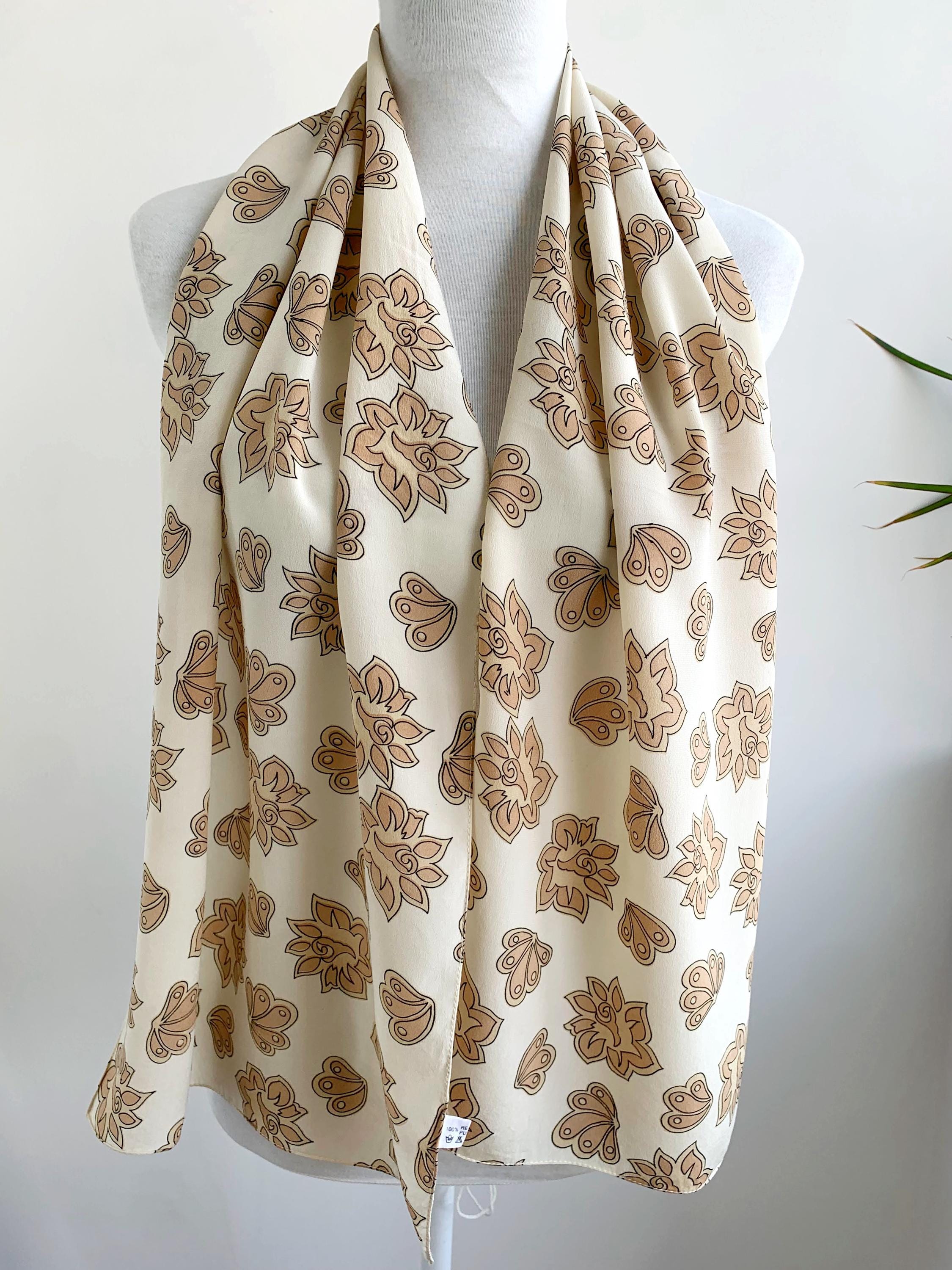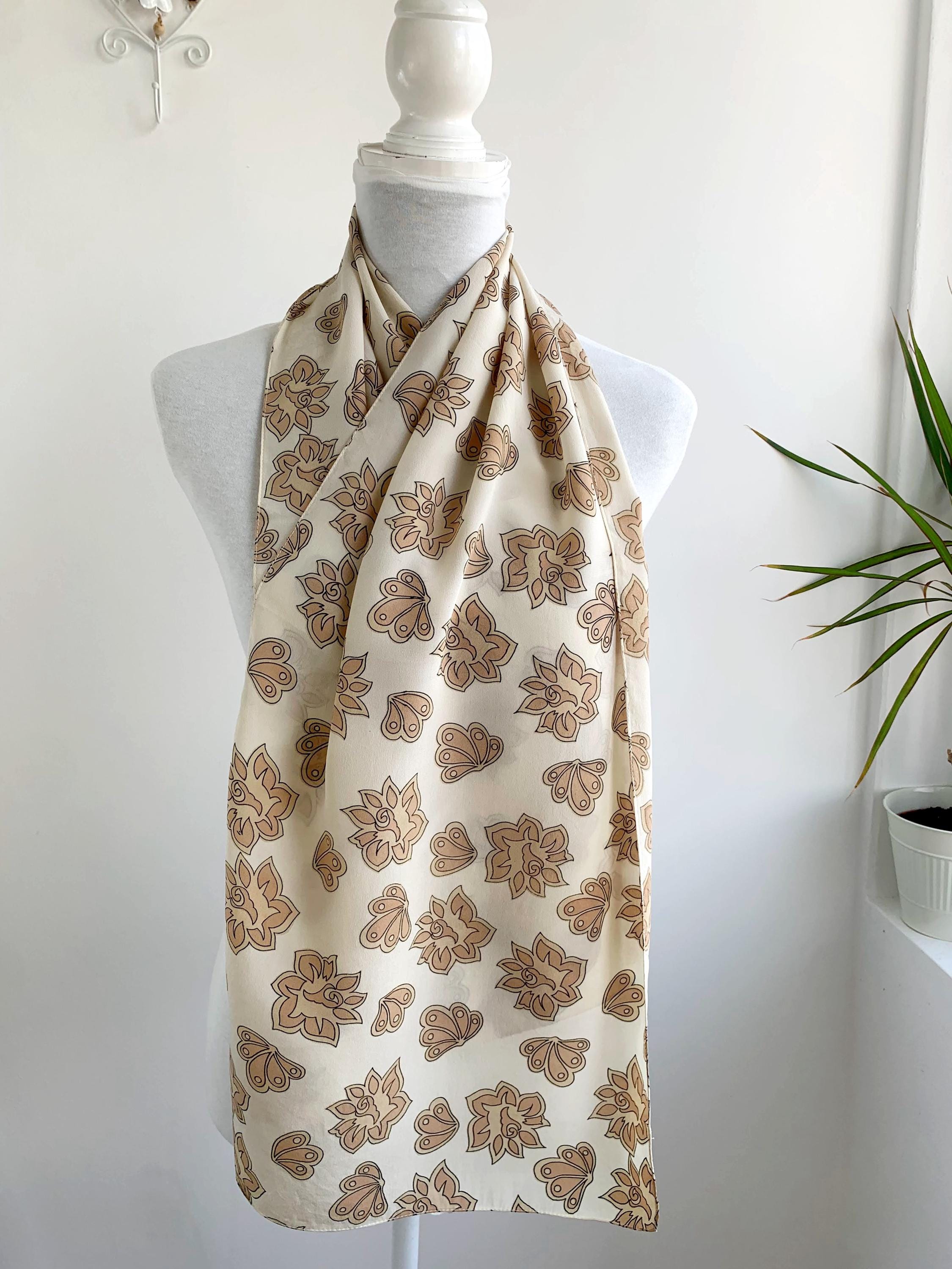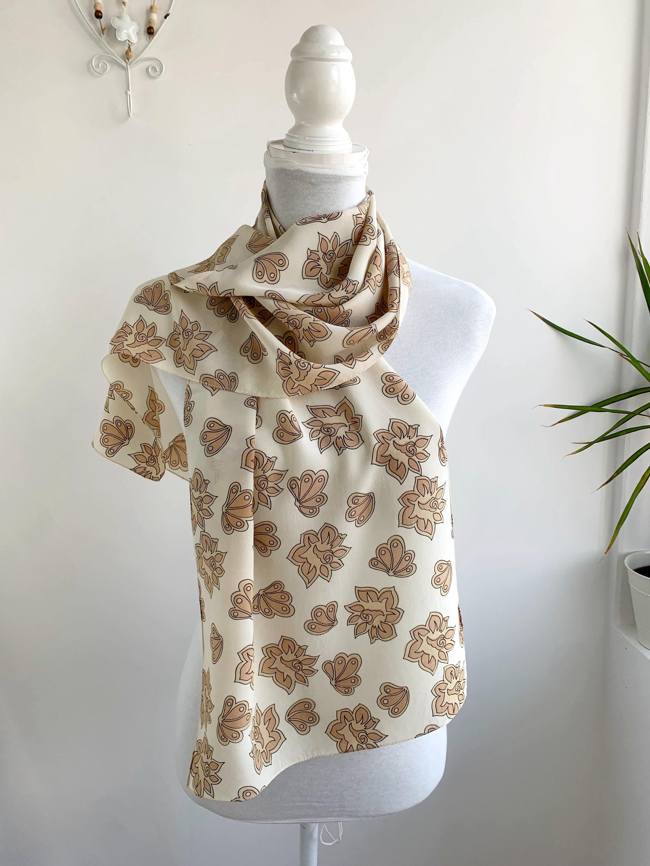 Add a touch of bohemian elegance to your wardrobe with this stunning vintage 90s pure silk scarf. The gorgeous paisley-inspired floral and shell pattern in shades of cream beige and camel brown adds a warm, earthy feel to any outfit. Made from pure, high-quality silk, this long and skinny scarf drapes beautifully and feels luxurious against the skin. Whether you wear it as a neckerchief, a chic headband, or tied to your favorite handbag, this versatile pure silk accessory is the perfect way to embrace a timeless, retro look. It’s a wonderful statement piece for anyone who loves unique, mod-style vintage fashion.
