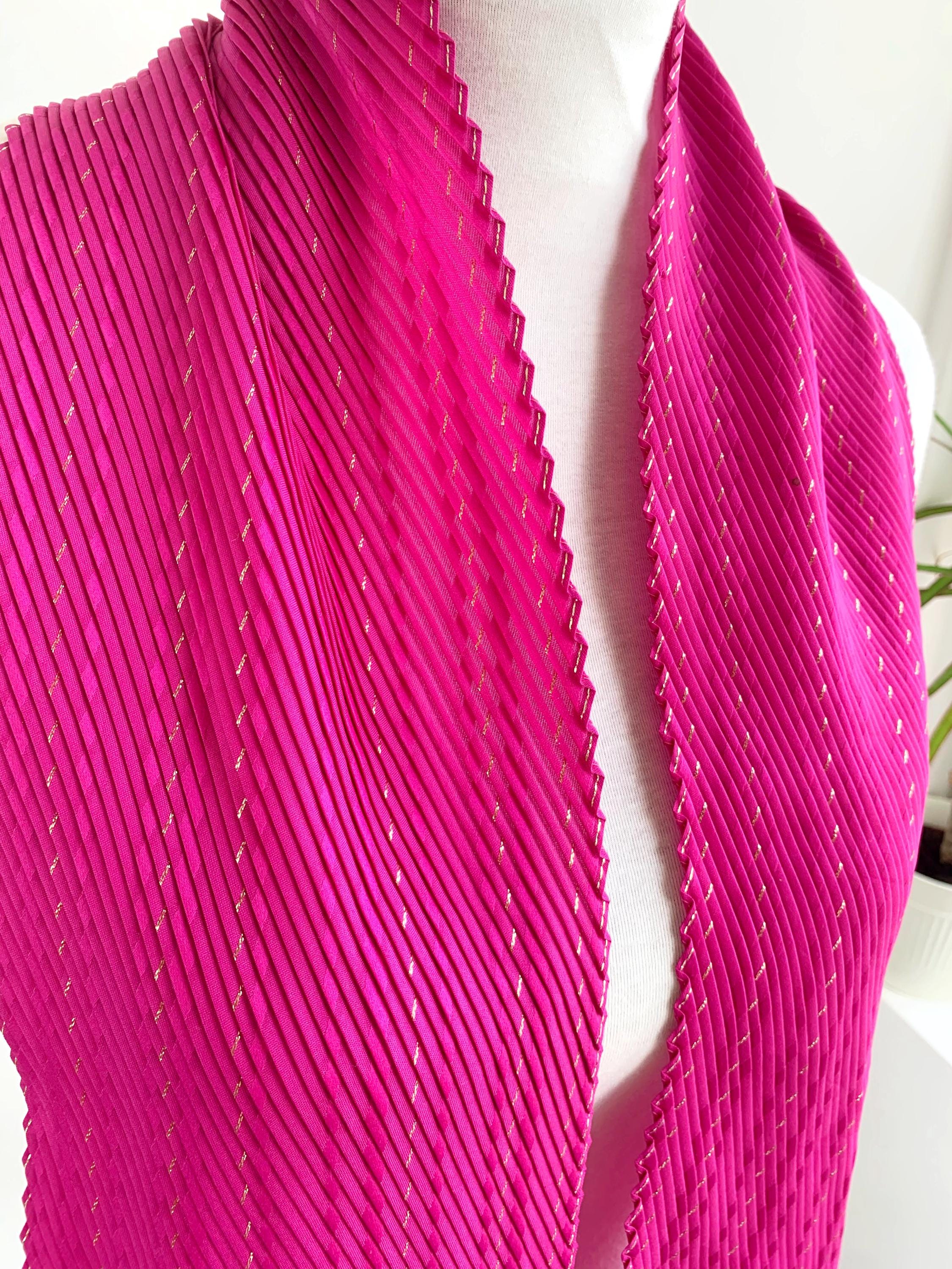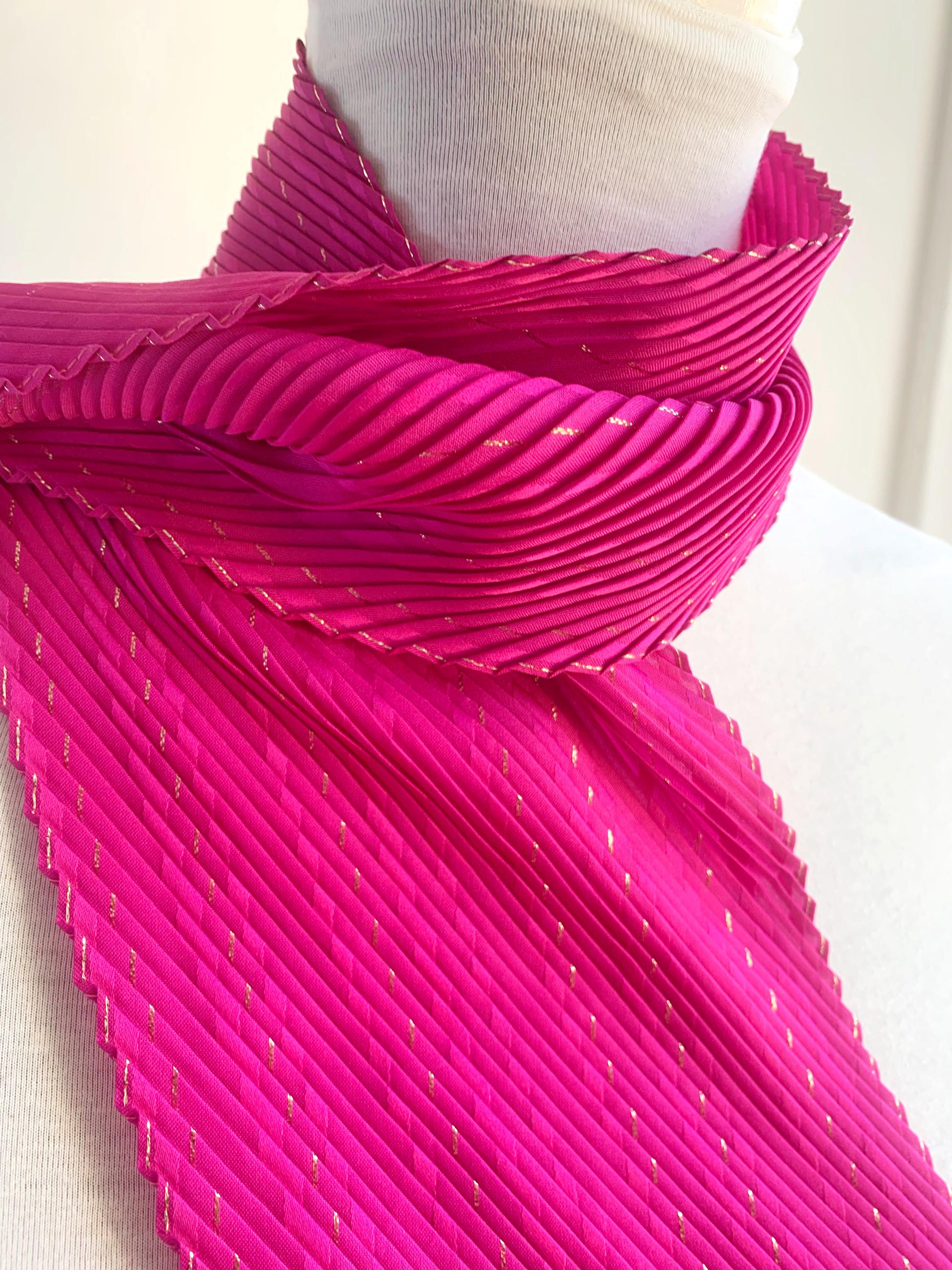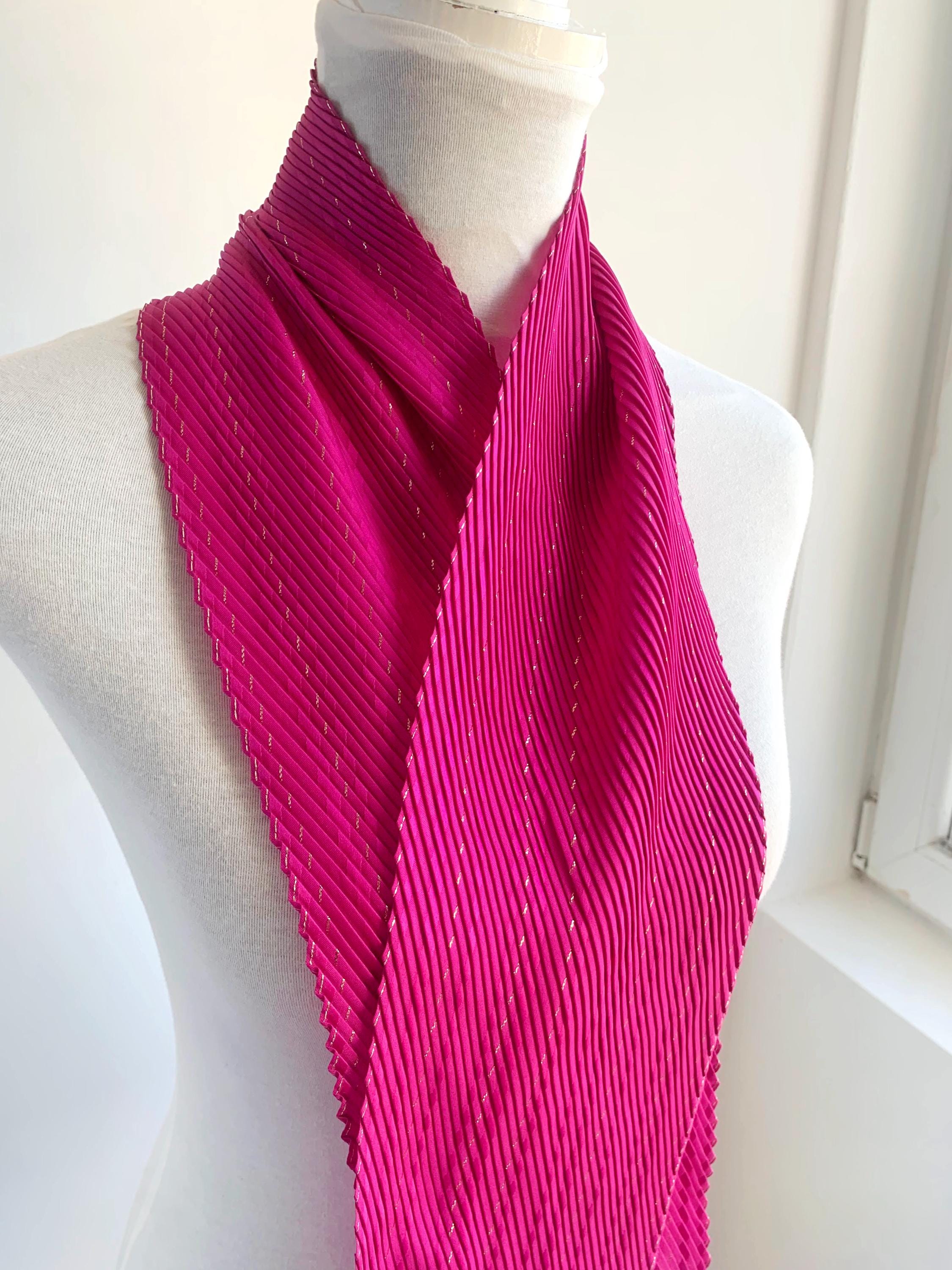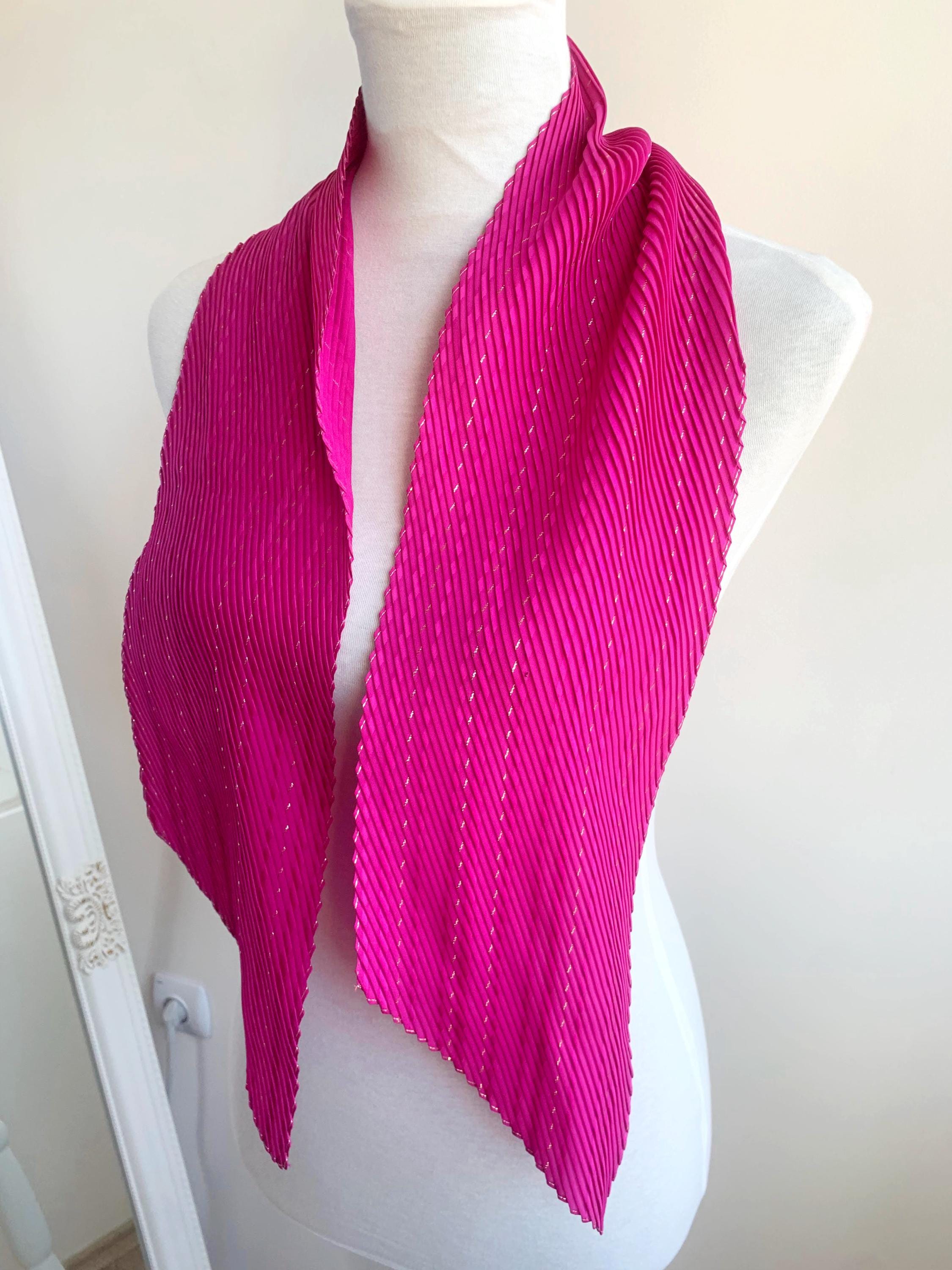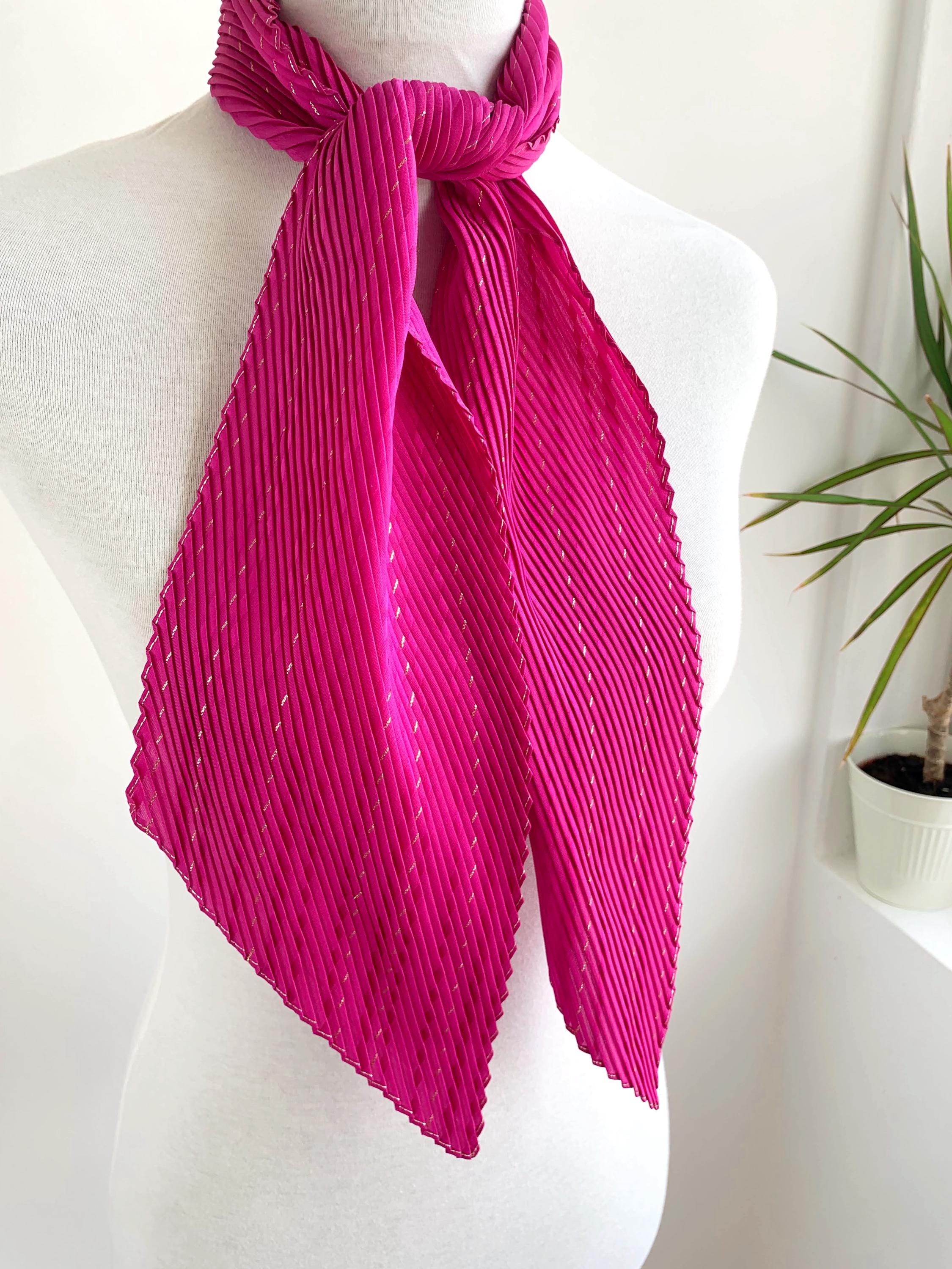 Step back in time with this stunning vintage 70s pleated scarf, a vibrant and stylish accessory that adds a pop of color and texture to any outfit. The beautiful fuchsia pink fabric is perfectly pleated, creating a unique texture that catches the light. This retro pleated scarf is is hot pink color adorned with delicate, shimmery gold lamé vertical lines, giving it a subtle sparkle and a touch of glamour. Its narrow, ascot-like shape and zig-zag edges make it a standout piece, perfect for tying around your neck, head, or even your favorite handbag. Whether you're a fan of vintage fashion or looking to add a retro 70s -inspired element to your wardrobe, this scarf is a versatile and eye-catching choice.