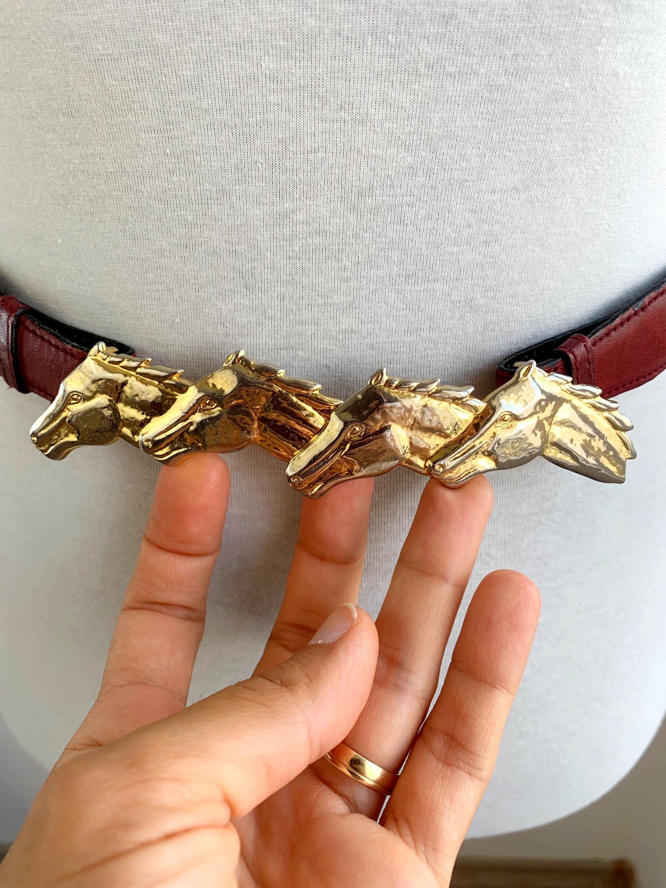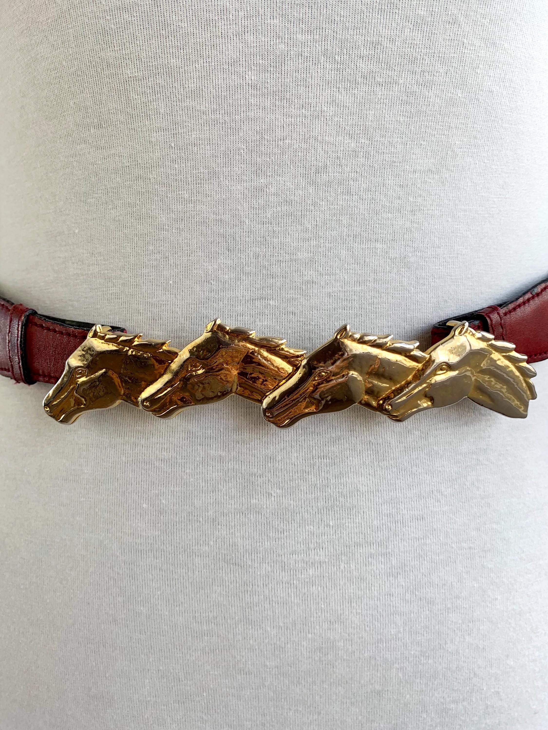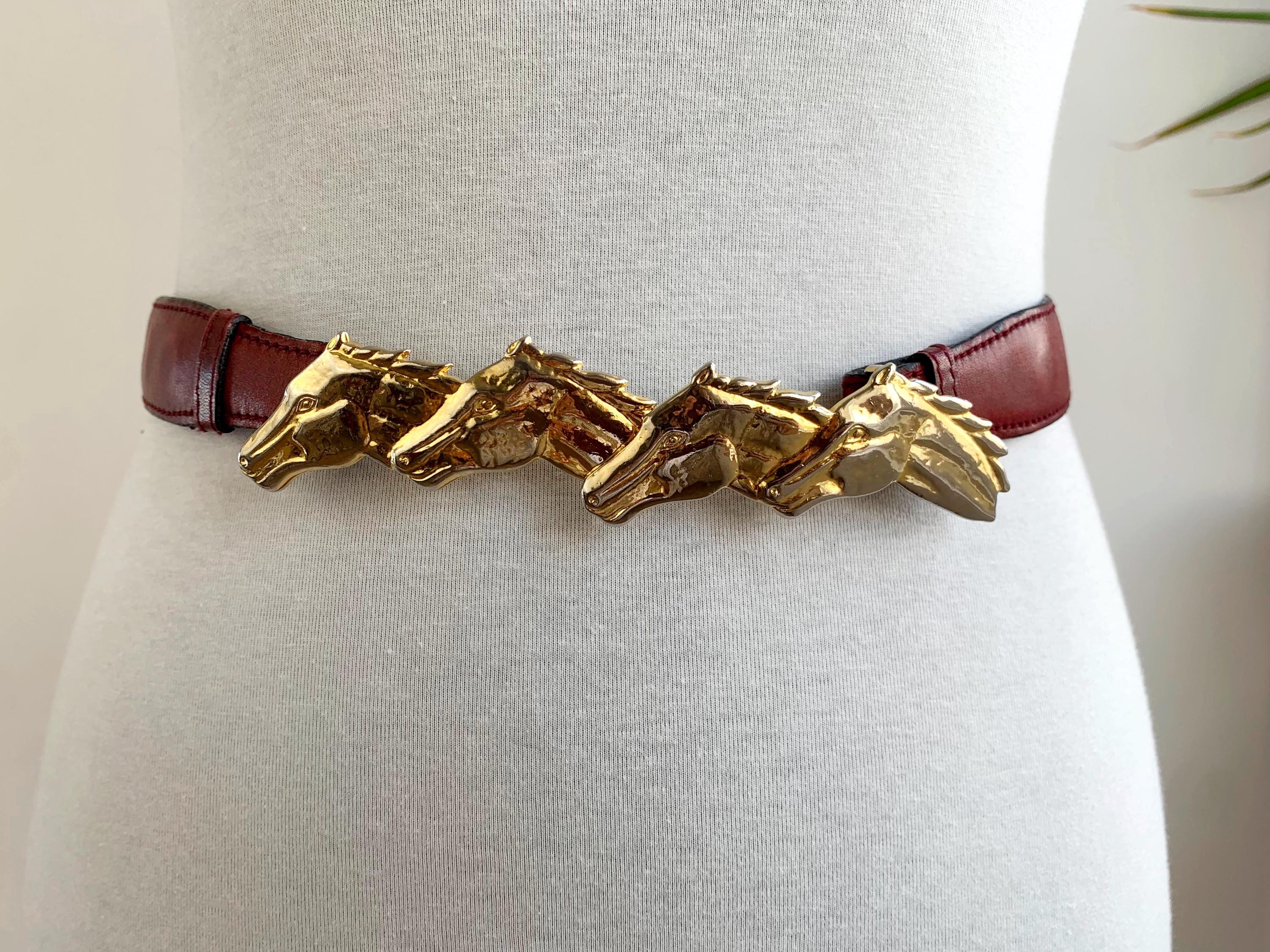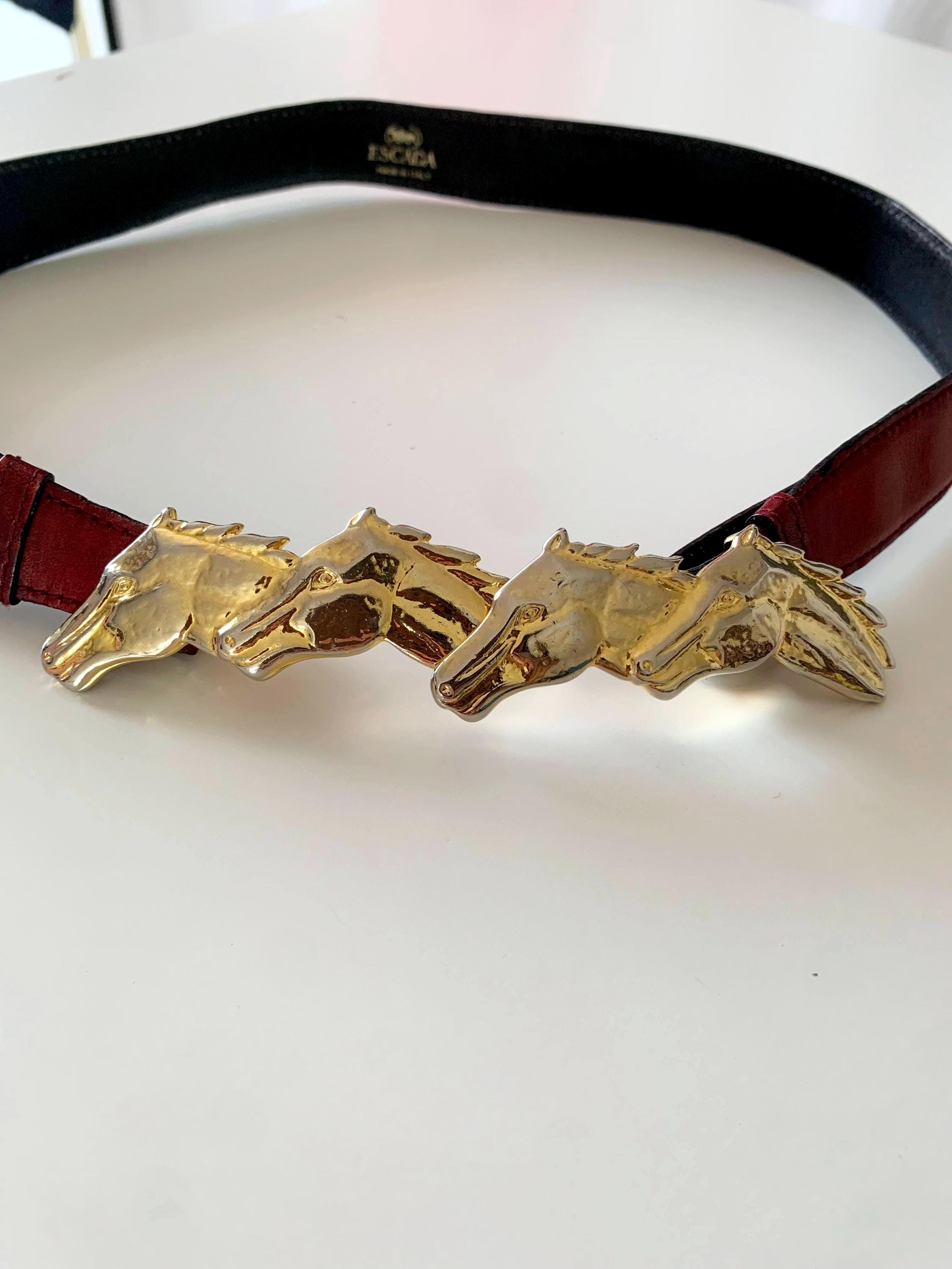 Step into equestrian elegance with this stunning vintage Escada belt, Made in Italy. This rare and beautiful accessory features a classic burgundy real leather strap that complements any outfit, from tailored blazers to flowy dresses. The true highlight of this vintage accessory piece is the magnificent gold-tone buckle, crafted from four intertwined horse heads, giving it a powerful and sophisticated look. This vintage belt is perfect for adding a touch of unique, high-end designer flair to your wardrobe and is a must-have for any horse lover or vintage fashion enthusiast. The detailed craftsmanship and timeless design make this more than just a belt; it's a statement piece that celebrates classic style.