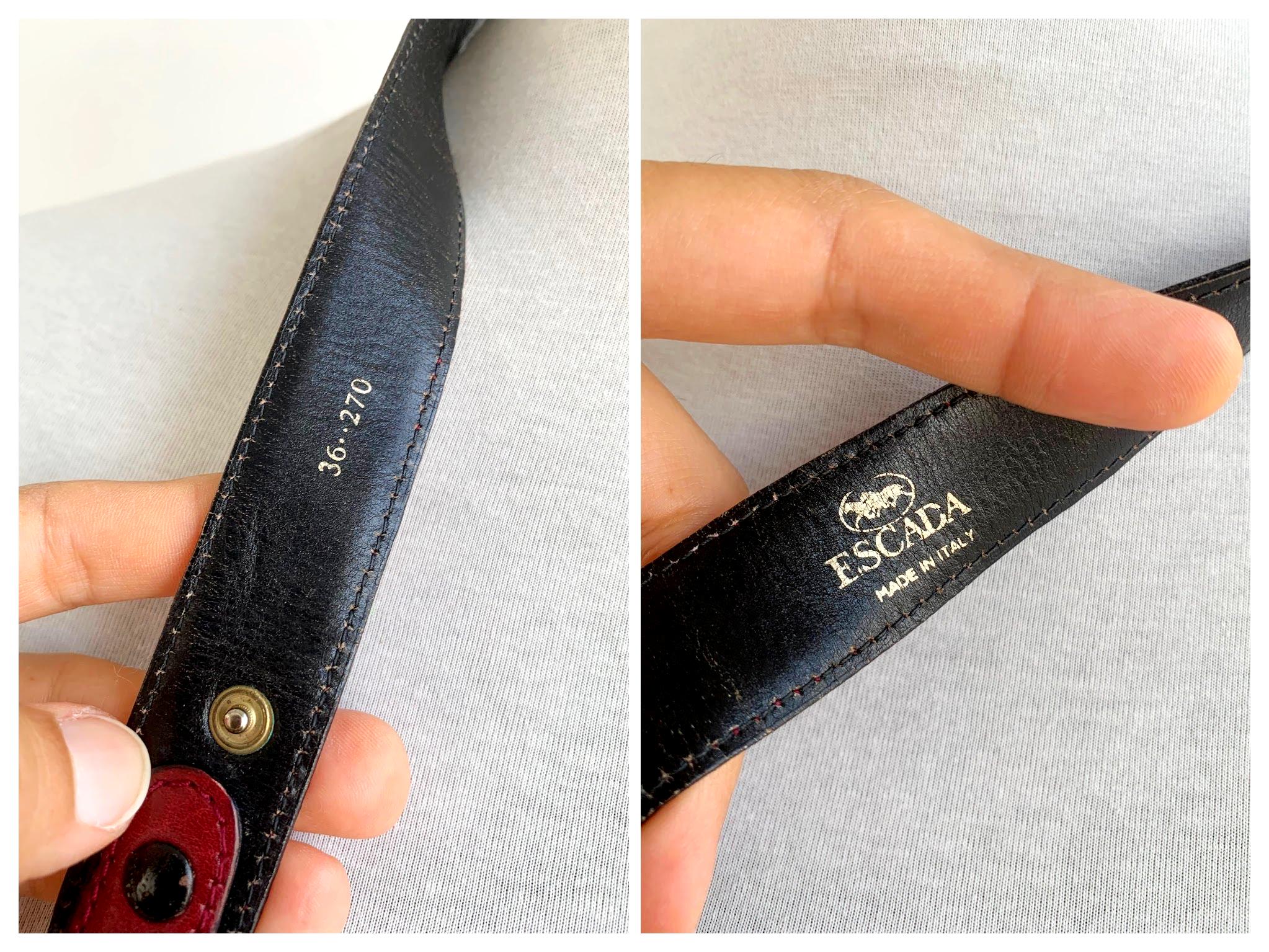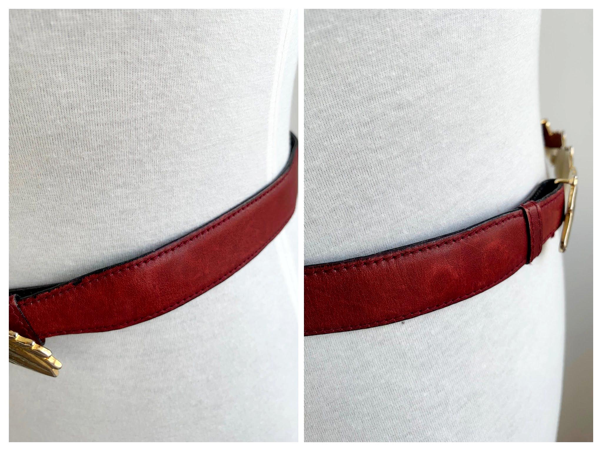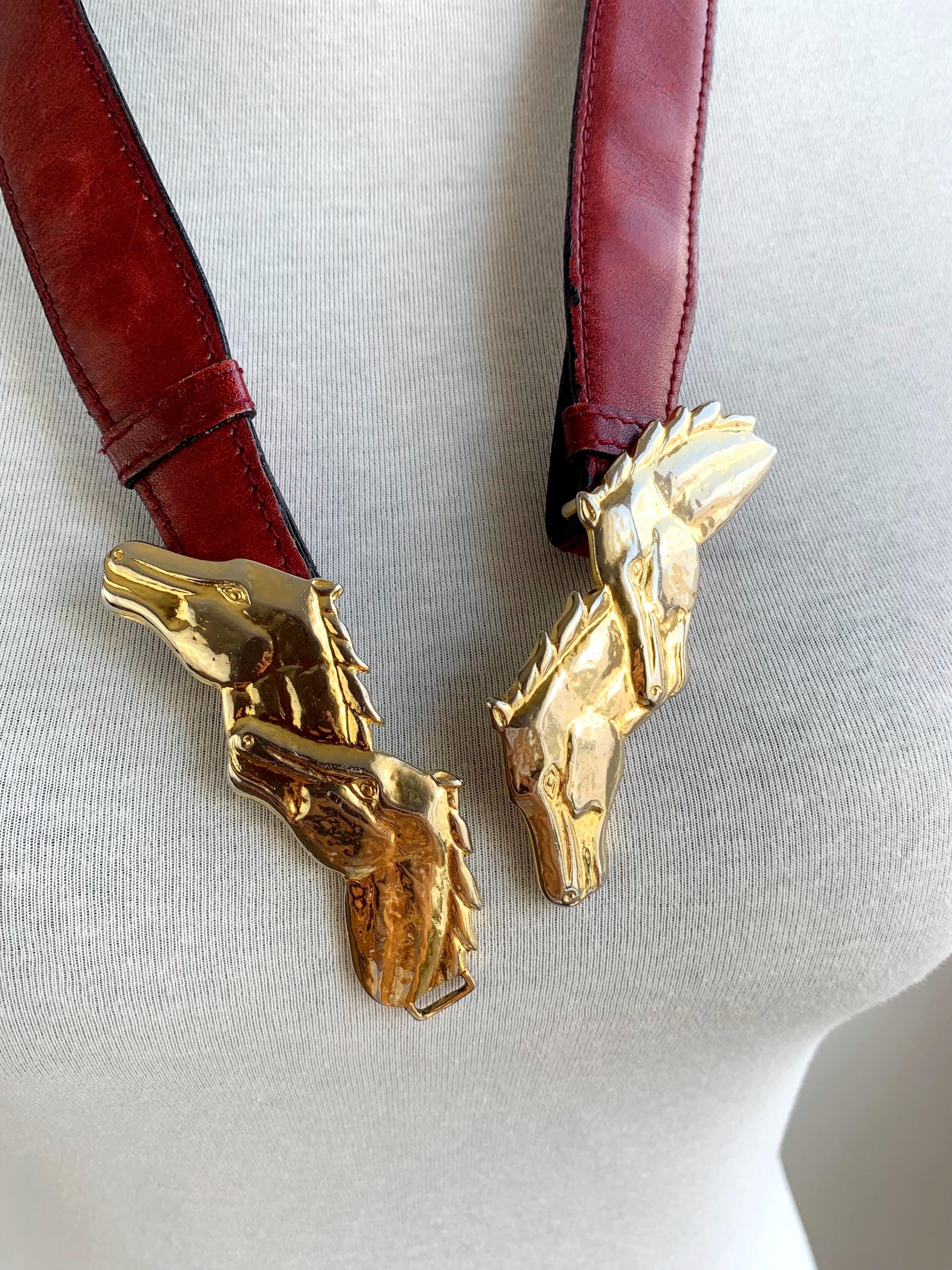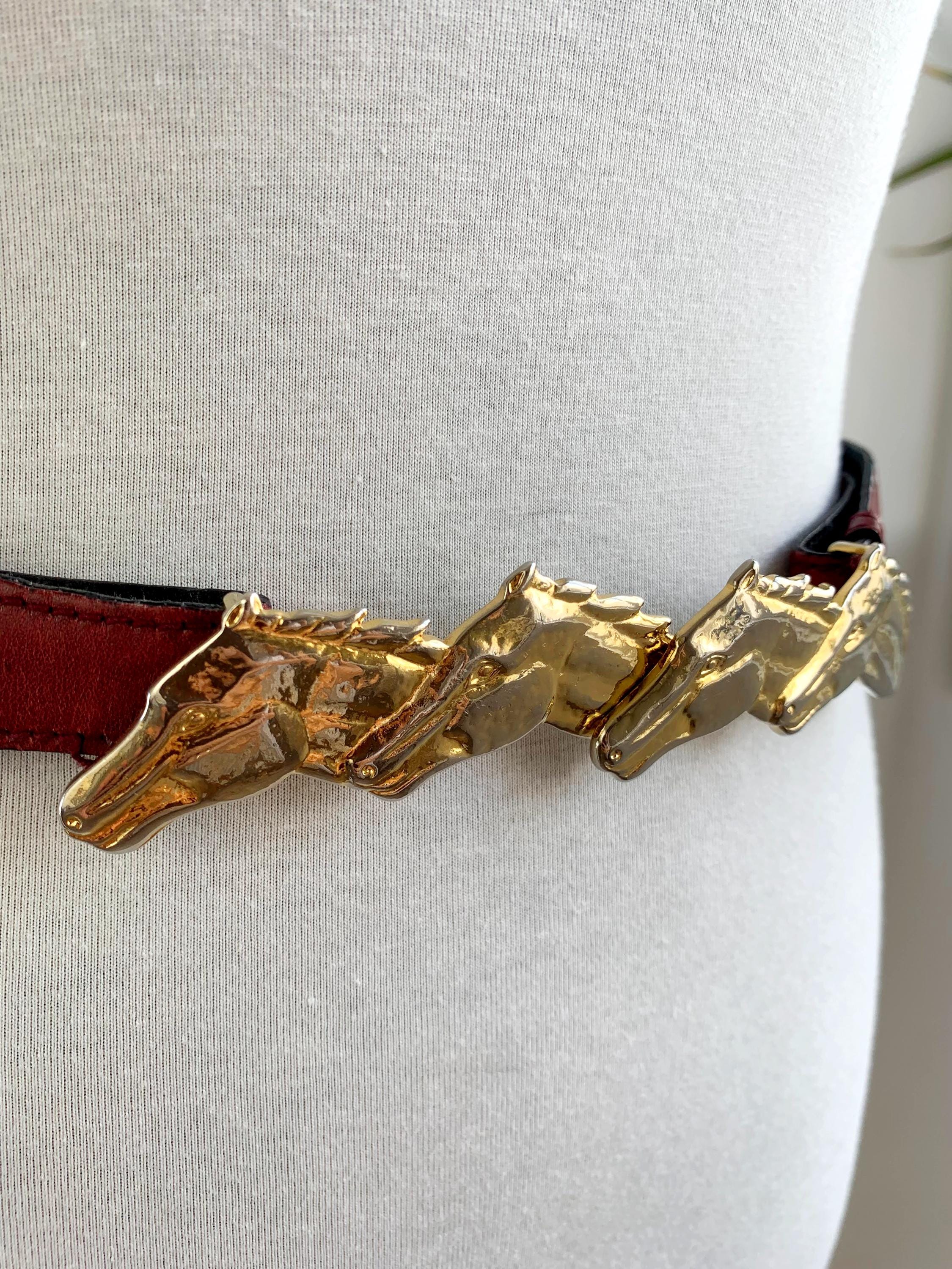 Step into equestrian elegance with this stunning vintage Escada belt, Made in Italy. This rare and beautiful accessory features a classic burgundy real leather strap that complements any outfit, from tailored blazers to flowy dresses. The true highlight of this vintage accessory piece is the magnificent gold-tone buckle, crafted from four intertwined horse heads, giving it a powerful and sophisticated look. This vintage belt is perfect for adding a touch of unique, high-end designer flair to your wardrobe and is a must-have for any horse lover or vintage fashion enthusiast. The detailed craftsmanship and timeless design make this more than just a belt; it's a statement piece that celebrates classic style.