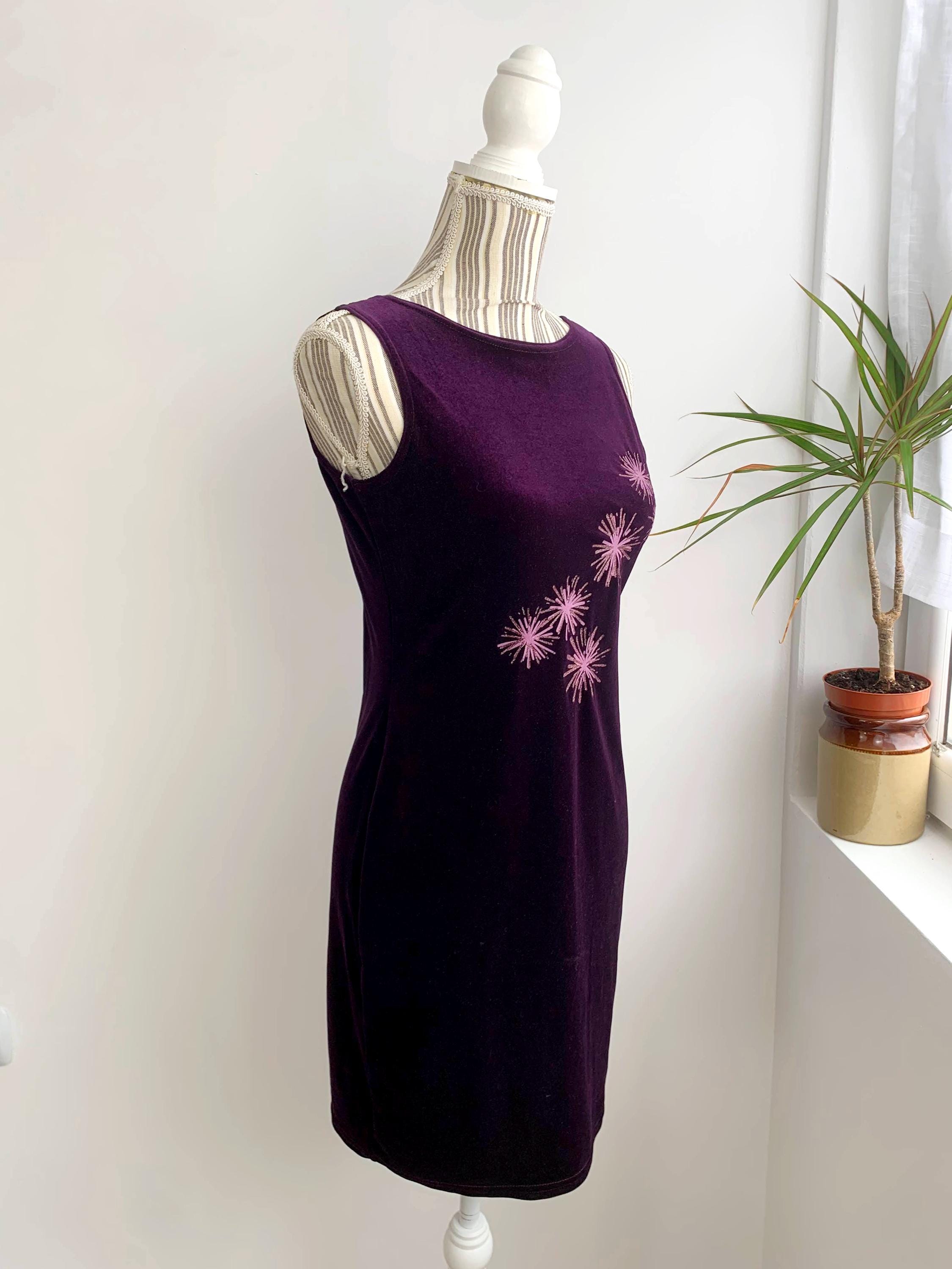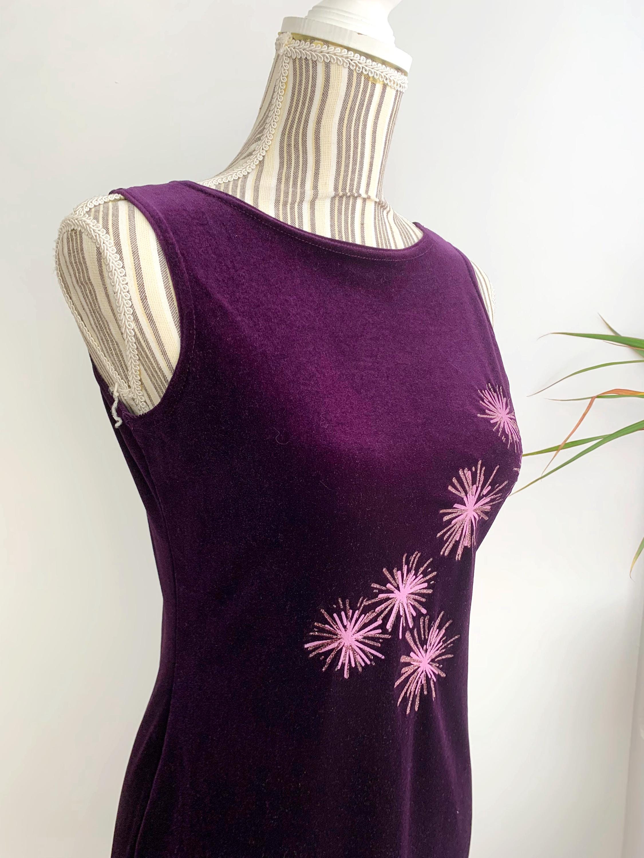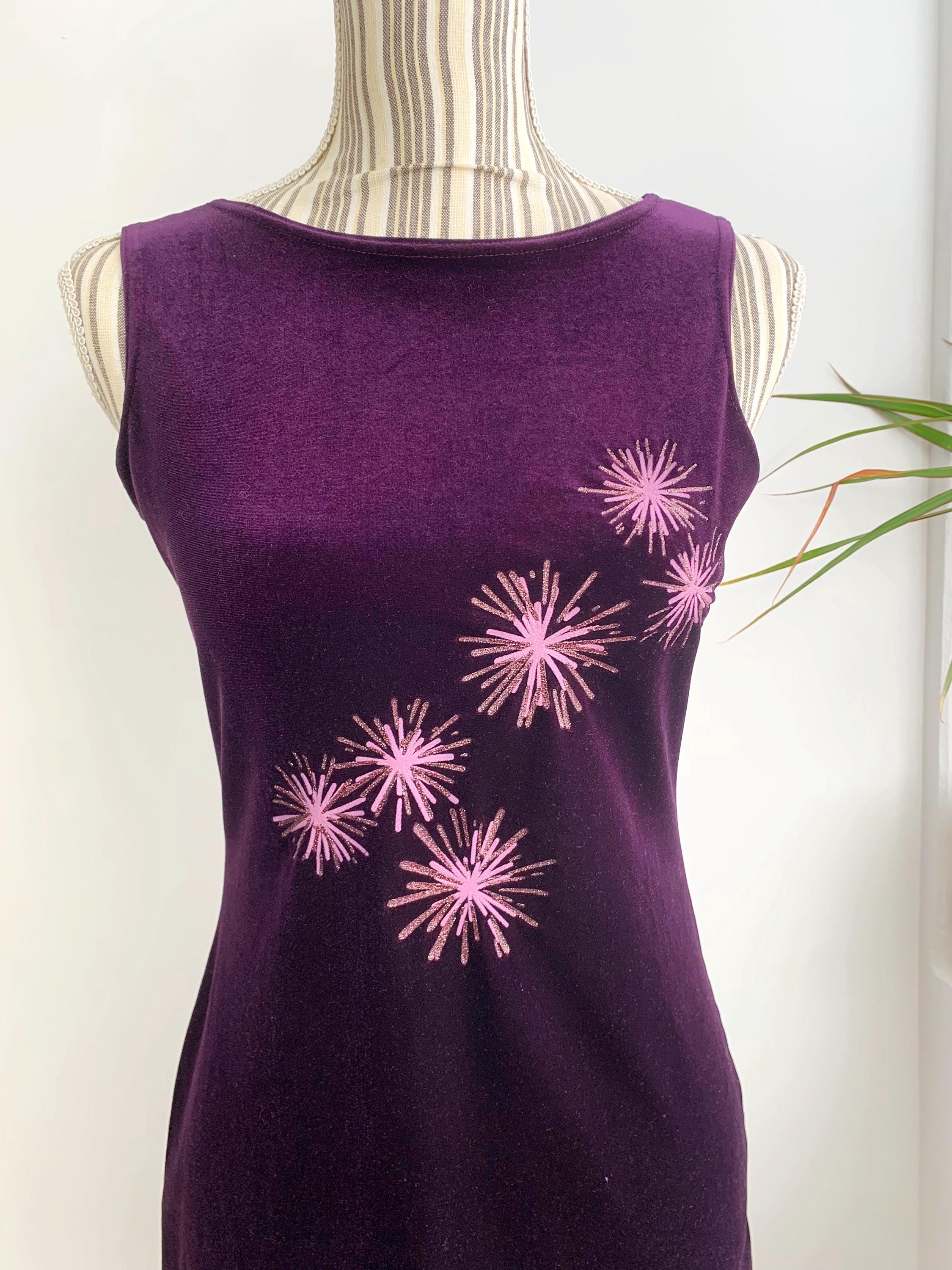 Step back into the late 90s with this stunning vintage eggplant purple velvet dress in size S, perfect for a night out or a special event. This velvet dress is in a gorgeous deep purple color with pink glitted floral like accents. This velvet mini dress is made from a soft stretch velvet material that hugs your curves in a flattering bodycon fit. The standout feature is the vibrant pink and glittery gold starburst pattern on the front, adding a playful, retro sparkle. With its minimalist, sleeveless silhouette, this dress embodies the iconic Y2K aesthetic. The comfortable stretch fabric and a classic boat neck make it easy to wear and a stylish statement piece. This is the perfect choice for anyone who loves vintage party wear, velvet fashion, or is looking to add a unique, nostalgic piece to their collection.