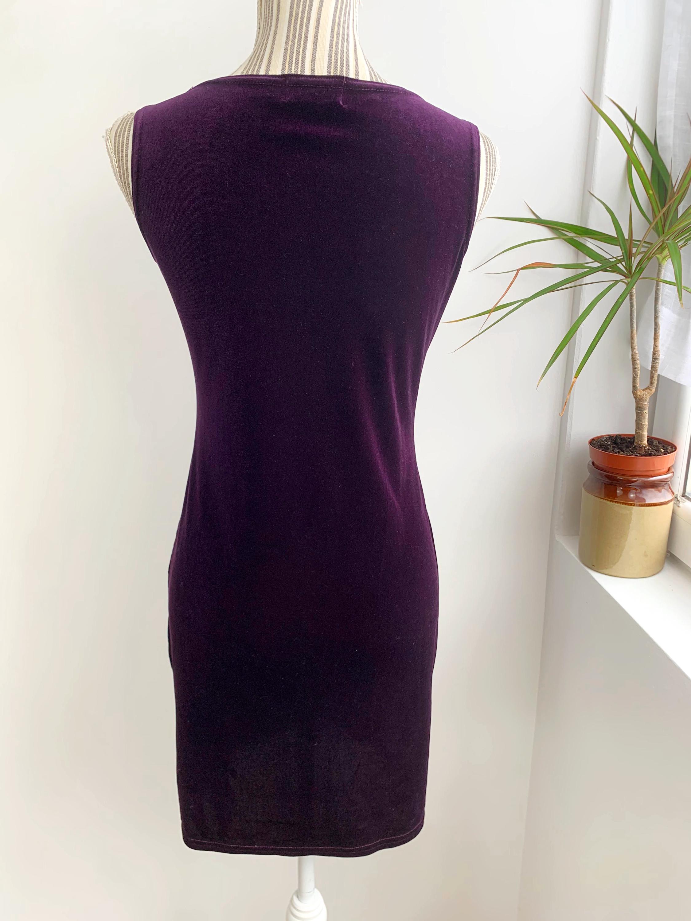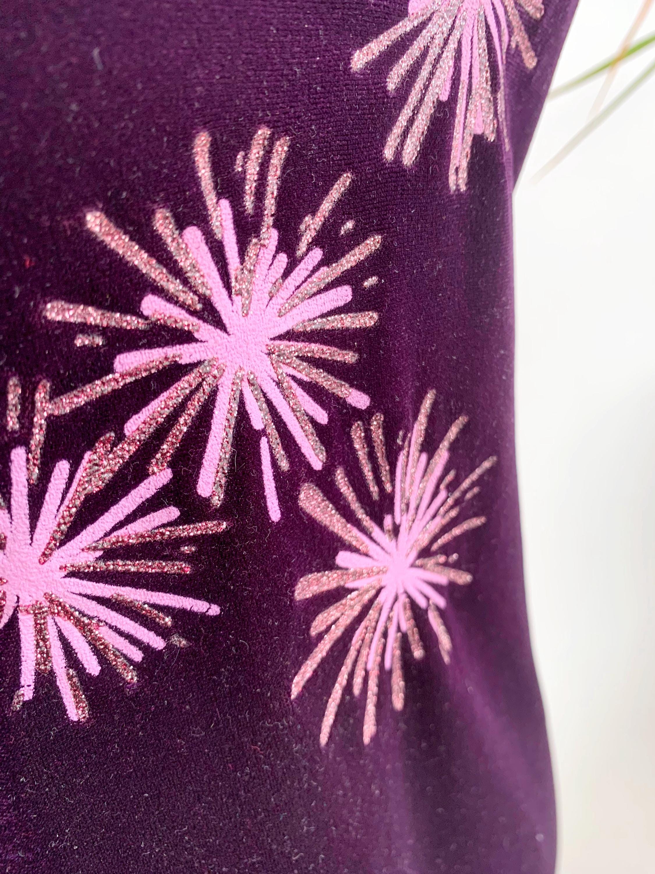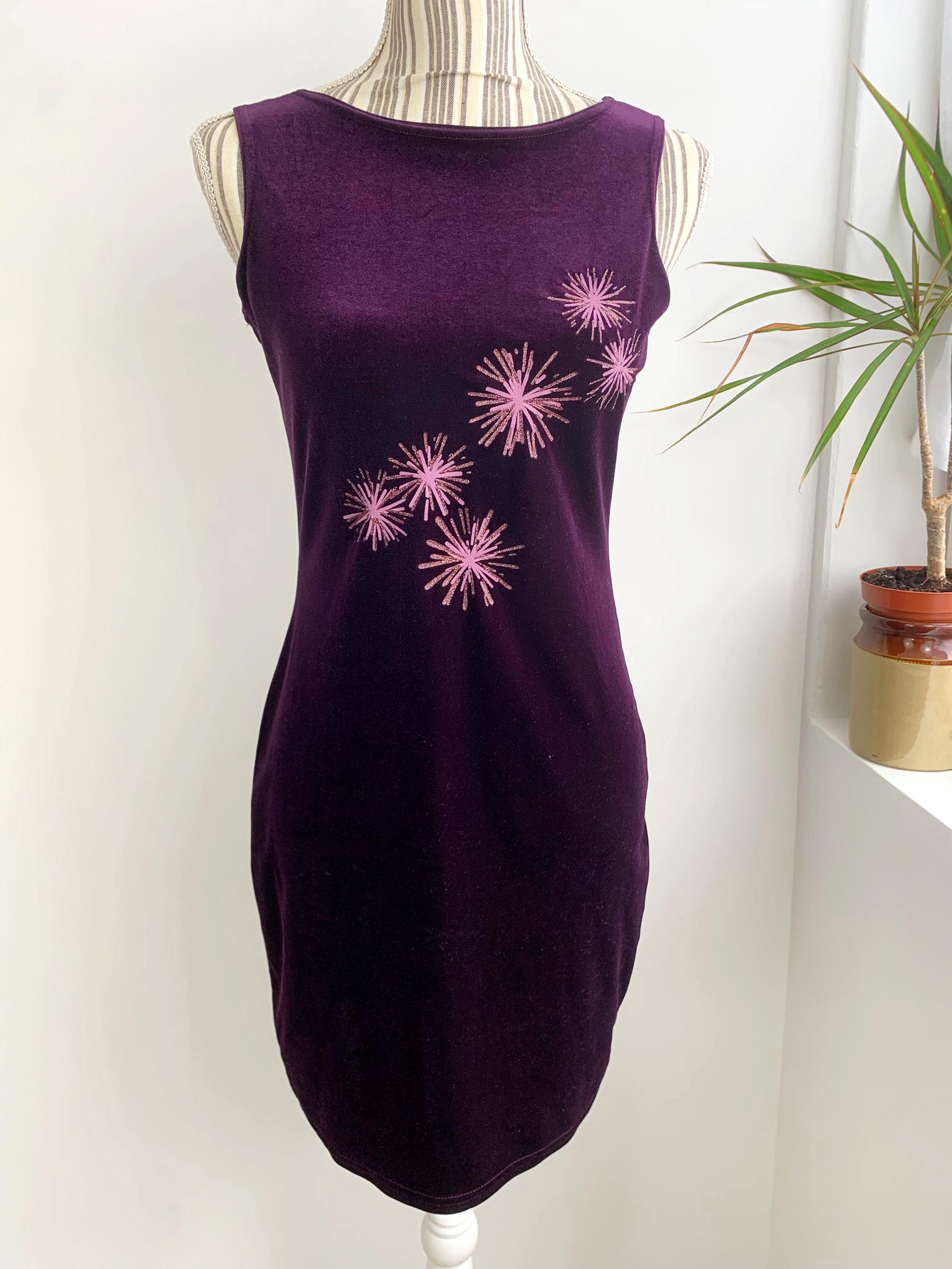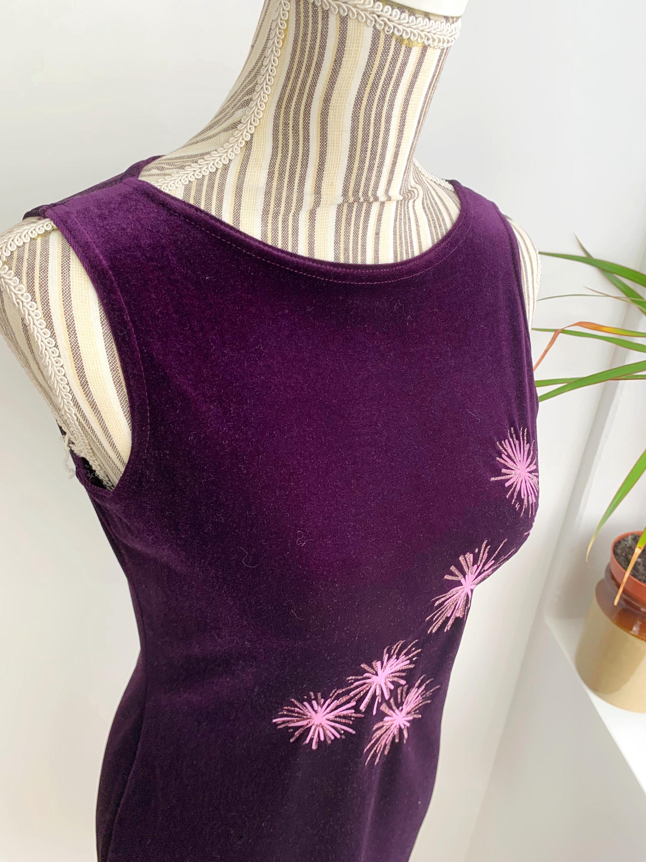 Step back into the late 90s with this stunning vintage eggplant purple velvet dress in size S, perfect for a night out or a special event. This velvet dress is in a gorgeous deep purple color with pink glitted floral like accents. This velvet mini dress is made from a soft stretch velvet material that hugs your curves in a flattering bodycon fit. The standout feature is the vibrant pink and glittery gold starburst pattern on the front, adding a playful, retro sparkle. With its minimalist, sleeveless silhouette, this dress embodies the iconic Y2K aesthetic. The comfortable stretch fabric and a classic boat neck make it easy to wear and a stylish statement piece. This is the perfect choice for anyone who loves vintage party wear, velvet fashion, or is looking to add a unique, nostalgic piece to their collection.
