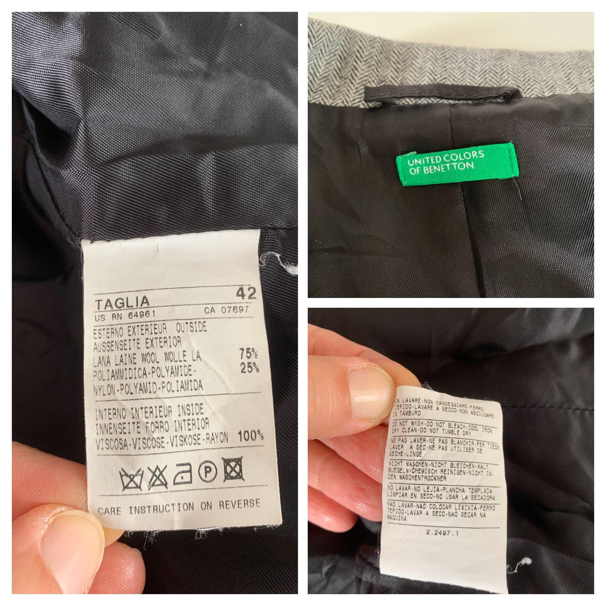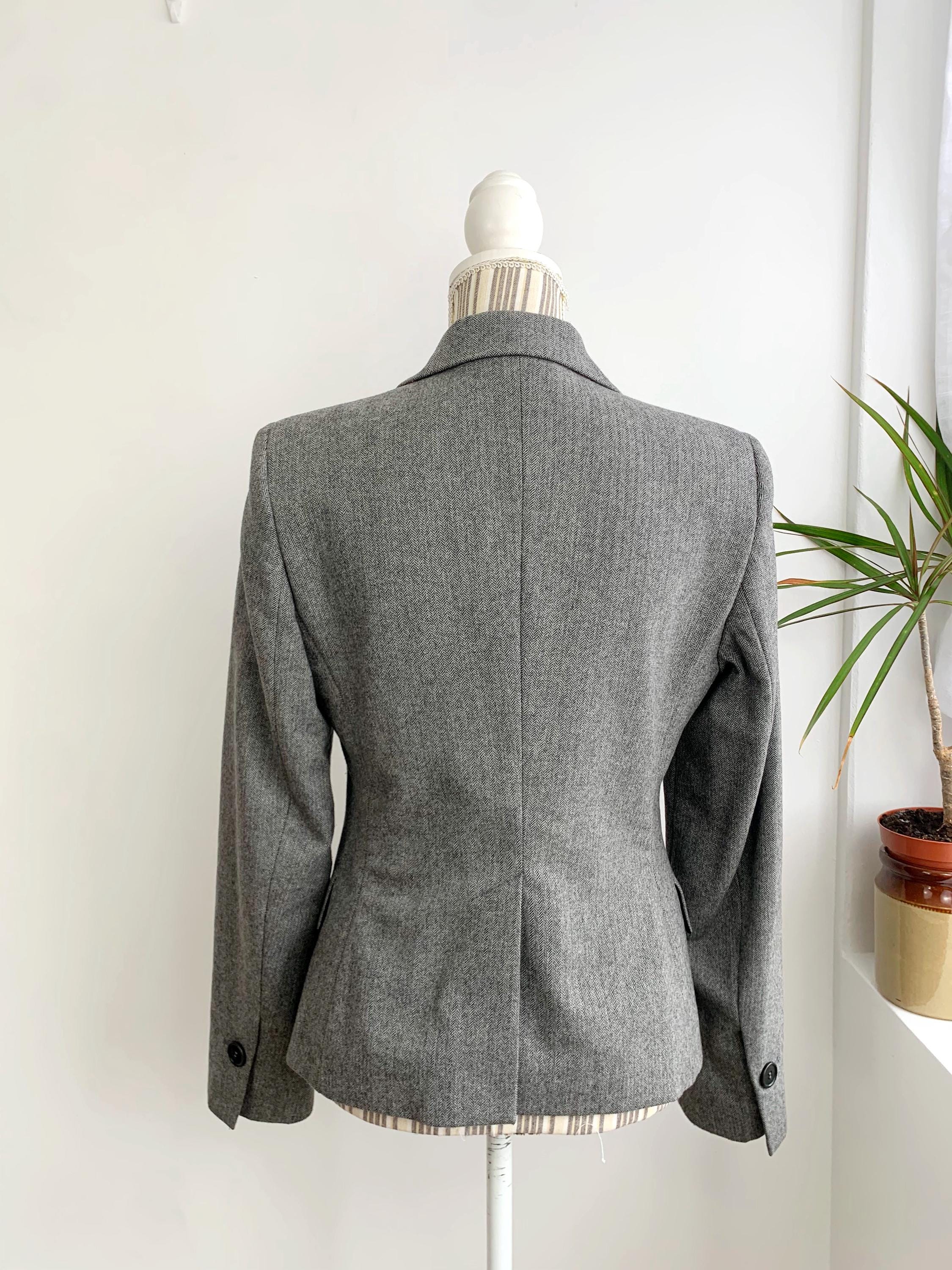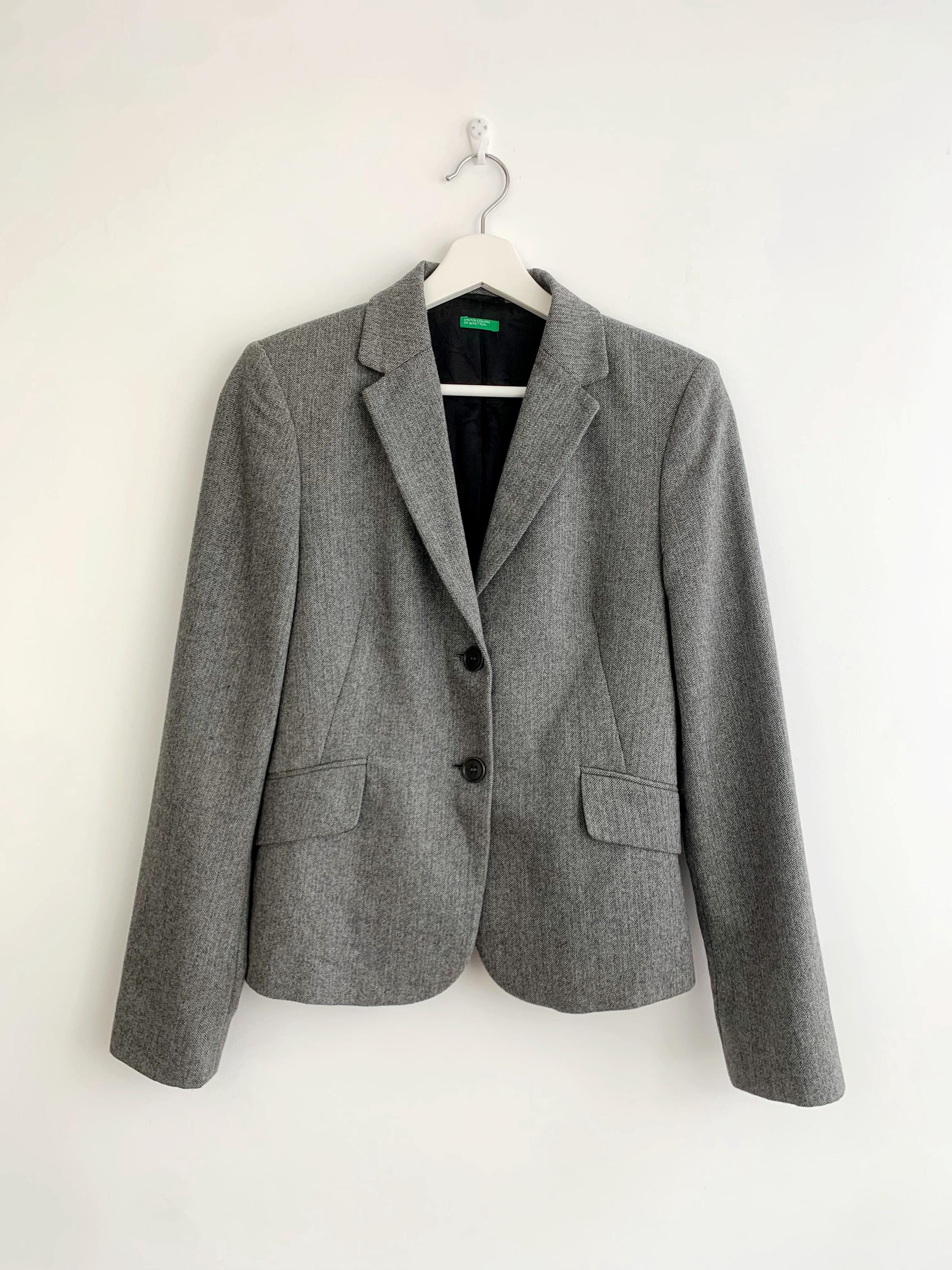 Discover a timeless wardrobe staple with this classic vintage Benetton herringbone blazer for women in size S from the 1990s. Crafted from a luxurious blend of wool and polyamide, this sophisticated grey jacket features a refined herringbone pattern that adds texture and depth to any outfit. The structured, two-button silhouette creates a sharp and polished look, while the notch lapels and imitation flap pockets offer a professional, classic feel. This wool blazer is fully lined with smooth viscose for comfort and easy layering. Whether you're heading to the office or looking for the perfect piece to complete a smart-casual ensemble, this Benetton wool blazer is a versatile and high-quality vintage find. Its durable material and timeless design ensure it will be a favorite for years to come.