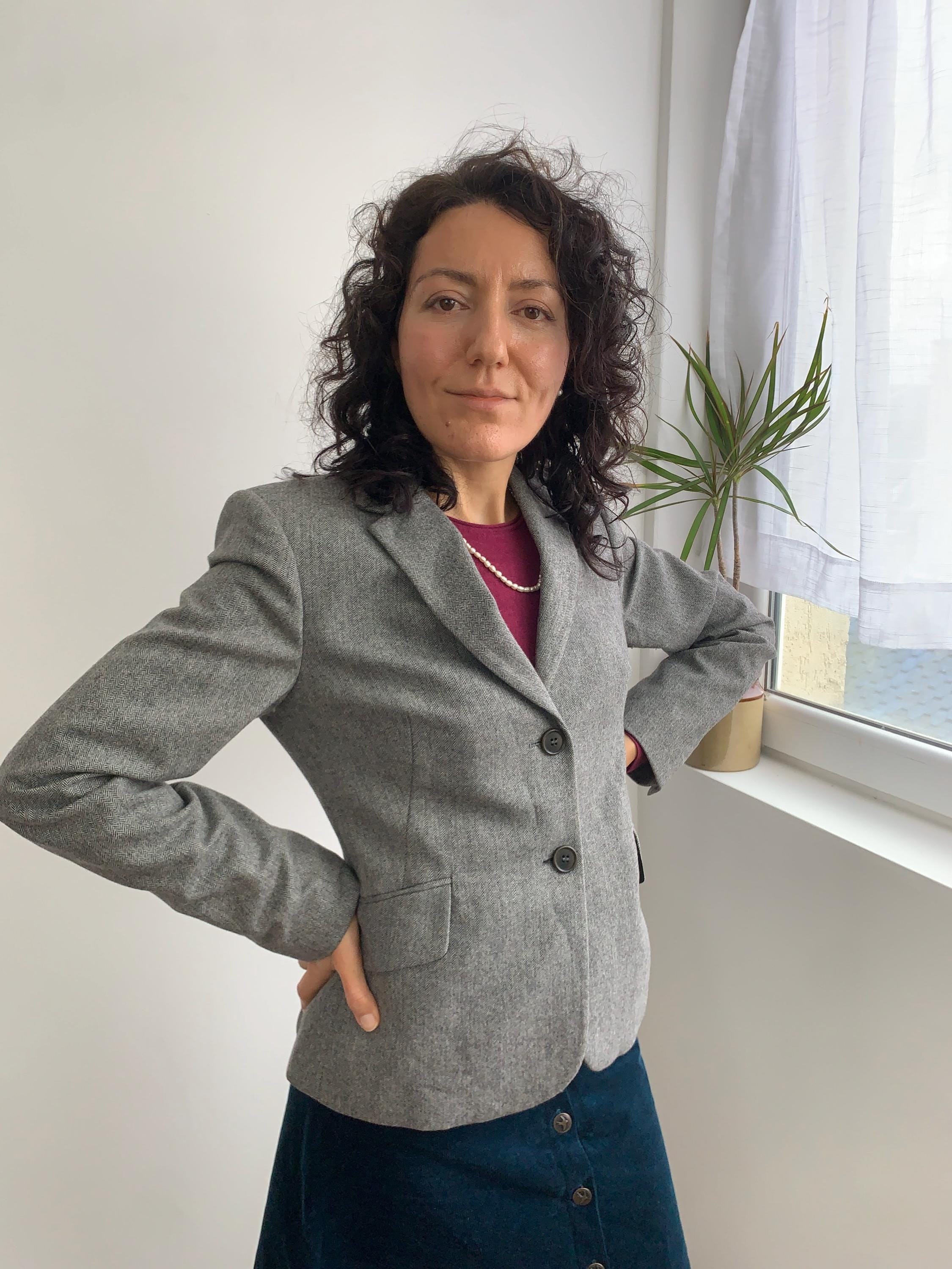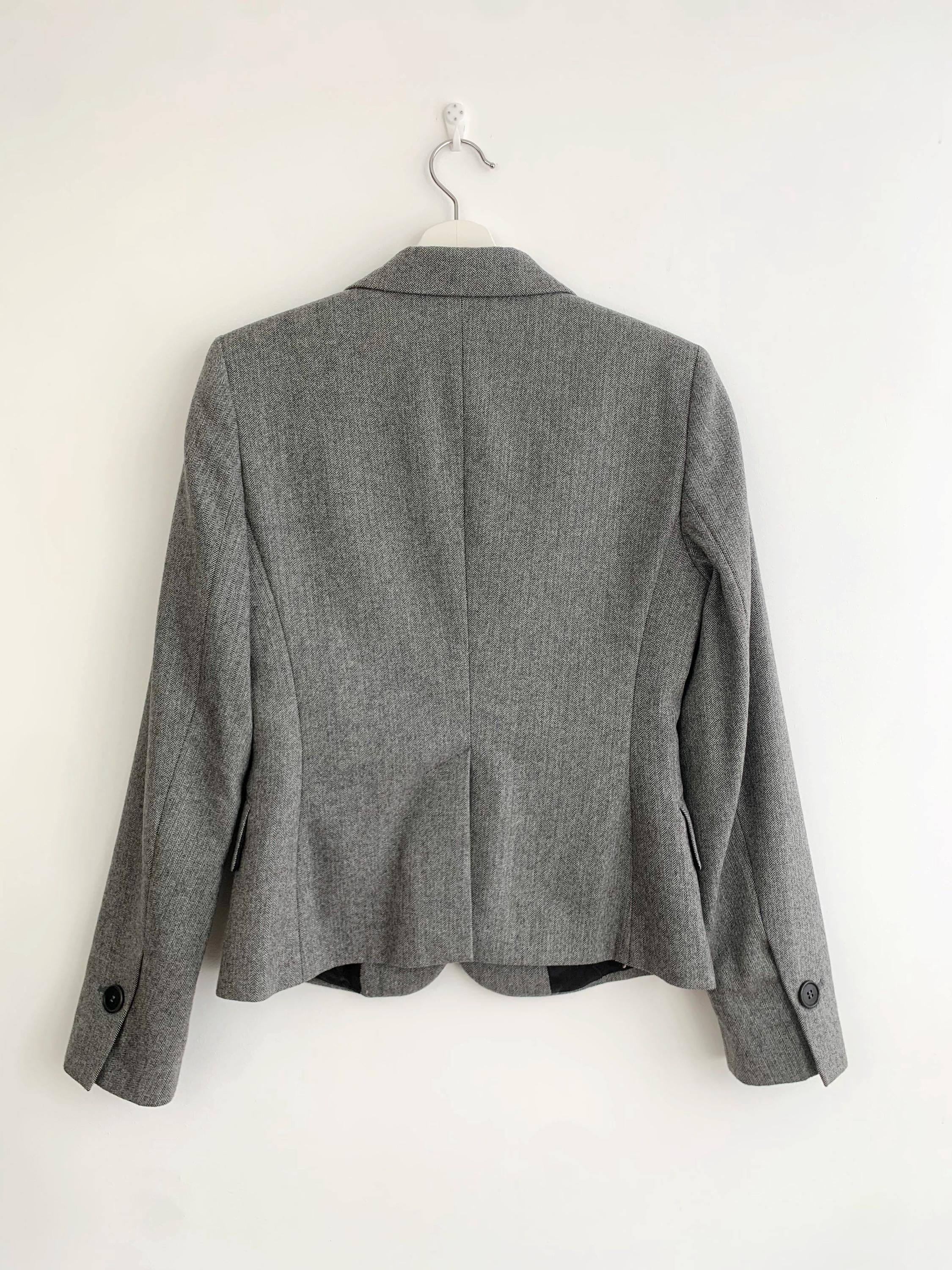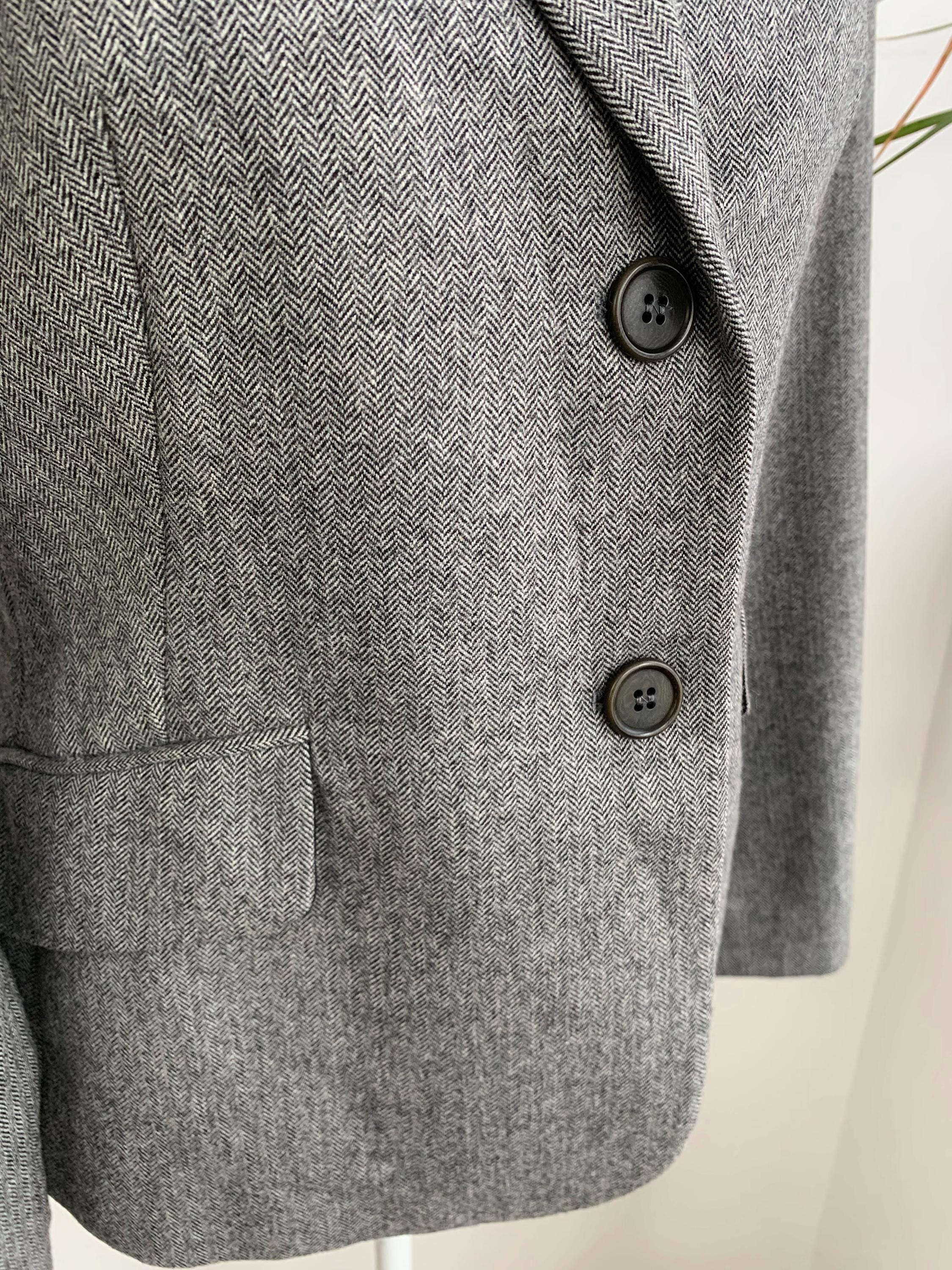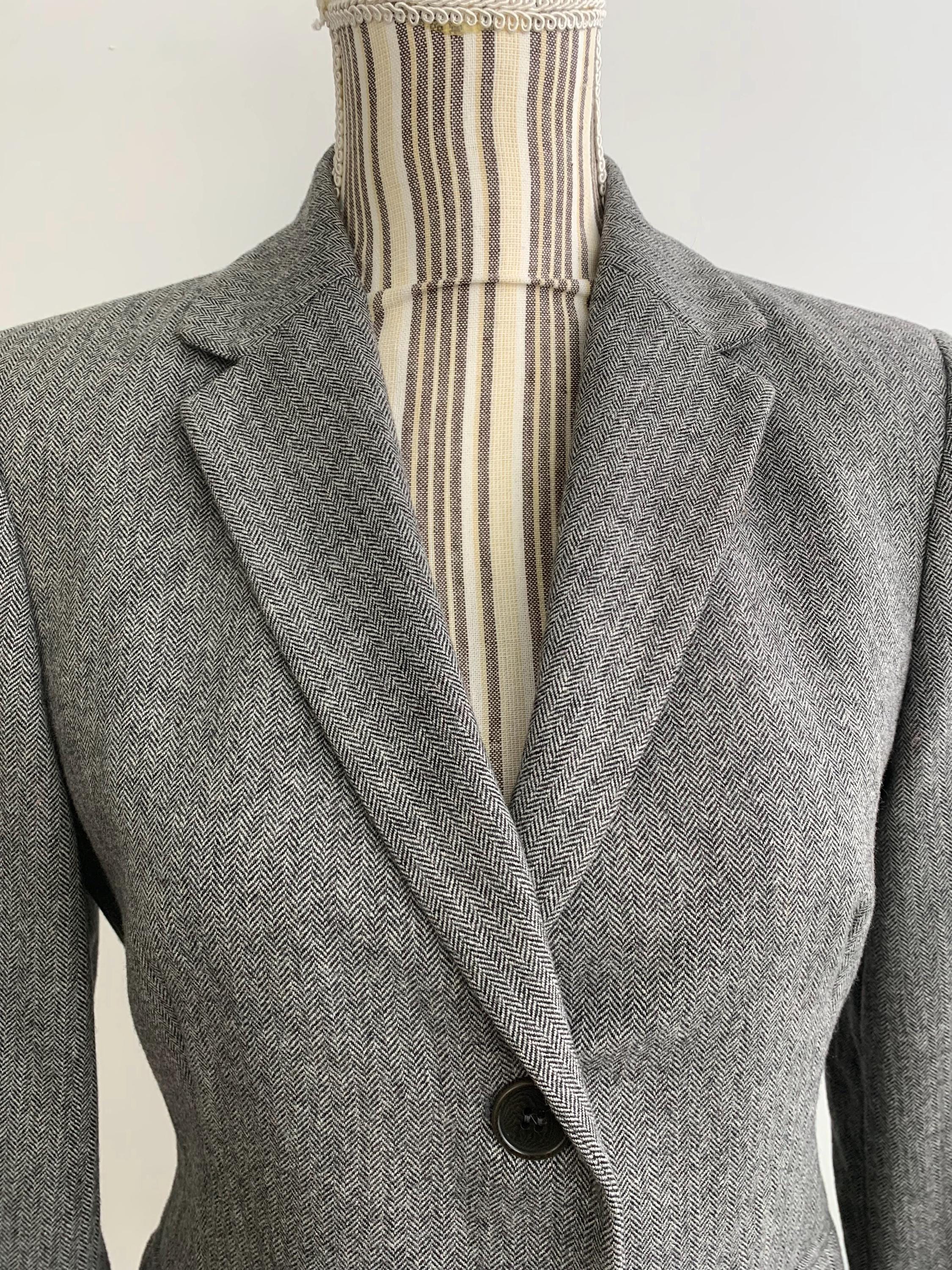 Discover a timeless wardrobe staple with this classic vintage Benetton herringbone blazer for women in size S from the 1990s. Crafted from a luxurious blend of wool and polyamide, this sophisticated grey jacket features a refined herringbone pattern that adds texture and depth to any outfit. The structured, two-button silhouette creates a sharp and polished look, while the notch lapels and imitation flap pockets offer a professional, classic feel. This wool blazer is fully lined with smooth viscose for comfort and easy layering. Whether you're heading to the office or looking for the perfect piece to complete a smart-casual ensemble, this Benetton wool blazer is a versatile and high-quality vintage find. Its durable material and timeless design ensure it will be a favorite for years to come.