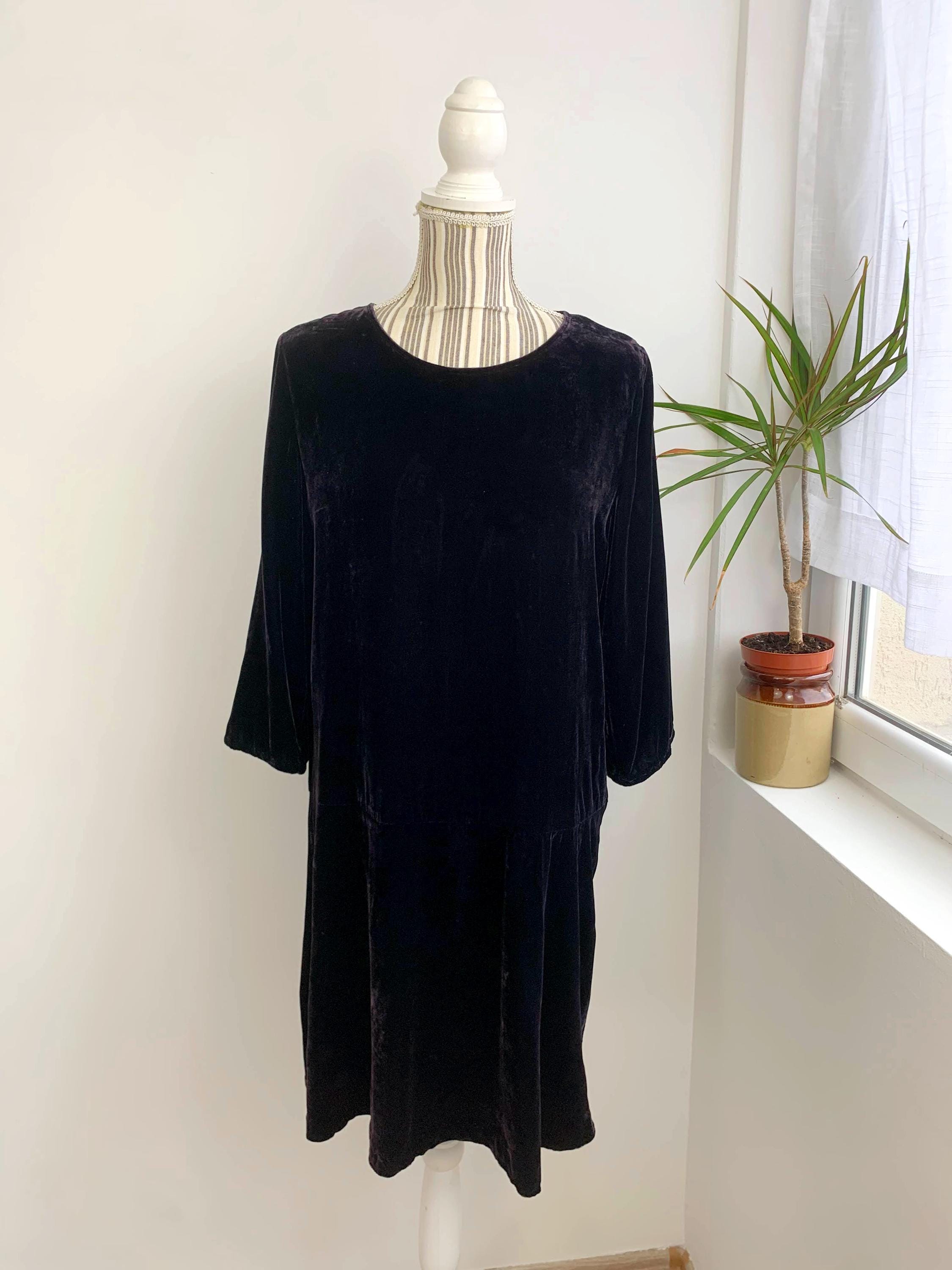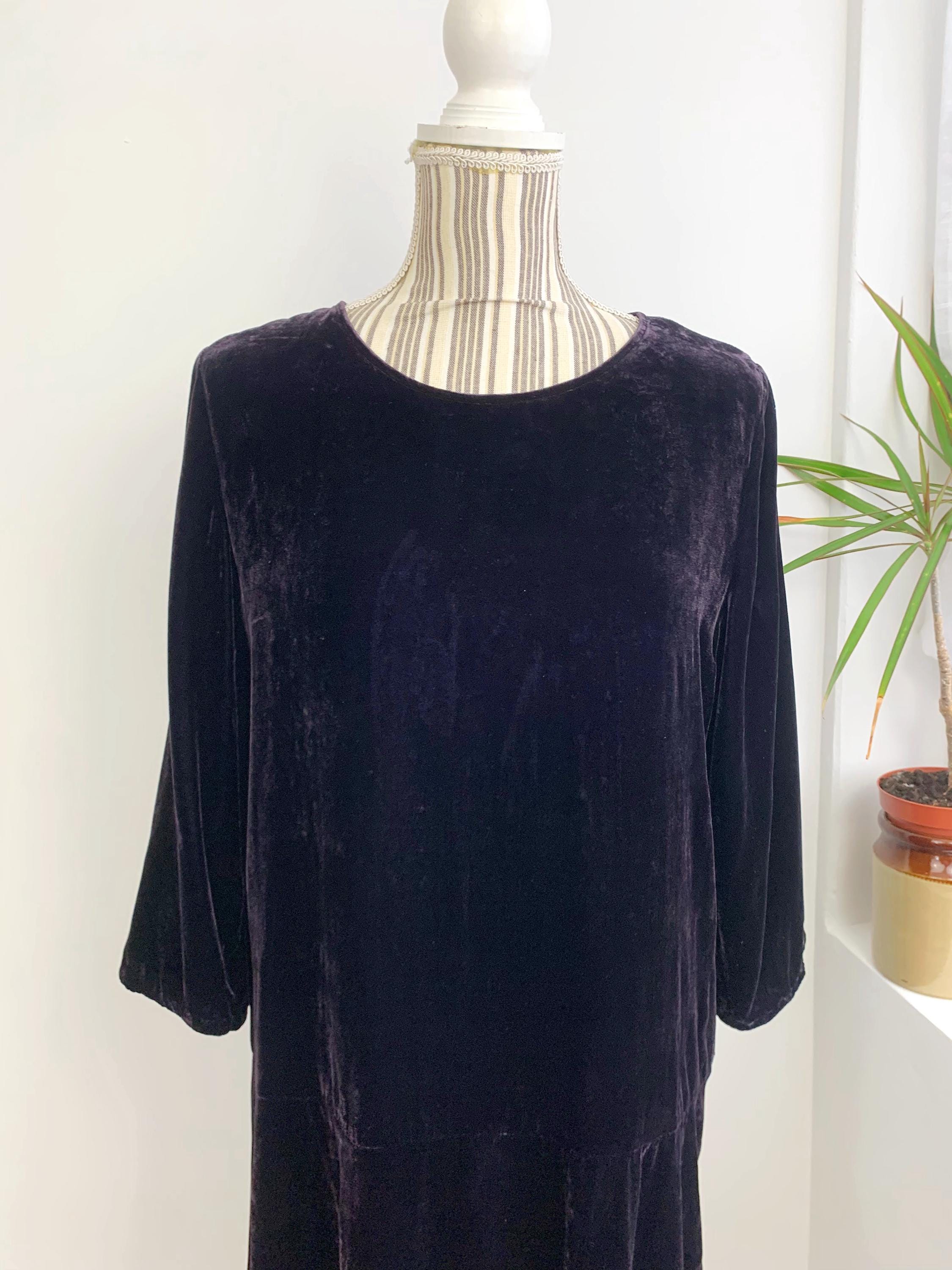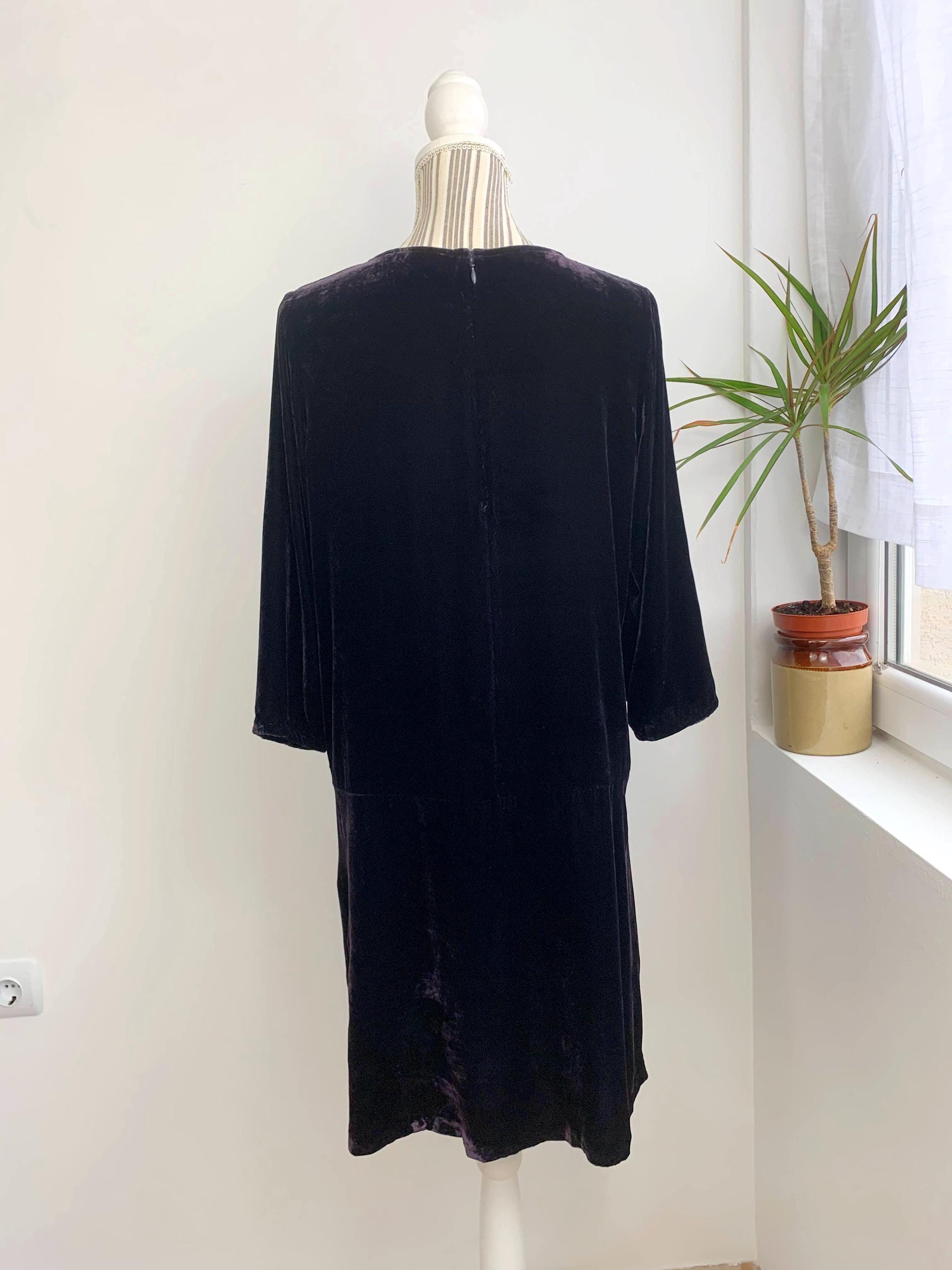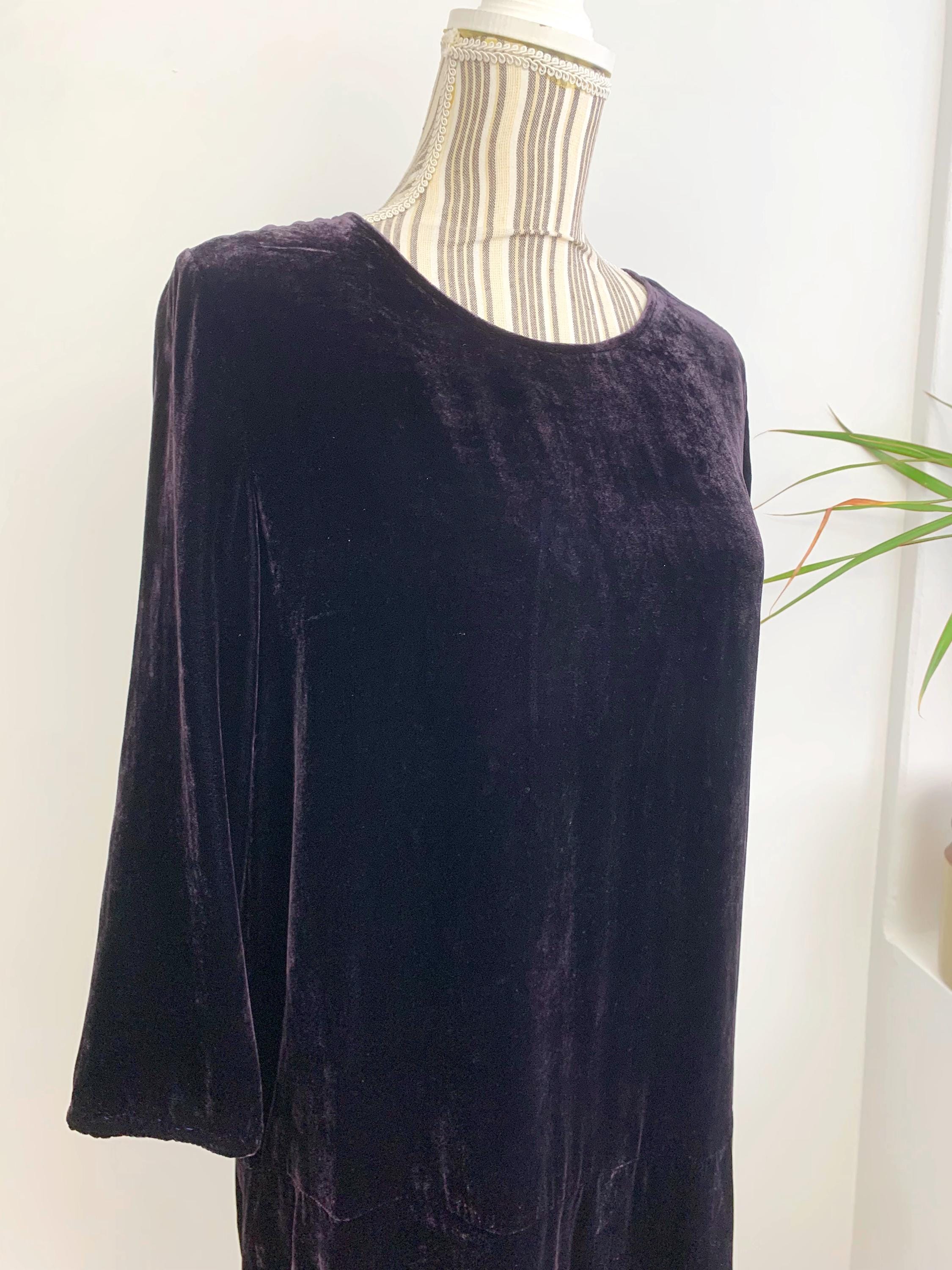 Make a statement at your next event with this stunning vintage Samsøe Samsøe velvet dress in size M. Crafted from a luxurious silk and viscose blend, this dress drapes beautifully and feels incredibly soft to the touch. The rich, deep eggplant purple color of the velvet adds an elegant and sophisticated touch, perfect for a cocktail party, holiday gathering, or a special night out. The simple yet chic tunic silhouette and three-quarter length sleeves give it a timeless look, while the high-quality fabric and minimalist design embody the best of late 90s and Y2K fashion. This piece is a true vintage gem that combines comfort, style, and a touch of glamour.