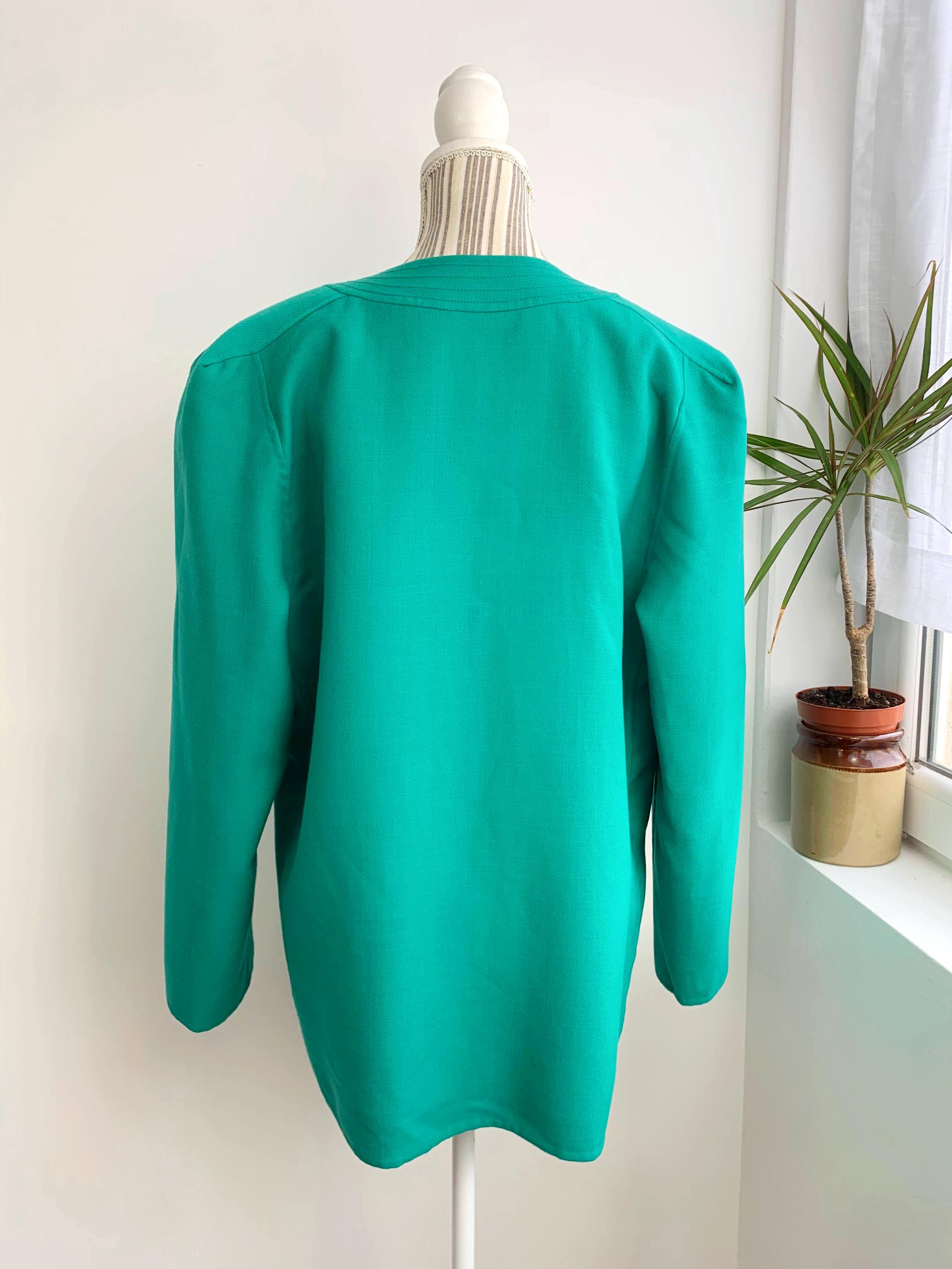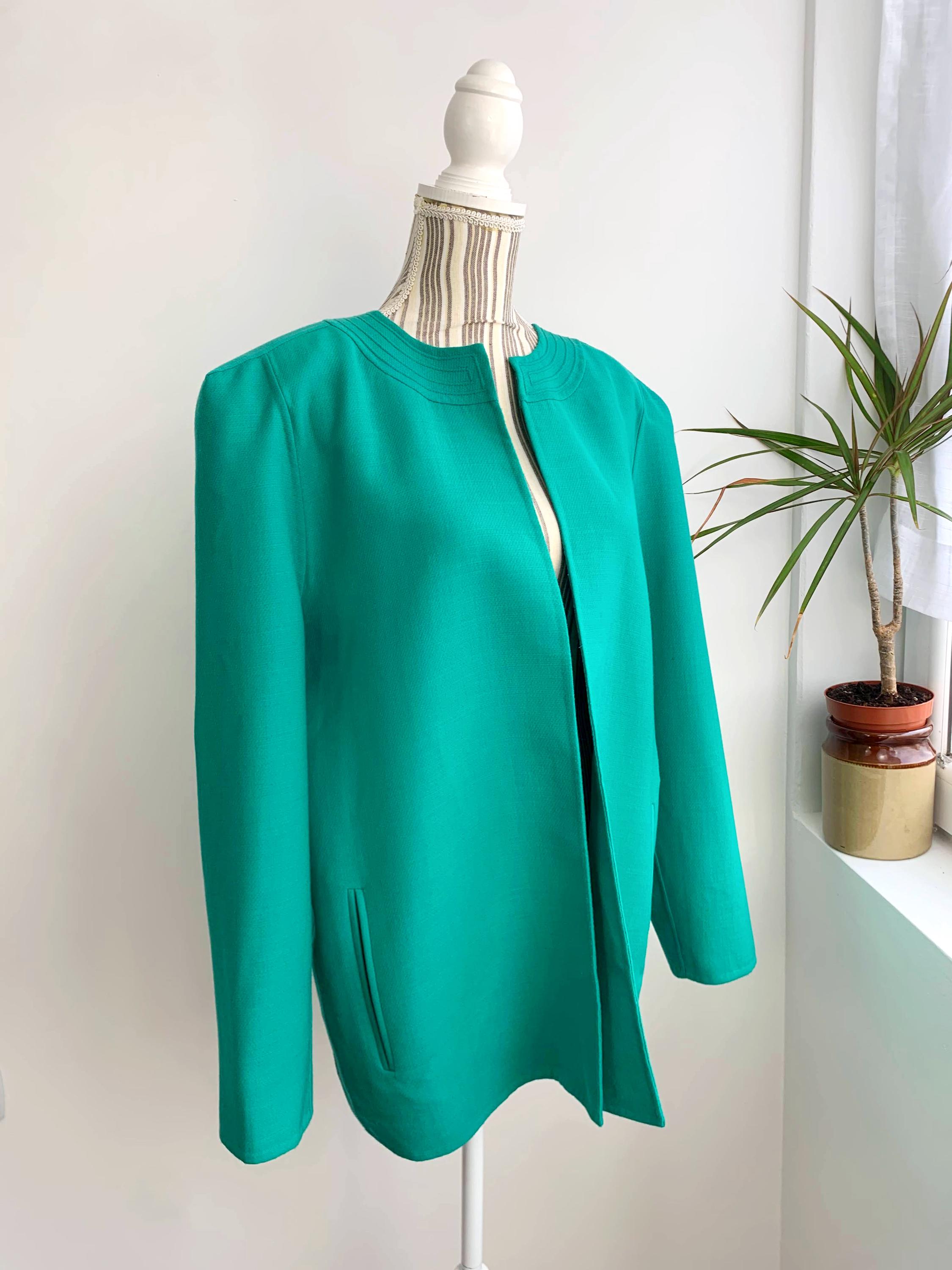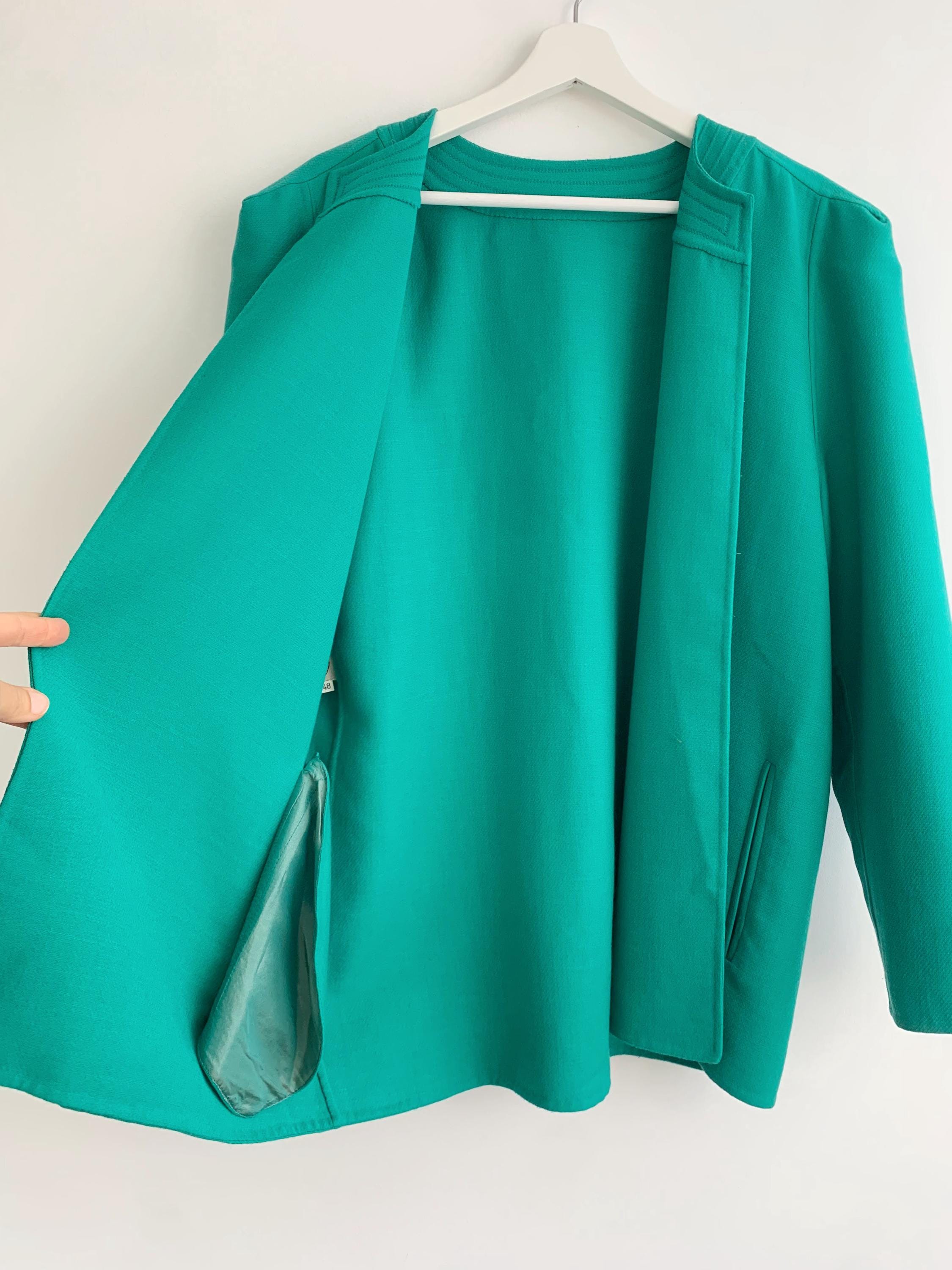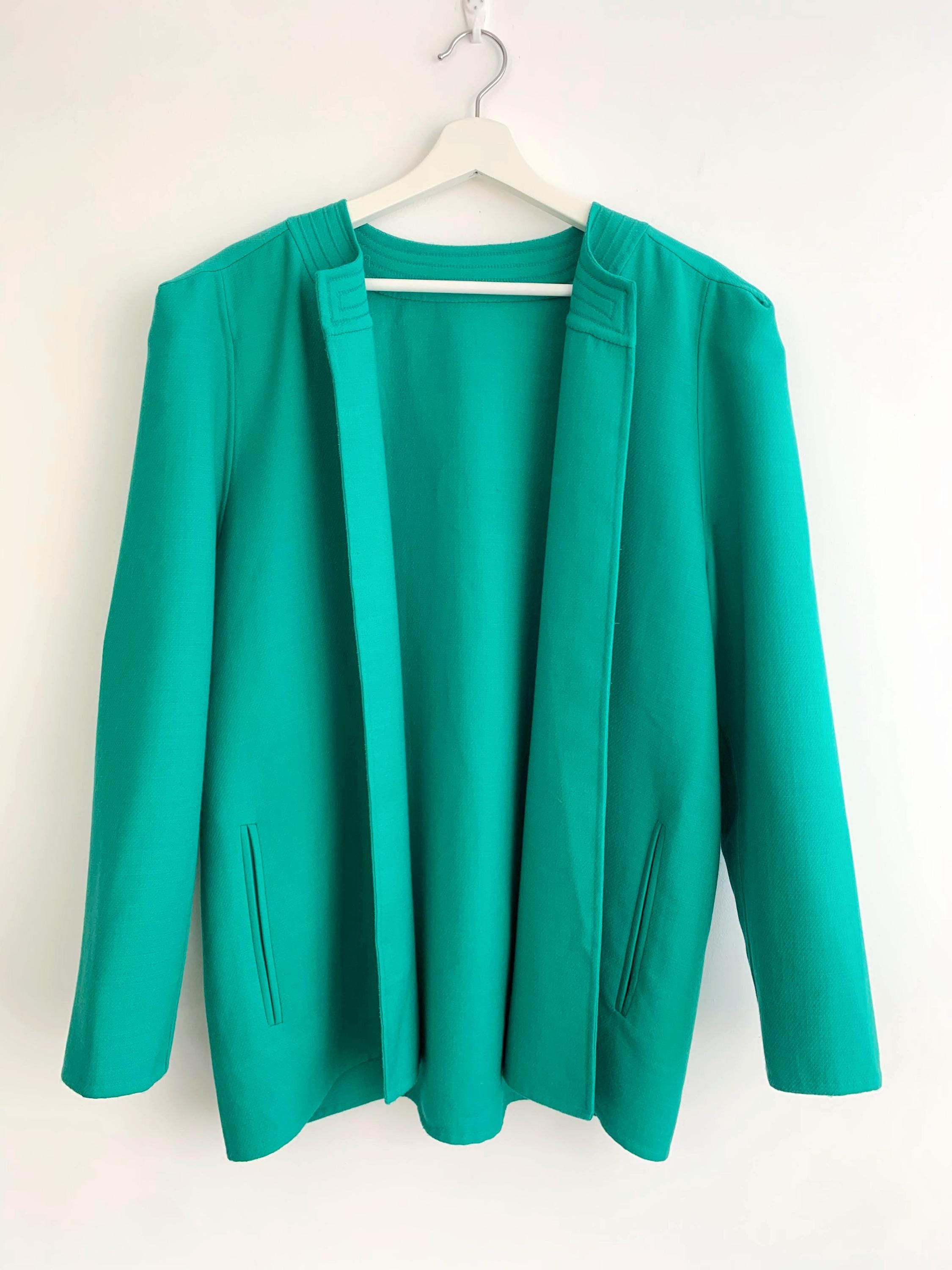 Step back in time with this stunning vintage 80s 100% virgin wool blazer by Caprice Italy in size L / XL, crafted from the finest pure virgin wool by Lanerie Luigi Colombo. This eye-catching emerald green oversized jacket is a true statement piece, perfect for adding a pop of color to any outfit. The clean, collarless design and simple open front give it a modern, minimalist feel, while the structured shoulders and boxy, relaxed fit are quintessential 80s style. It's the perfect layering piece, acting as a lightweight coat or a cozy cardigan. This unlined pure wool jacket features subtle vertical pockets on the front and a beautifully stitched detail around the neckline. This high-quality Italian-made piece is a must-have for any vintage clothing collector or anyone looking to add a touch of retro chic to their wardrobe.