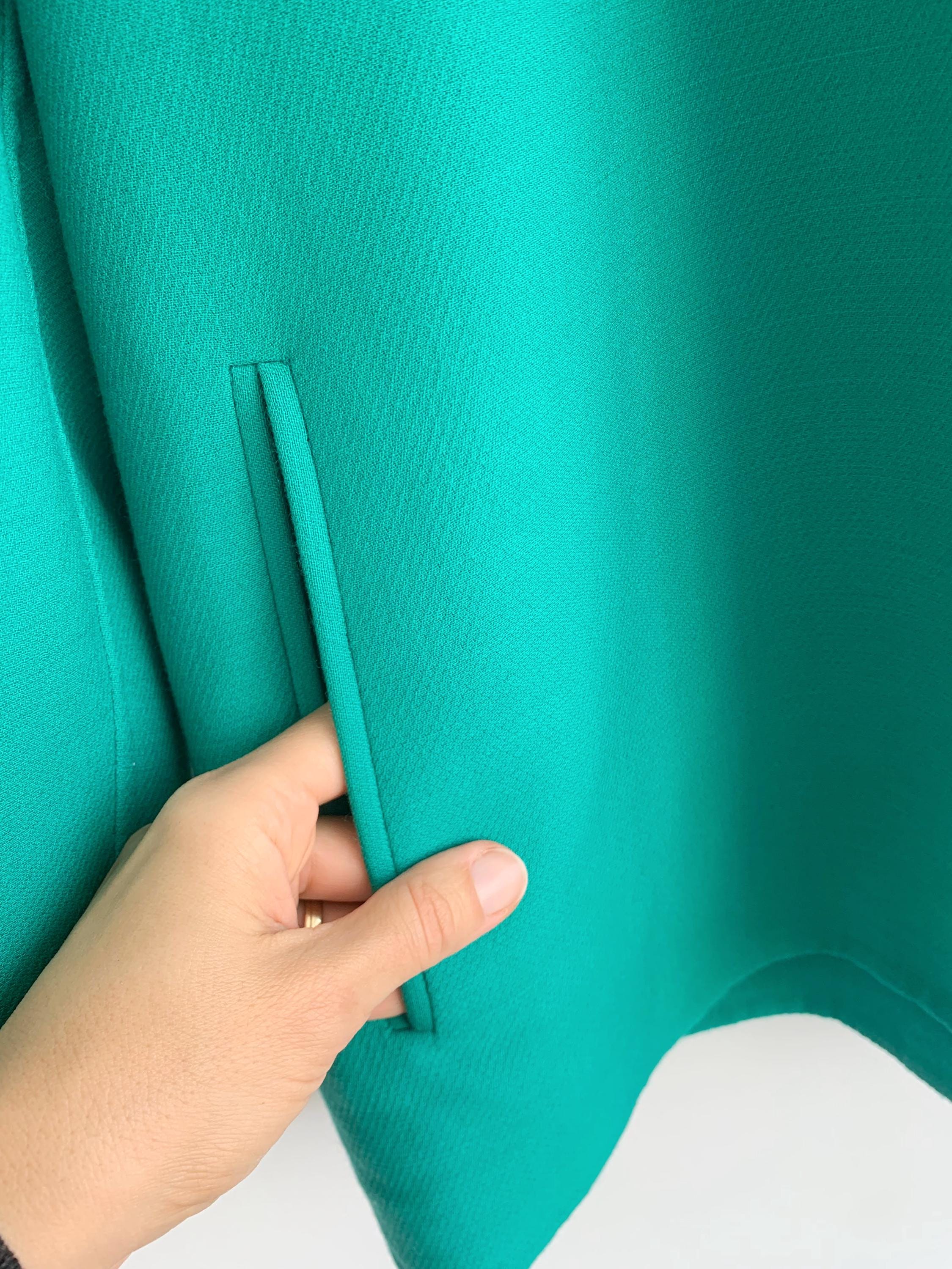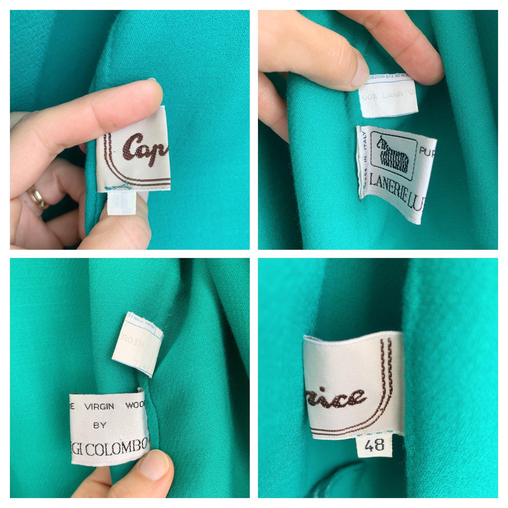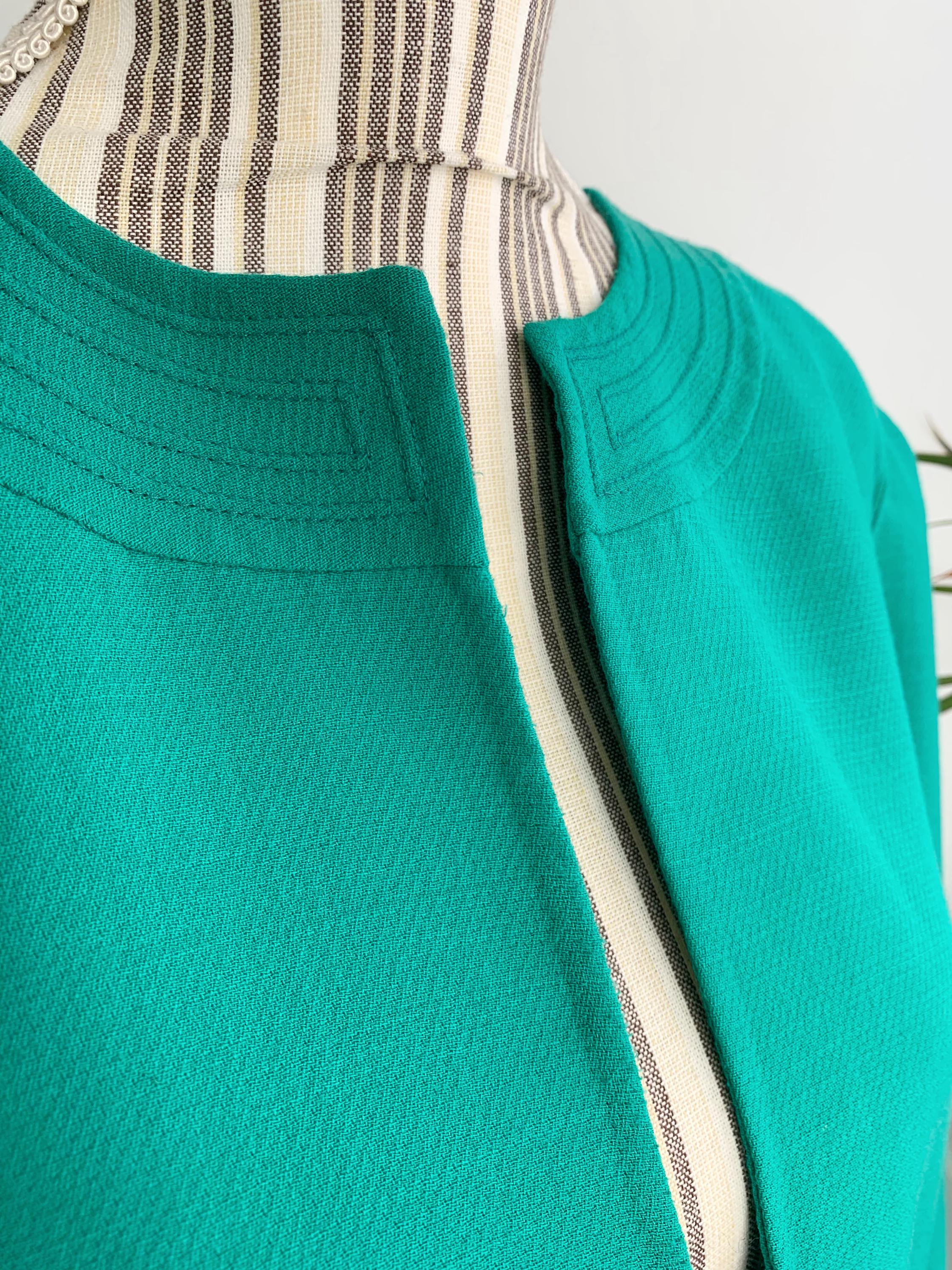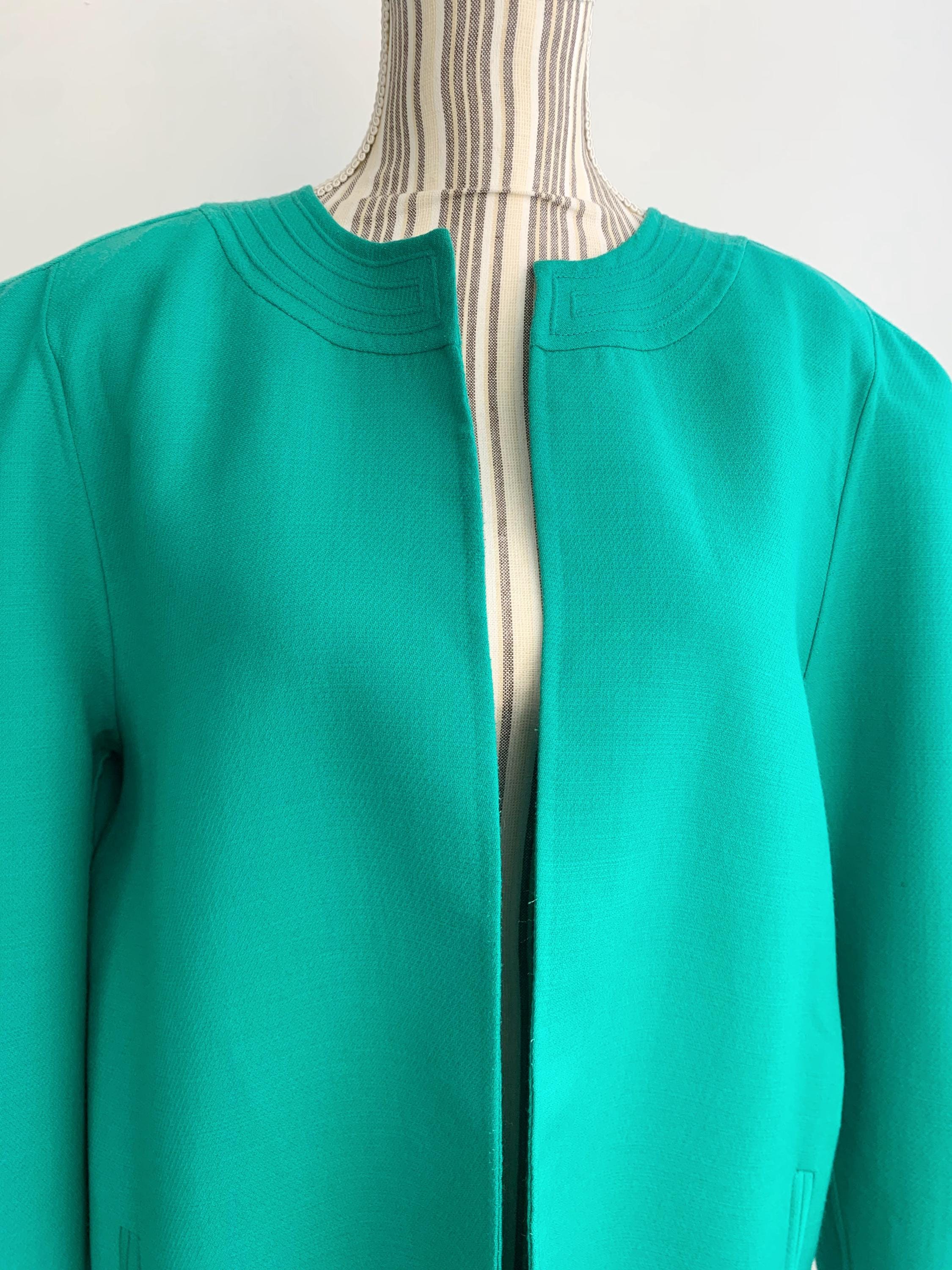 Step back in time with this stunning vintage 80s 100% virgin wool blazer by Caprice Italy in size L / XL, crafted from the finest pure virgin wool by Lanerie Luigi Colombo. This eye-catching emerald green oversized jacket is a true statement piece, perfect for adding a pop of color to any outfit. The clean, collarless design and simple open front give it a modern, minimalist feel, while the structured shoulders and boxy, relaxed fit are quintessential 80s style. It's the perfect layering piece, acting as a lightweight coat or a cozy cardigan. This unlined pure wool jacket features subtle vertical pockets on the front and a beautifully stitched detail around the neckline. This high-quality Italian-made piece is a must-have for any vintage clothing collector or anyone looking to add a touch of retro chic to their wardrobe.