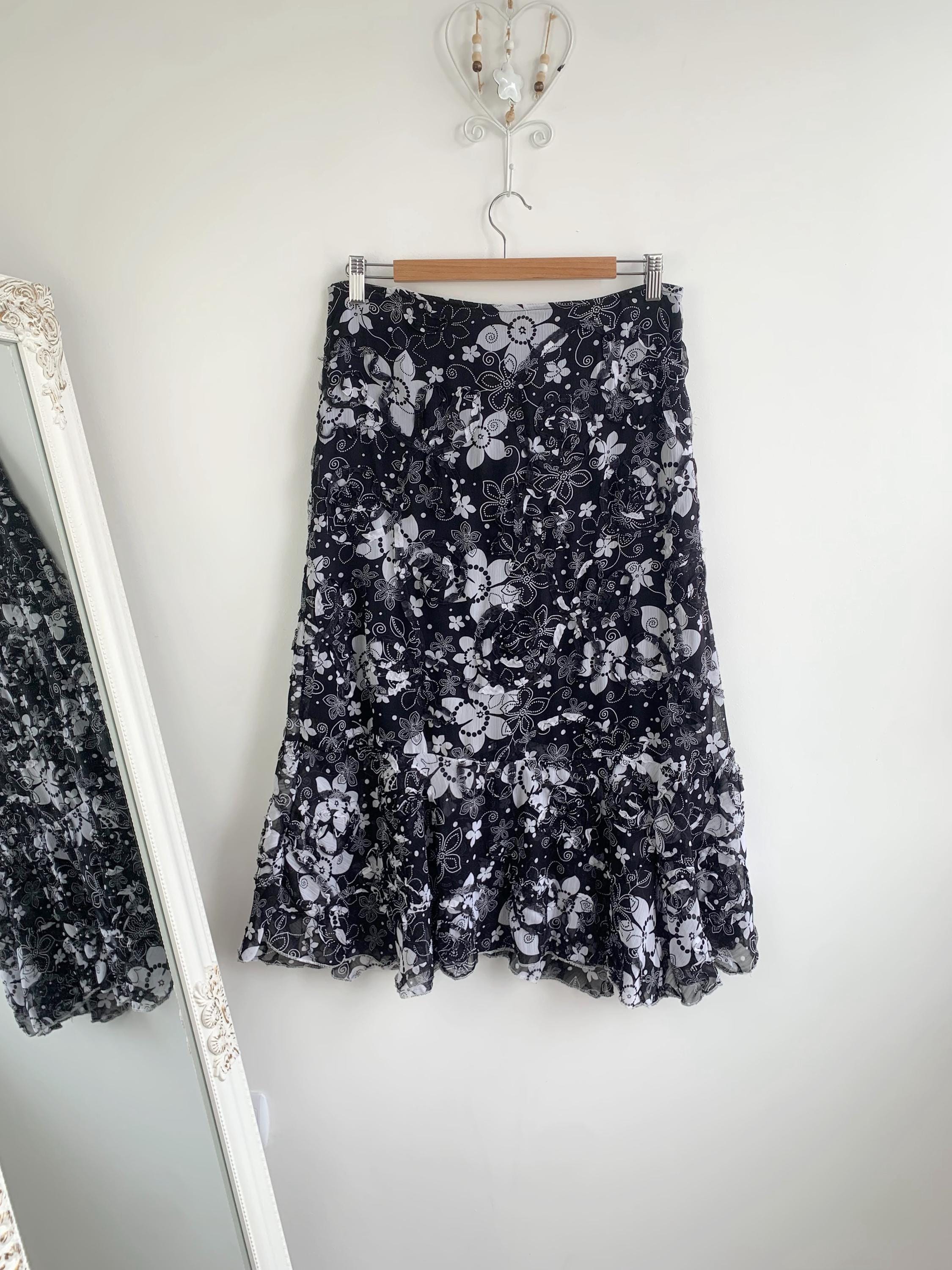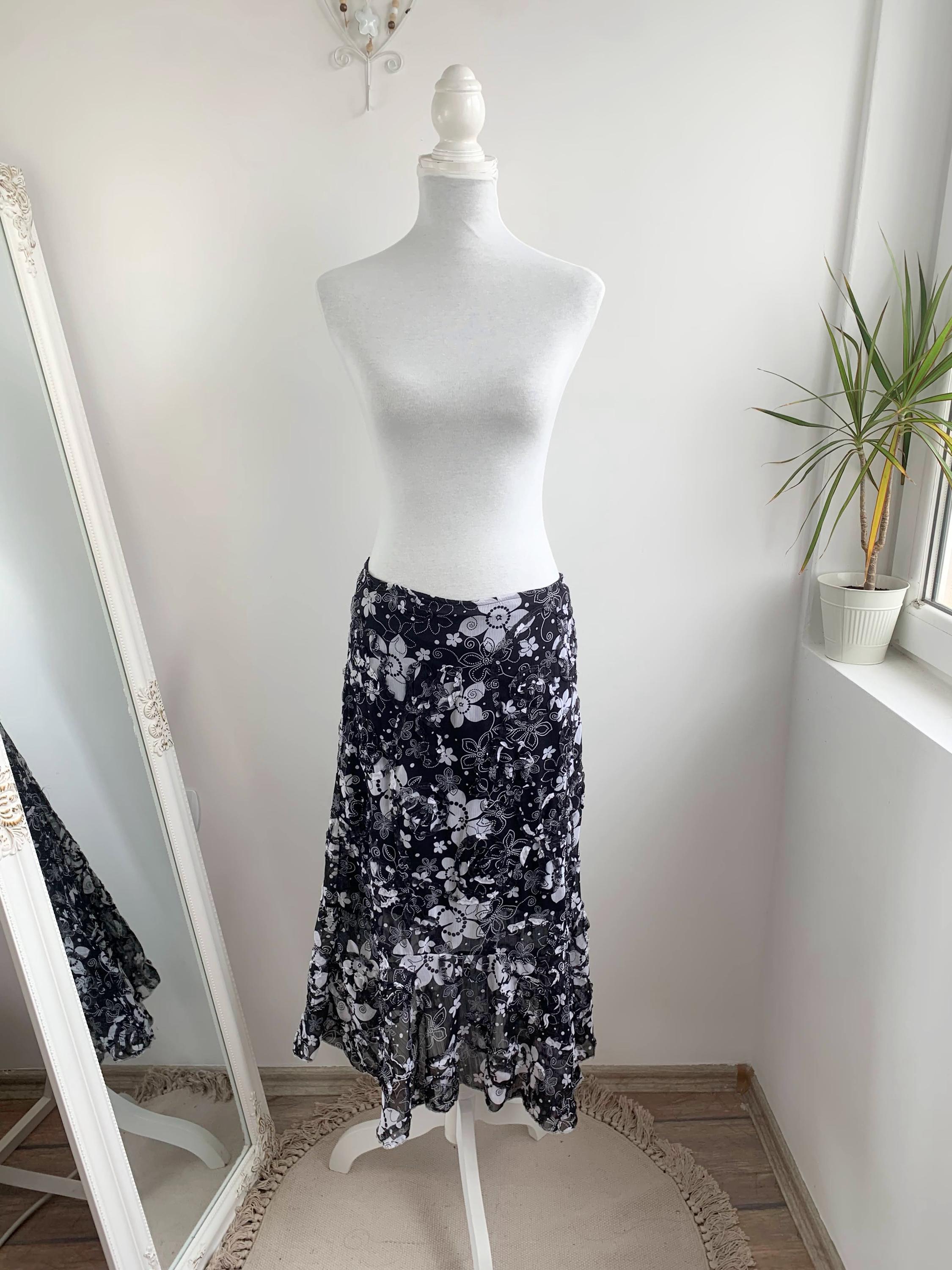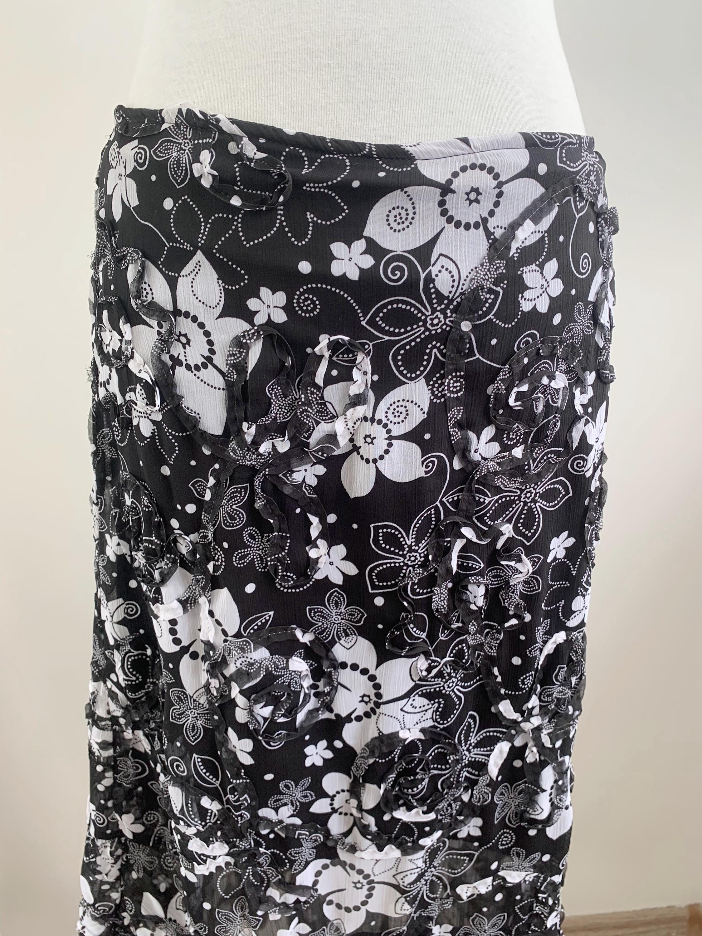 Step back into the chic and playful style of the late 90s and early 2000s with this beautiful vintage midi skirt. Featuring a striking black and white floral print with delicate ruffles and a playful front flowy silhouette, this skirt is a true representation of the Y2K aesthetic. The flowy A-line silhouette is both flattering and comfortable, making it a versatile piece for your vintage wardrobe. It's the perfect summer skirt for a bohemian look or a stylish addition to your festival outfits. This Y2K skirt has sheer airy top layer and solid lining underneath, while the hidden zipper creates a perfect .