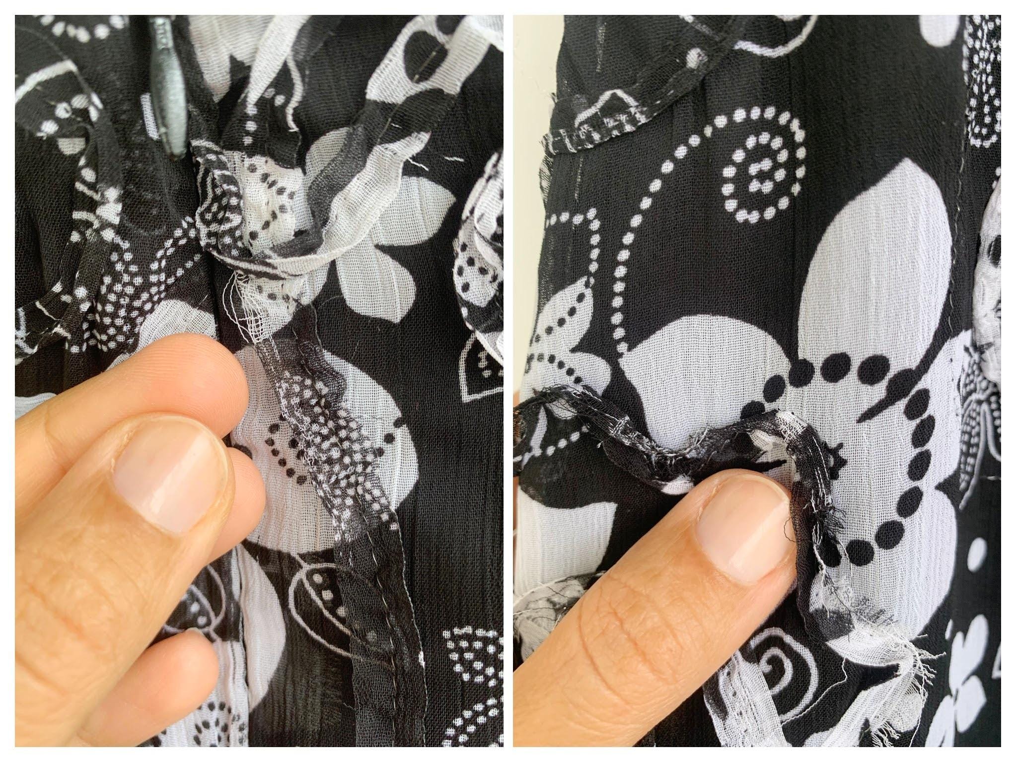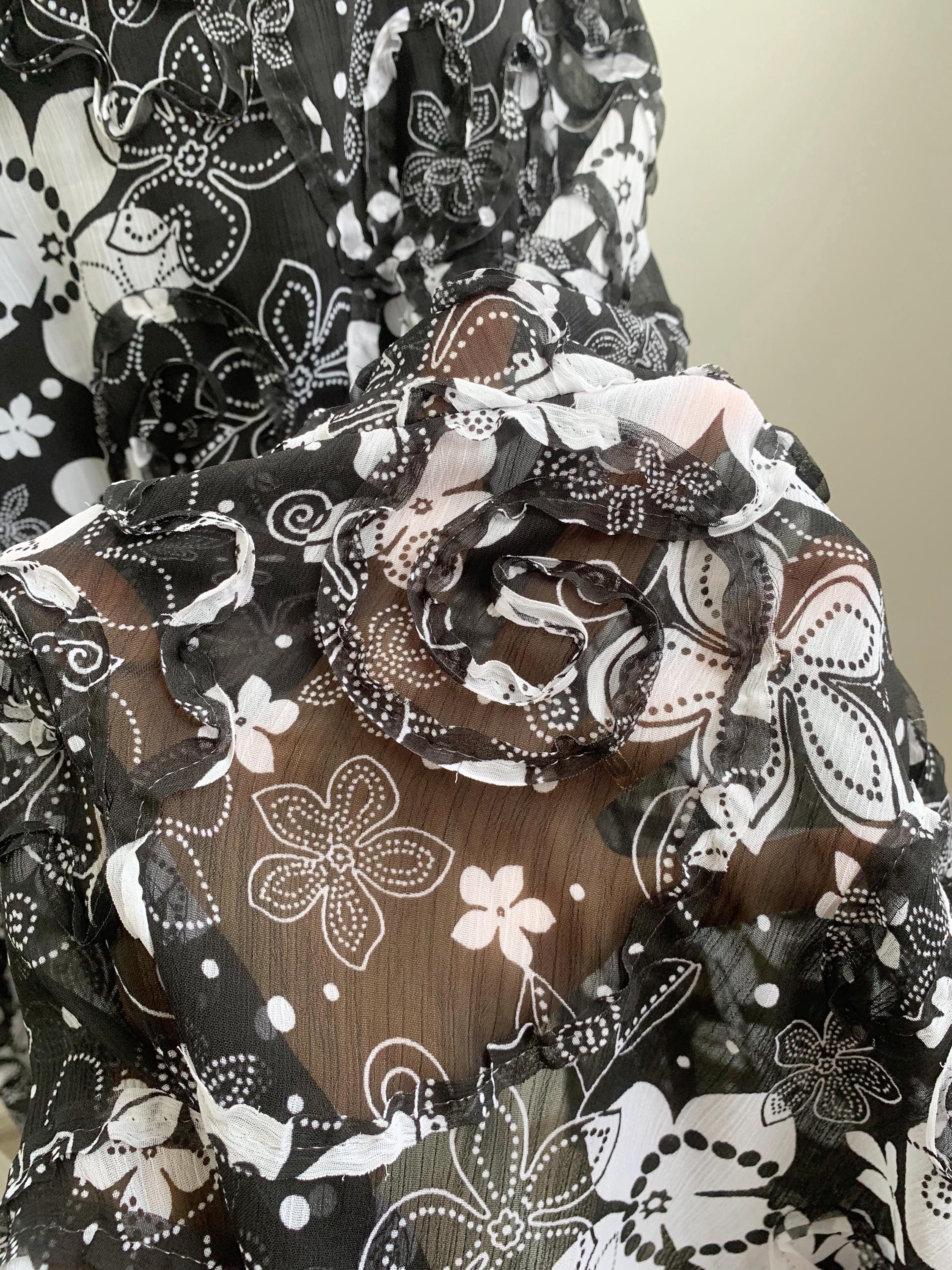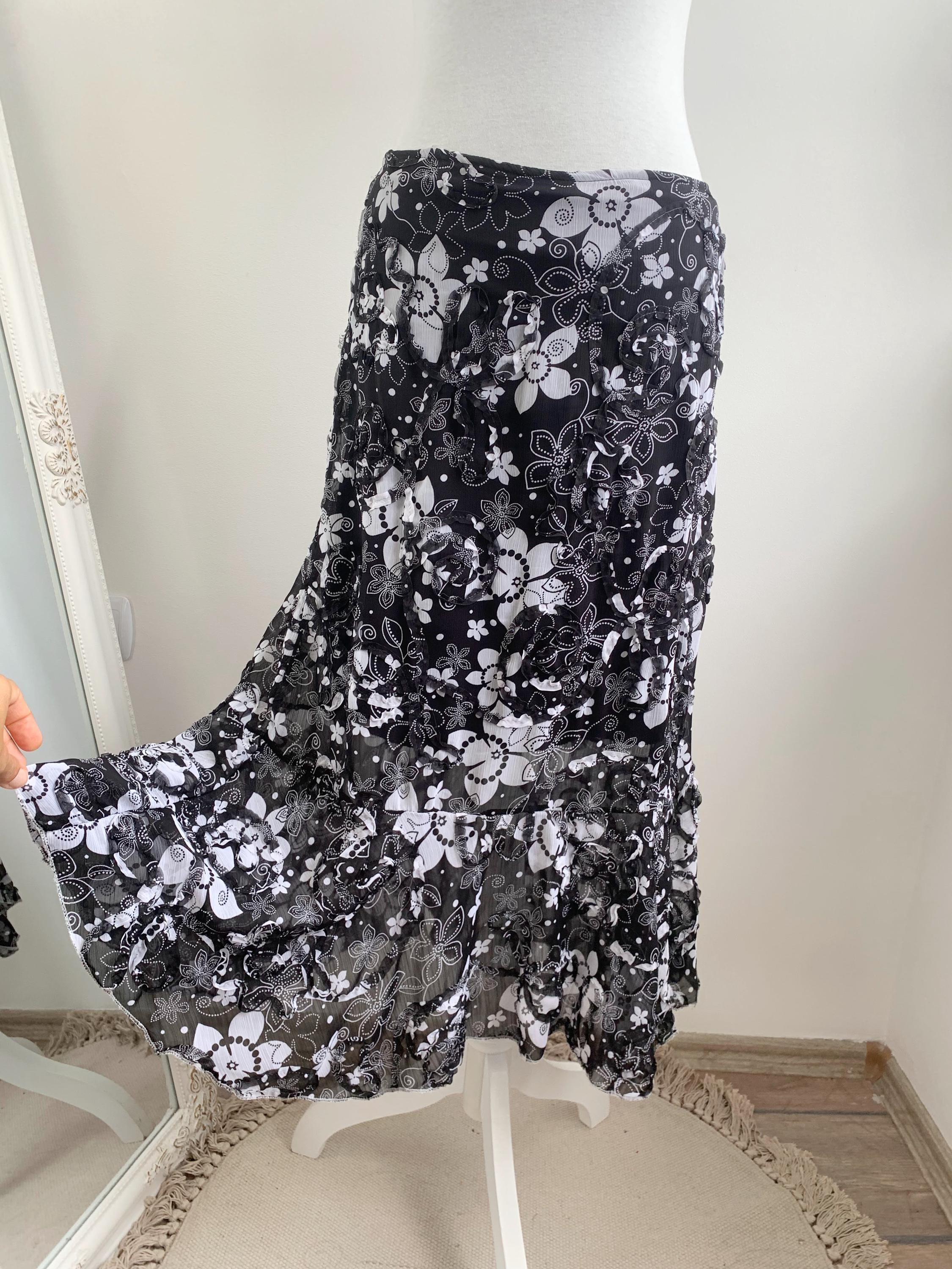 Step back into the chic and playful style of the late 90s and early 2000s with this beautiful vintage midi skirt. Featuring a striking black and white floral print with delicate ruffles and a playful front flowy silhouette, this skirt is a true representation of the Y2K aesthetic. The flowy A-line silhouette is both flattering and comfortable, making it a versatile piece for your vintage wardrobe. It's the perfect summer skirt for a bohemian look or a stylish addition to your festival outfits. This Y2K skirt has sheer airy top layer and solid lining underneath, while the hidden zipper creates a perfect .
