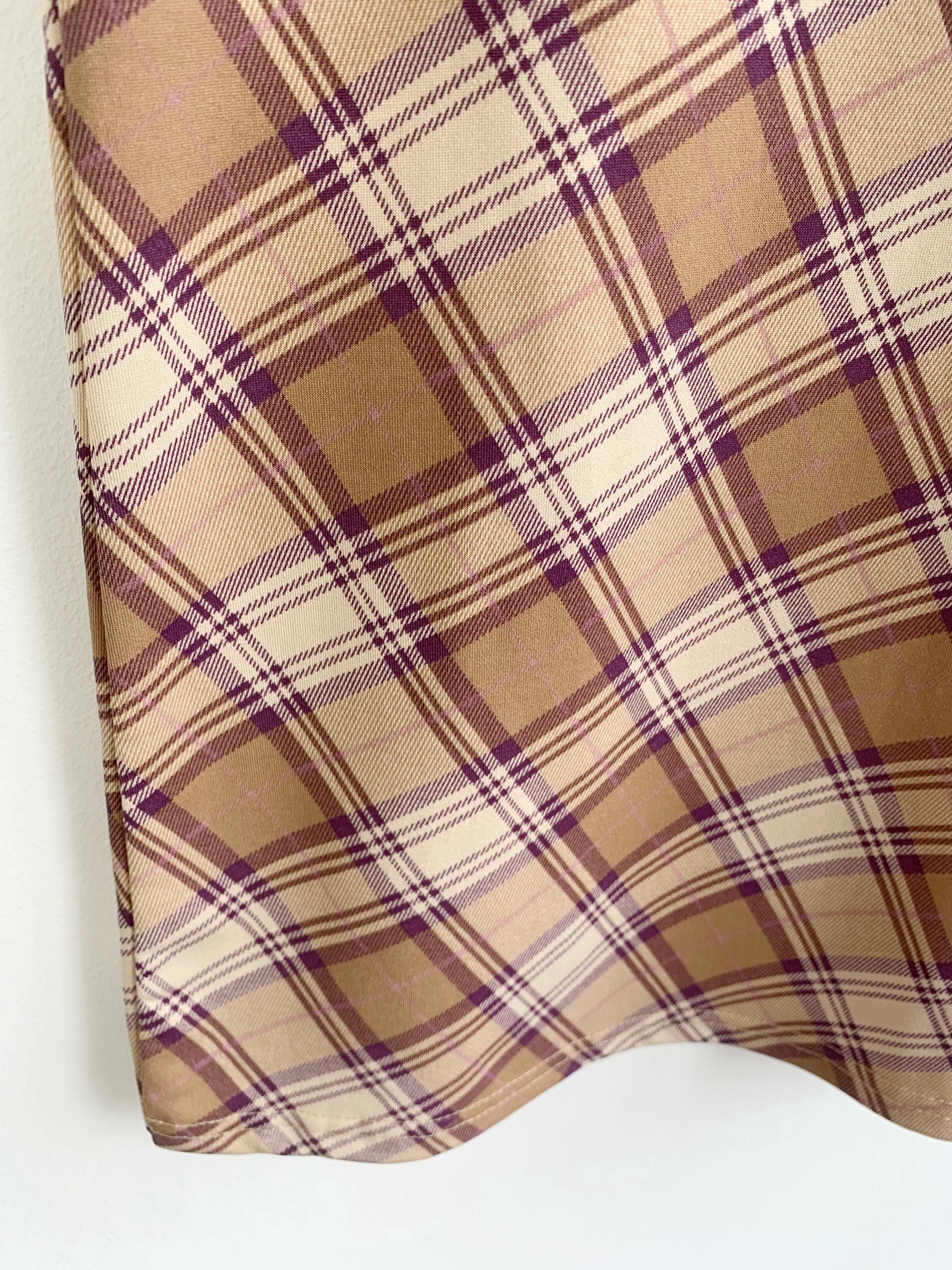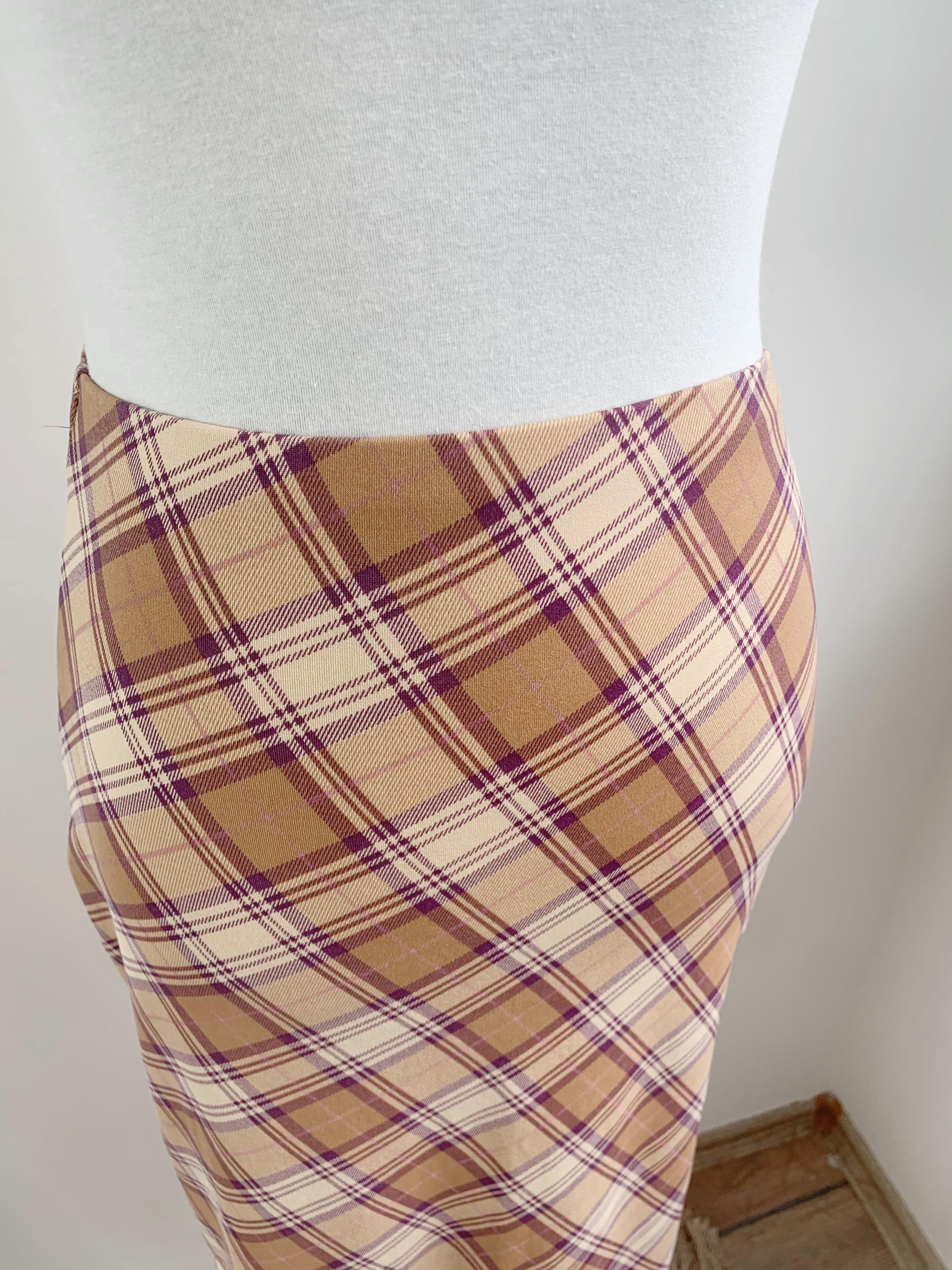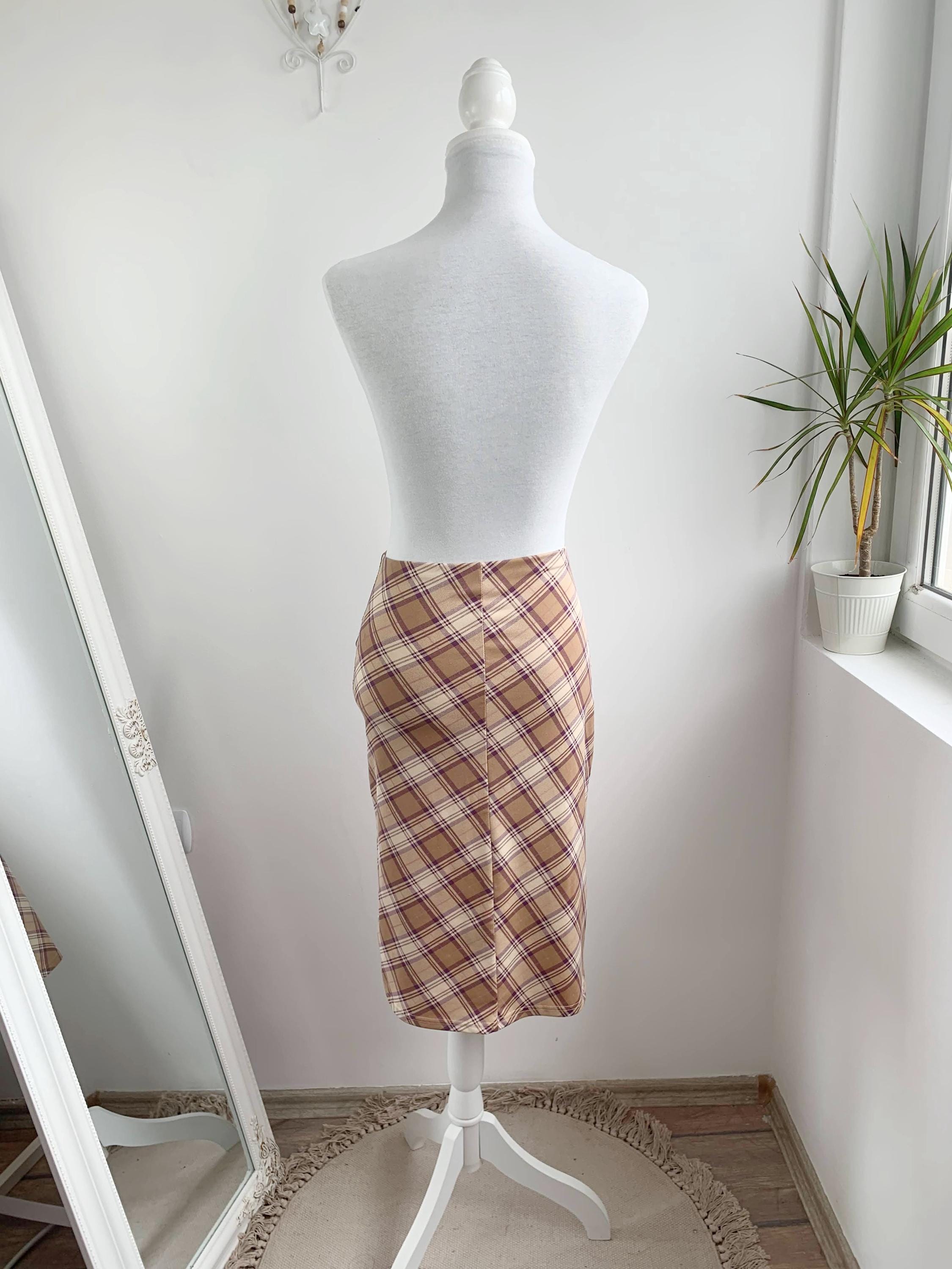 This charming vintage plaid skirt captures the essence of late 90s and early 2000s style with its timeless tartan pattern. The rich tan beige, camel brown and delicate light purple check print gives it a classic academia and grunge aesthetic, perfect for creating a retro and edgy look. Its flattering pencil silhouette and stretchy material make it a comfortable and stylish staple for any vintage lover's wardrobe. Pair it with a simple solid color top for a casual feel or a button-up shirt to lean into the academia trend.
