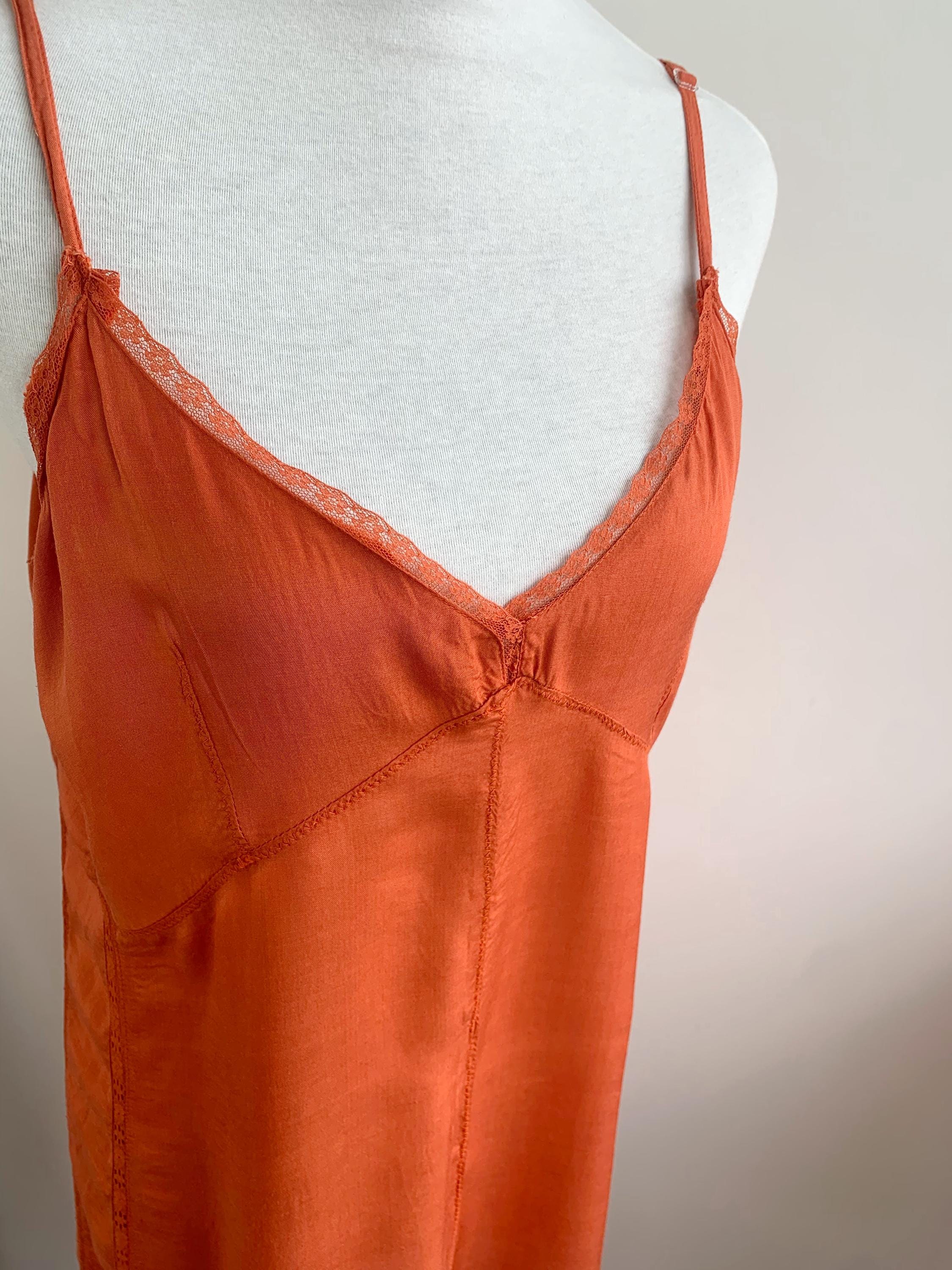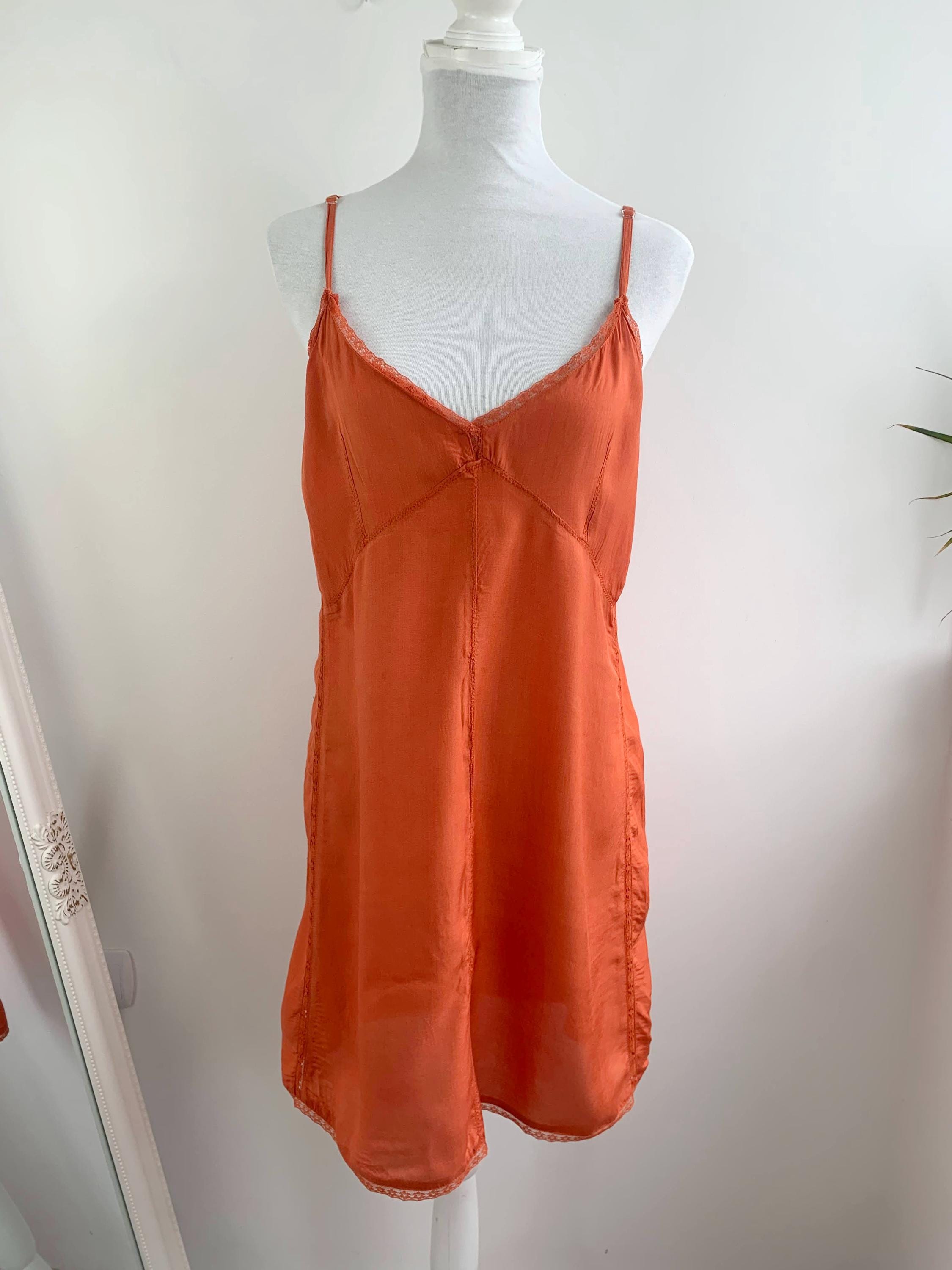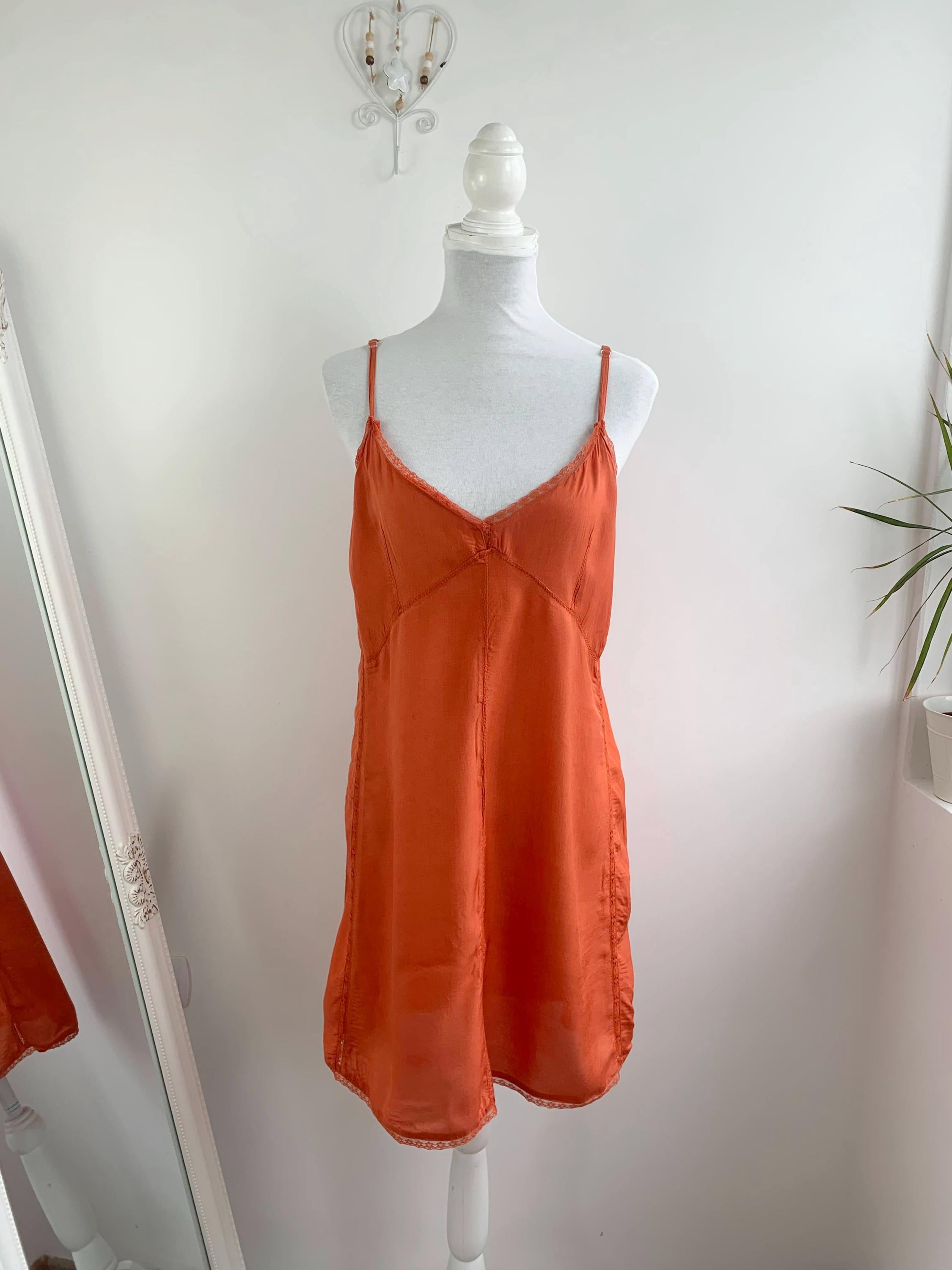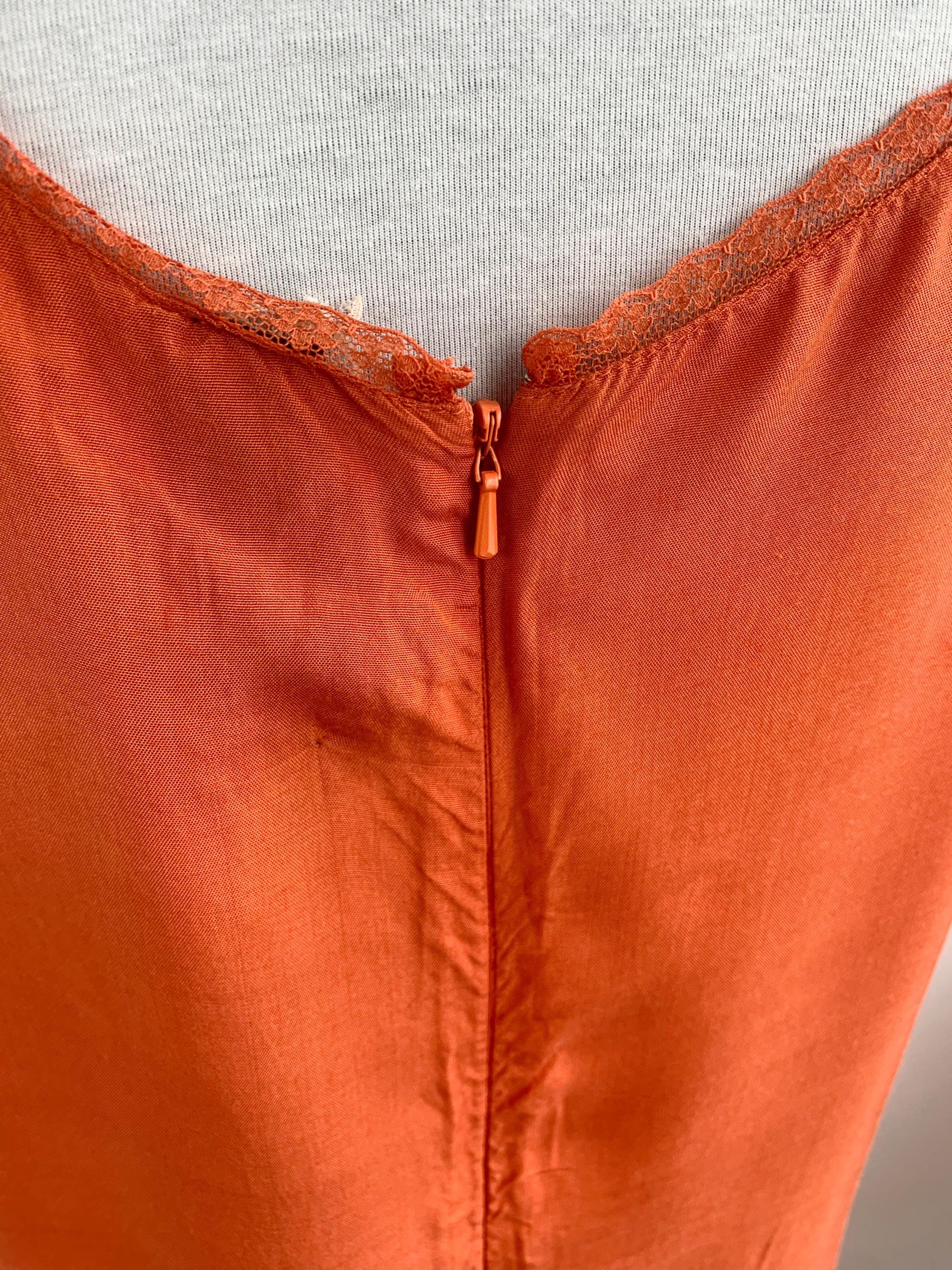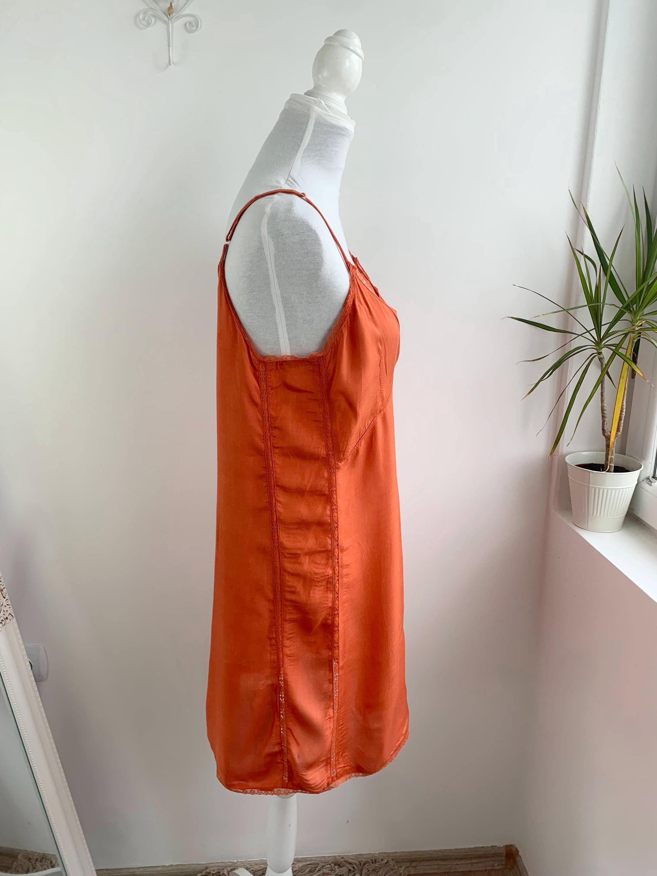 This charming vintage orange slip dress in size L is a perfect example of 90s and early 2000s fashion. The vibrant orange color and delicate lace trim on the neckline give it a soft, romantic feel, while the short silhouette is perfect for a fairy grunge or bohemian aesthetic. The dress is made from a beautiful, smooth viscose material that feels luxurious against the skin. It can be worn on its own as a lightweight summer dress or layered over a t-shirt for a classic retro look. This piece is a must-have for anyone who appreciates the simplicity and effortless style of the era.