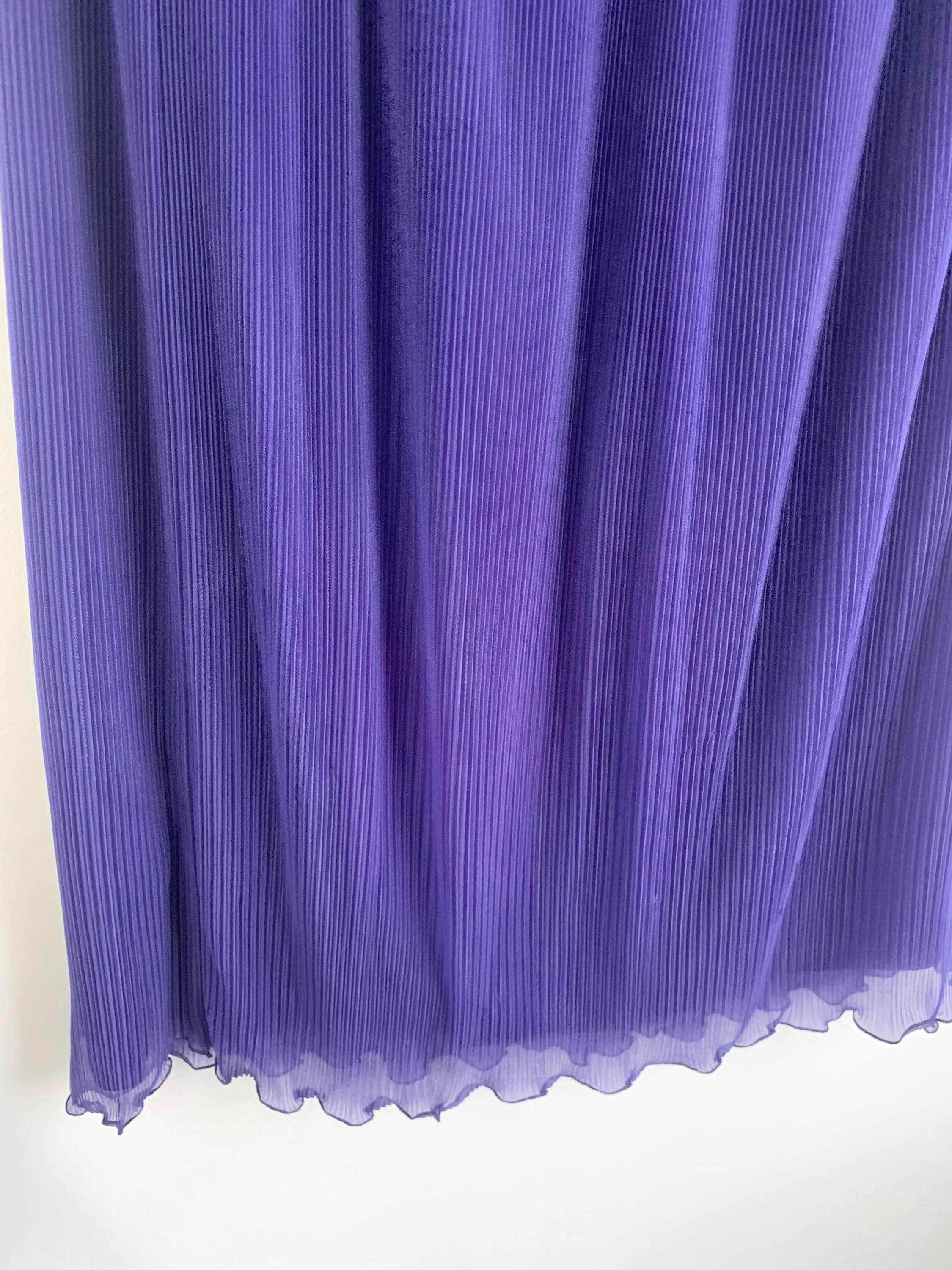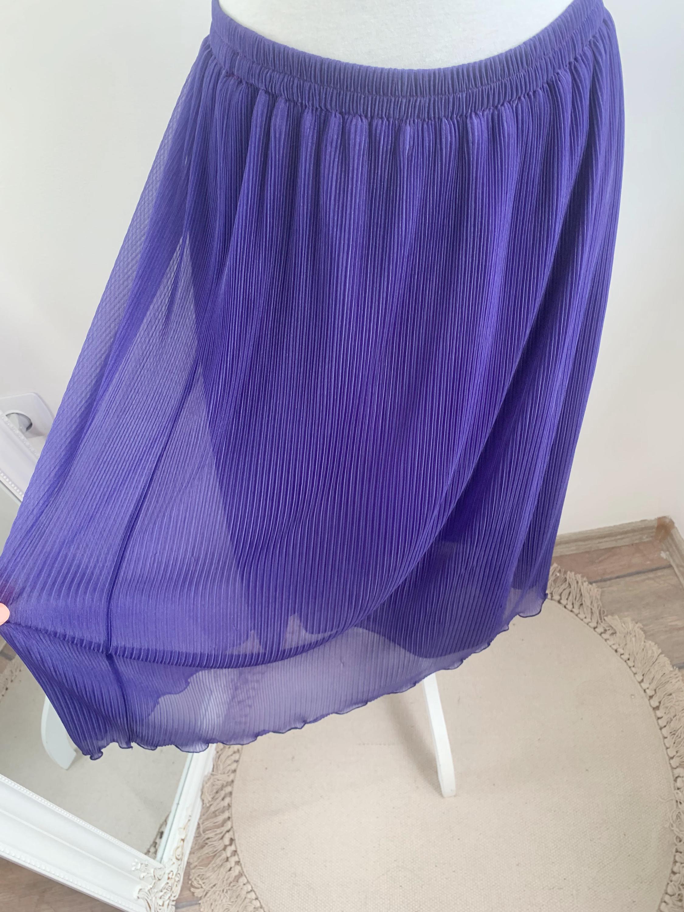 Step back in time with this stunning 80s vintage pleated midi skirt with elasticated waistline in a rich royal purple shade in size M/L. This beautiful accordion-style skirt features fine, permanent pleats that create a graceful A-line silhouette, perfect for adding a touch of retro charm to your wardrobe. The elastic high-waisted design ensures a comfortable and flattering fit, while the full inner lining provides coverage and ensures it drapes beautifully. The fabric has a subtle sheen and is semi-sheer on its own, but the solid lining makes it wearable for any occasion. The hem has a delicate lettuce-edge finish, adding a whimsical detail to this classic piece. This retro purple skirt is perfect for everyday wear, a special event, or as a unique addition to a vintage collection. It's a true statement piece that blends comfort with timeless style.