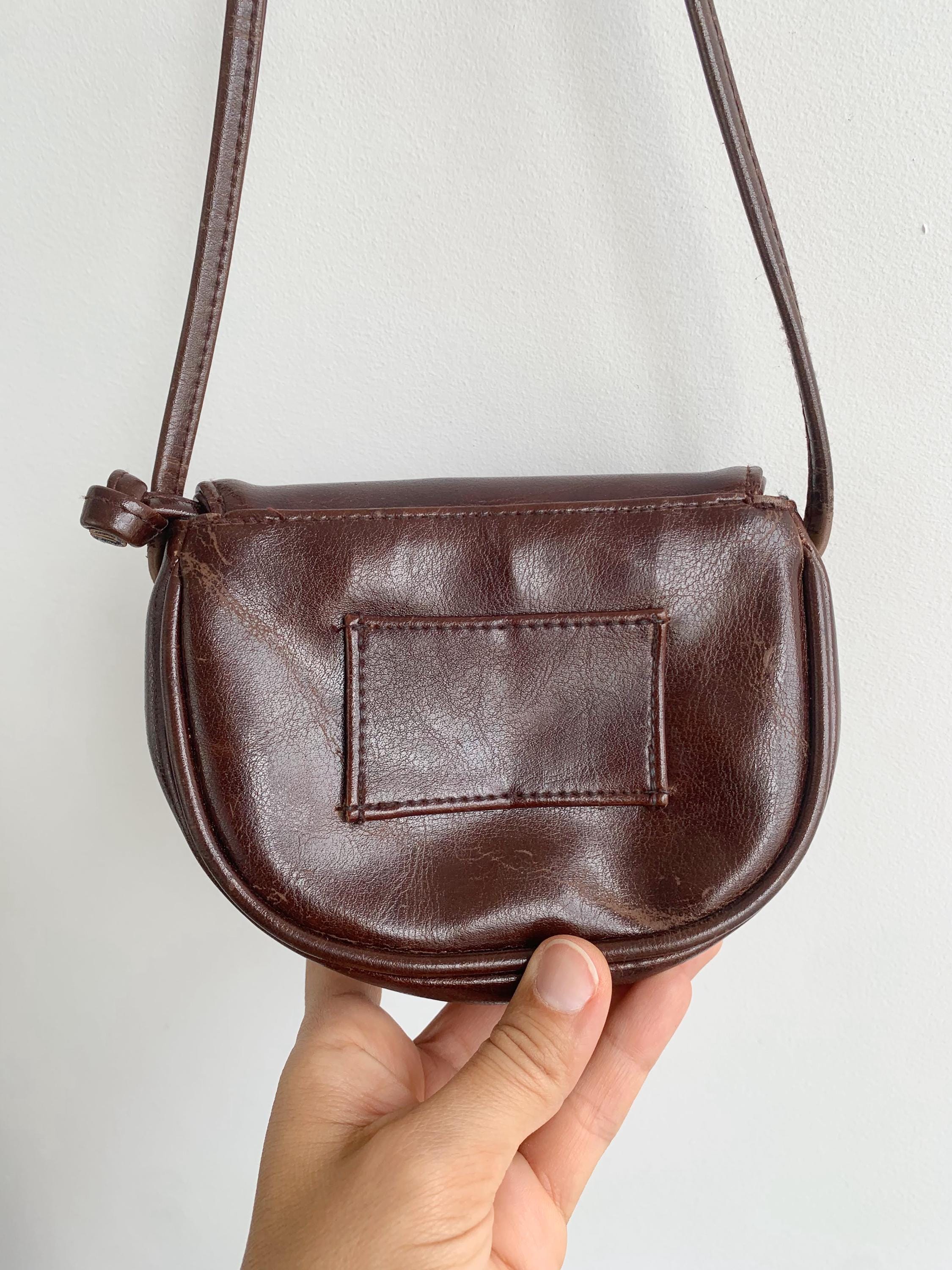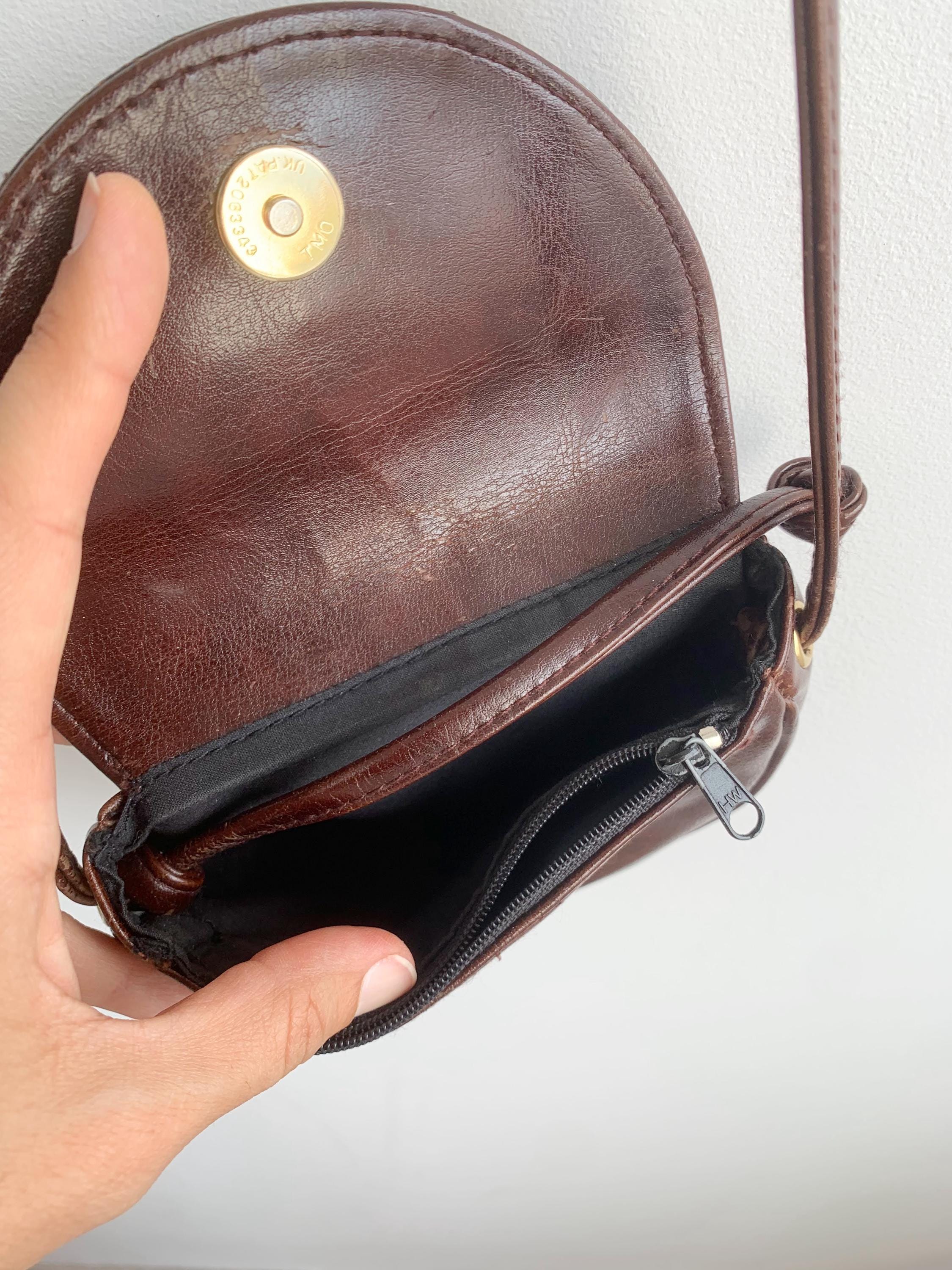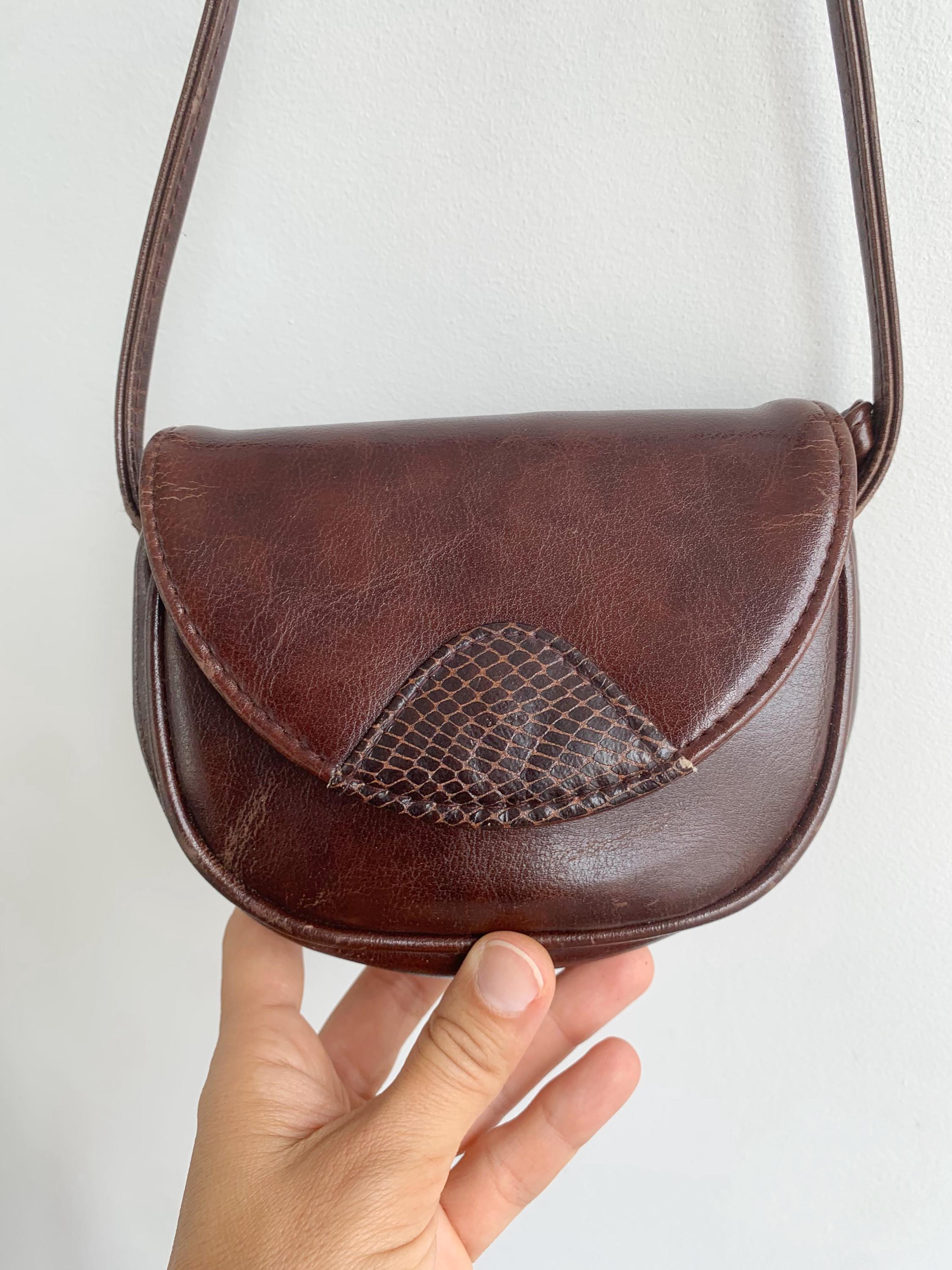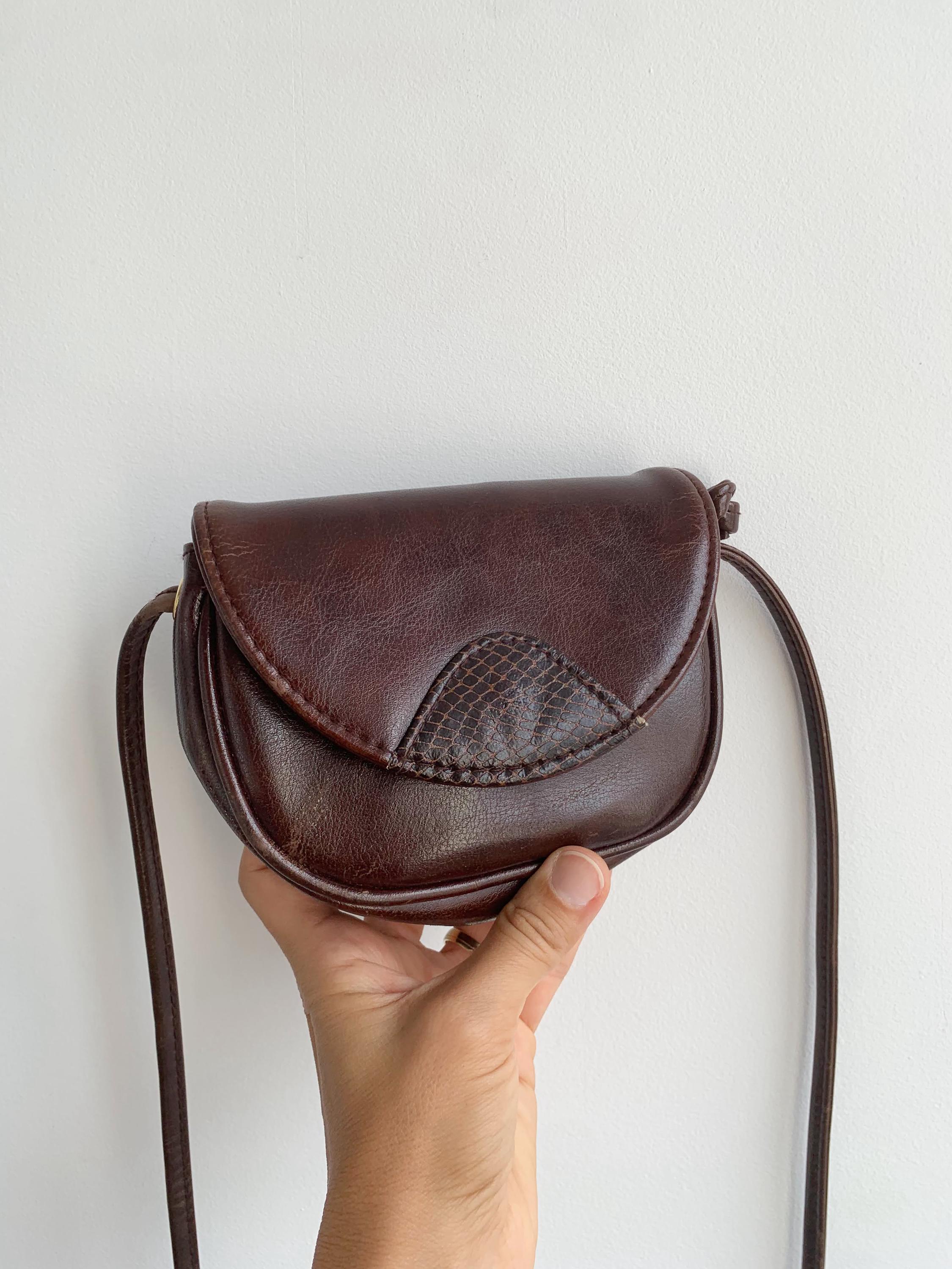 This charming vintage small crossbody bag is the perfect accessory for anyone who appreciates timeless style. Crafted from brown vegan leather, this small crossbody purse features a beautiful half-moon shape. The elegant dark brown color with a hint of rich burgundy is complemented by a striking faux snakeskin-textured detail on the front flap, adding a unique, bohemian touch. The long, thin strap allows for comfortable wear as a crossbody or on the shoulder. Despite its compact size, the bag is practical, with a main compartment and an interior zippered pocket to keep your essentials organized. The strap can be adjusted when you tie the knots inside. Or you can completely remove the strap and use this small purse as a belt bag. This versatile piece is perfect for daily errands, a night out, or to complete a chic minimalist or retro-inspired look.