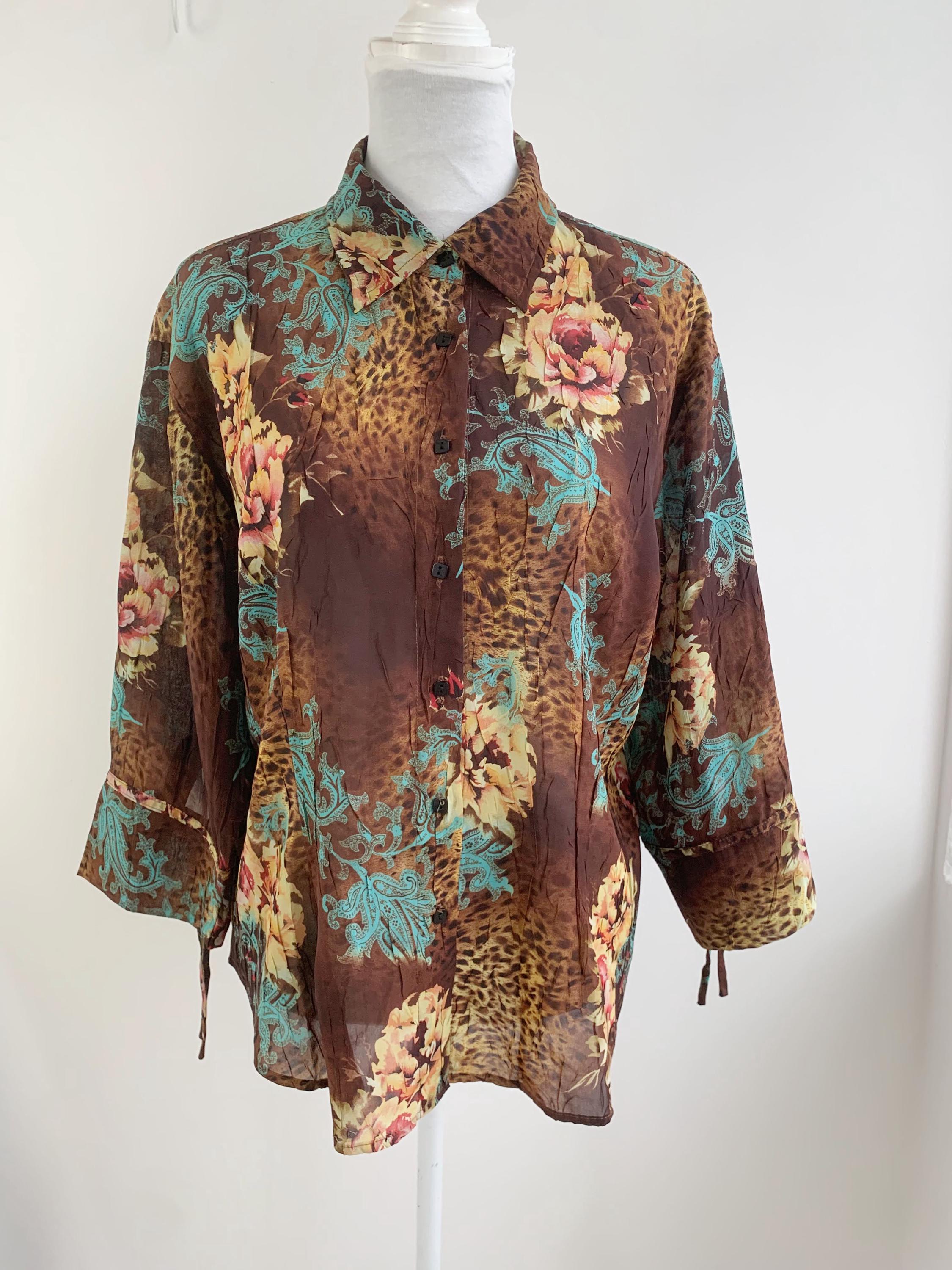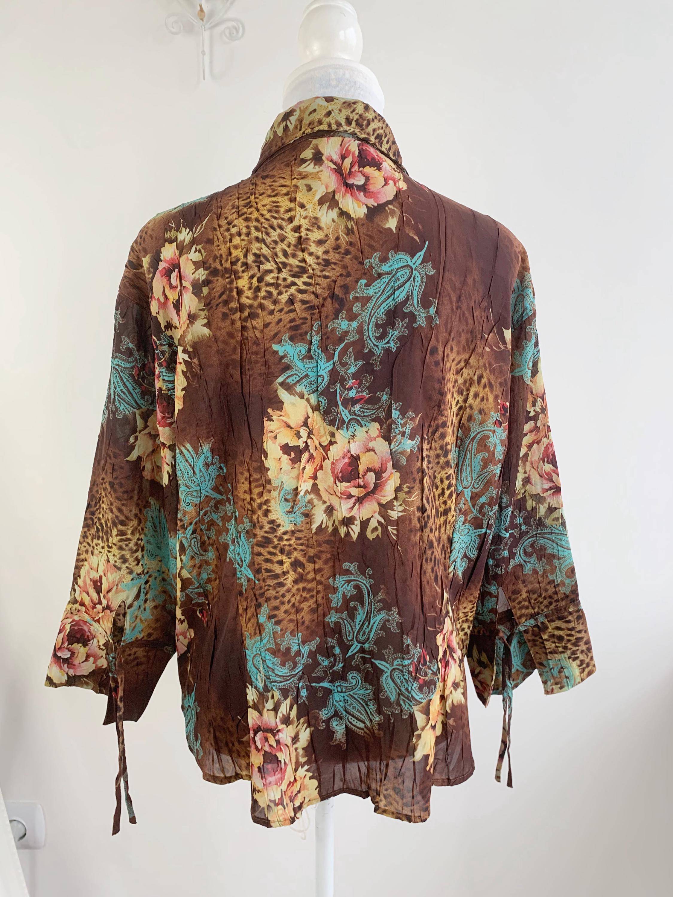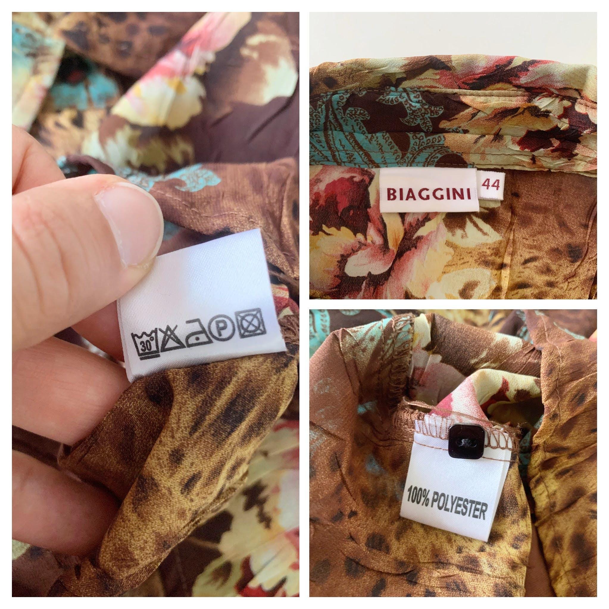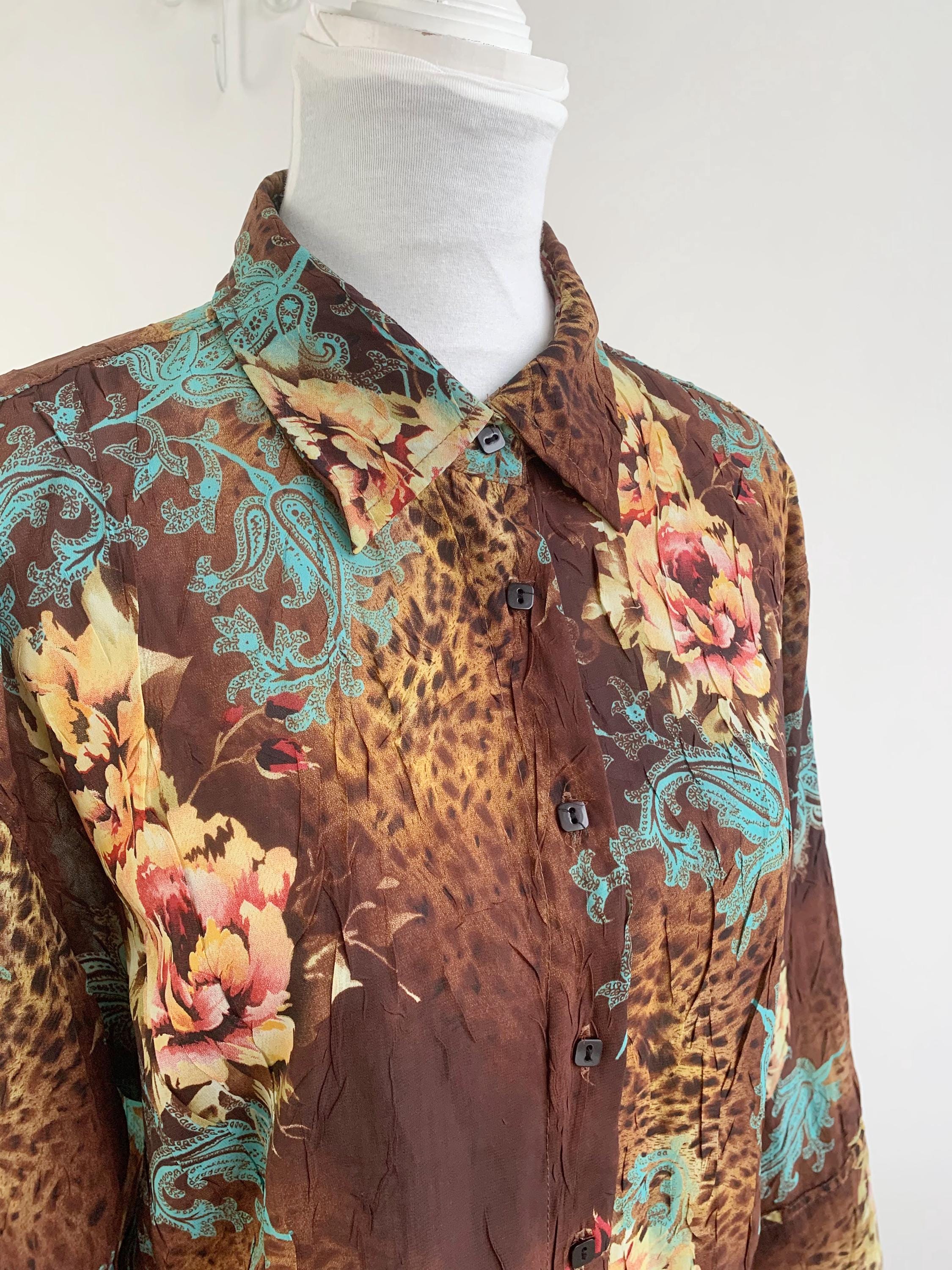 Step into the vibrant style of the 1990s with this striking vintage blouse by Biaggini. This unique button-up shirt features a captivating and eclectic print that merges abstract florals and paisley pattern with subtle animal print motifs in a beautiful, multicolored design. The flowing, lightweight fabric and relaxed fit make it a comfortable yet stylish choice for any season. The added ties at the 3/4 sleeve cuffs add an eye catching detail. The classic button-down style, combined with the fun, bold pattern, makes this a versatile piece that can be dressed up for a special occasion or worn casually to add a pop of color and personality to your everyday outfit. This one-of-a-kind top is a perfect addition for anyone looking to express their unique style and embrace the timeless charm of vintage fashion.