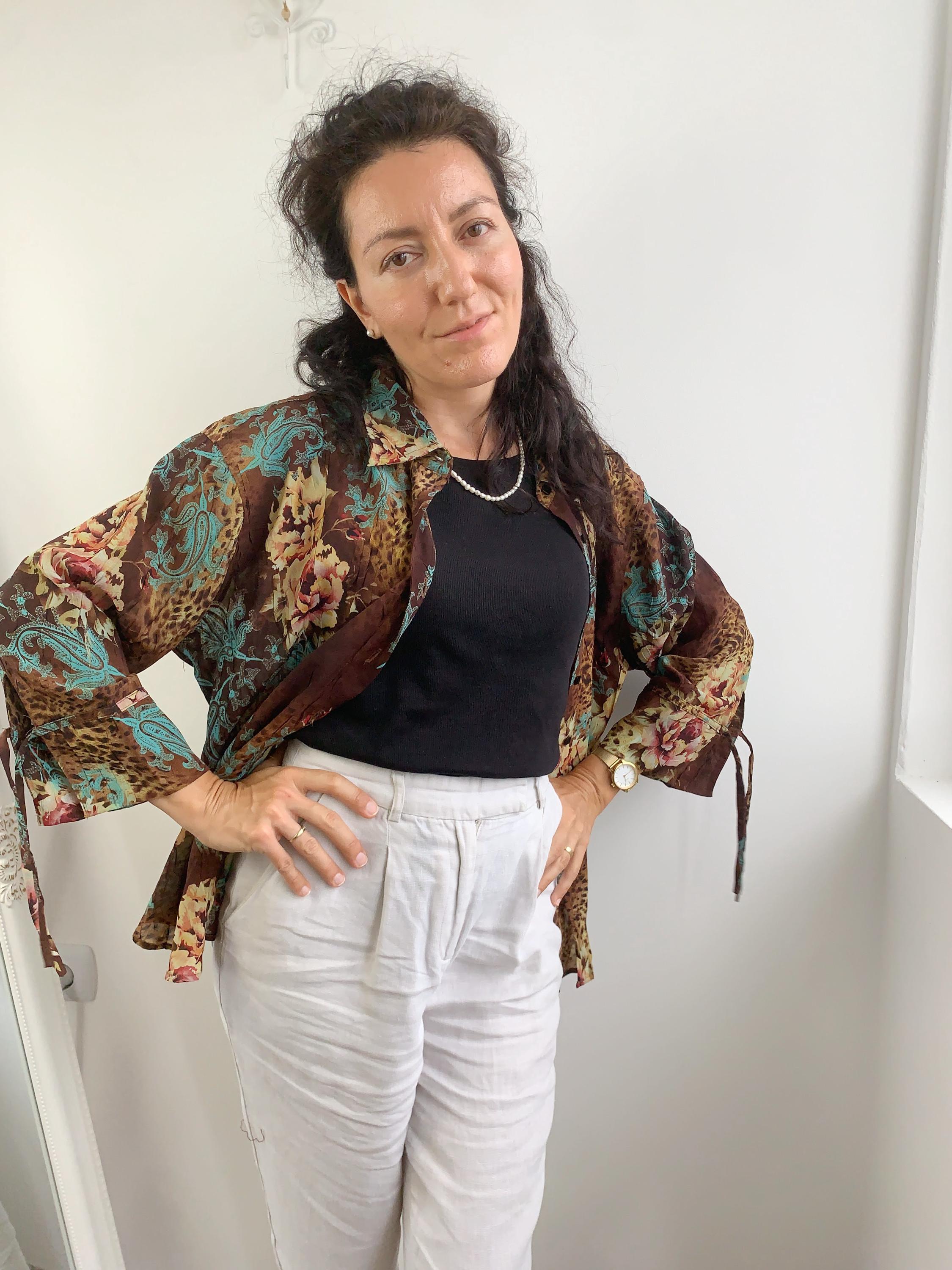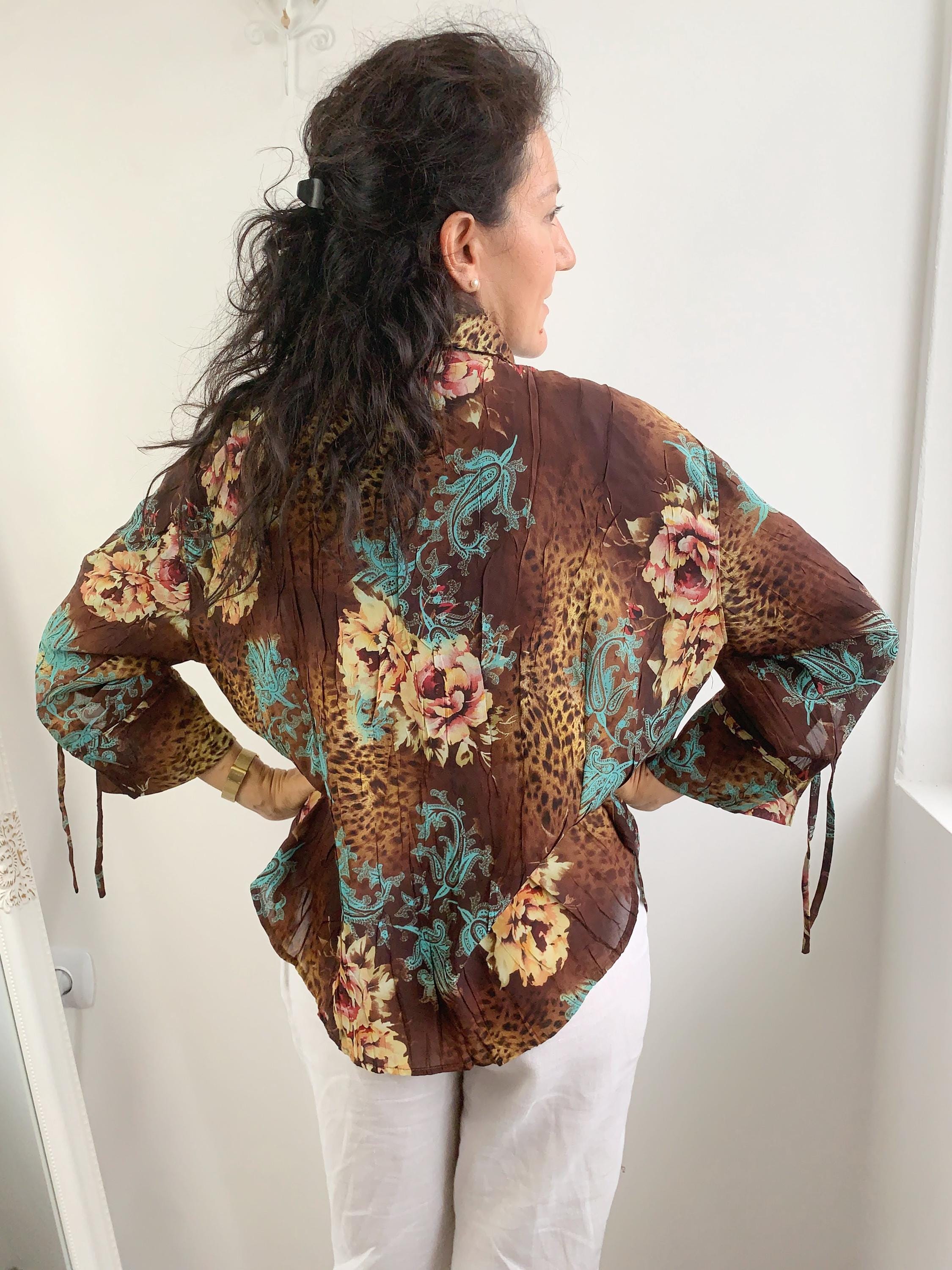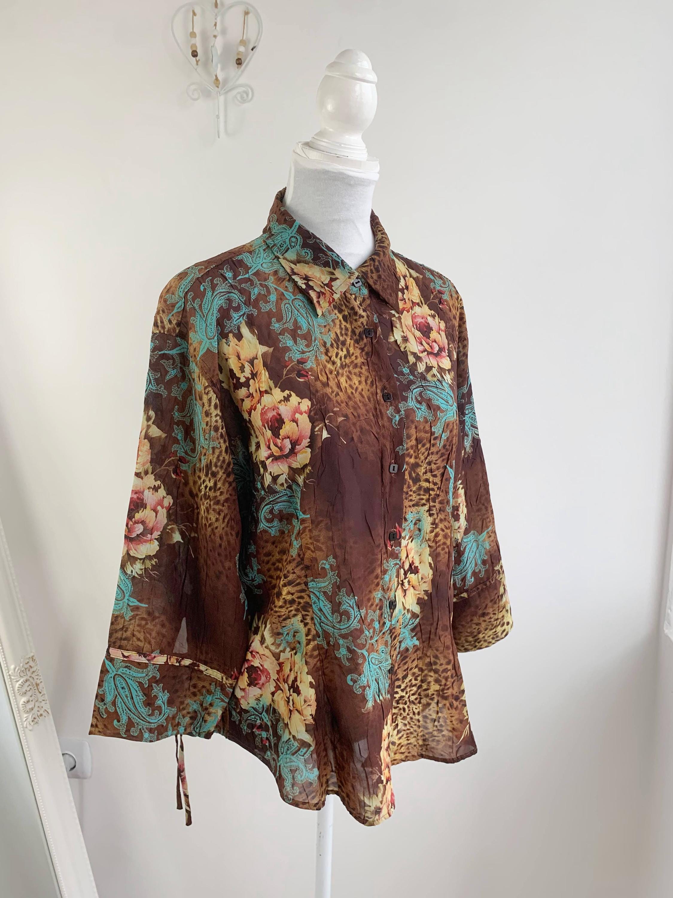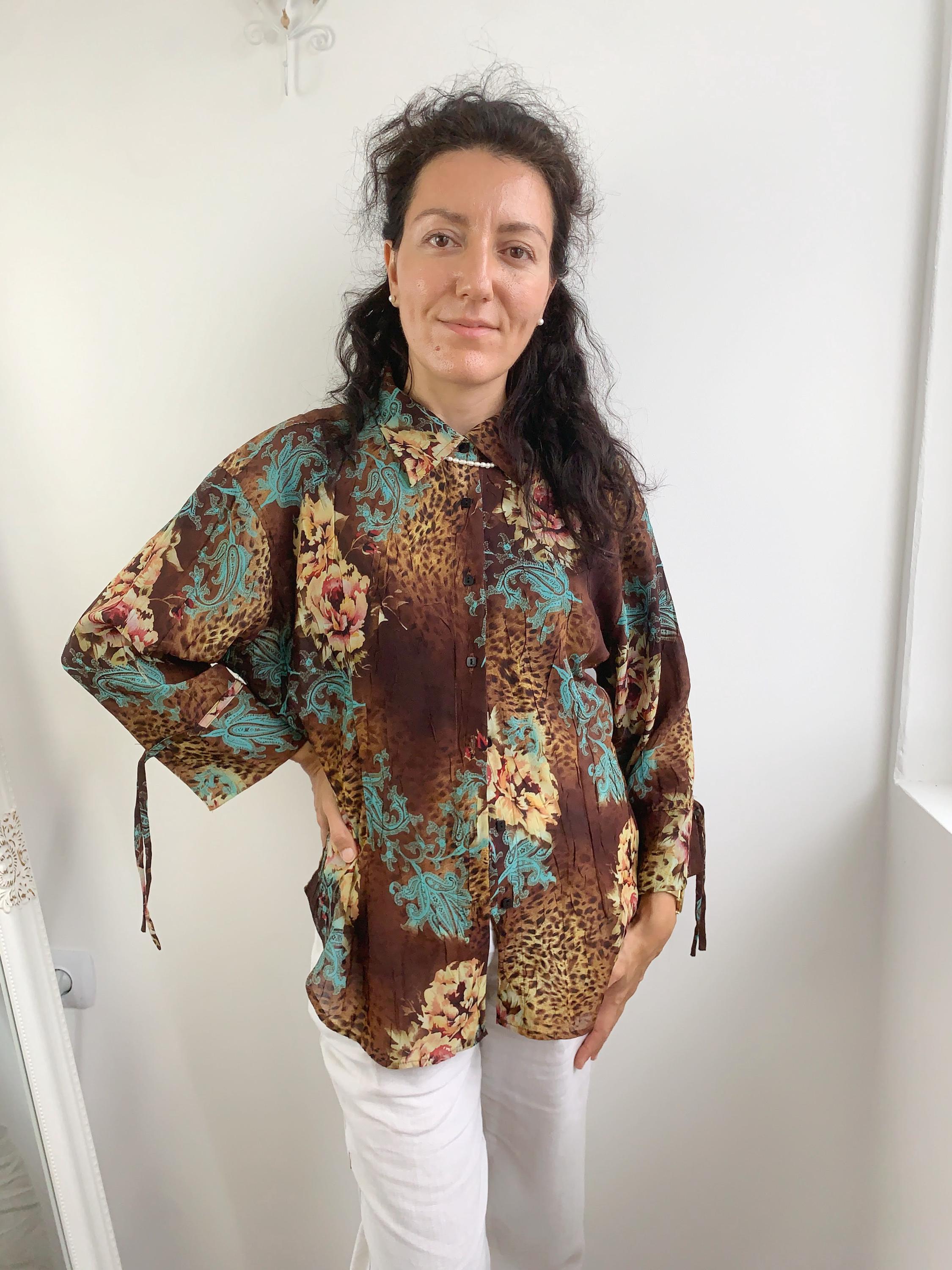 Step into the vibrant style of the 1990s with this striking vintage blouse by Biaggini. This unique button-up shirt features a captivating and eclectic print that merges abstract florals and paisley pattern with subtle animal print motifs in a beautiful, multicolored design. The flowing, lightweight fabric and relaxed fit make it a comfortable yet stylish choice for any season. The added ties at the 3/4 sleeve cuffs add an eye catching detail. The classic button-down style, combined with the fun, bold pattern, makes this a versatile piece that can be dressed up for a special occasion or worn casually to add a pop of color and personality to your everyday outfit. This one-of-a-kind top is a perfect addition for anyone looking to express their unique style and embrace the timeless charm of vintage fashion.