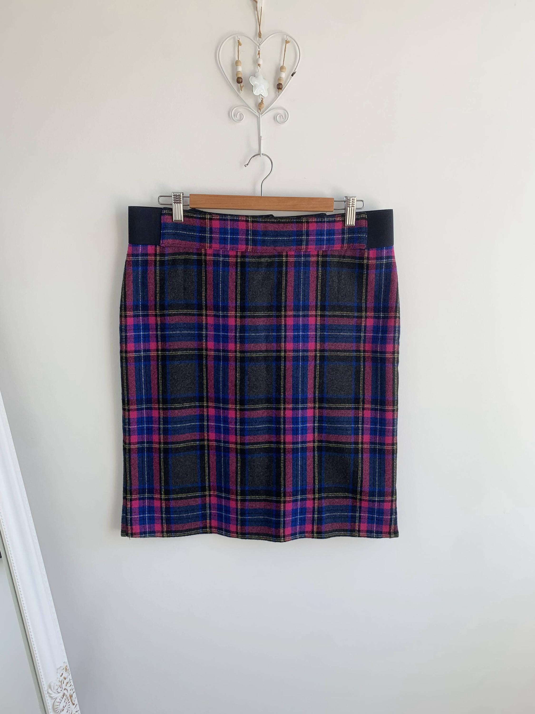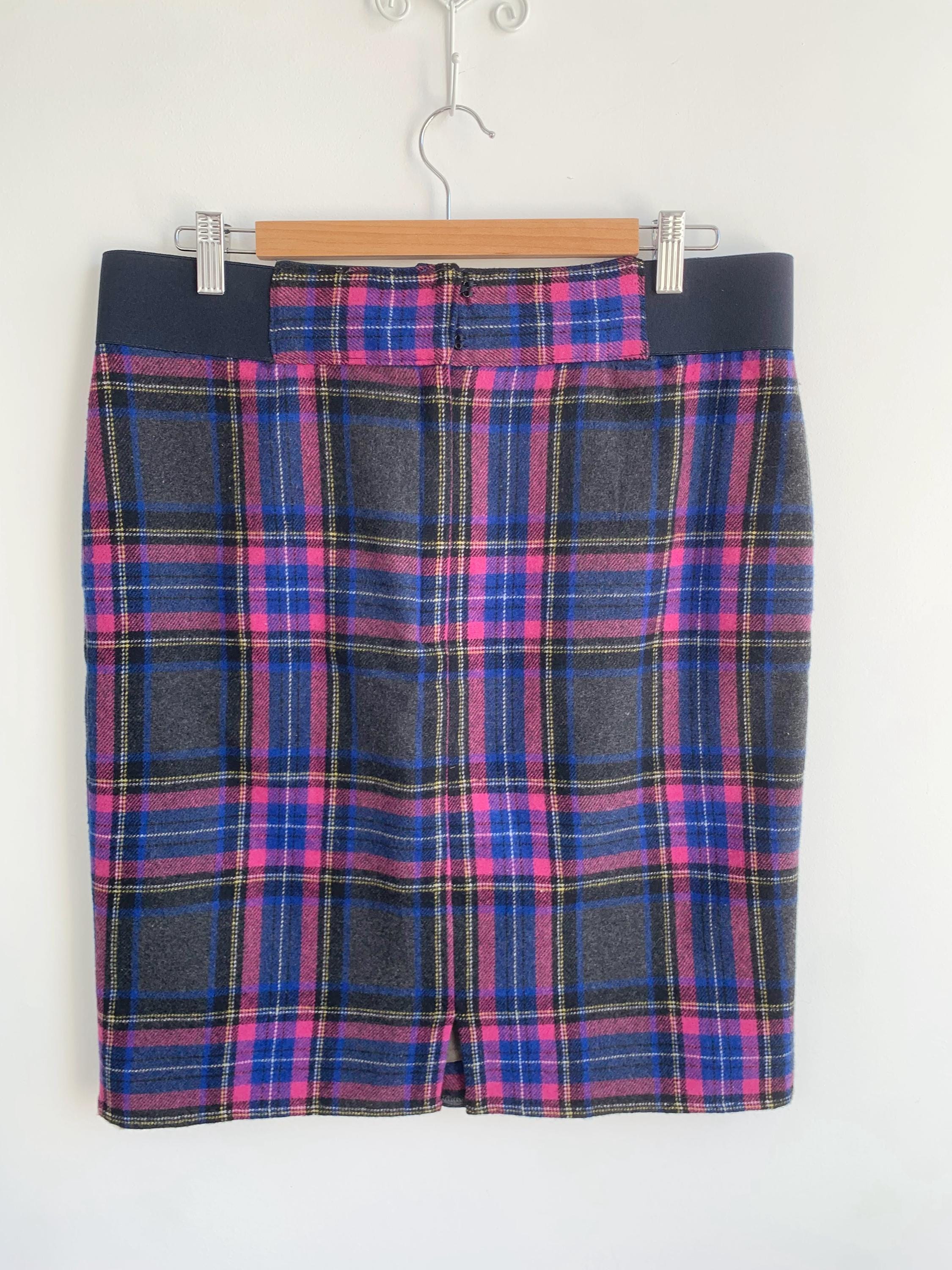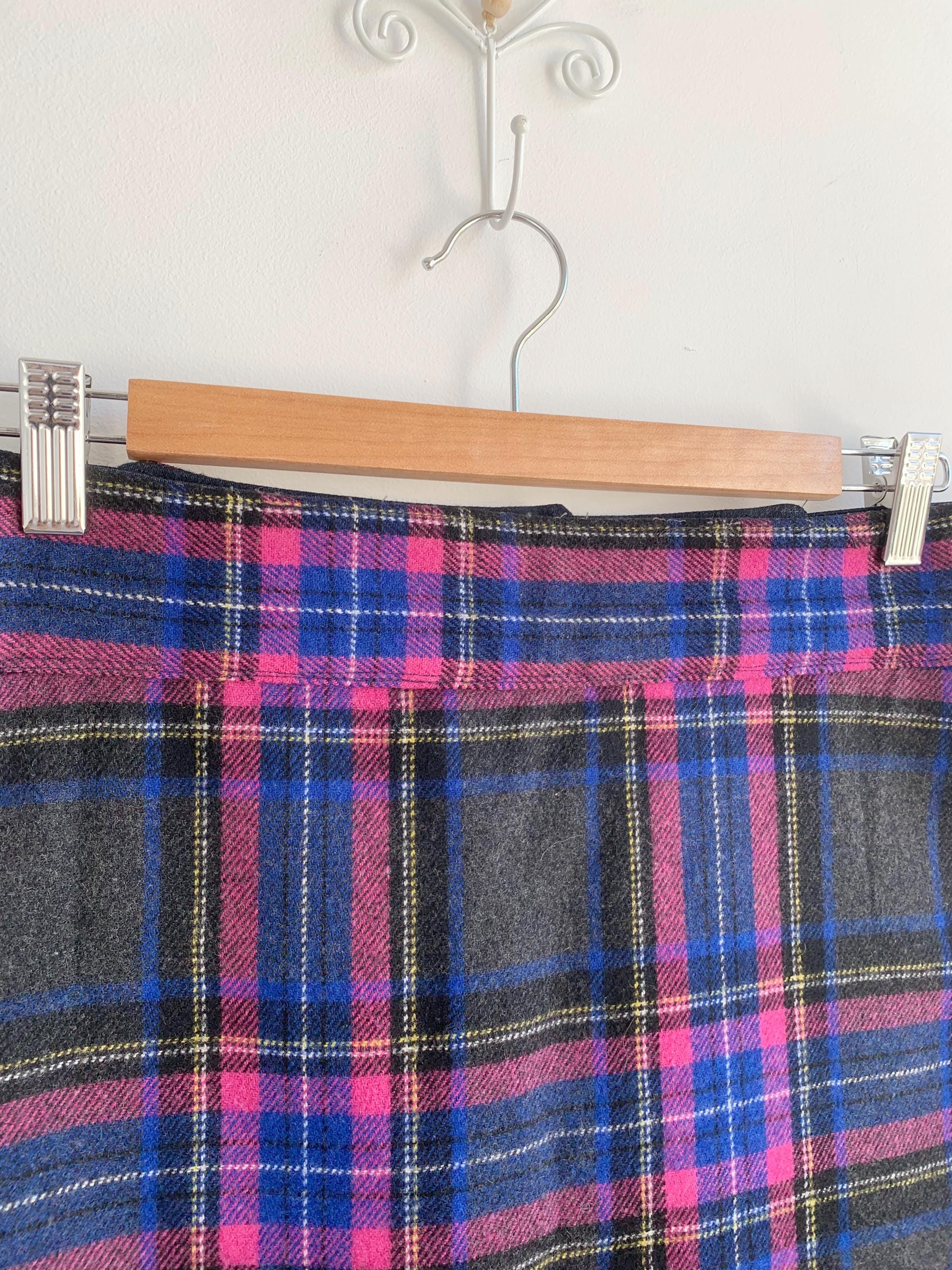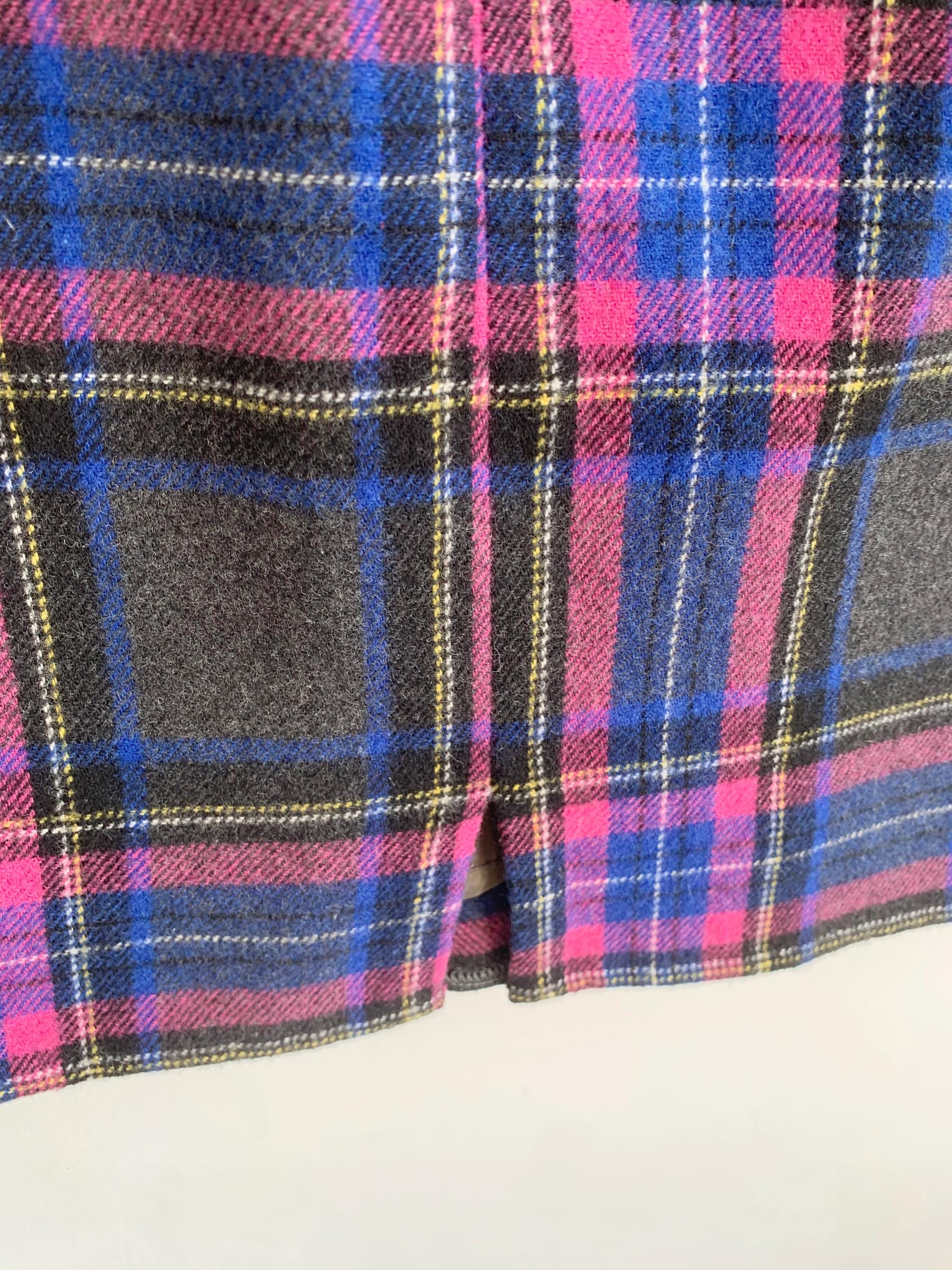 Discover a timeless piece of retro fashion with this classic vintage pencil skirt in size L. Featuring a striking tartan plaid pattern in shades of hot pink, cobalt blue, grey and black with delicate white and yellow horizontal and vertical stripes. The tailored pencil silhouette and durable wool-blend material give it a sophisticated and flattering fit, perfect for office wear or a chic, everyday look. The back zipper and double hook and eye closure provide a smooth, clean line, and the knee-length cut offers both elegance and comfort. This short plaid skirt embodies the effortless cool of 80s and 90s style, making it an ideal choice for fans of dark academia, grunge, or preppy aesthetics. Pair it with a simple black turtleneck or a vintage band tee to create a look that is uniquely you.