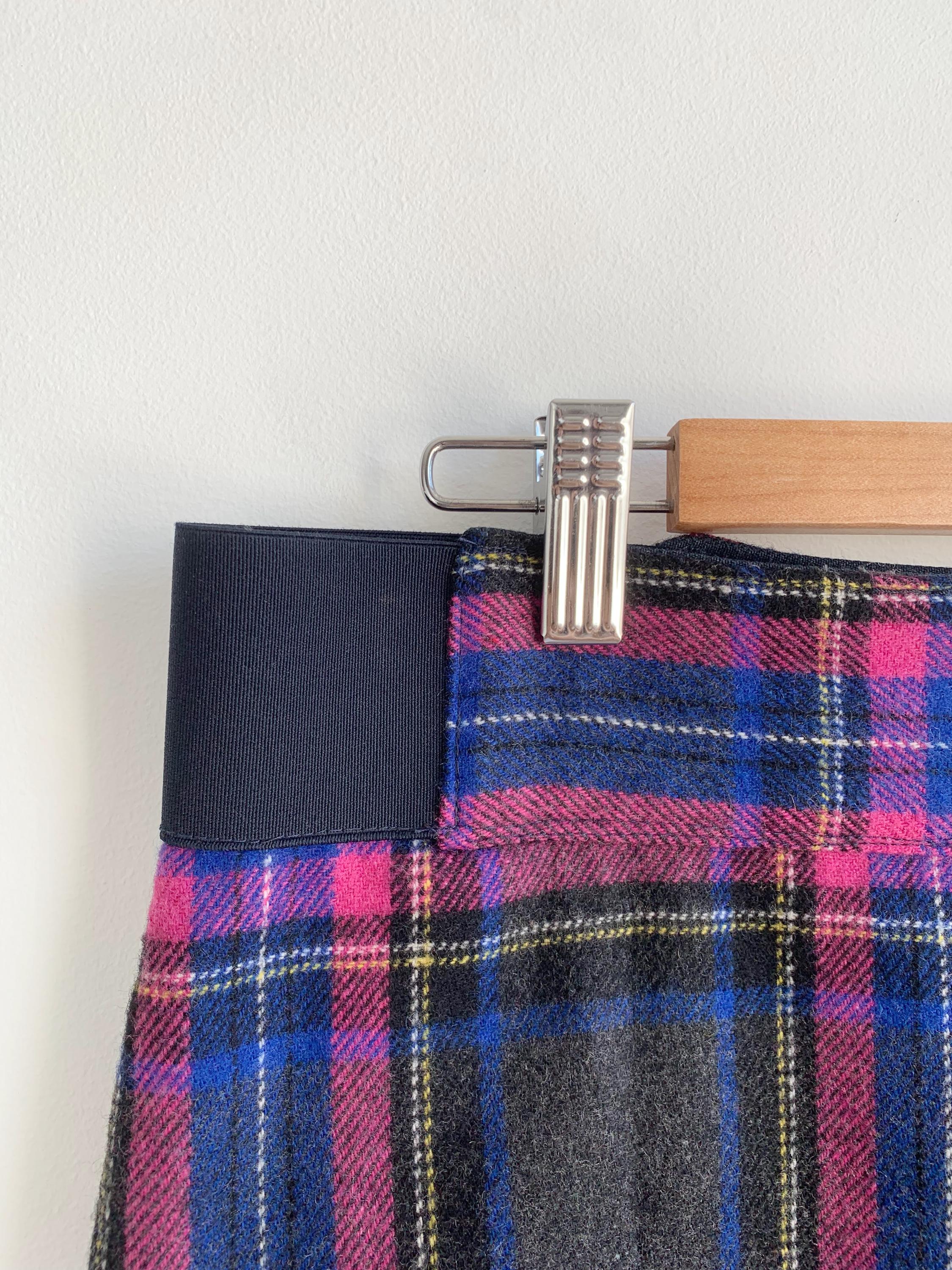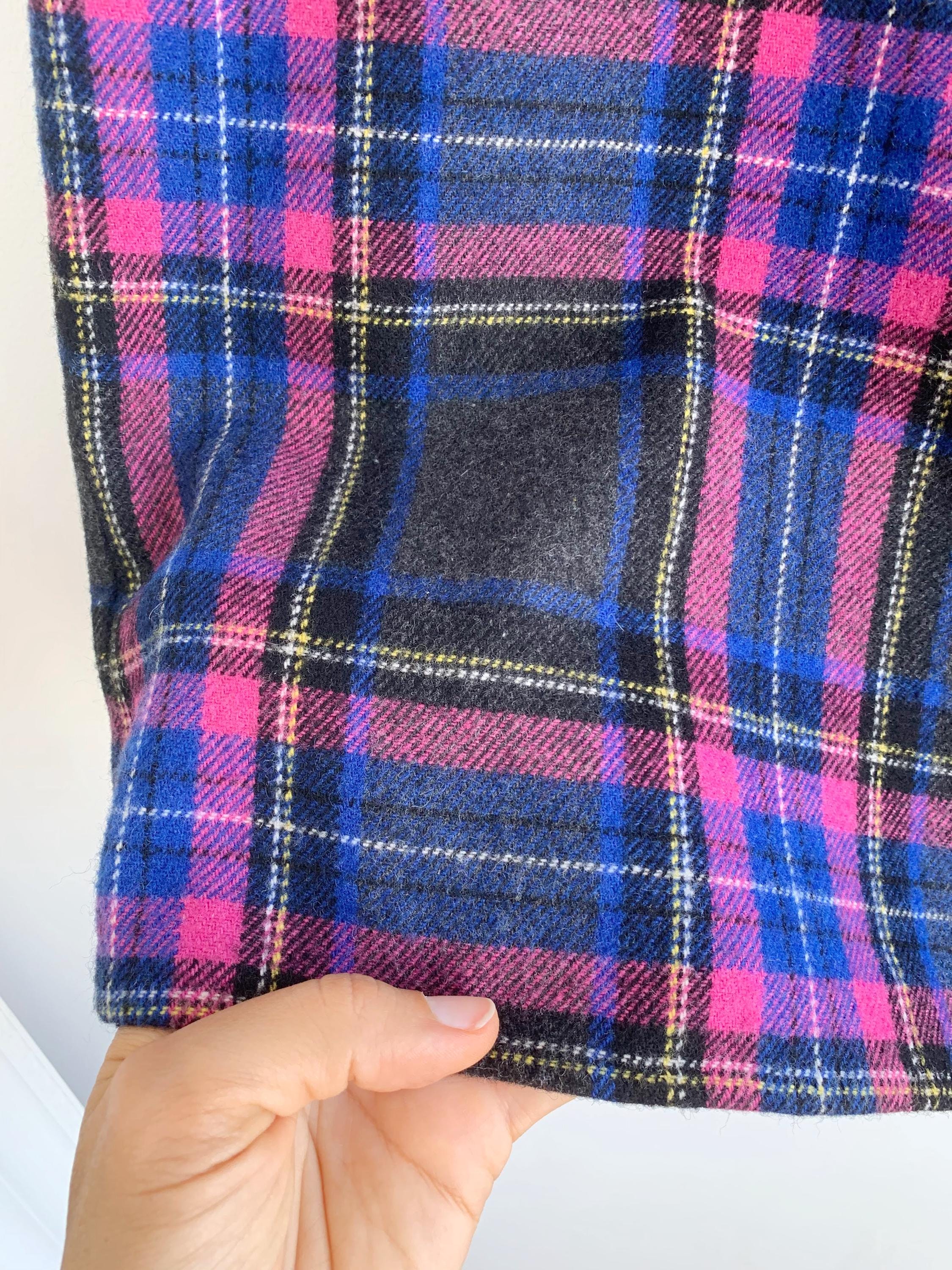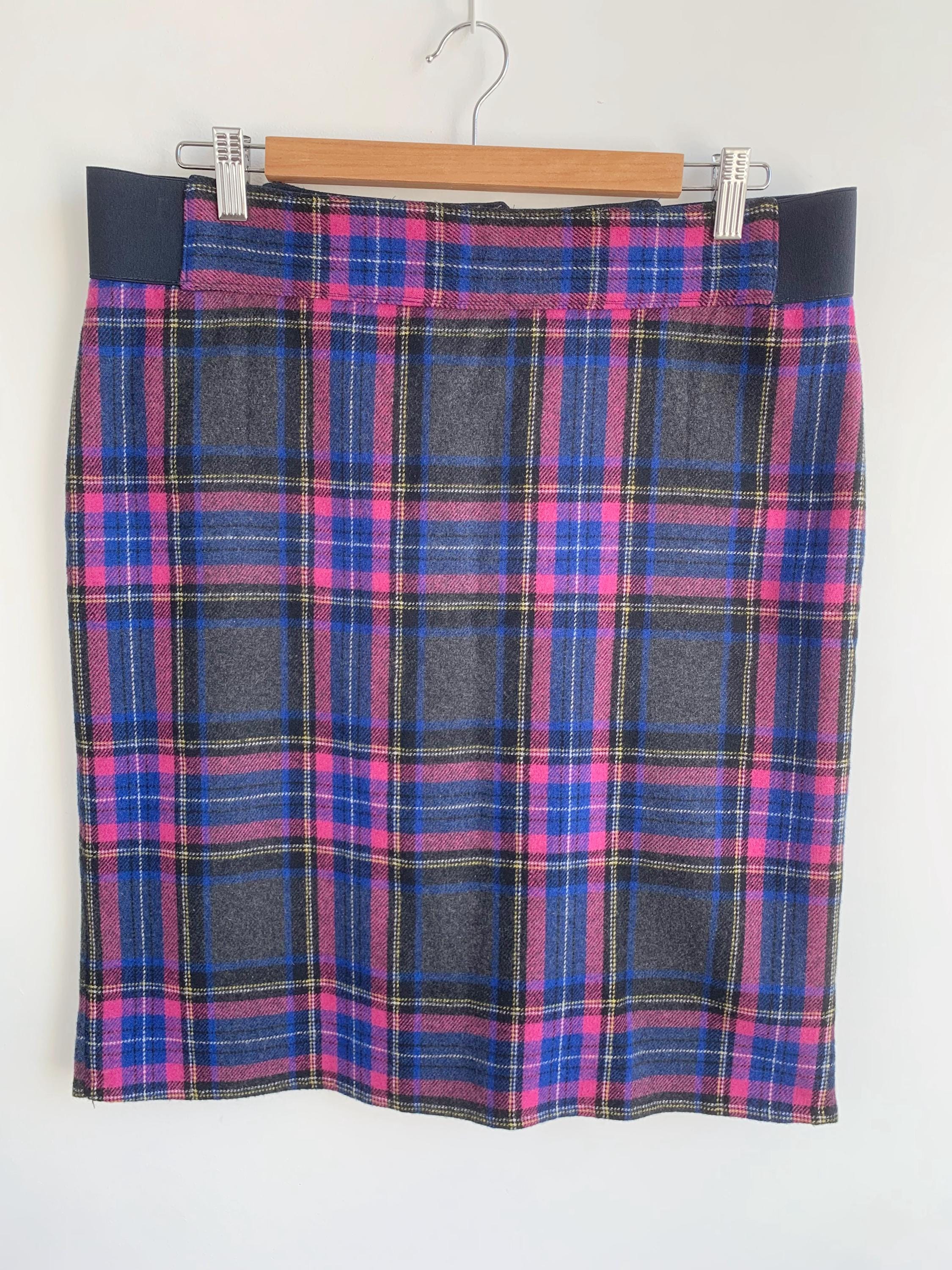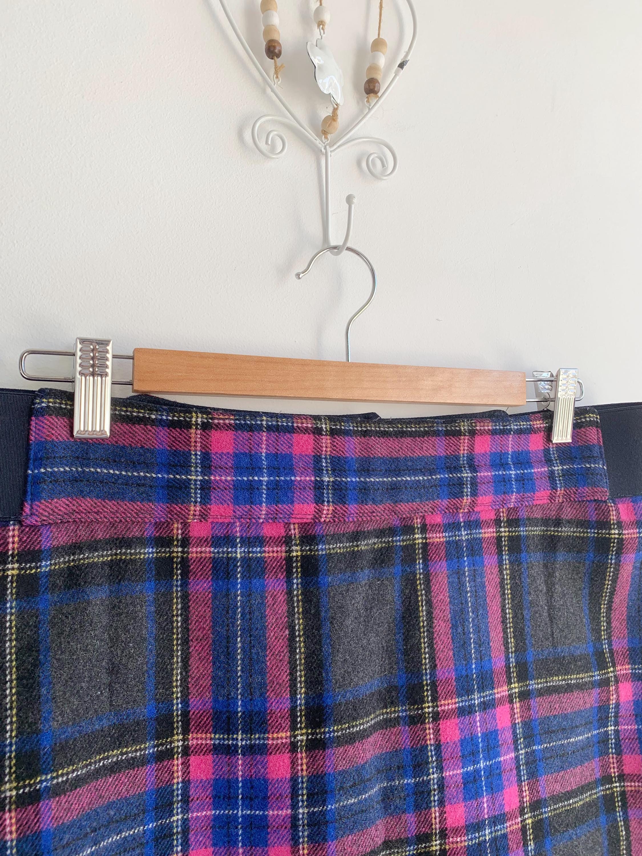 Discover a timeless piece of retro fashion with this classic vintage pencil skirt in size L. Featuring a striking tartan plaid pattern in shades of hot pink, cobalt blue, grey and black with delicate white and yellow horizontal and vertical stripes. The tailored pencil silhouette and durable wool-blend material give it a sophisticated and flattering fit, perfect for office wear or a chic, everyday look. The back zipper and double hook and eye closure provide a smooth, clean line, and the knee-length cut offers both elegance and comfort. This short plaid skirt embodies the effortless cool of 80s and 90s style, making it an ideal choice for fans of dark academia, grunge, or preppy aesthetics. Pair it with a simple black turtleneck or a vintage band tee to create a look that is uniquely you.