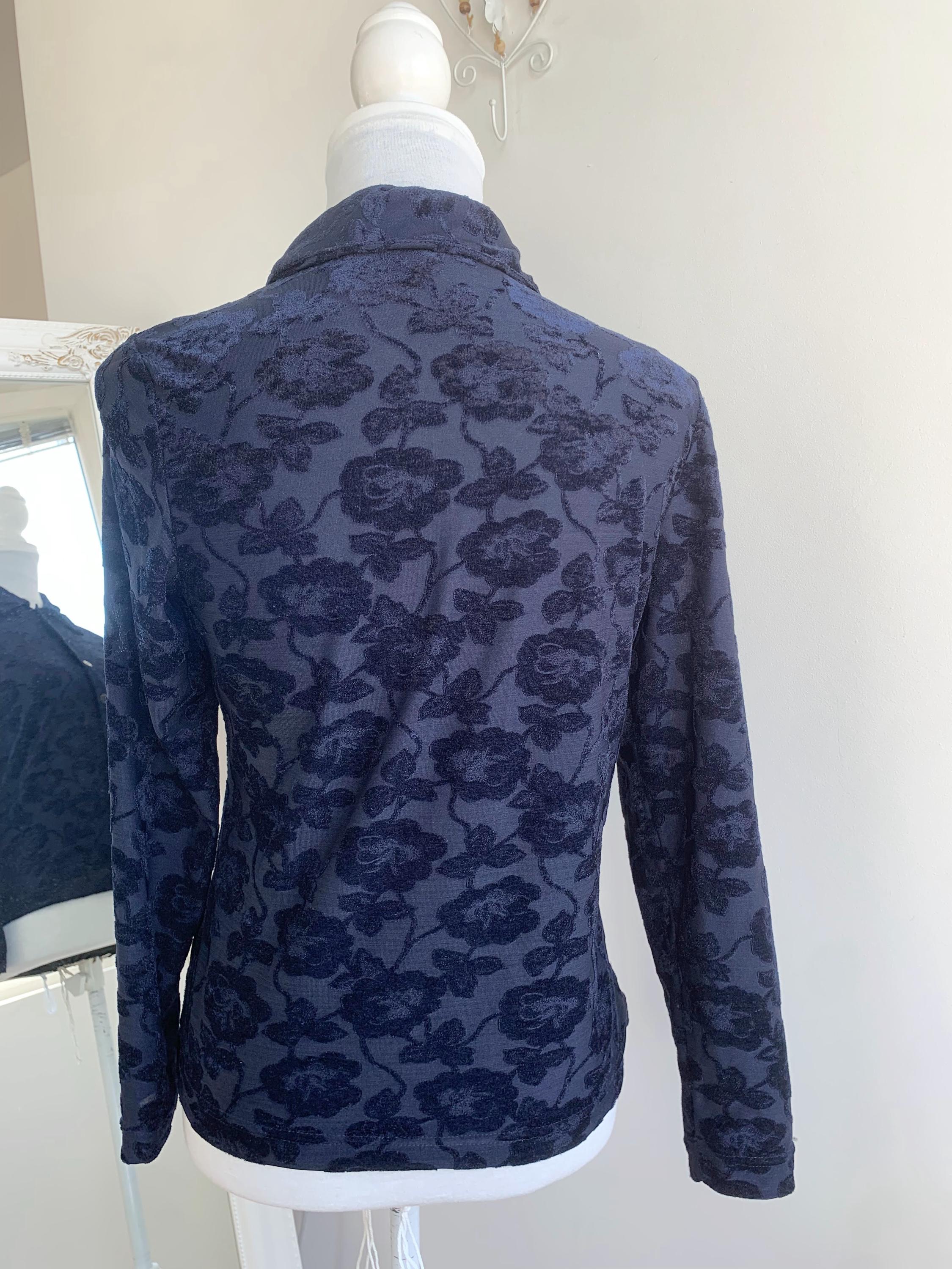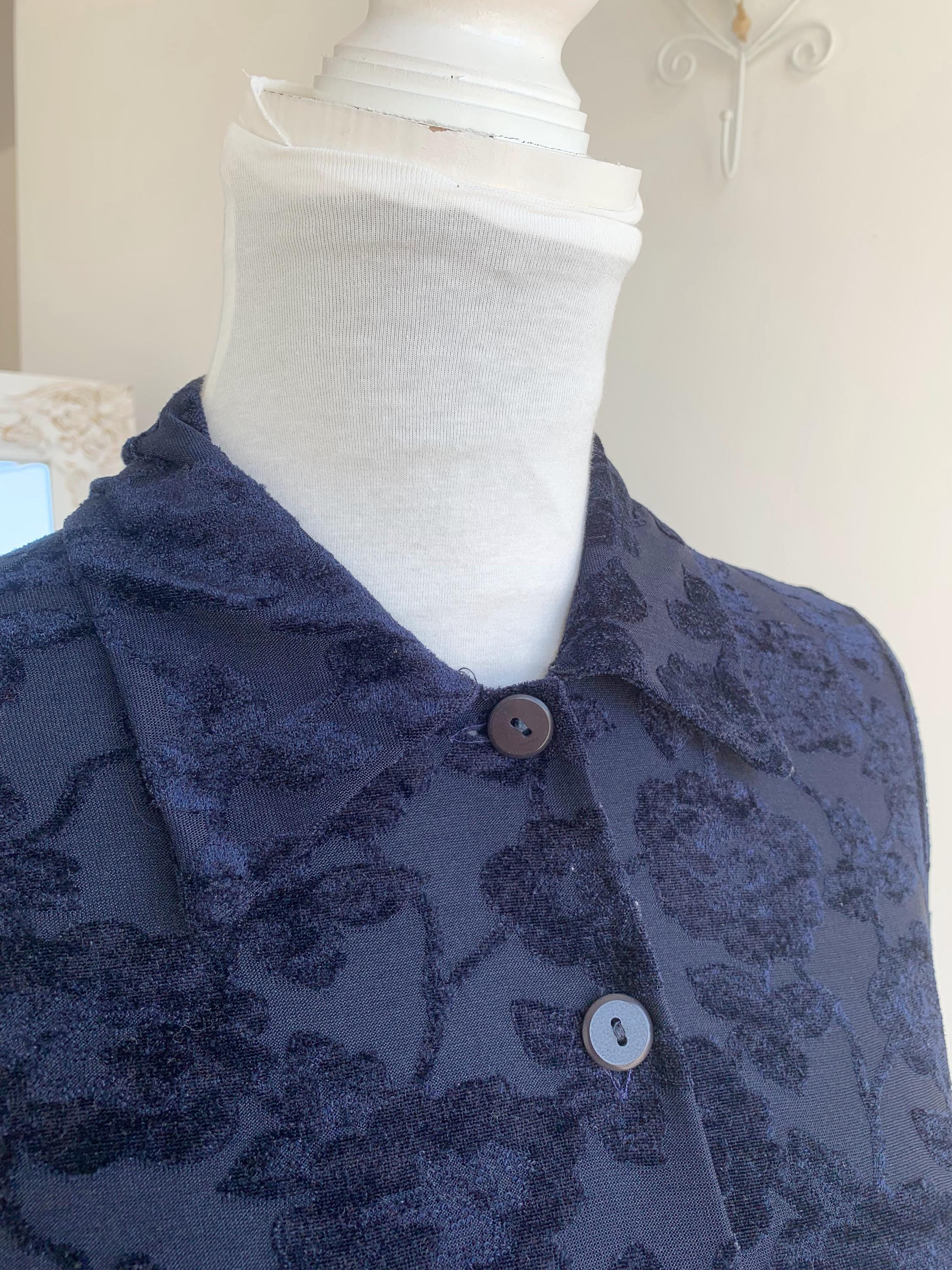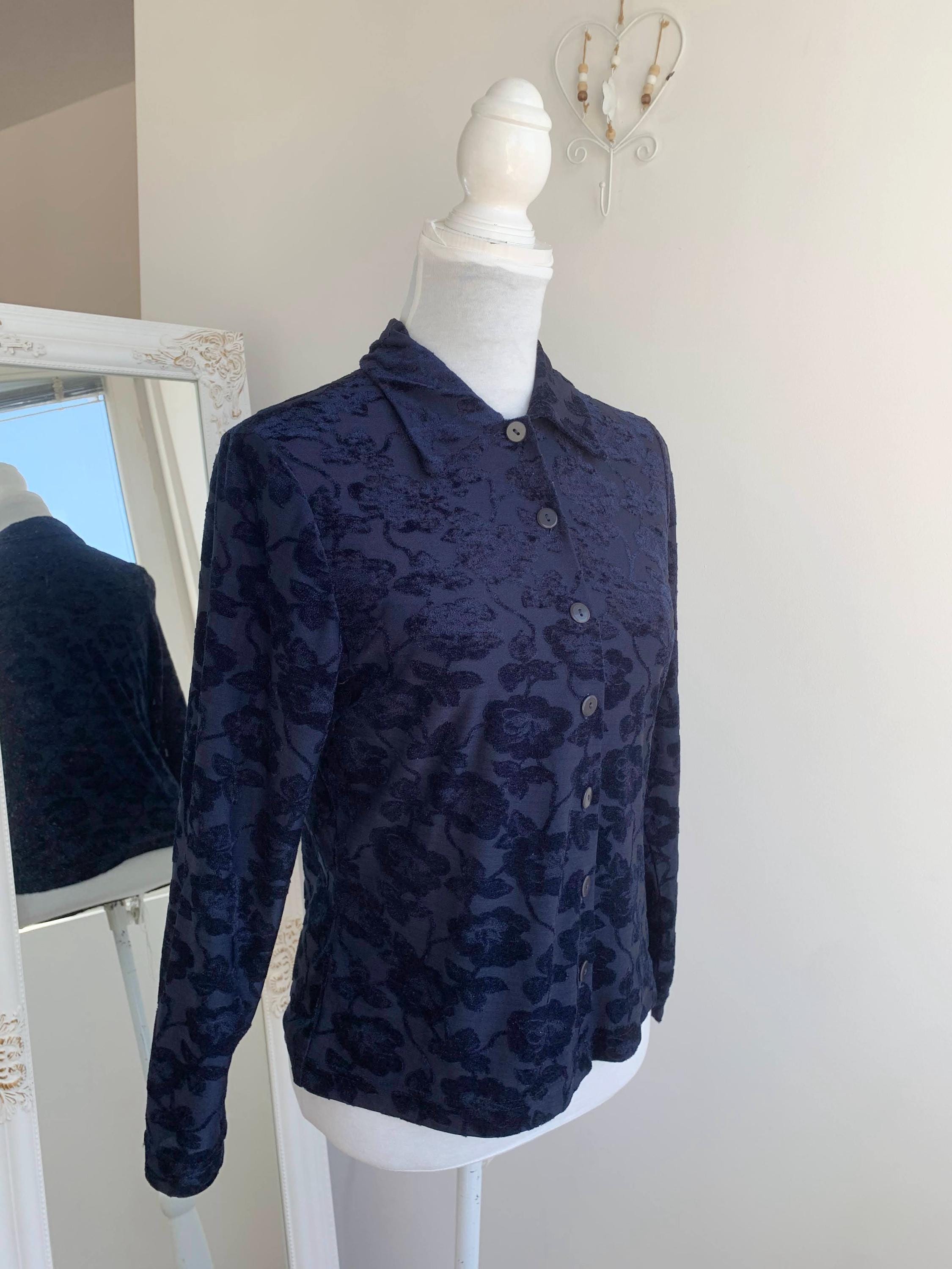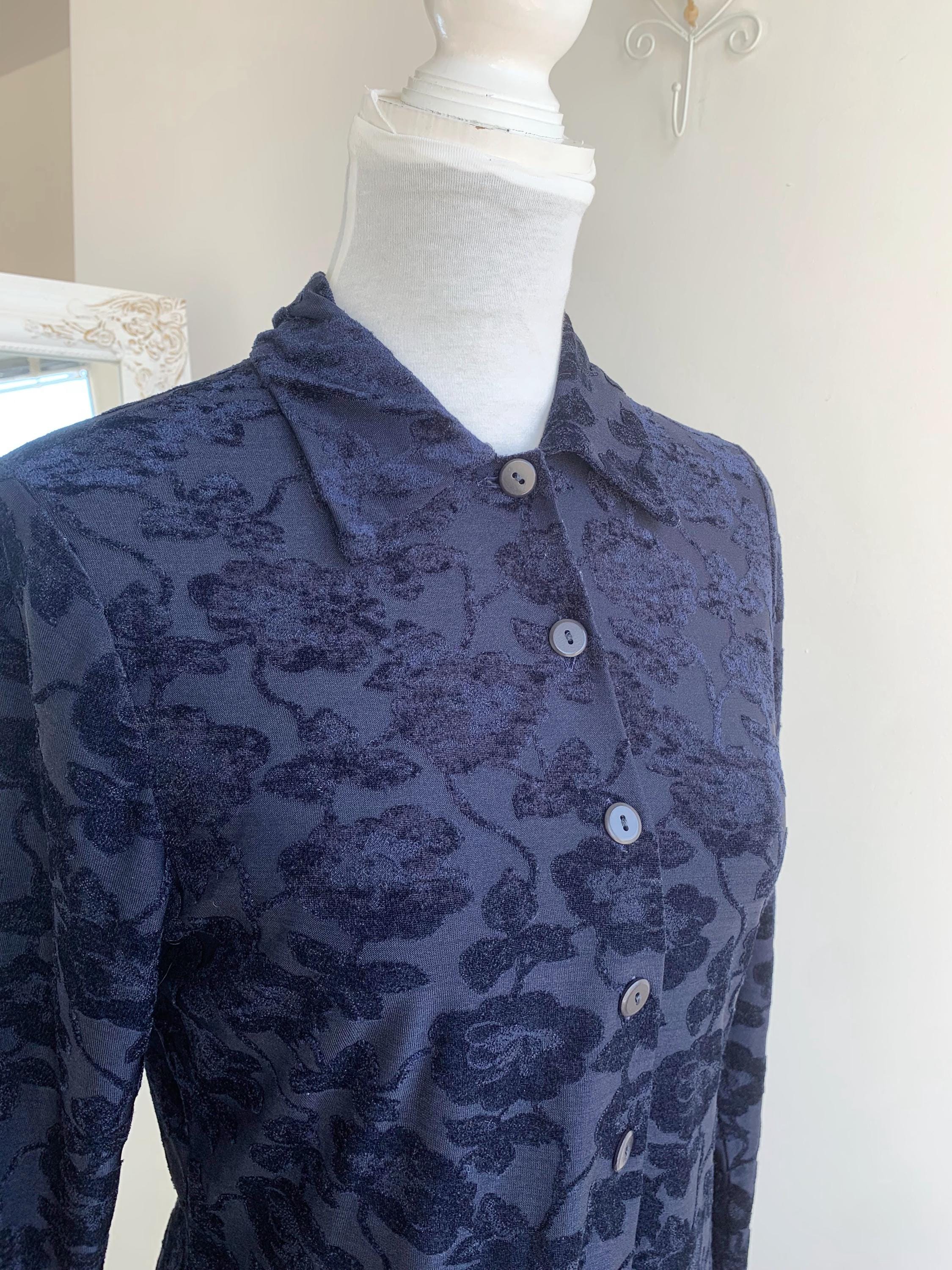 Step back into the effortlessly chic style of the 1990s with this exquisite vintage brocade blouse in dark blue color in size S/M. This button up top is a truly unique find, crafted from a rich jacquard fabric that features a beautiful, raised floral pattern. The structured yet soft feel of the material, combined with the striking navy blue hue, makes this piece a sophisticated statement for any wardrobe. Whether you're a vintage fashion enthusiast or simply looking to add a touch of nostalgia to your everyday look, this blouse is perfect for pairing with classic trousers, a high-waisted skirt, or your favorite denim.