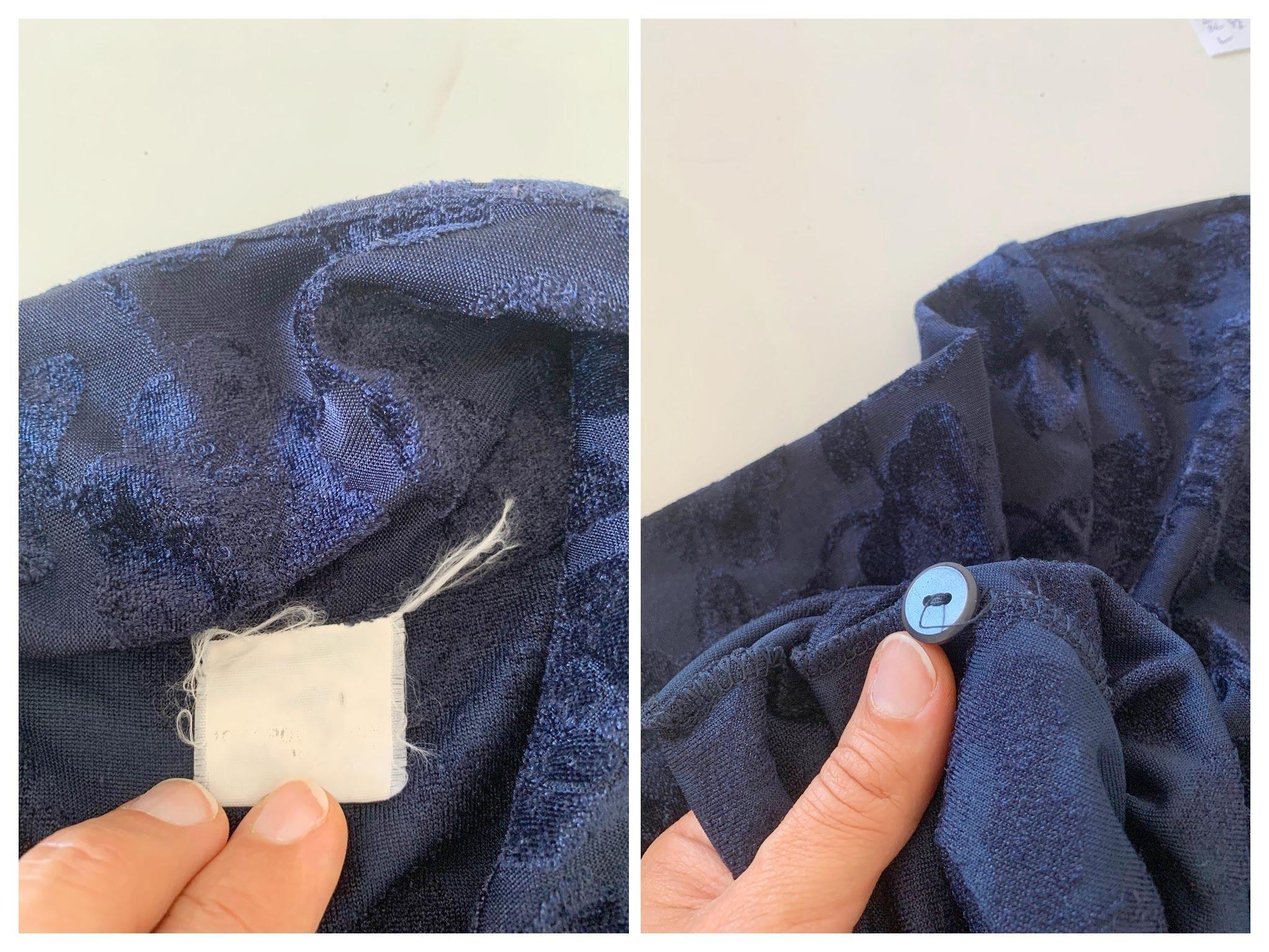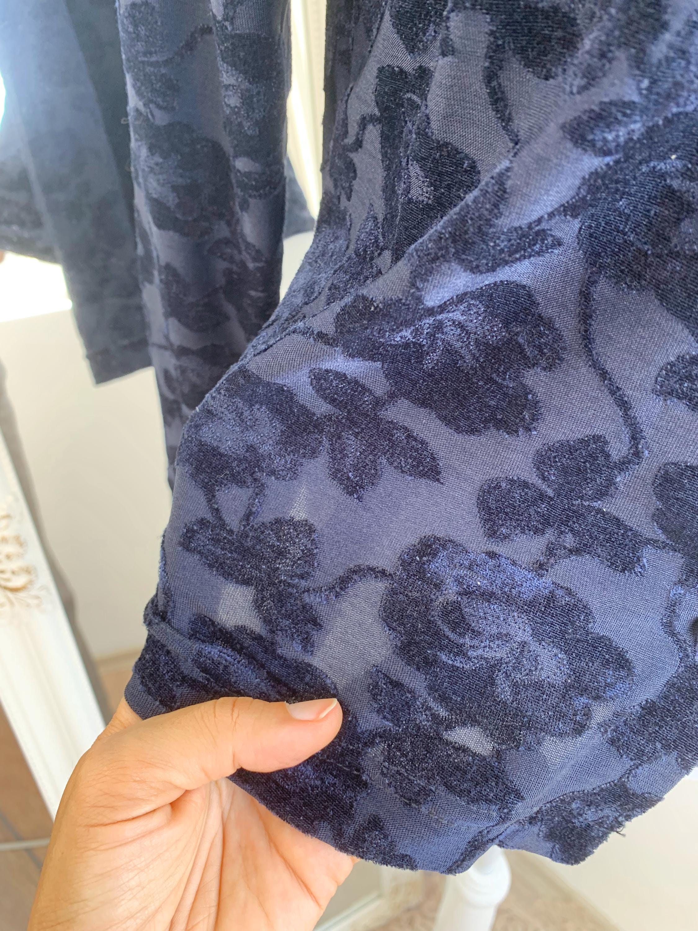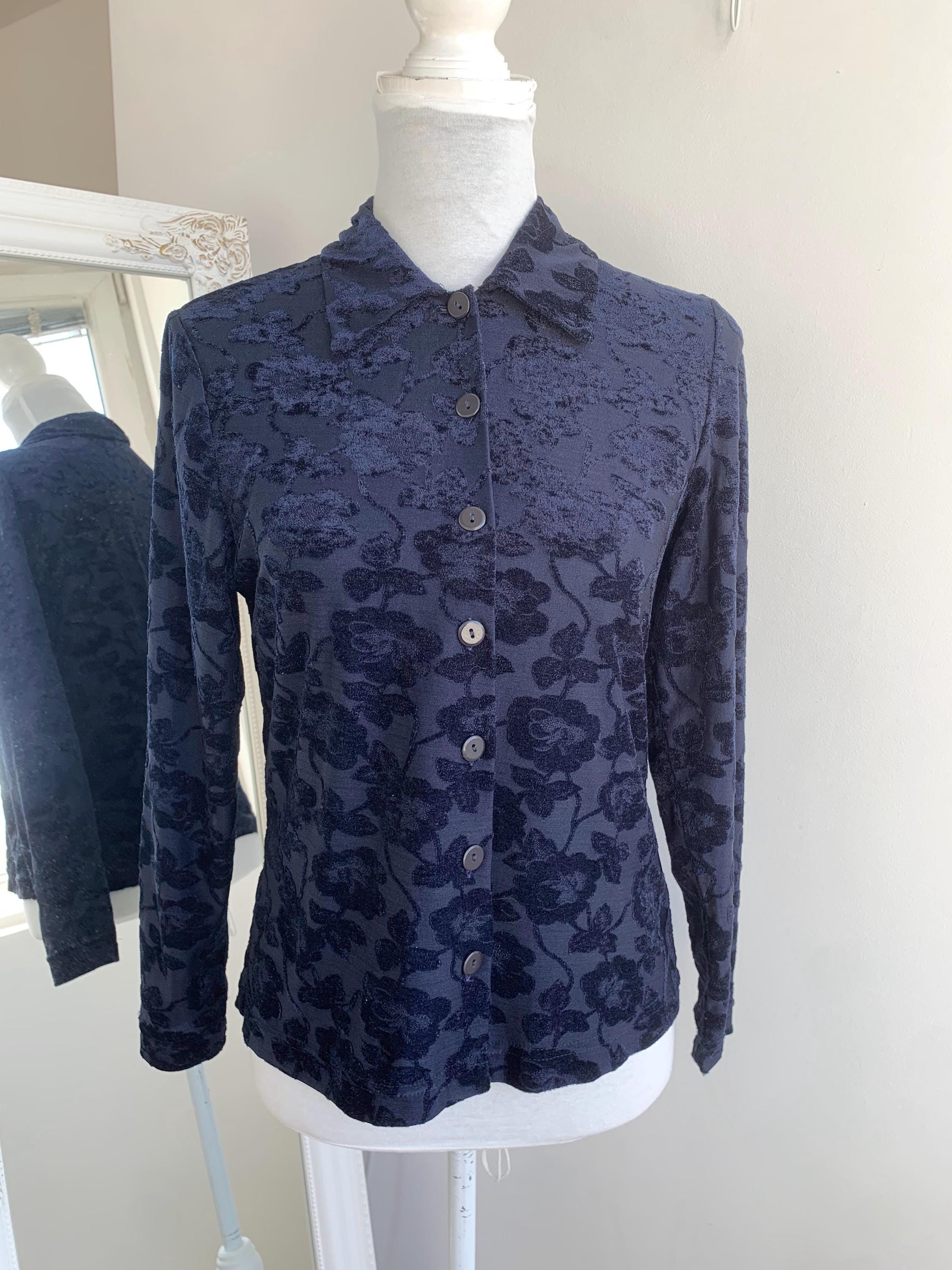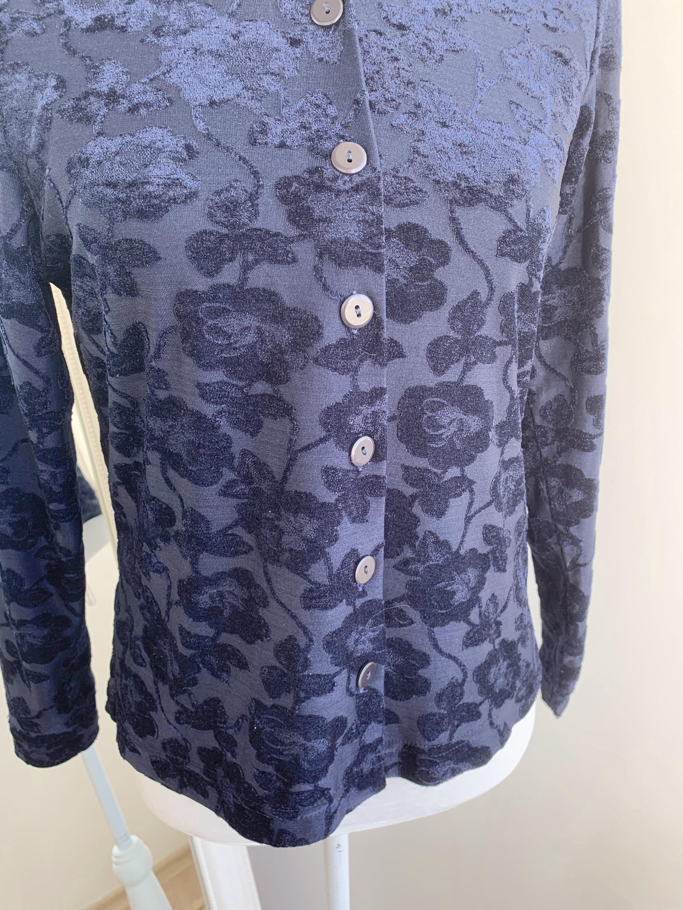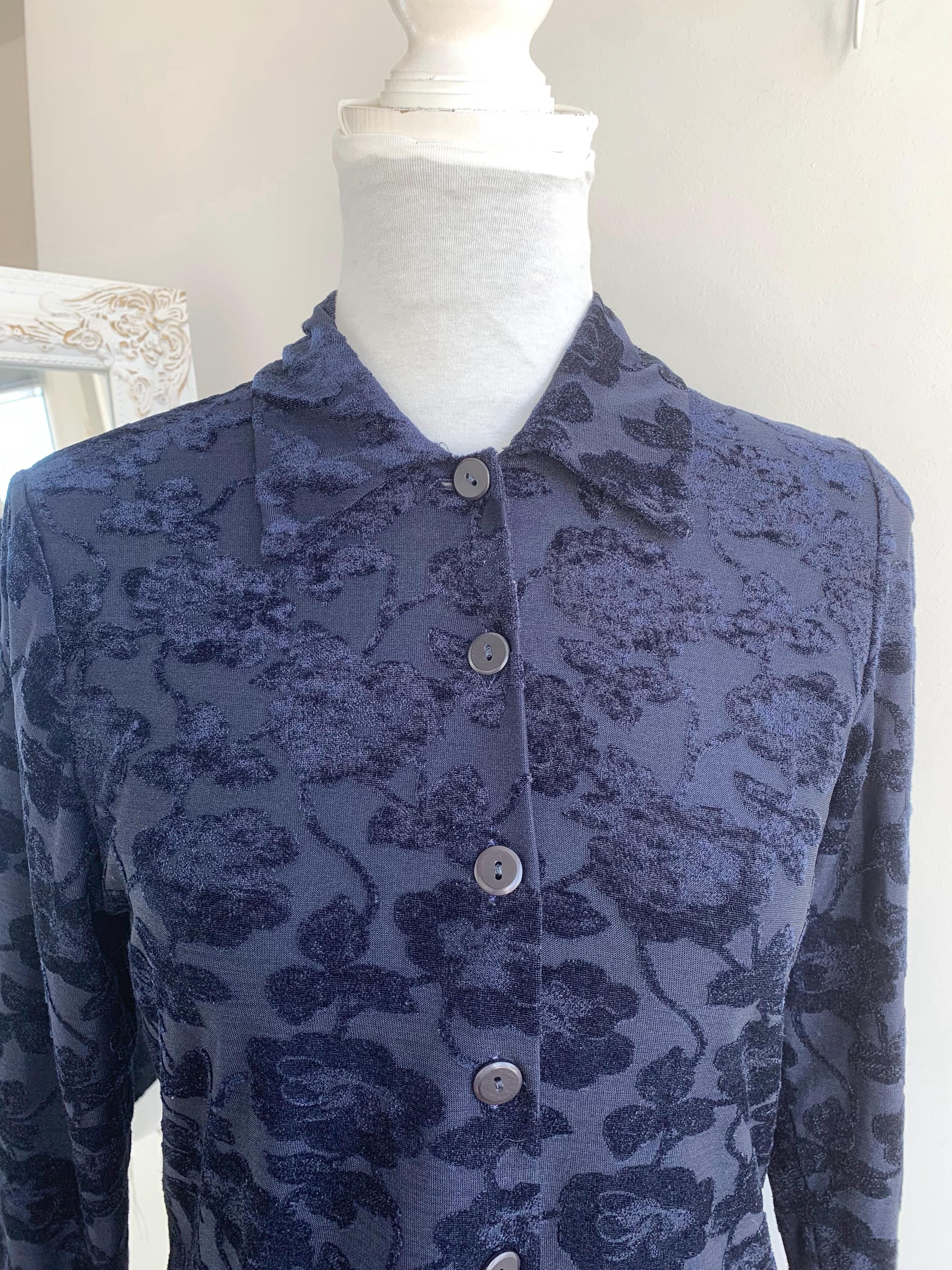 Step back into the effortlessly chic style of the 1990s with this exquisite vintage brocade blouse in dark blue color in size S/M. This button up top is a truly unique find, crafted from a rich jacquard fabric that features a beautiful, raised floral pattern. The structured yet soft feel of the material, combined with the striking navy blue hue, makes this piece a sophisticated statement for any wardrobe. Whether you're a vintage fashion enthusiast or simply looking to add a touch of nostalgia to your everyday look, this blouse is perfect for pairing with classic trousers, a high-waisted skirt, or your favorite denim.