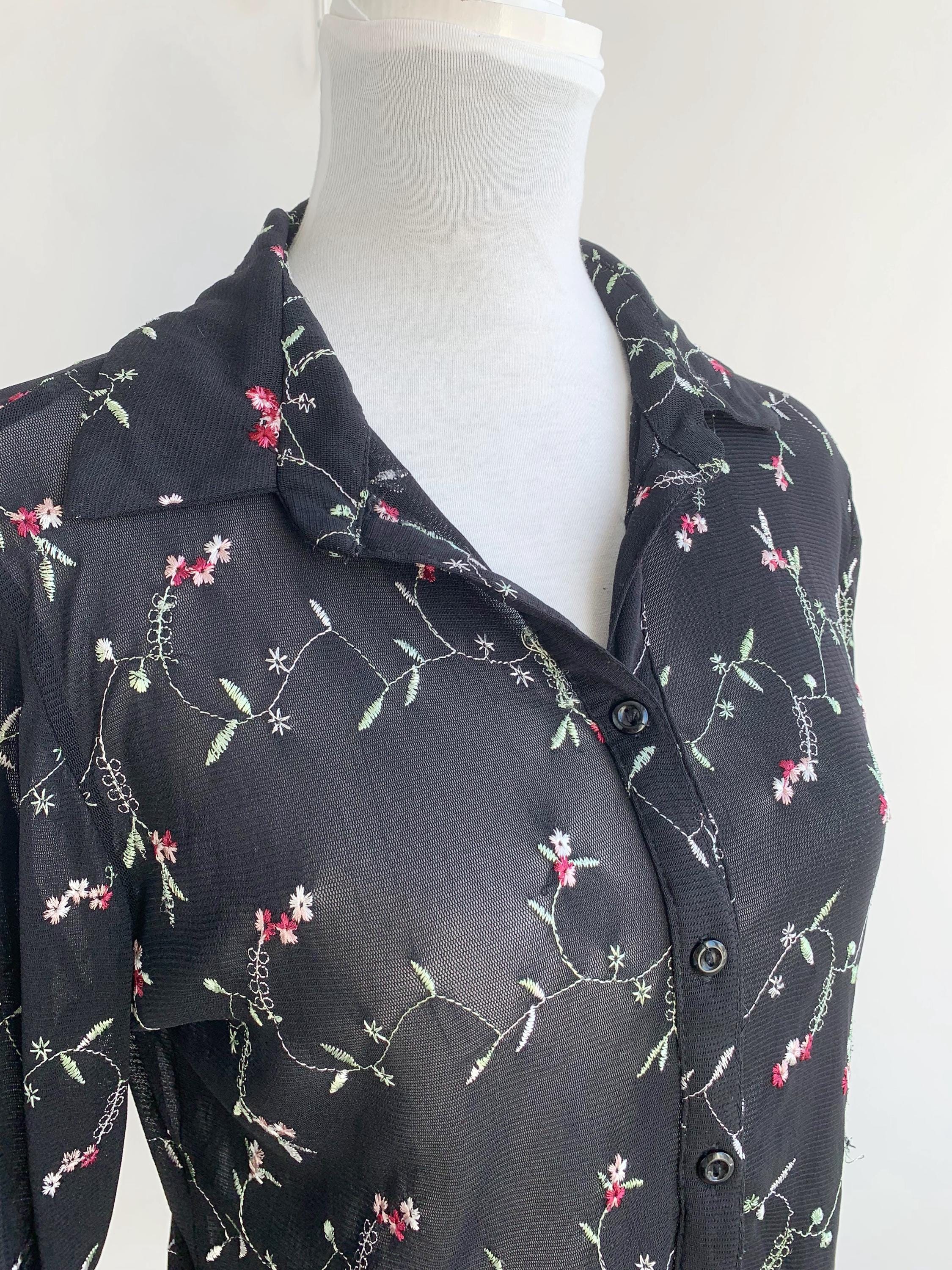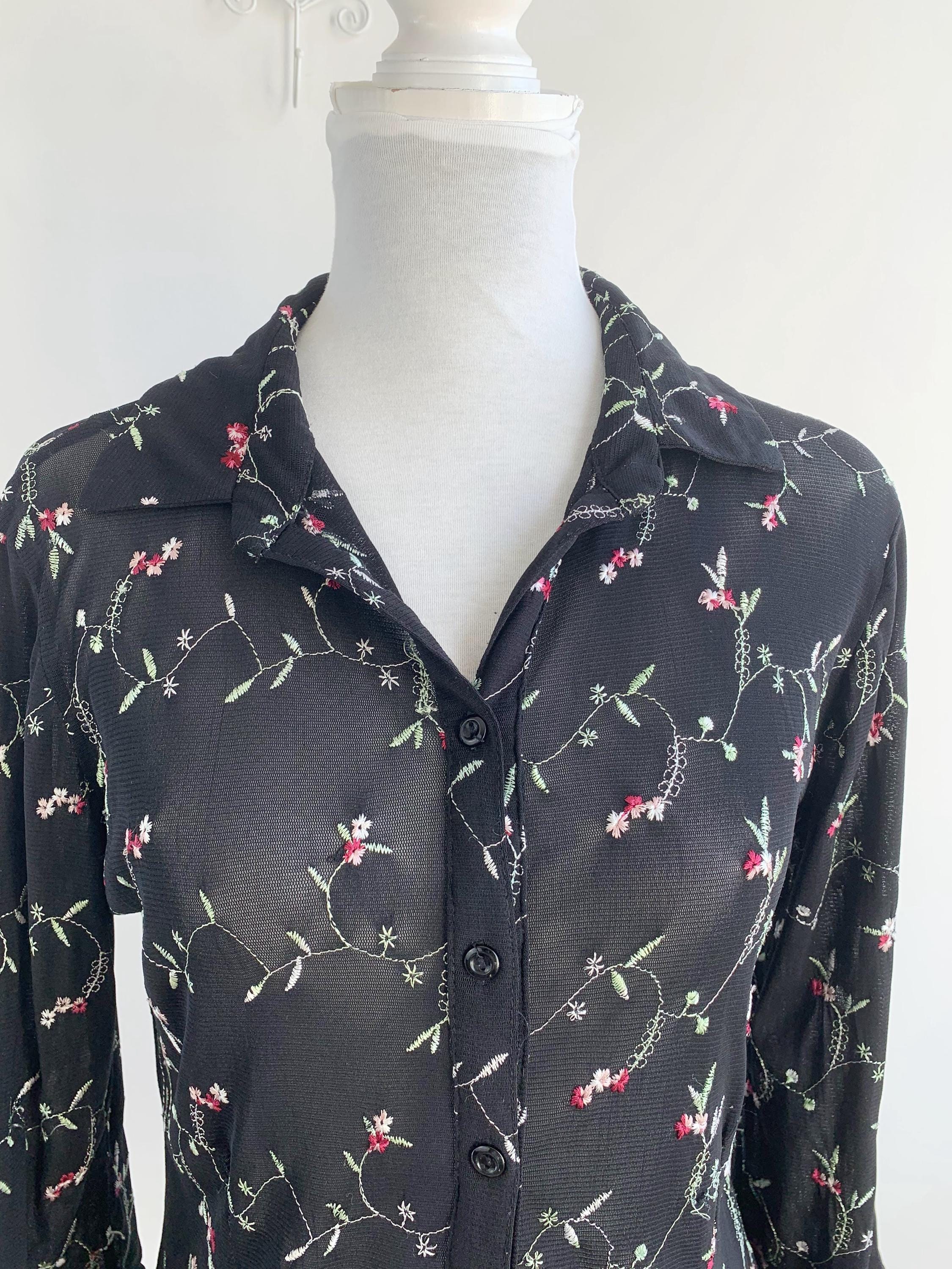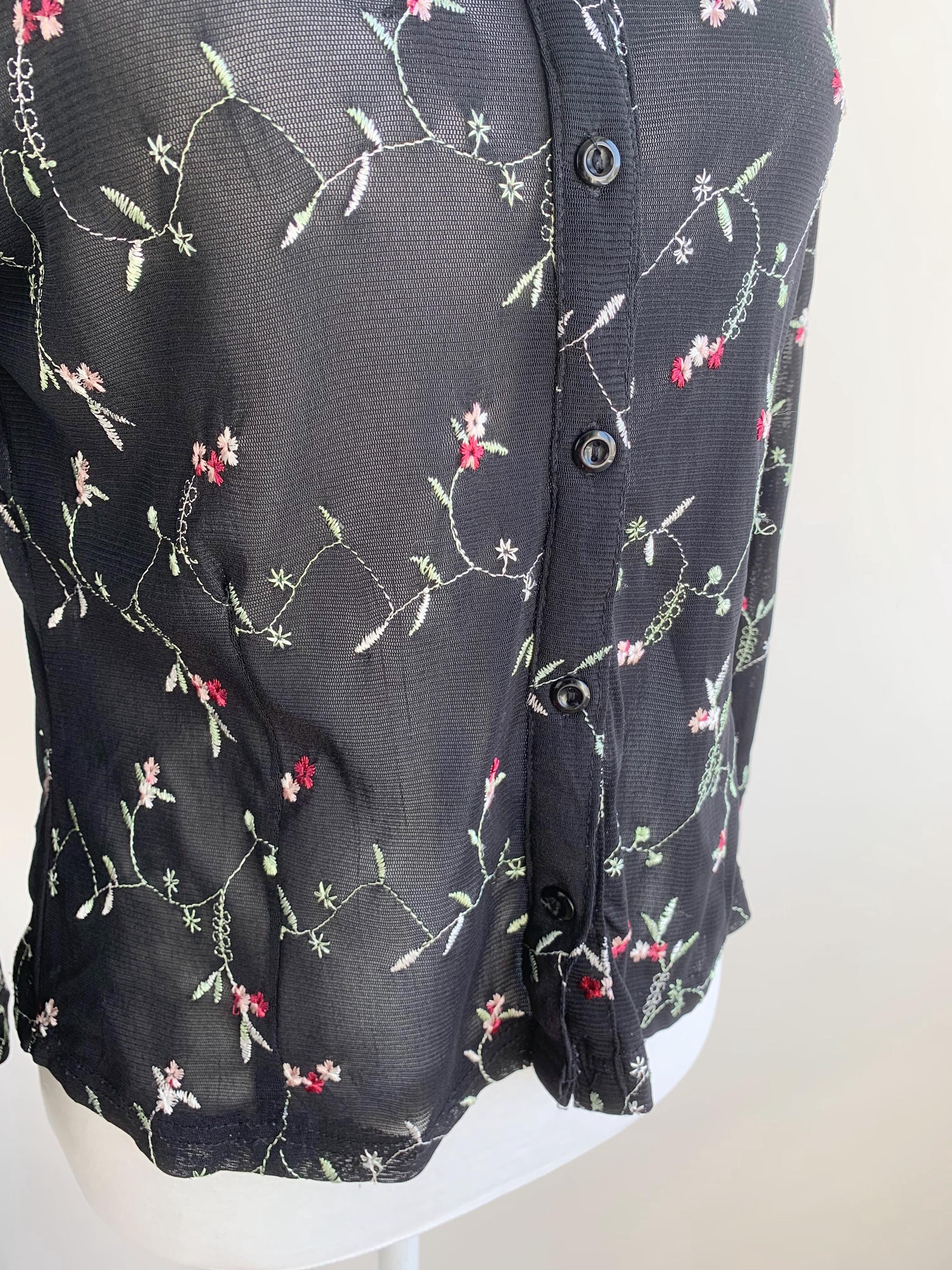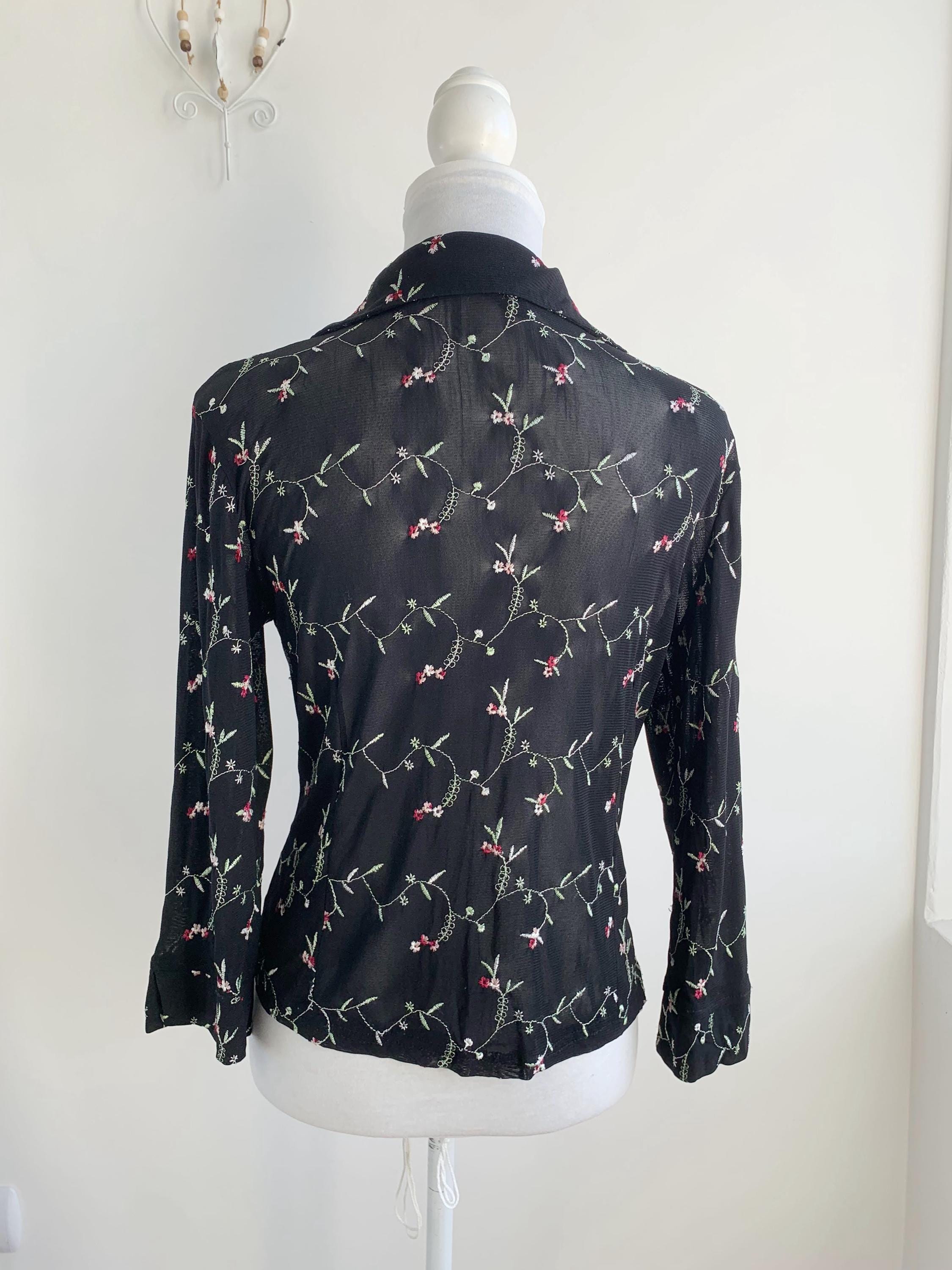 Embrace the whimsigoth and romantic style with this stunning vintage sheer mesh blouse in size M/L and even XL as the fabric has a good amount of stretch. This enchanting vintage piece is a perfect example of Y2K style, featuring delicate multi-colored floral embroidery in shades of red, pink and green that stands out beautifully against the black mesh fabric. The structured collar and 3/4 sleeves and cropped silhouette add to the top's whimsical, fairycore aesthetic. With its semi-transparent look, this sheer black blouse is perfect for layering over a camisole or bralette to create a unique and captivating outfit. It's a versatile piece that can be styled for a romantic date, a music festival, or to simply add a touch of gothic flair to your everyday wardrobe.