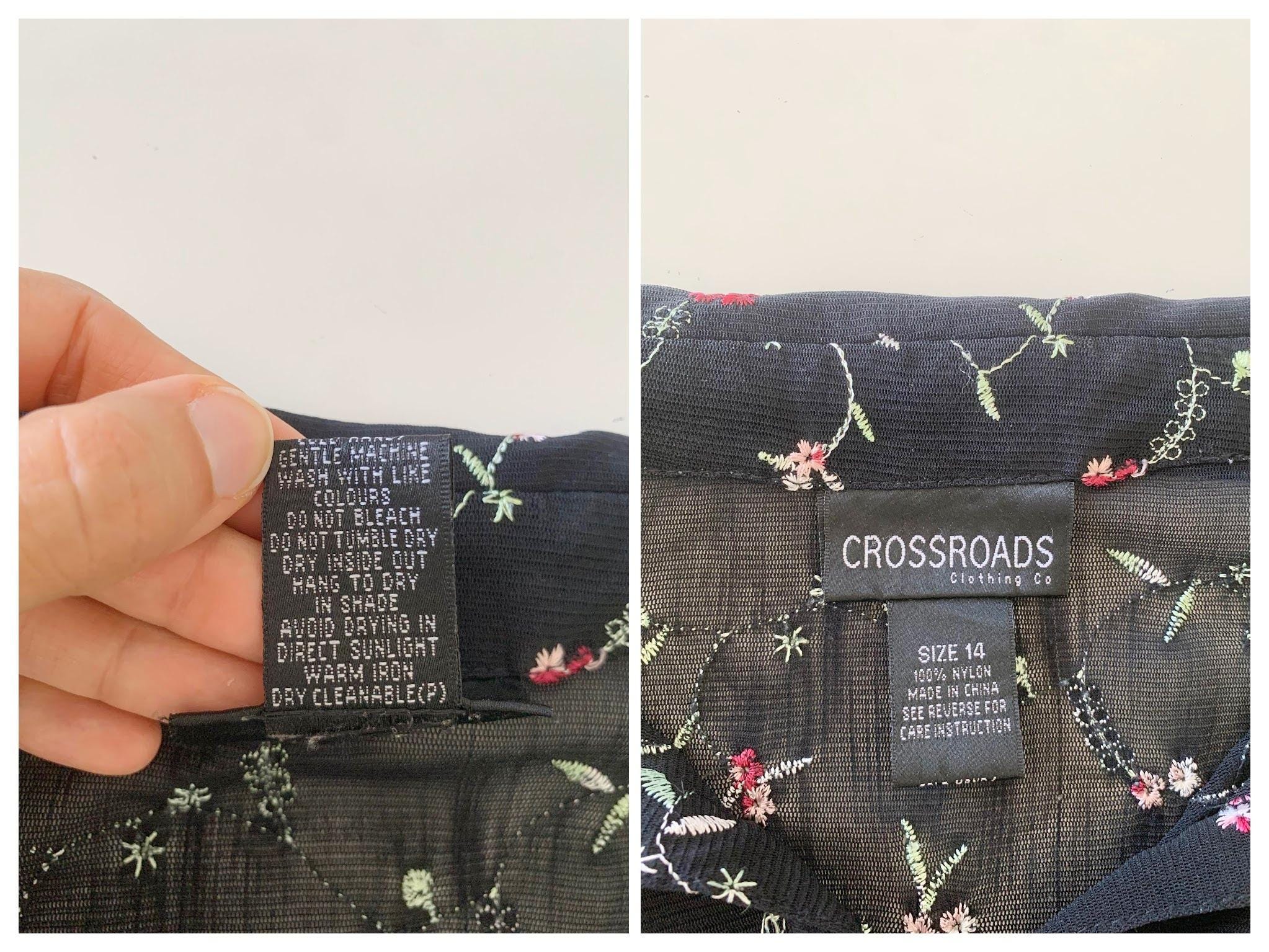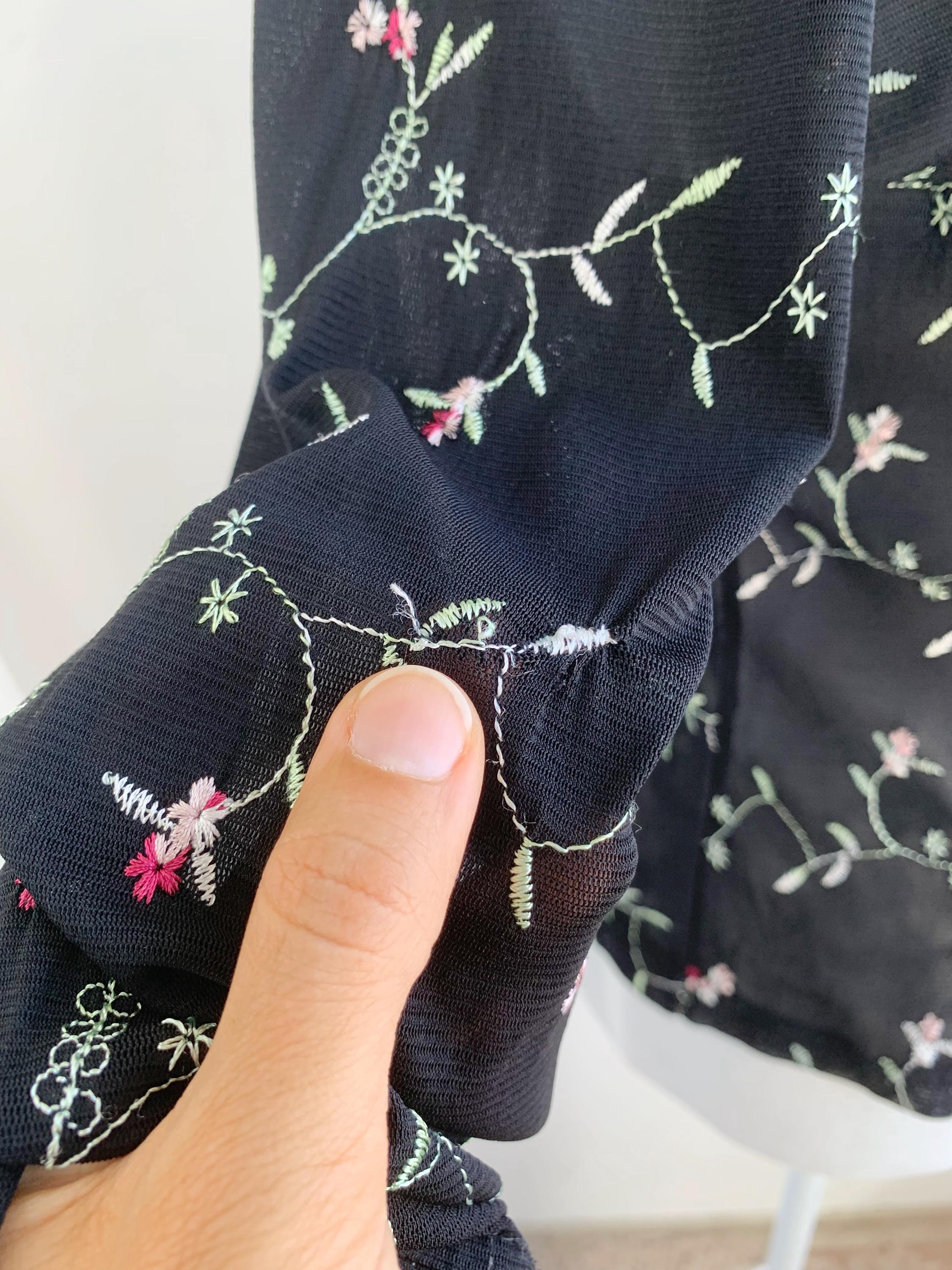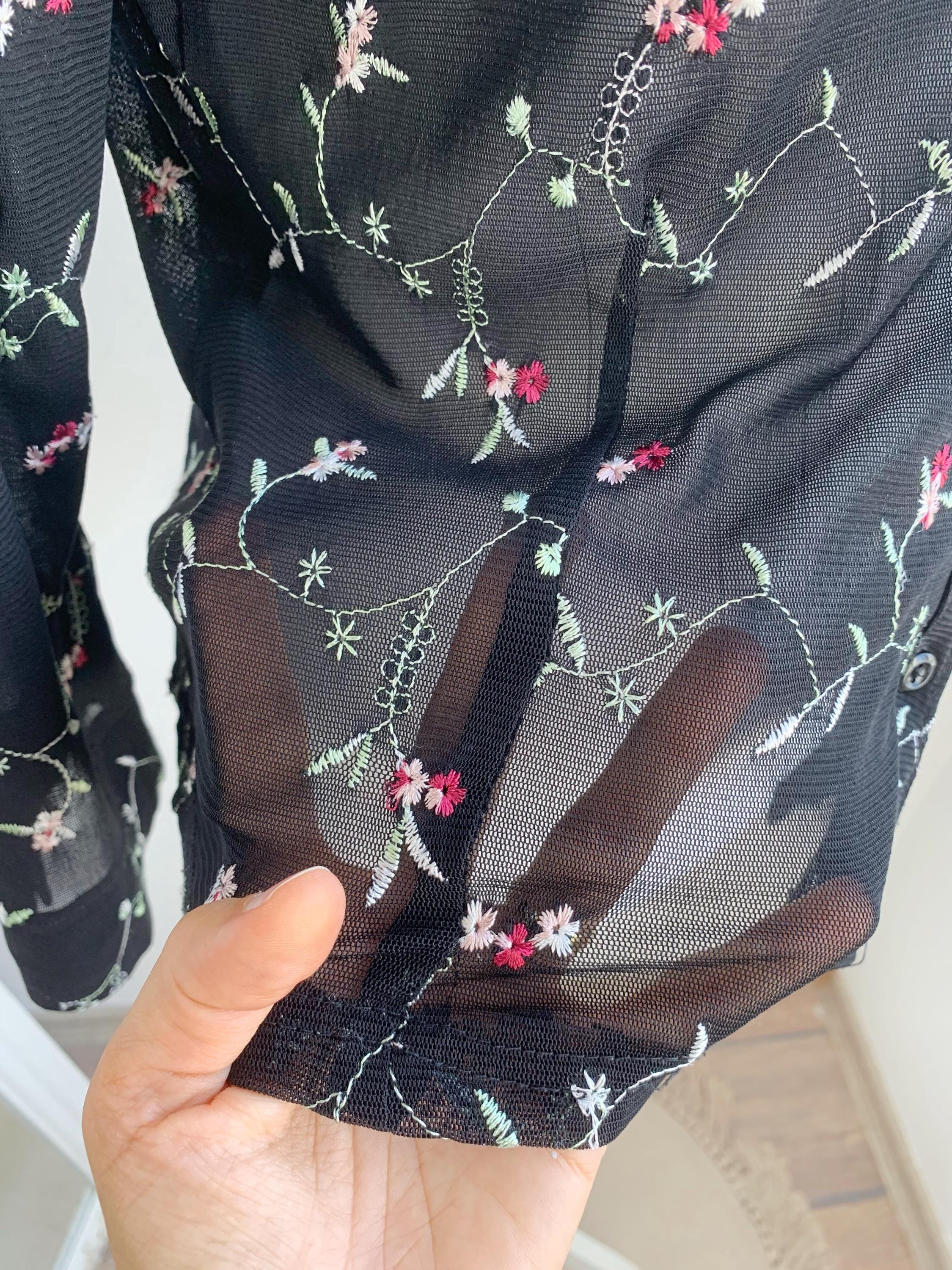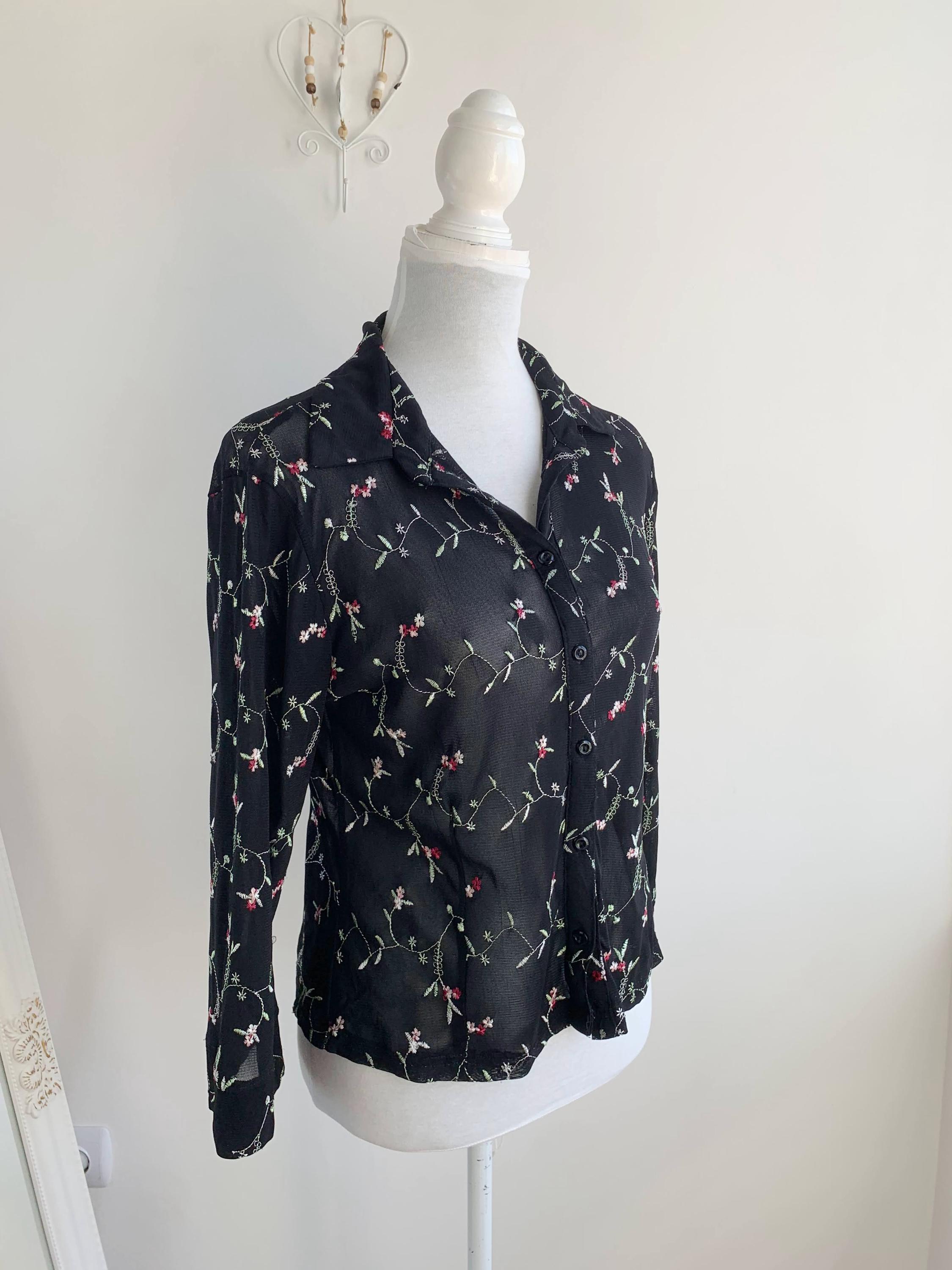 Embrace the whimsigoth and romantic style with this stunning vintage sheer mesh blouse in size M/L and even XL as the fabric has a good amount of stretch. This enchanting vintage piece is a perfect example of Y2K style, featuring delicate multi-colored floral embroidery in shades of red, pink and green that stands out beautifully against the black mesh fabric. The structured collar and 3/4 sleeves and cropped silhouette add to the top's whimsical, fairycore aesthetic. With its semi-transparent look, this sheer black blouse is perfect for layering over a camisole or bralette to create a unique and captivating outfit. It's a versatile piece that can be styled for a romantic date, a music festival, or to simply add a touch of gothic flair to your everyday wardrobe.