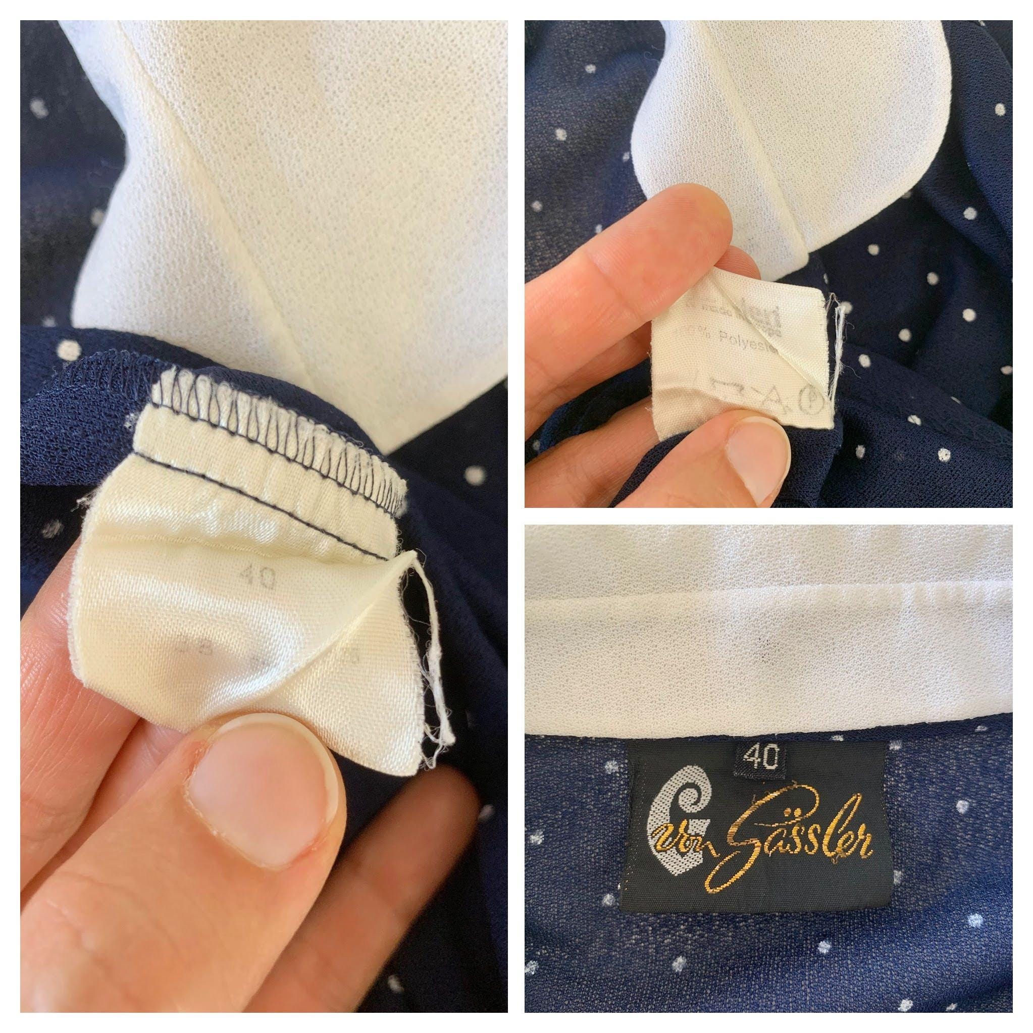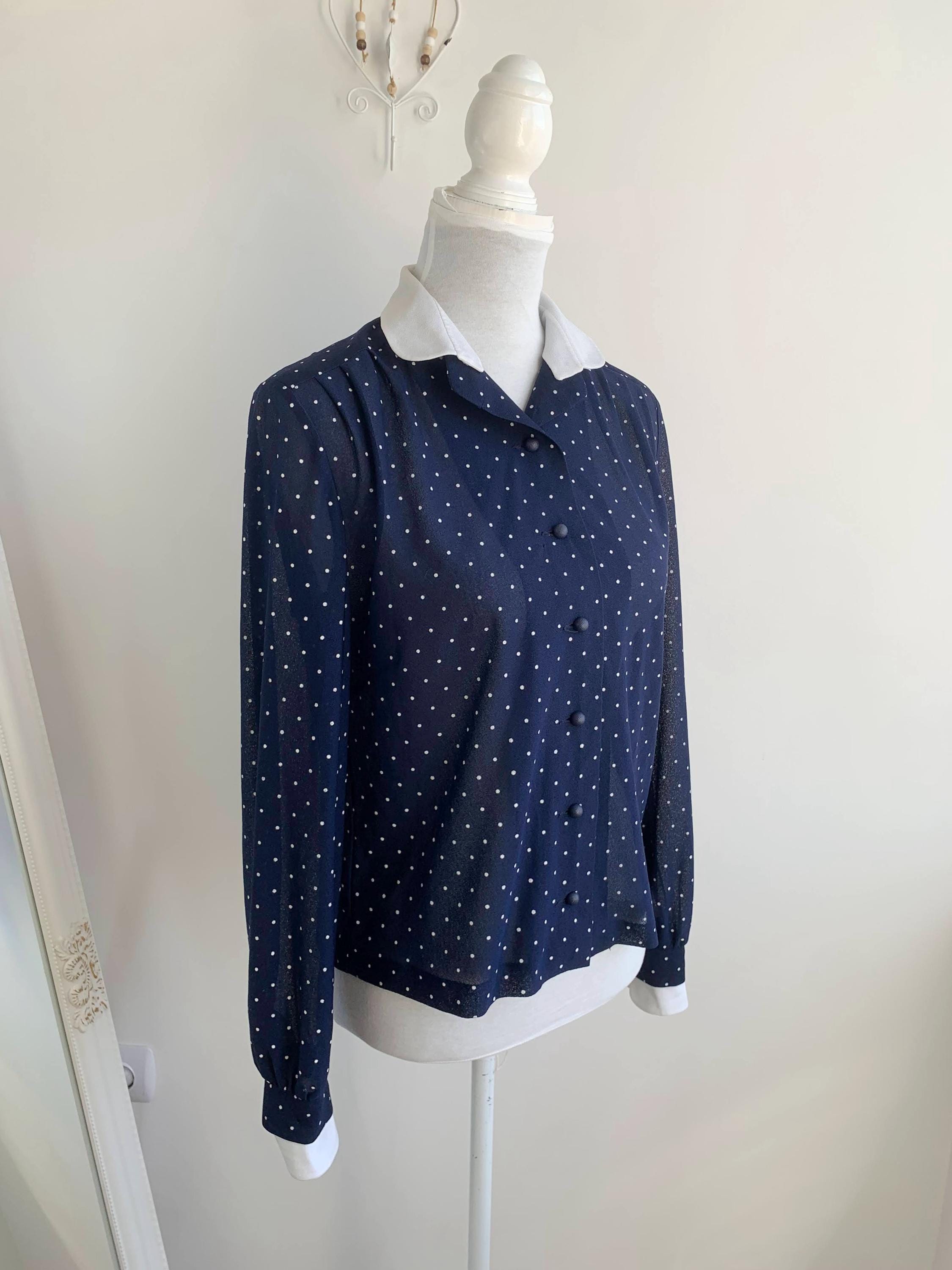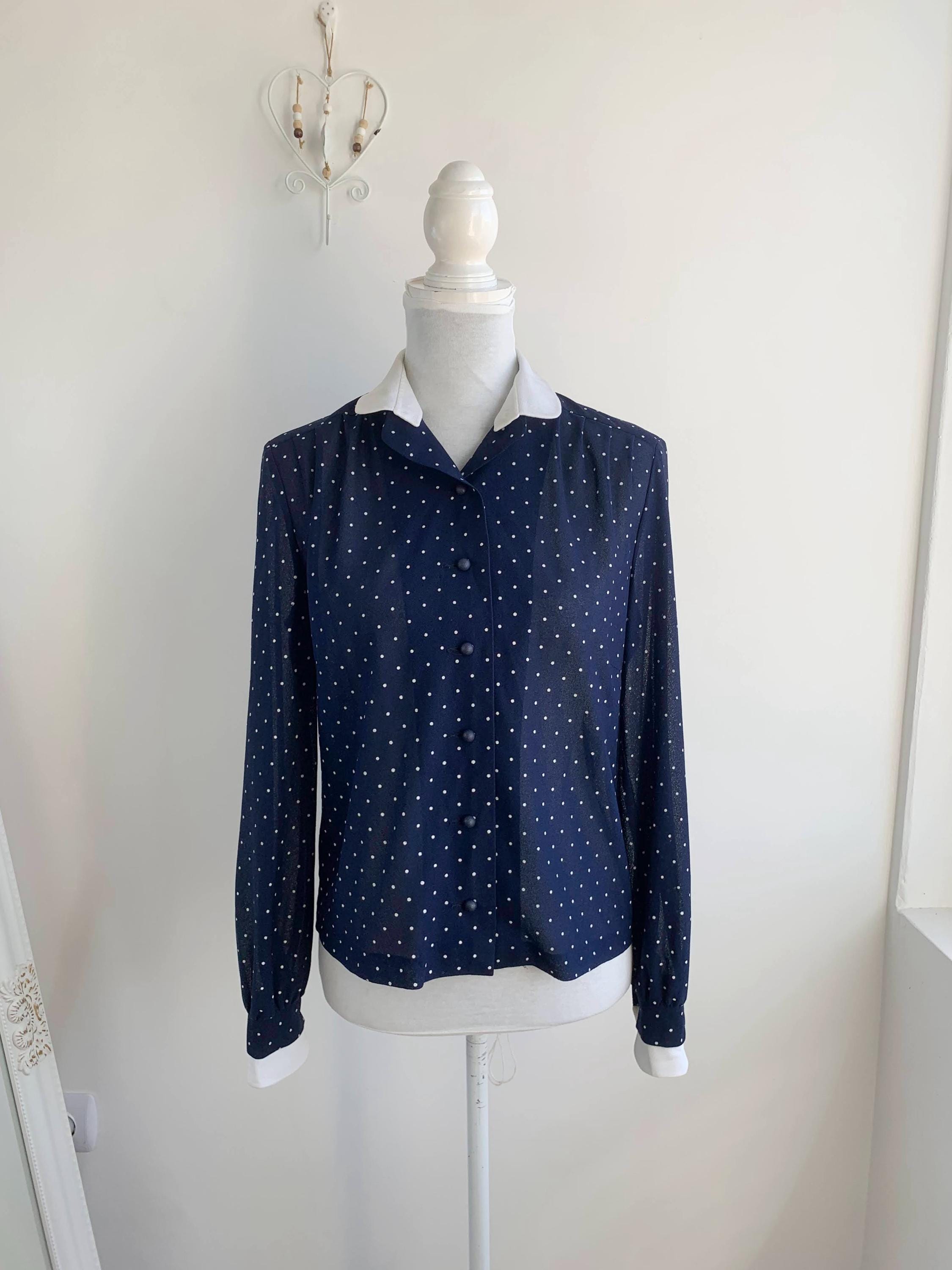 Step into a world of timeless style with this charming true vintage polka dot blouse from the late 1970s - early 1980s. This piece is a delightful find by the German brand von Gassler, known for its classic European designs. The navy blue fabric is covered in a playful pattern of small white polka dots, creating a look that is both sophisticated and fun. What truly sets this blouse apart is the crisp, contrasting white collar and matching white cuffs which can be detached, a signature detail of the decade's preppy and professional fashion. The lightweight fabric drapes beautifully, making it a comfortable and stylish option for business casual wear or a romantic, retro-inspired outing. Pair it with high-waisted trousers or a pencil skirt for a perfectly put-together vintage look.