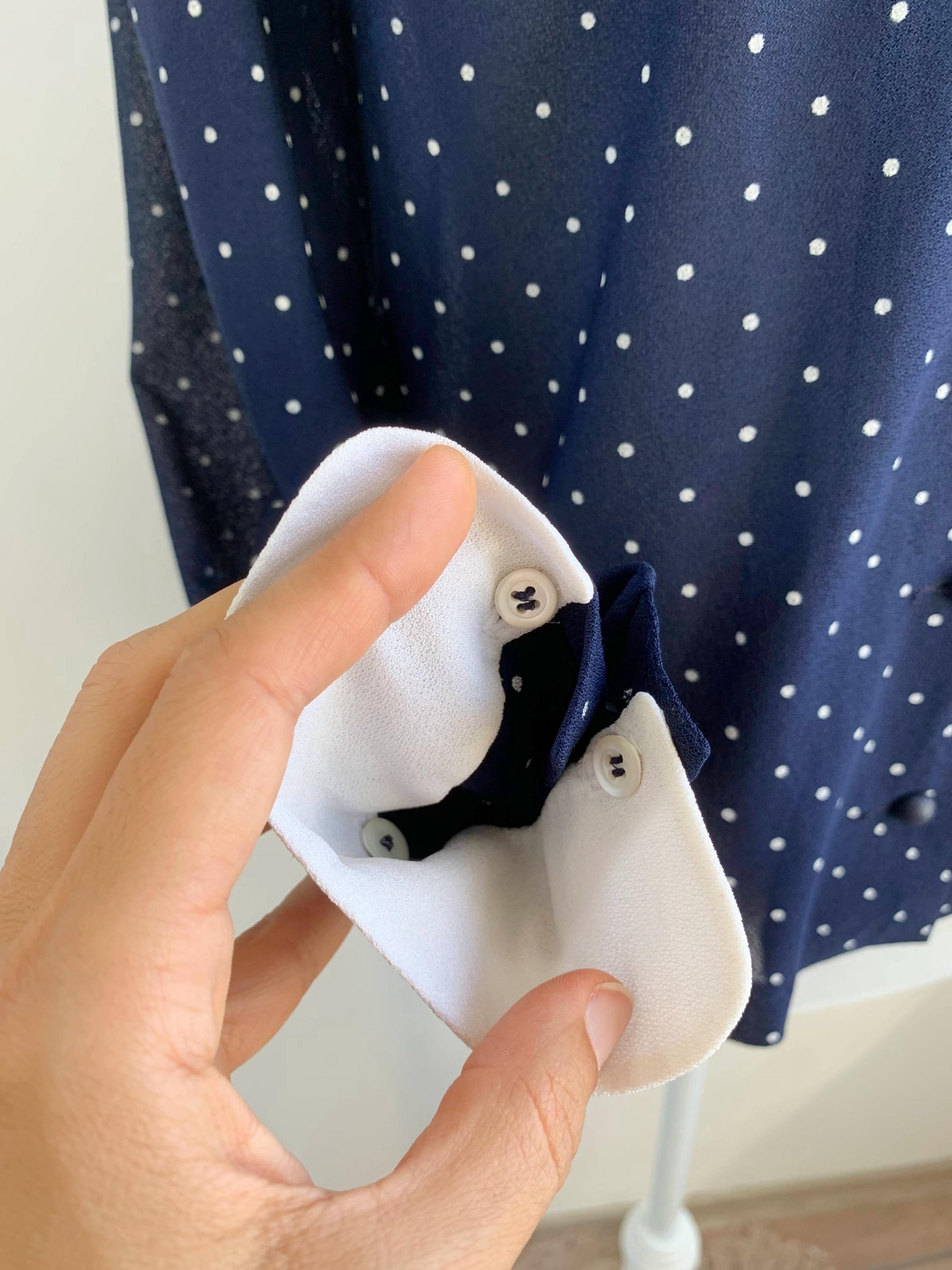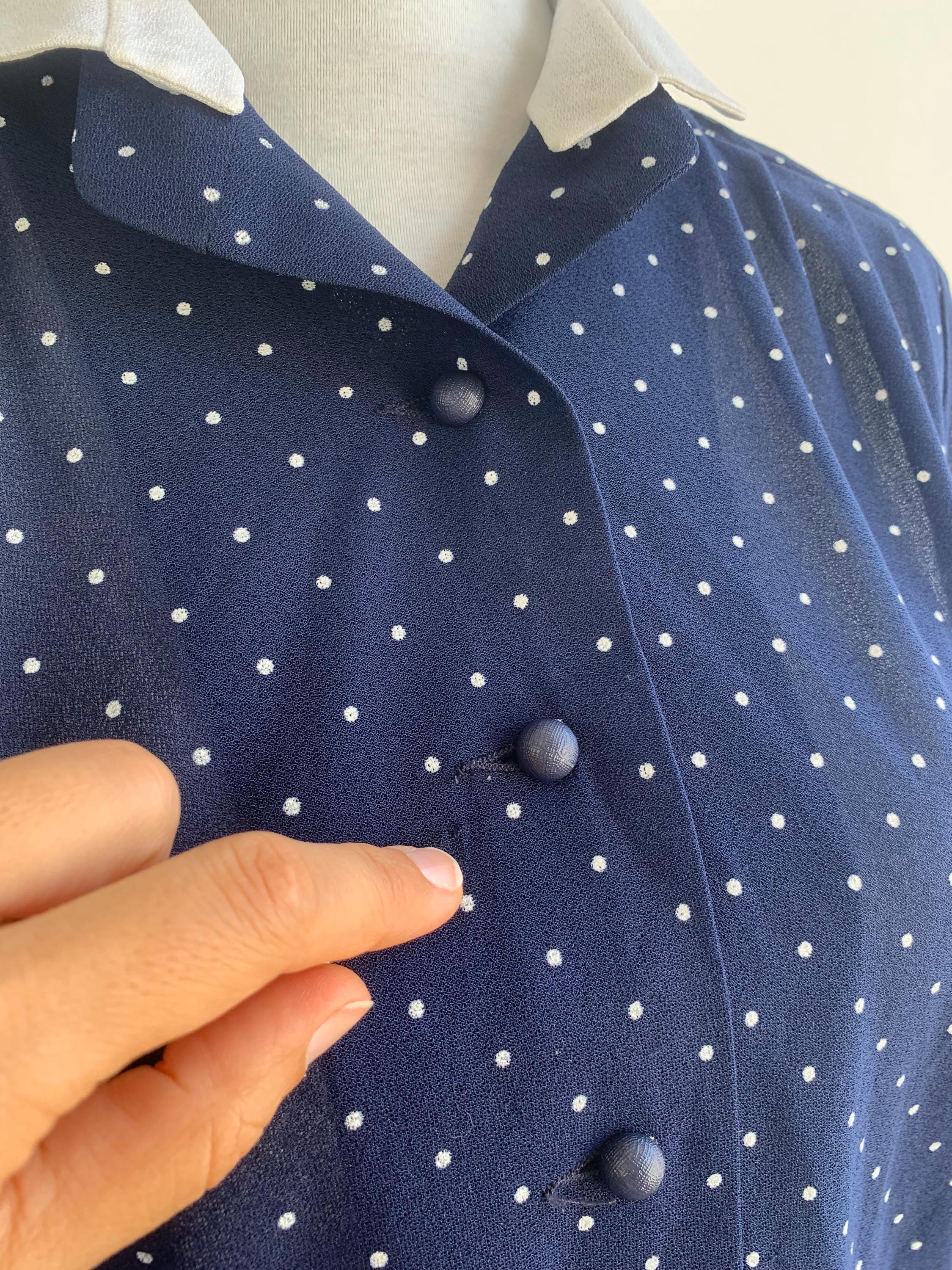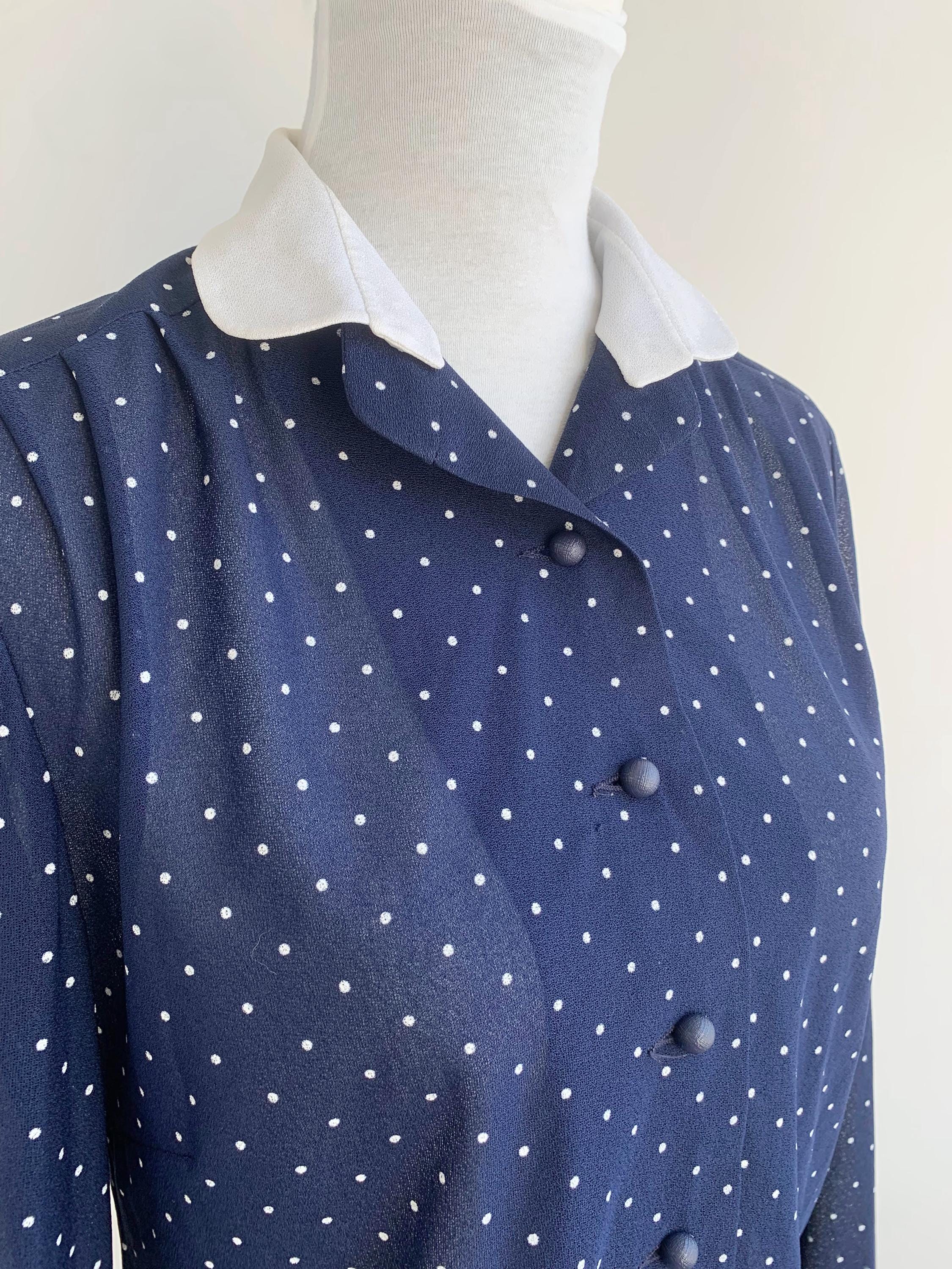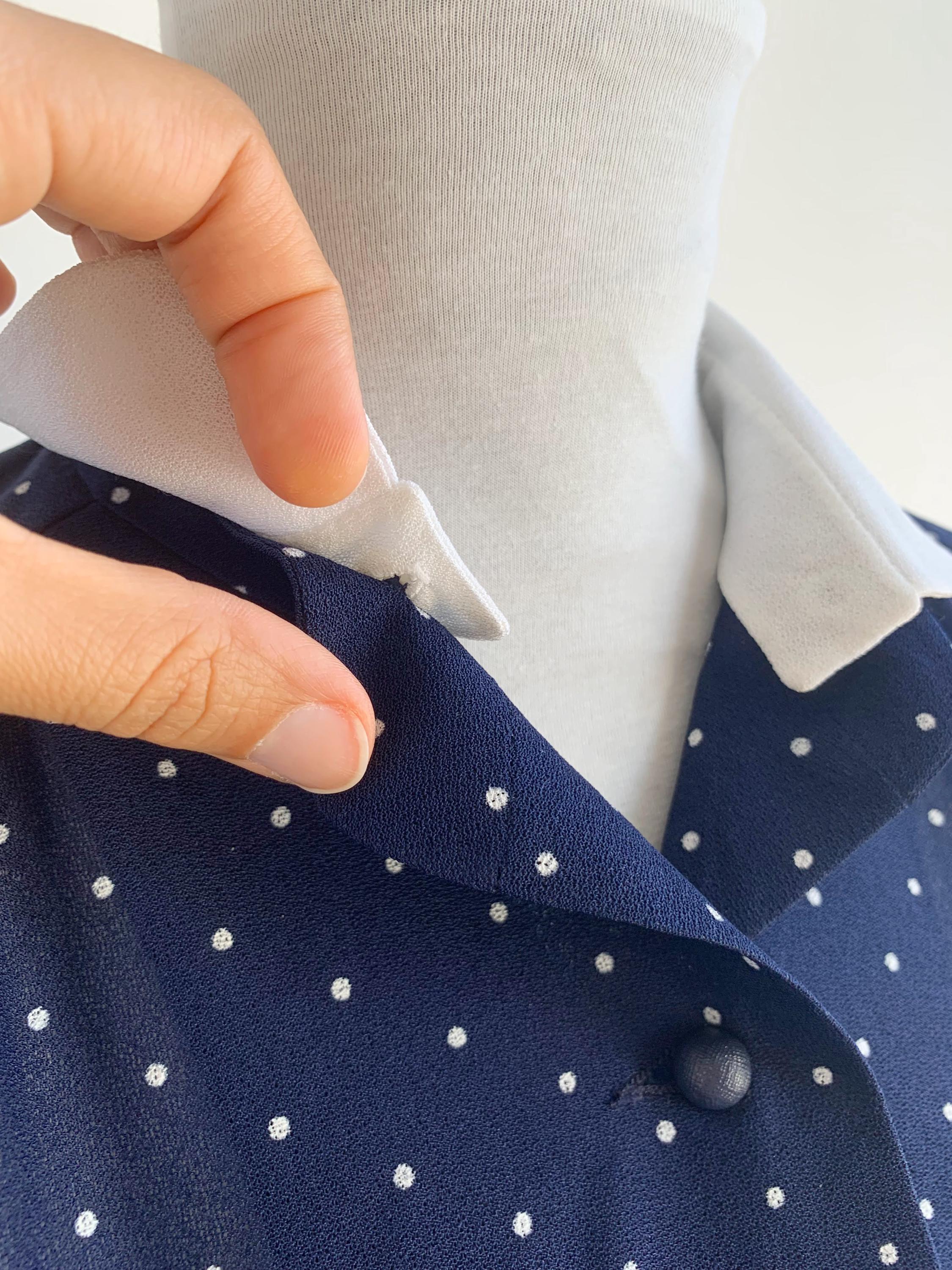 Color: Navy blue with white polka dots; white collar and cuffs.