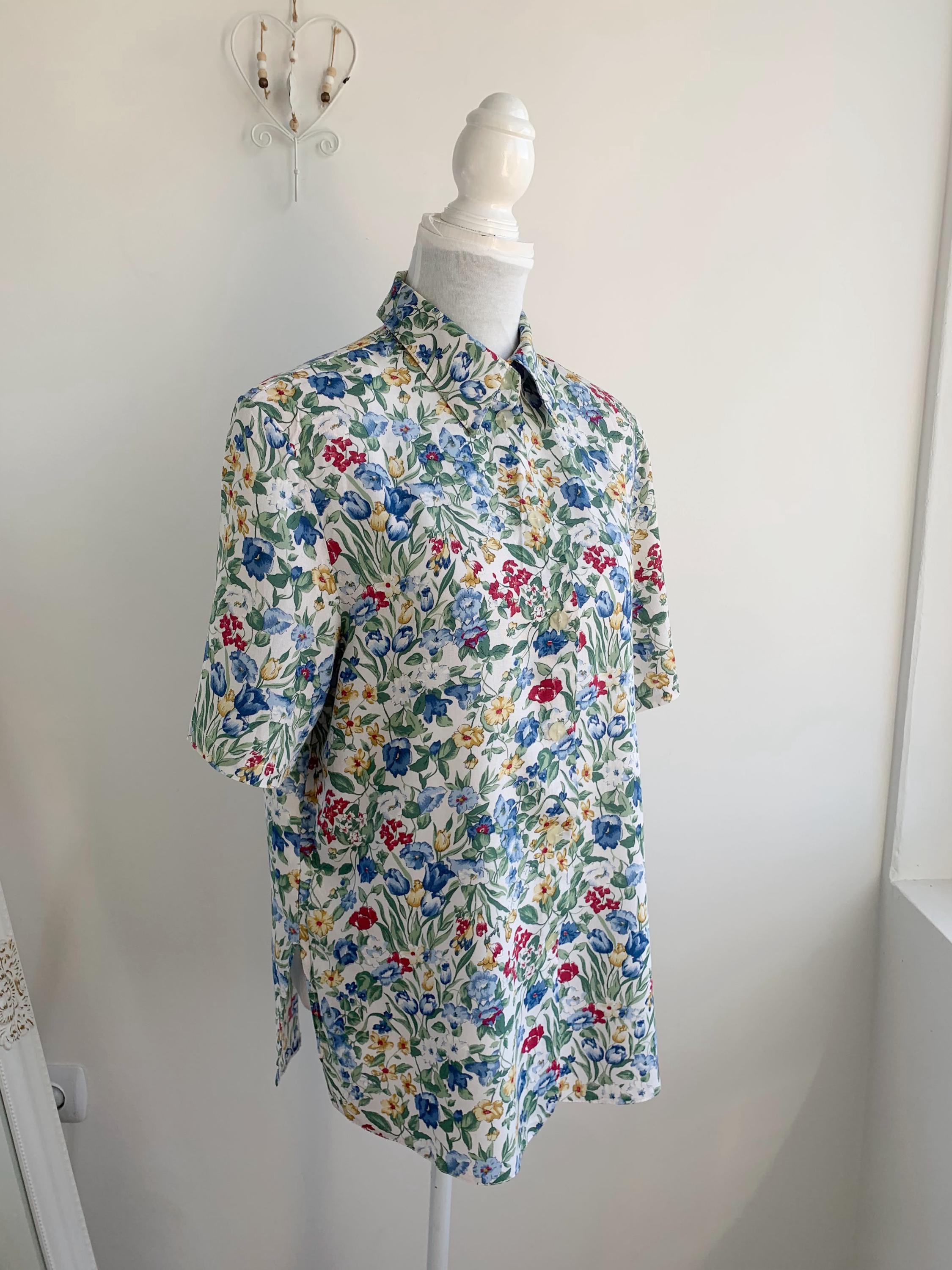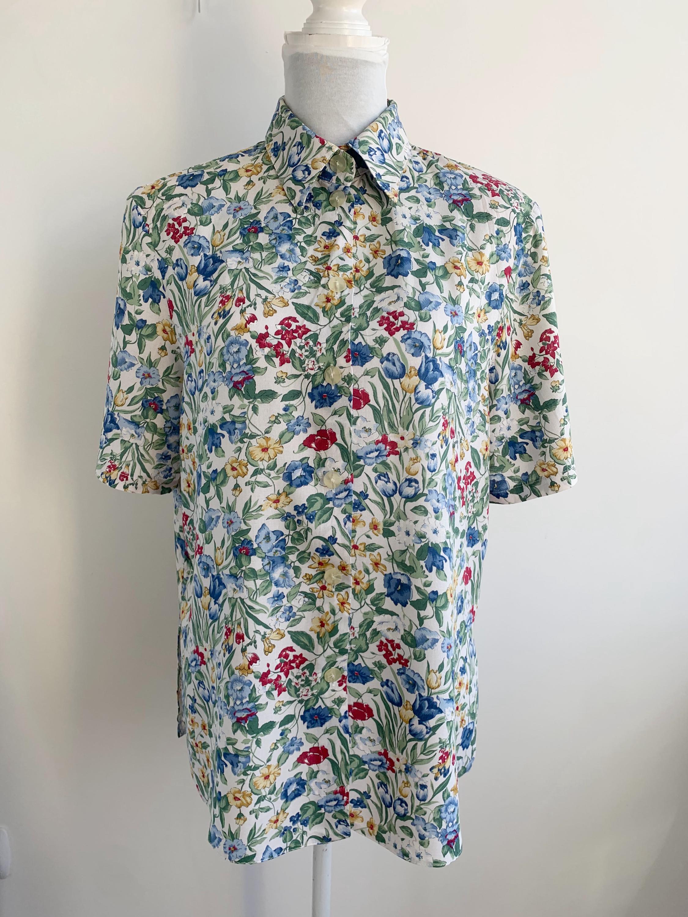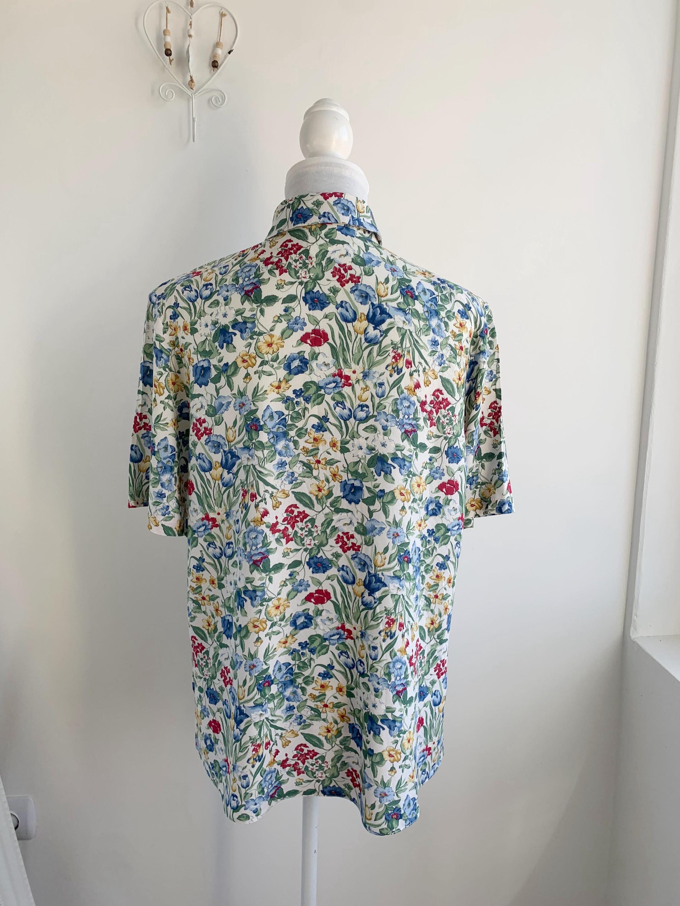Step into a dreamy, romantic era with this gorgeous vintage blouse from the 1980s. Crafted from a lightweight soft viscose fabric, this shirt drapes beautifully and feels like a gentle breeze on your skin. The stunning pastel floral print, featuring delicate red, blue and yellow flowers with green foliage on a pale off white background, gives it a whimsical and romantic cottagecore aesthetic. With its short sleeves, classic collar, and button-up front, this versatile piece is perfect for layering or wearing on its own. The oversized cut is quintessential for the 80s style, offering a comfortable and effortlessly chic fit. A true one-of-a-kind find vintage piece, this blouse is an excellent addition to any vintage-inspired wardrobe.