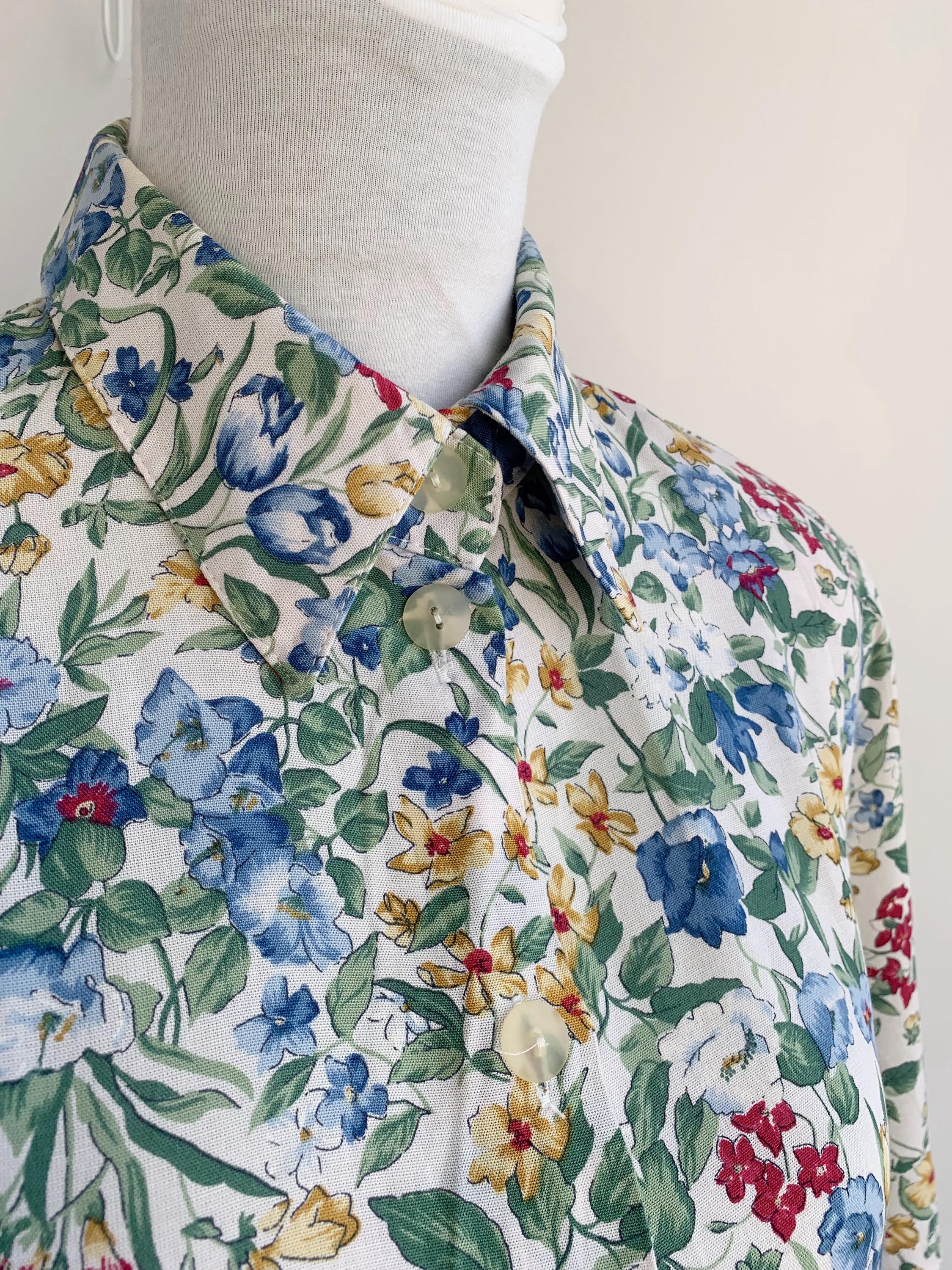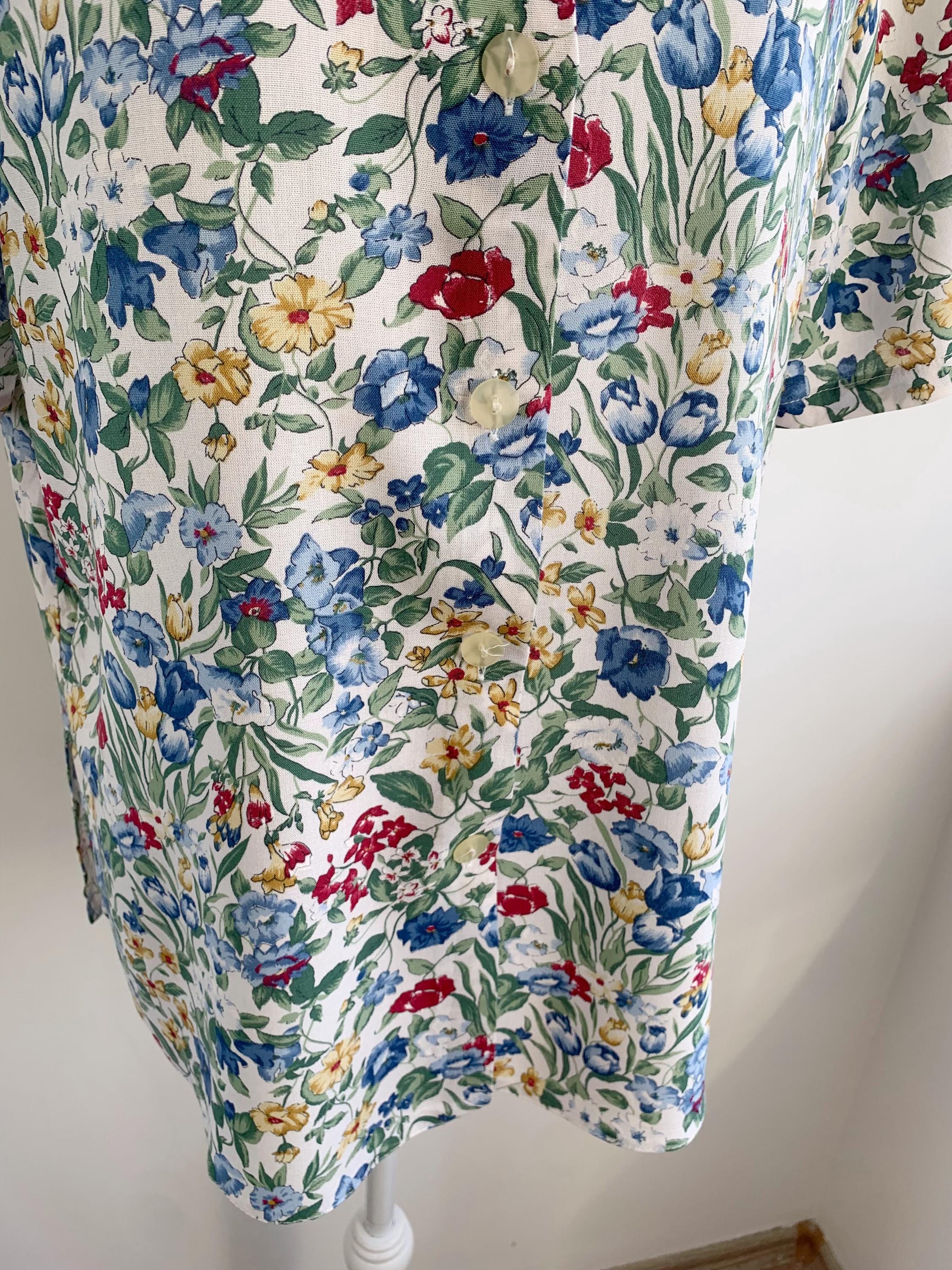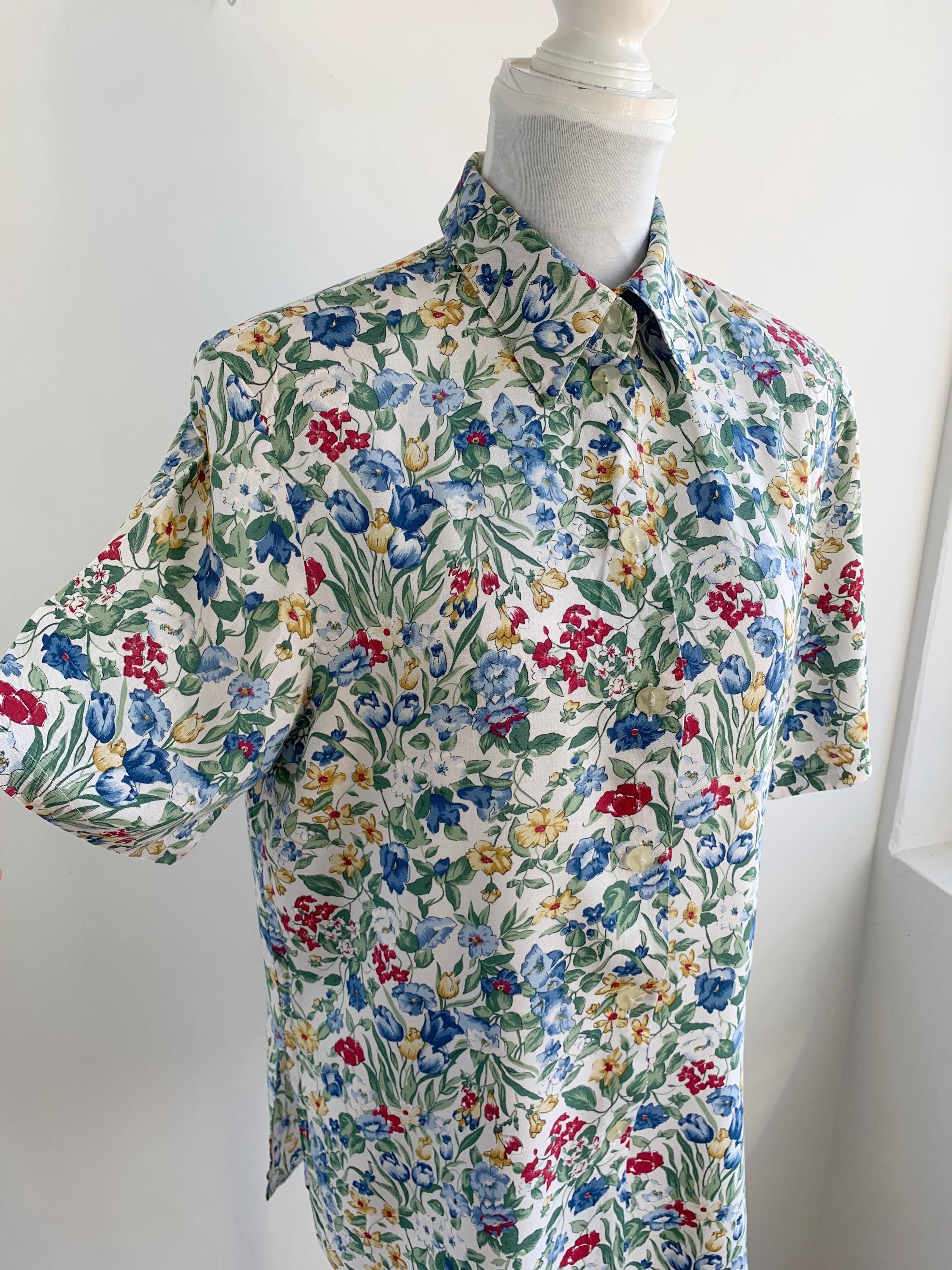 Step into a dreamy, romantic era with this gorgeous vintage blouse from the 1980s. Crafted from a lightweight soft viscose fabric, this shirt drapes beautifully and feels like a gentle breeze on your skin. The stunning pastel floral print, featuring delicate red, blue and yellow flowers with green foliage on a pale off white background, gives it a whimsical and romantic cottagecore aesthetic. With its short sleeves, classic collar, and button-up front, this versatile piece is perfect for layering or wearing on its own. The oversized cut is quintessential for the 80s style, offering a comfortable and effortlessly chic fit. A true one-of-a-kind find vintage piece, this blouse is an excellent addition to any vintage-inspired wardrobe.