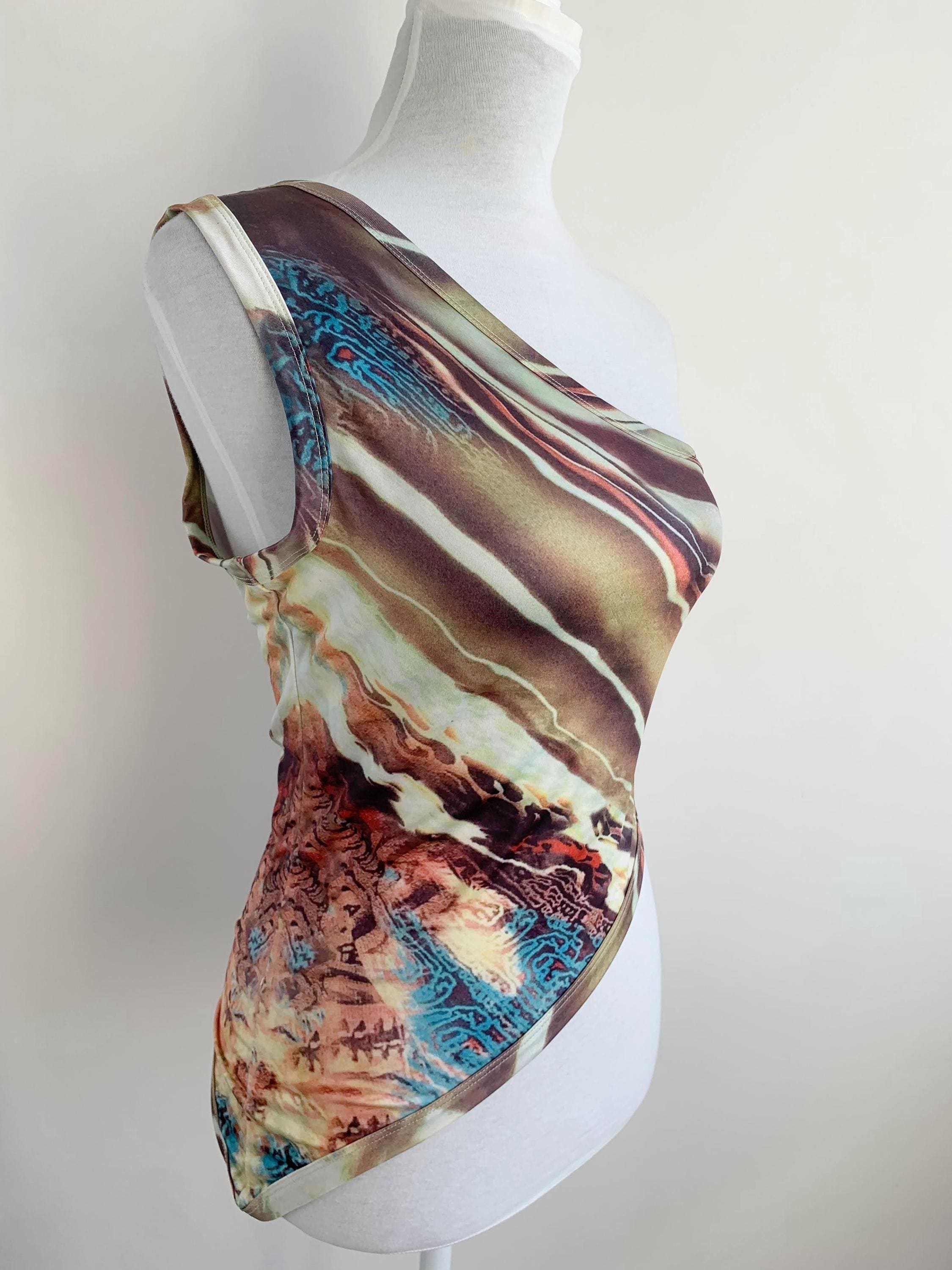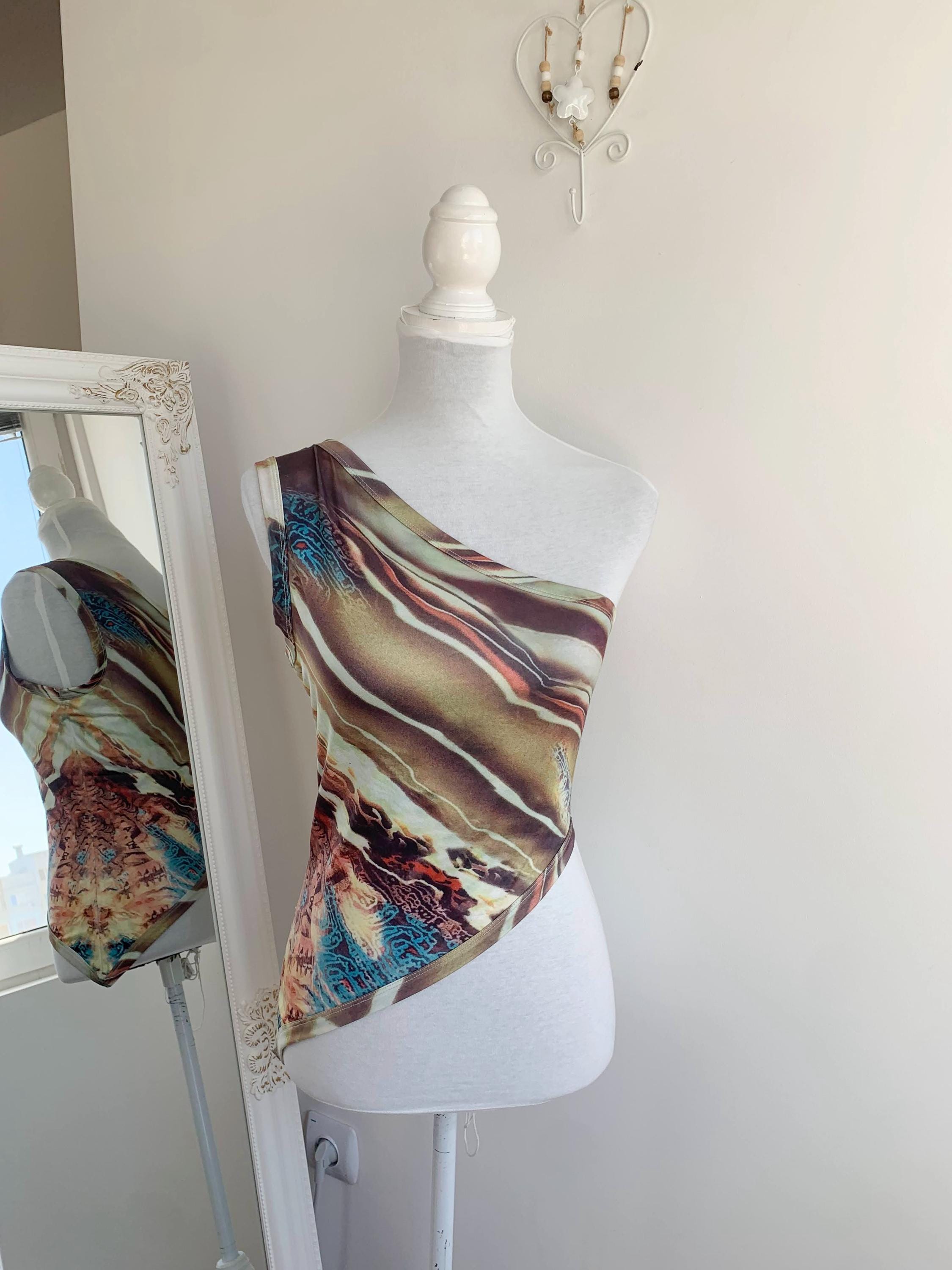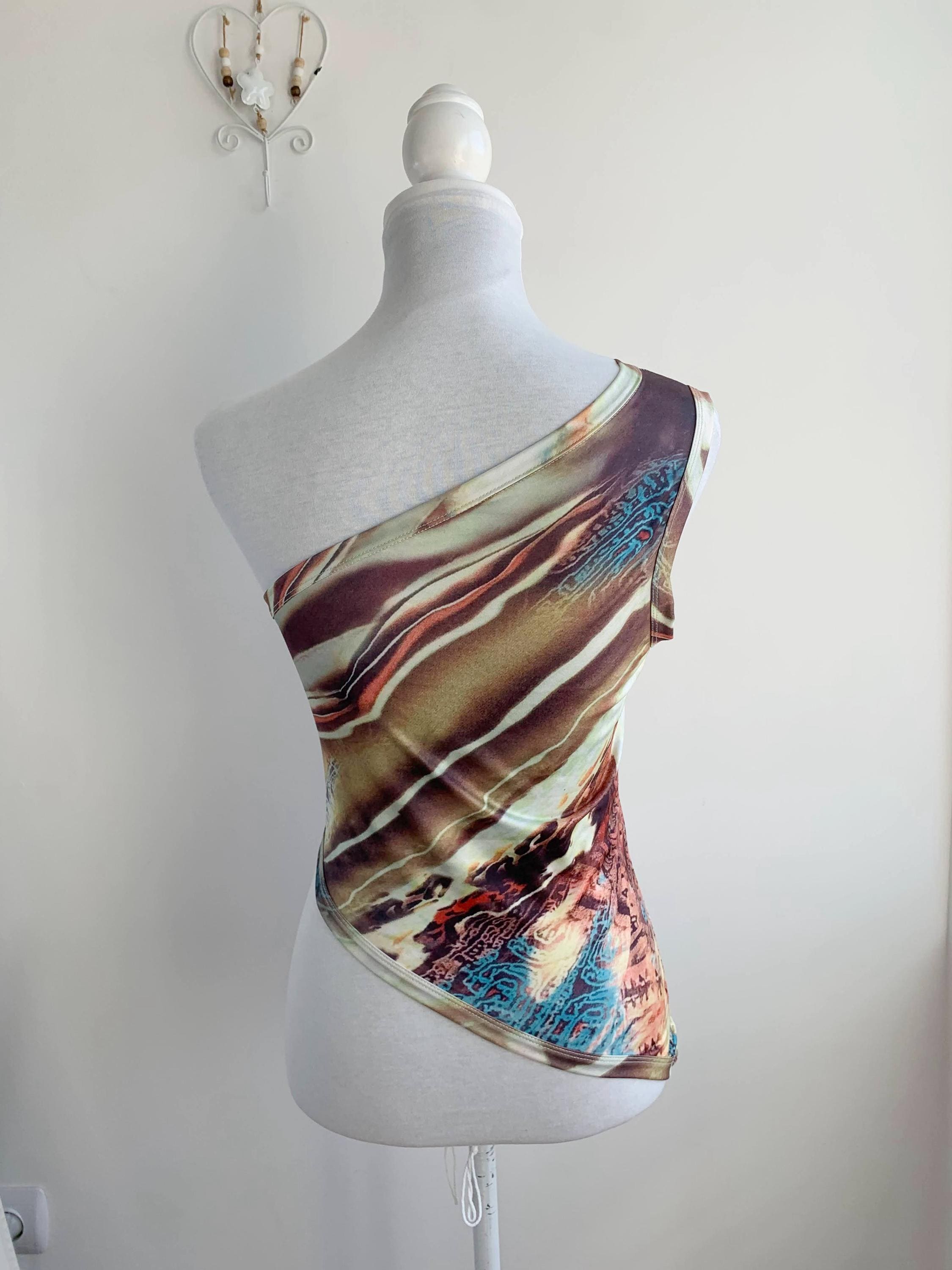 Make a bold style statement with this vintage Y2K top. This asymmetrical top is a perfect example of the playful and edgy fashion that defined the early 2000s. It features a unique asymmetrical one-shoulder design and a vibrant abstract print that truly stands out from the crowd. The stretchy, form-fitting material and an uneven, cropped hemline give it a flattering and modern silhouette. Whether you're dressing up for a festival, a party, or simply want to add some nostalgic grunge or rave flair to your everyday look, this one shoulder top is a rare and eye-catching find. A must-have for any collector of 90s and Y2K aesthetic clothing.