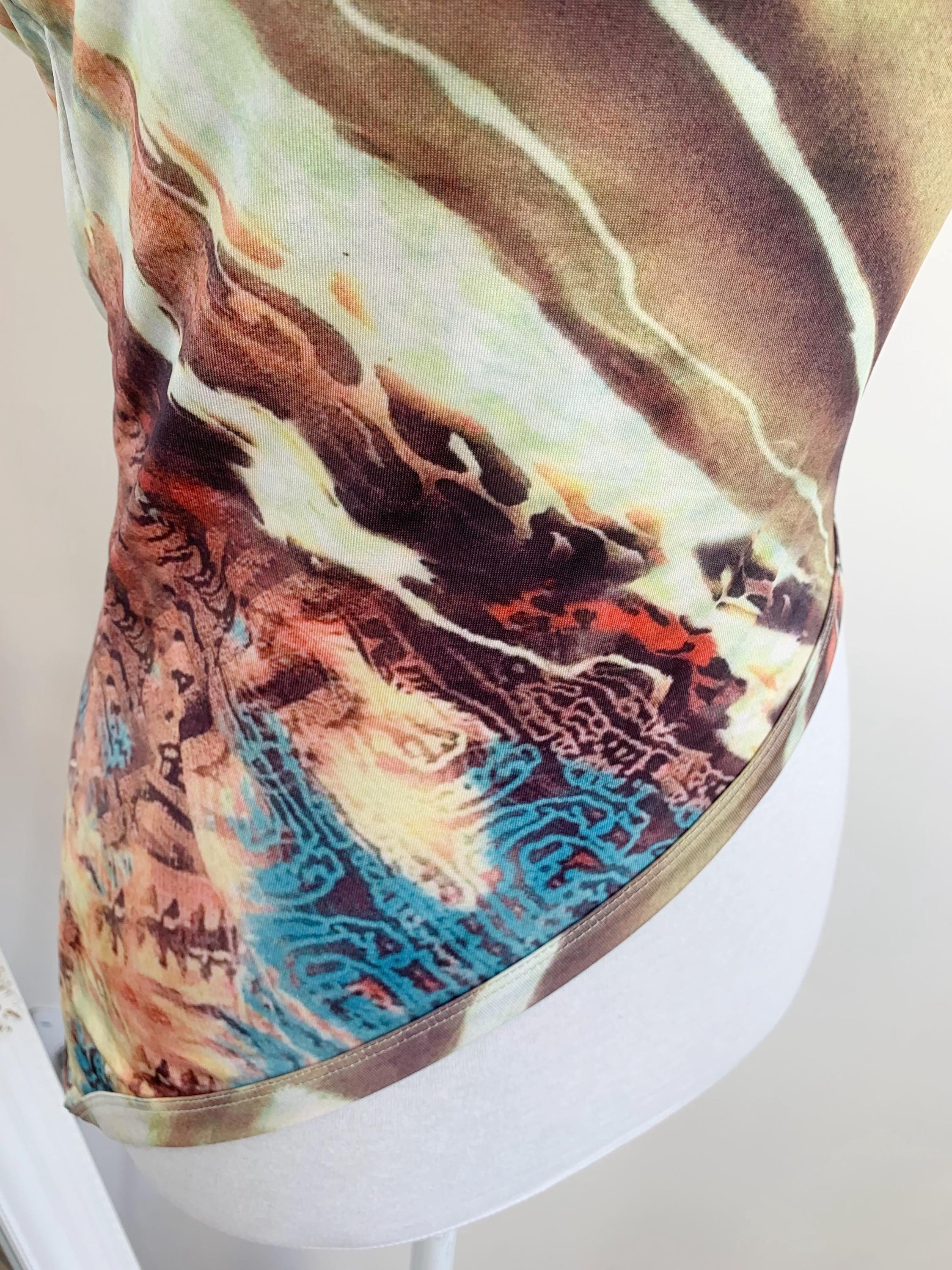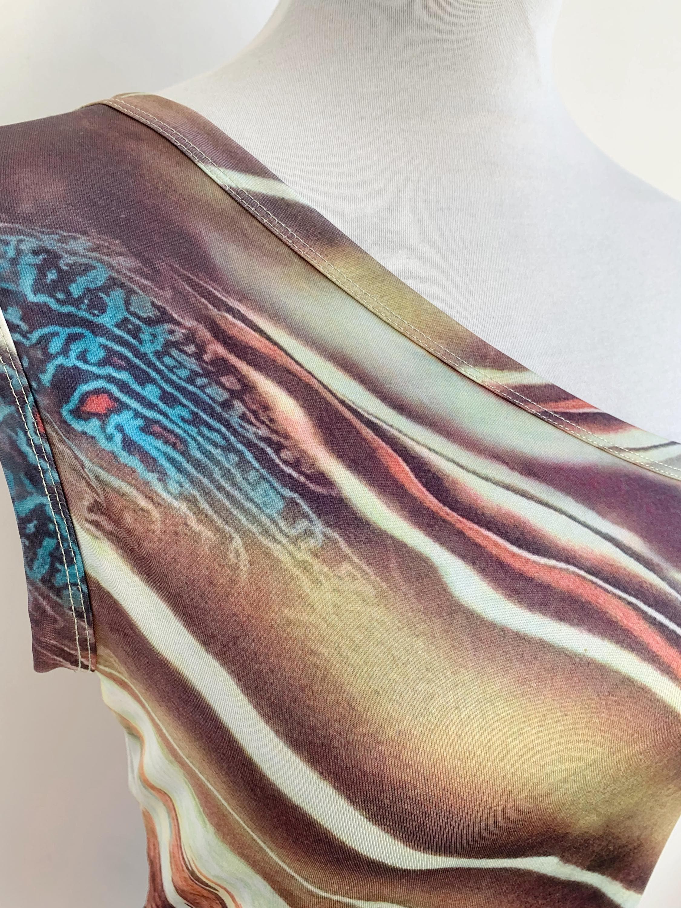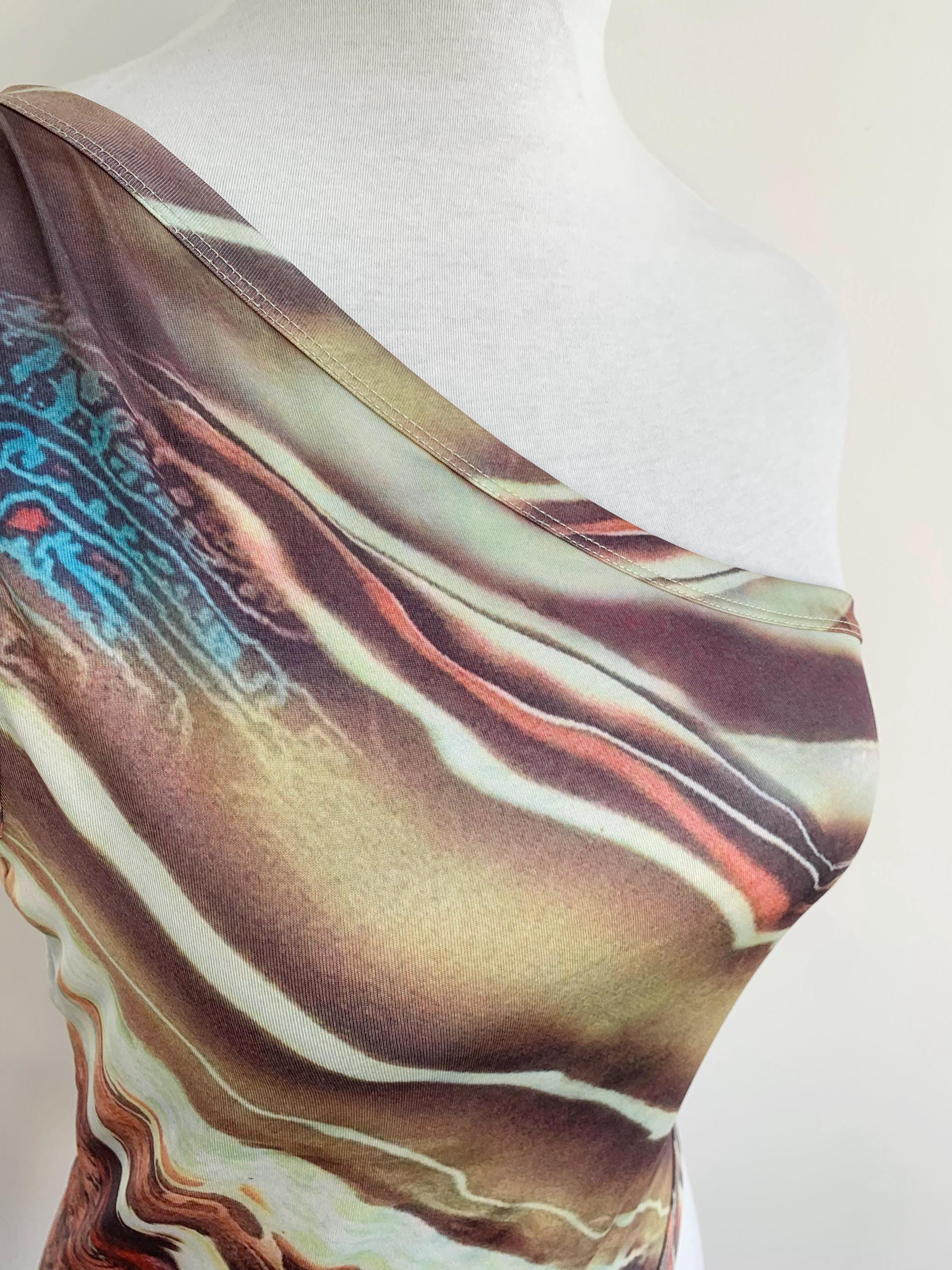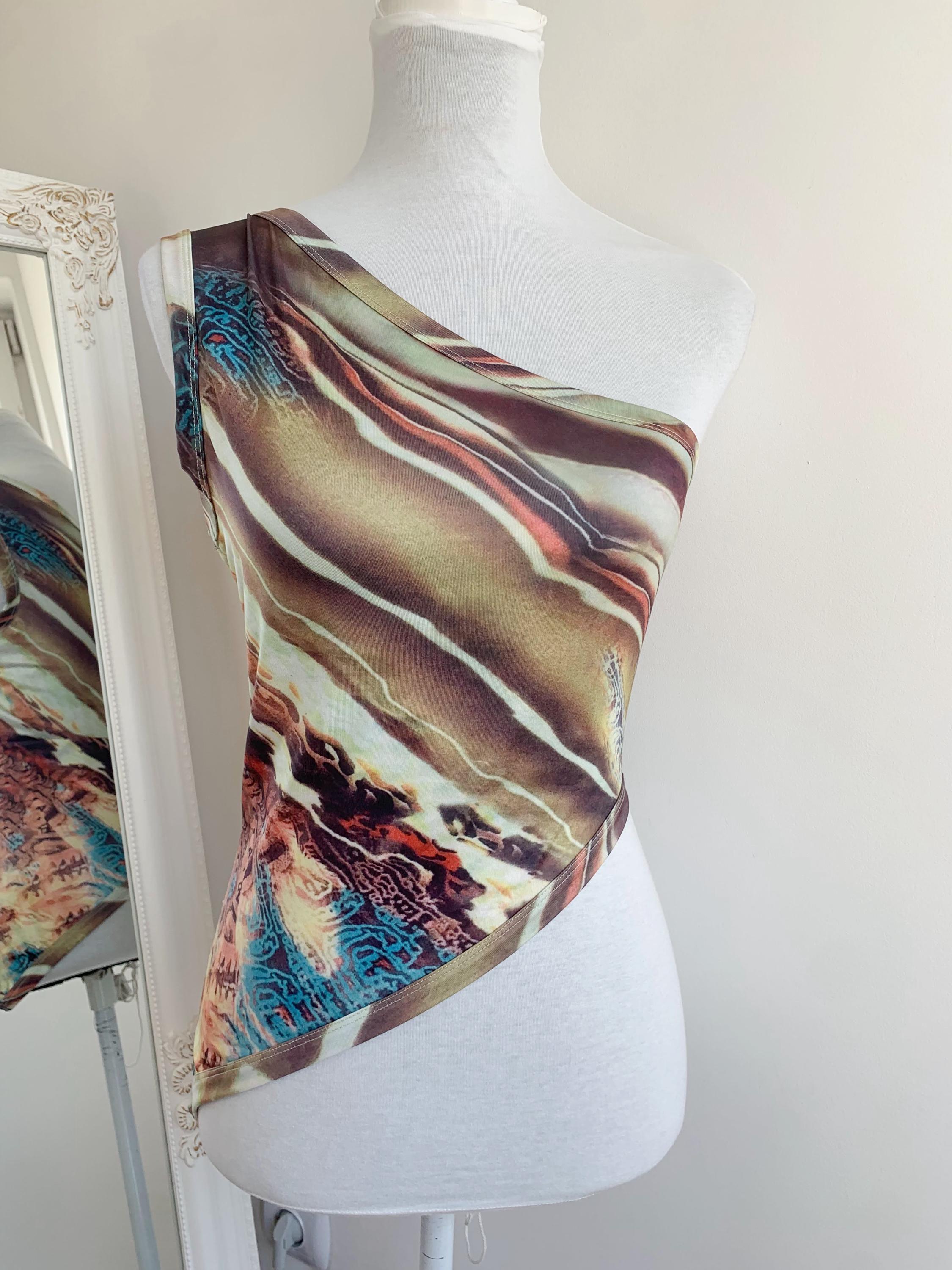 Make a bold style statement with this vintage Y2K top. This asymmetrical top is a perfect example of the playful and edgy fashion that defined the early 2000s. It features a unique asymmetrical one-shoulder design and a vibrant abstract print that truly stands out from the crowd. The stretchy, form-fitting material and an uneven, cropped hemline give it a flattering and modern silhouette. Whether you're dressing up for a festival, a party, or simply want to add some nostalgic grunge or rave flair to your everyday look, this one shoulder top is a rare and eye-catching find. A must-have for any collector of 90s and Y2K aesthetic clothing.