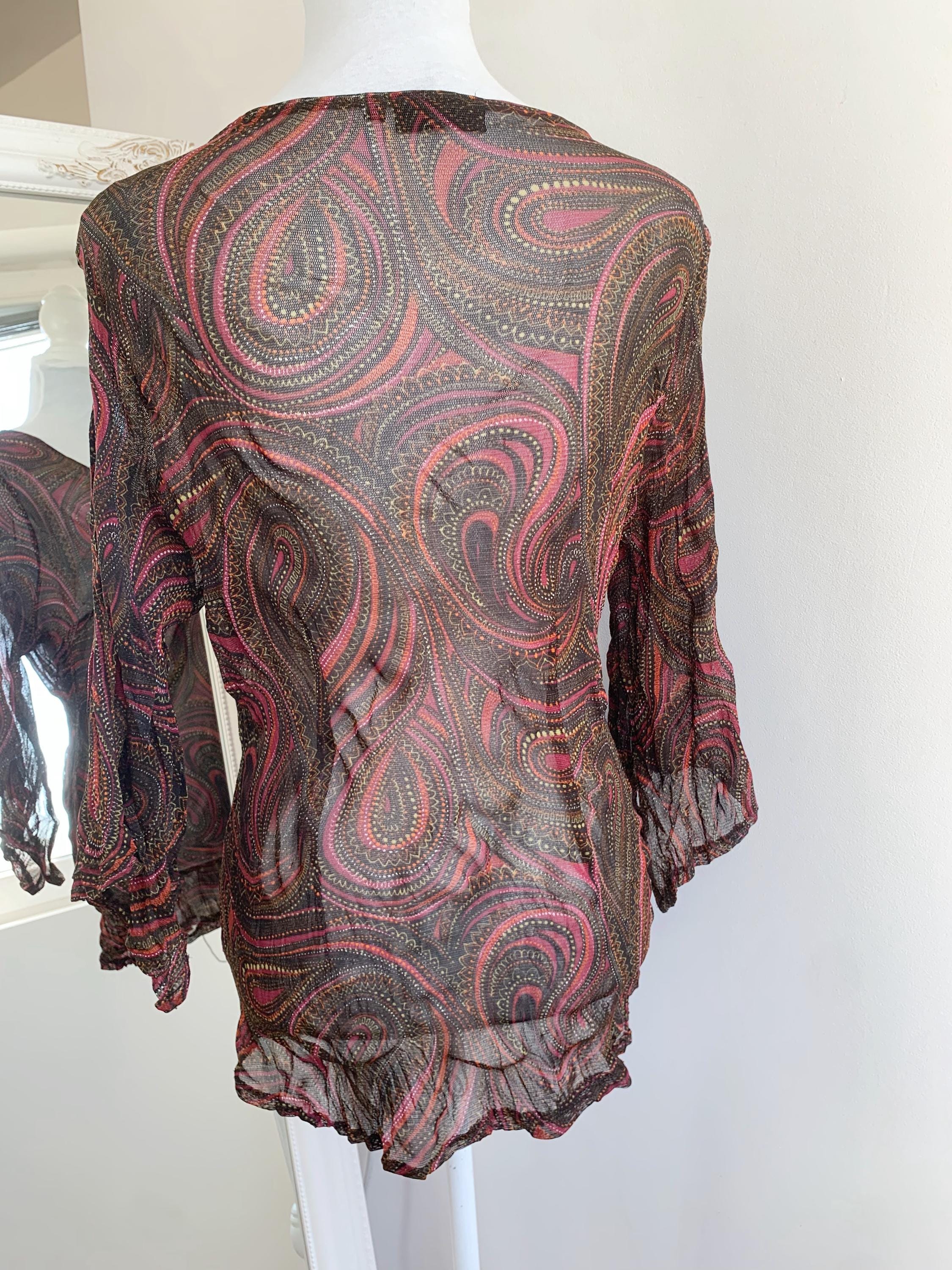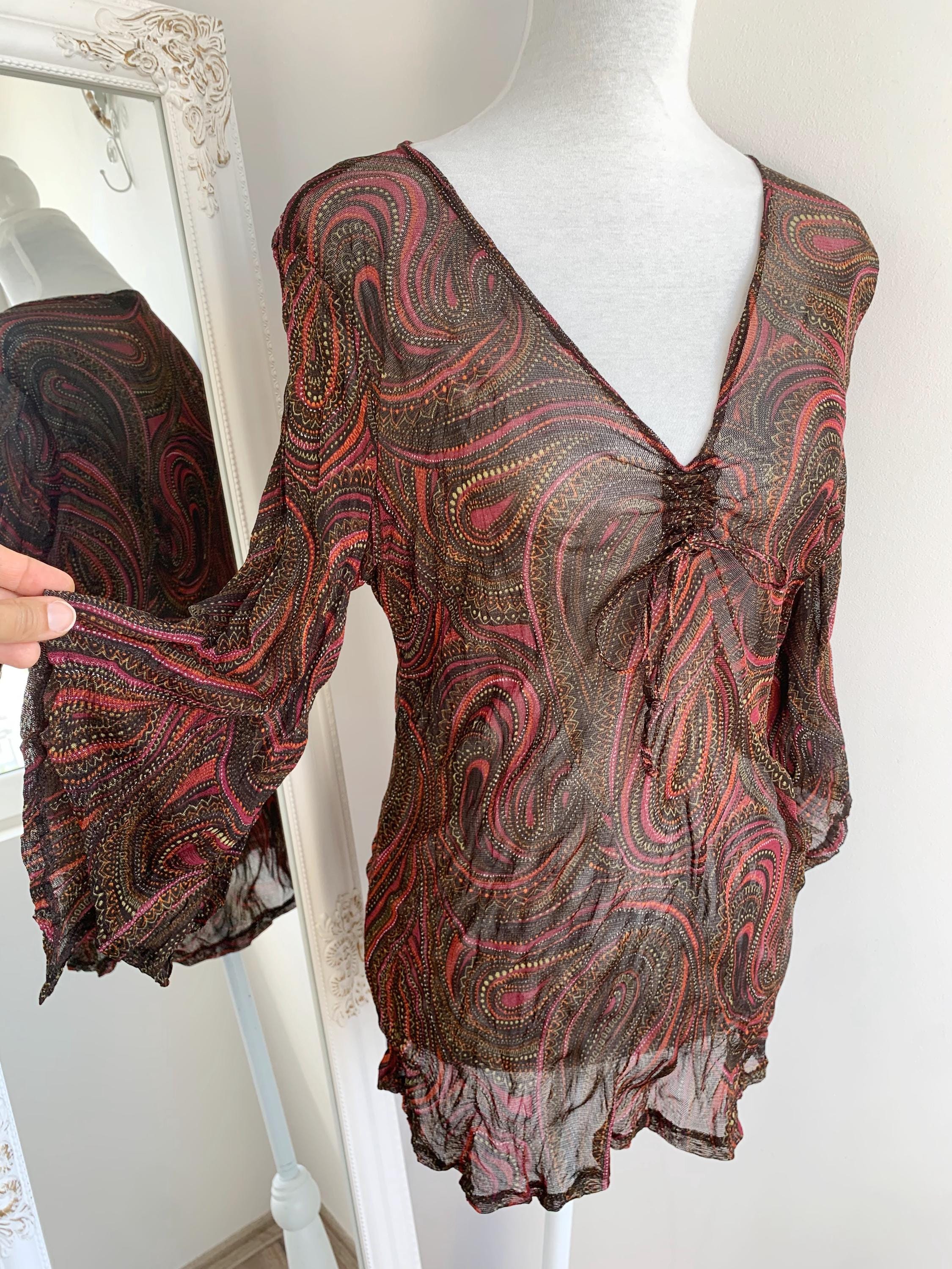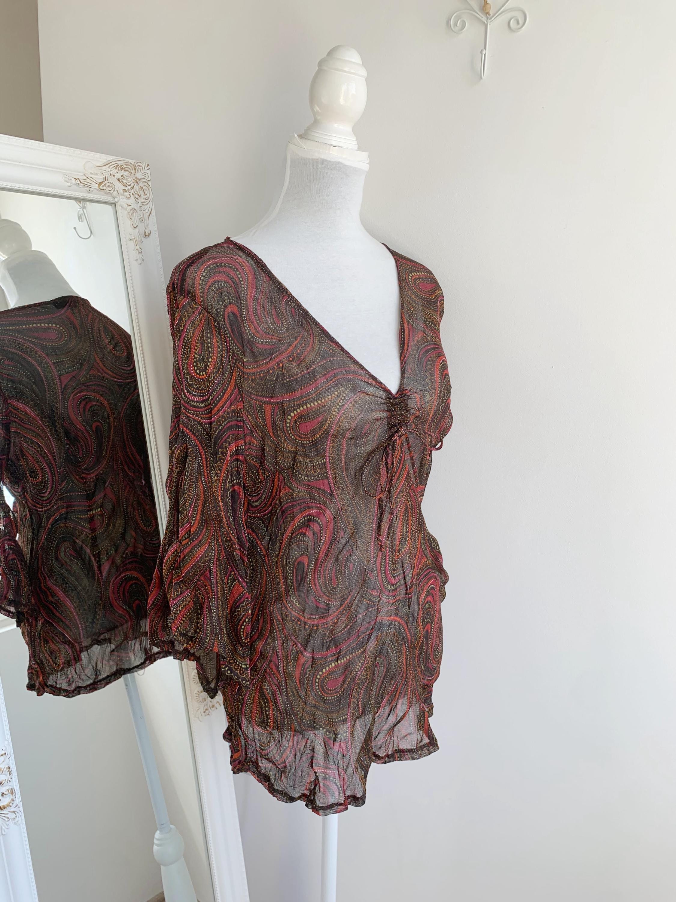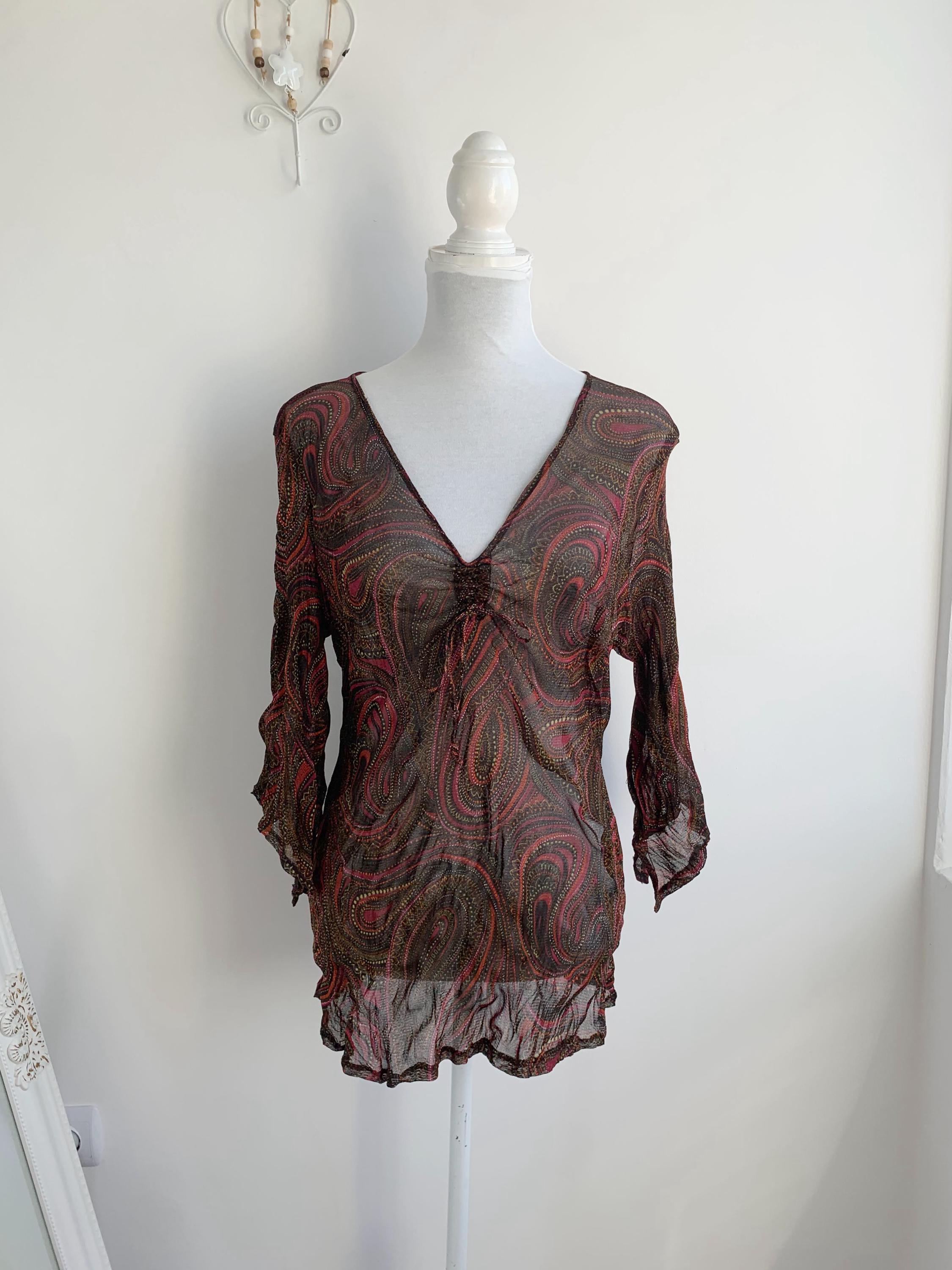 This is a gorgeous vintage Promiss paisley blouse in size L from the late 1990s or early 2000s. The brand "Promiss" is known for its stylish, modern designs, and this piece is a perfect example of their work from that era, featuring a quintessential paisley pattern. The sheer brown and red paisley fabric, with its bohemian flair, is very reminiscent of the Y2K and grunge styles that were popular at the time. The deep V-neck and ruched front add a lovely, flattering detail, while the subtle bell sleeves give it a relaxed, flowy feel. This top is incredibly versatile and can be dressed up for a night out or paired with jeans for a chic, casual look. It's a true statement piece for anyone who loves unique, high-quality vintage fashion.
