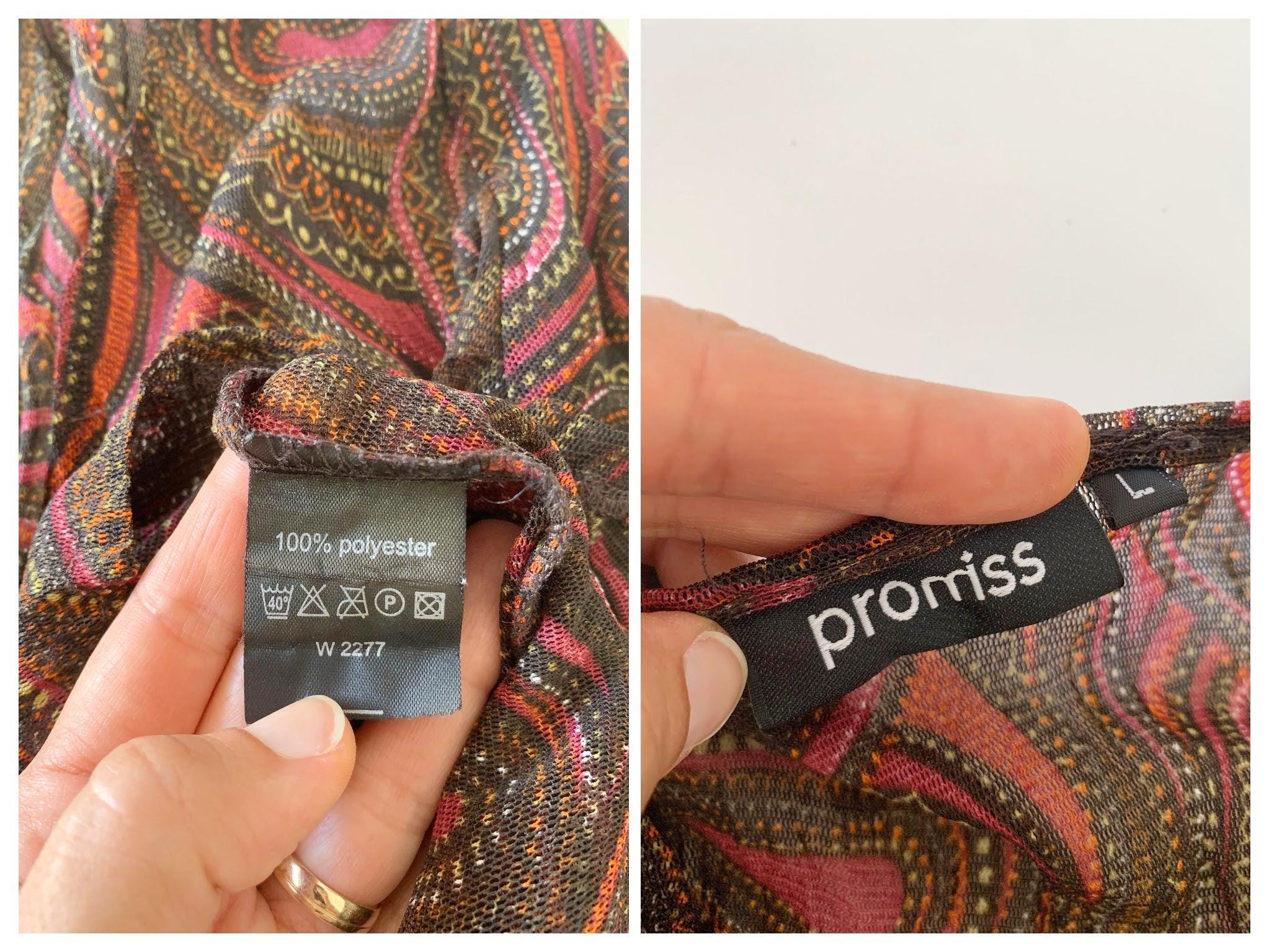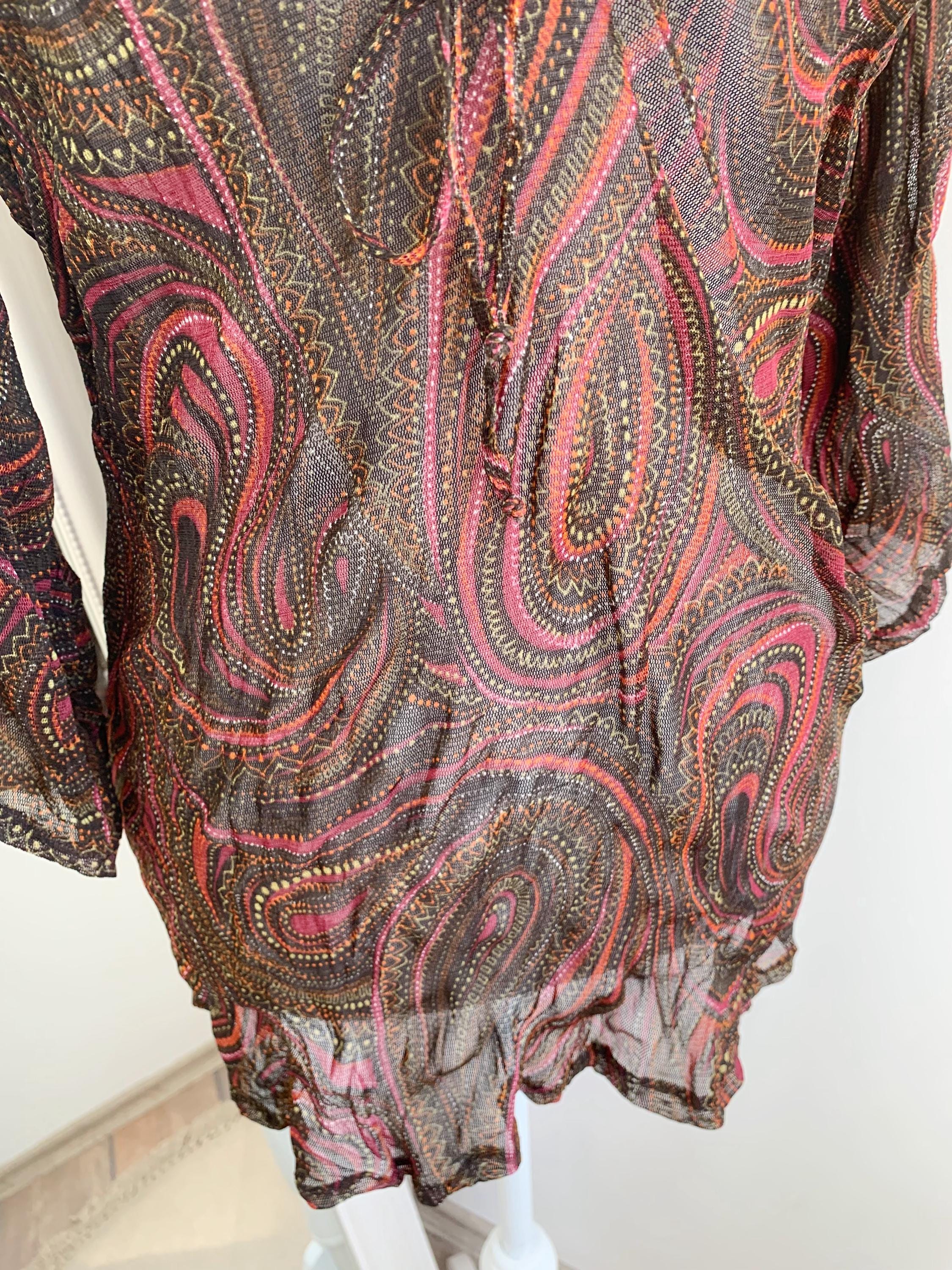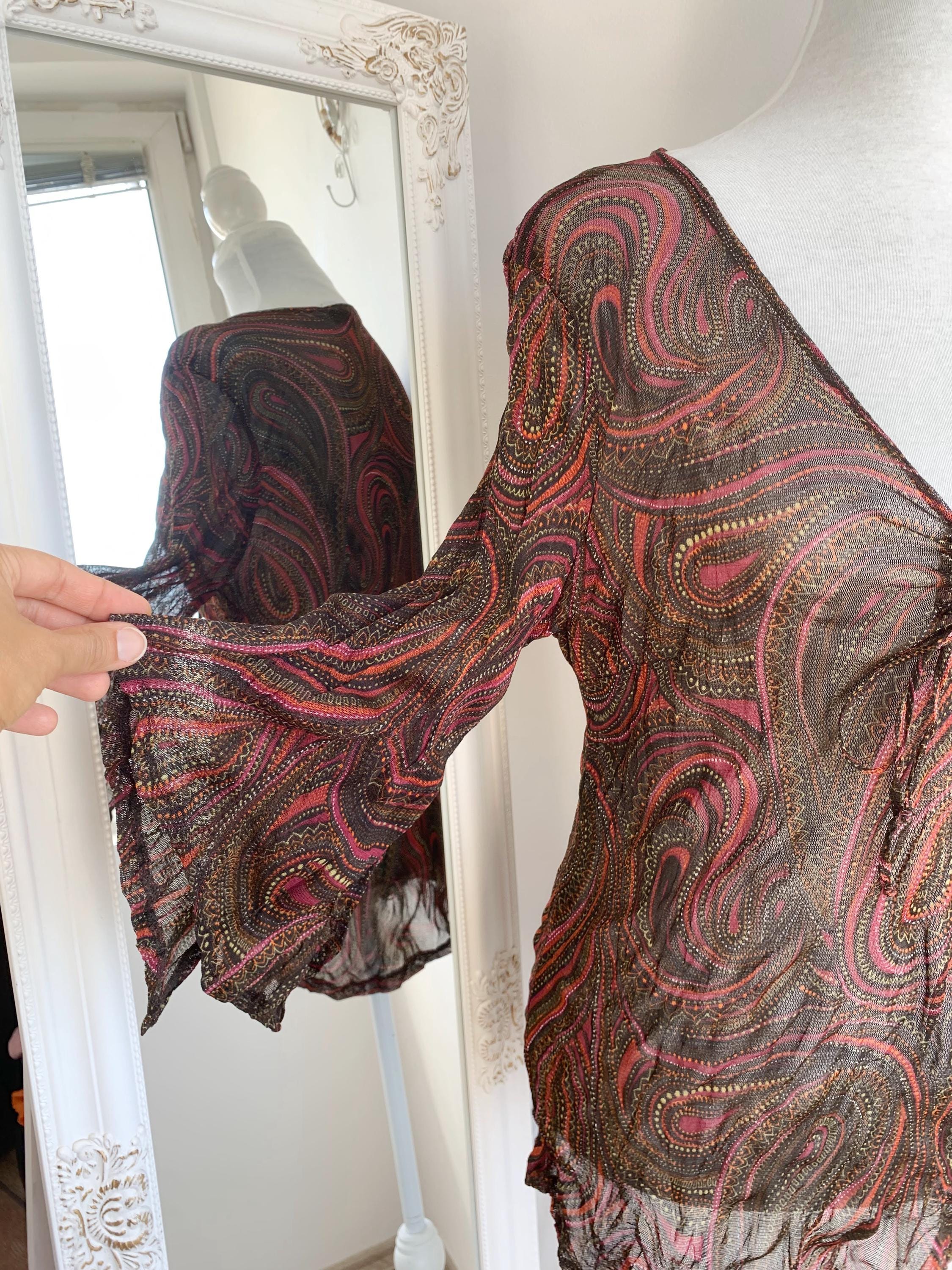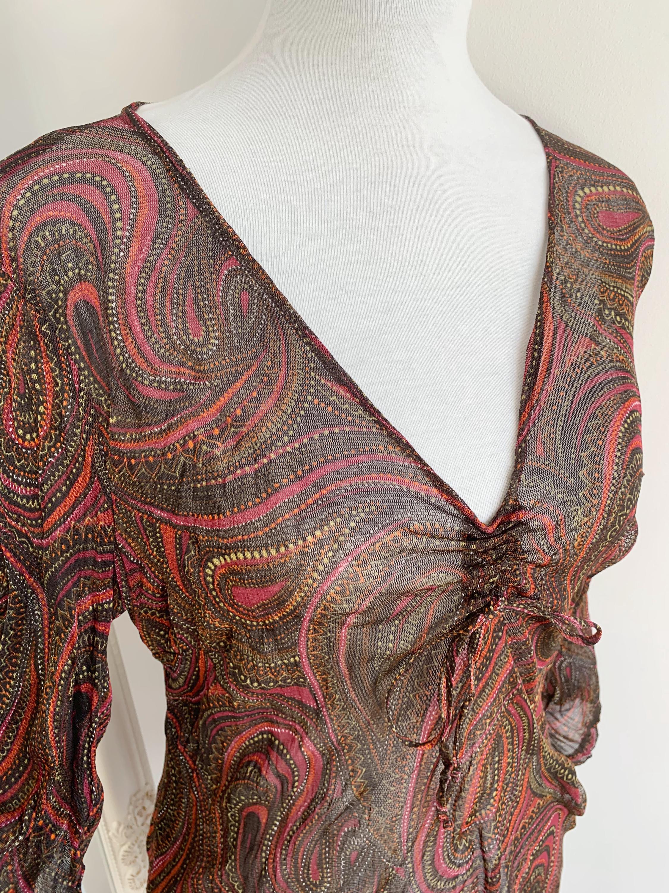 This is a gorgeous vintage Promiss paisley blouse in size L from the late 1990s or early 2000s. The brand "Promiss" is known for its stylish, modern designs, and this piece is a perfect example of their work from that era, featuring a quintessential paisley pattern. The sheer brown and red paisley fabric, with its bohemian flair, is very reminiscent of the Y2K and grunge styles that were popular at the time. The deep V-neck and ruched front add a lovely, flattering detail, while the subtle bell sleeves give it a relaxed, flowy feel. This top is incredibly versatile and can be dressed up for a night out or paired with jeans for a chic, casual look. It's a true statement piece for anyone who loves unique, high-quality vintage fashion.