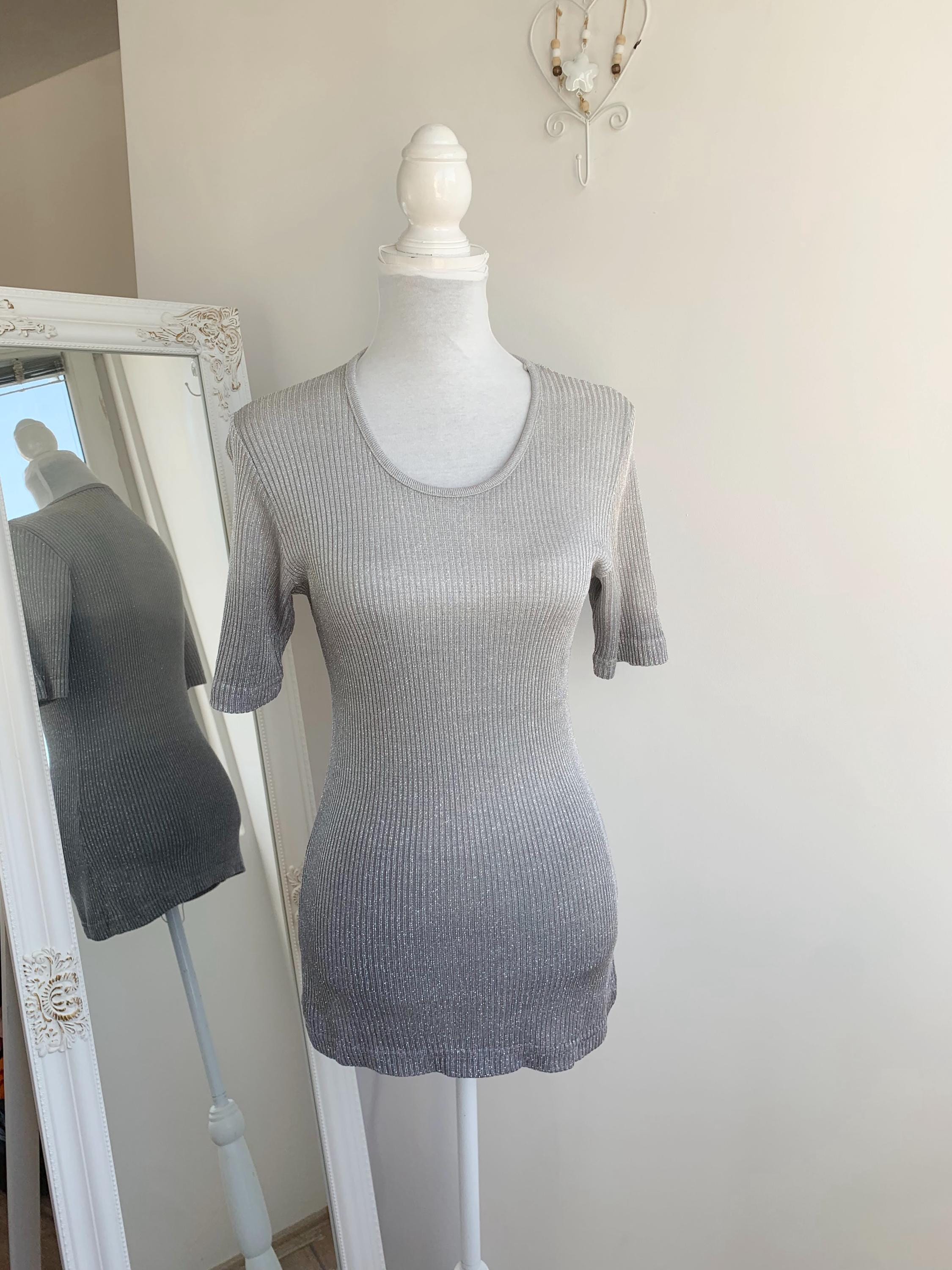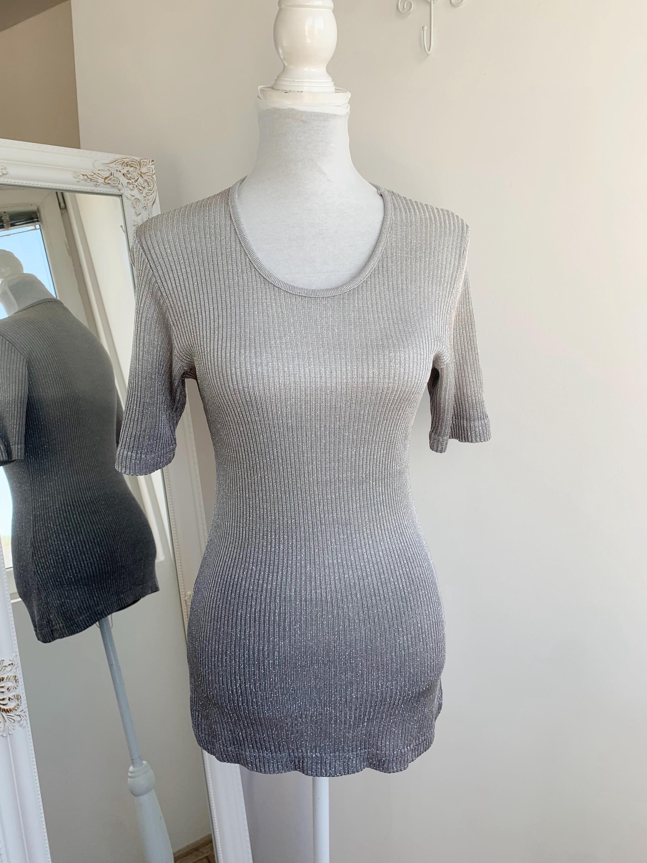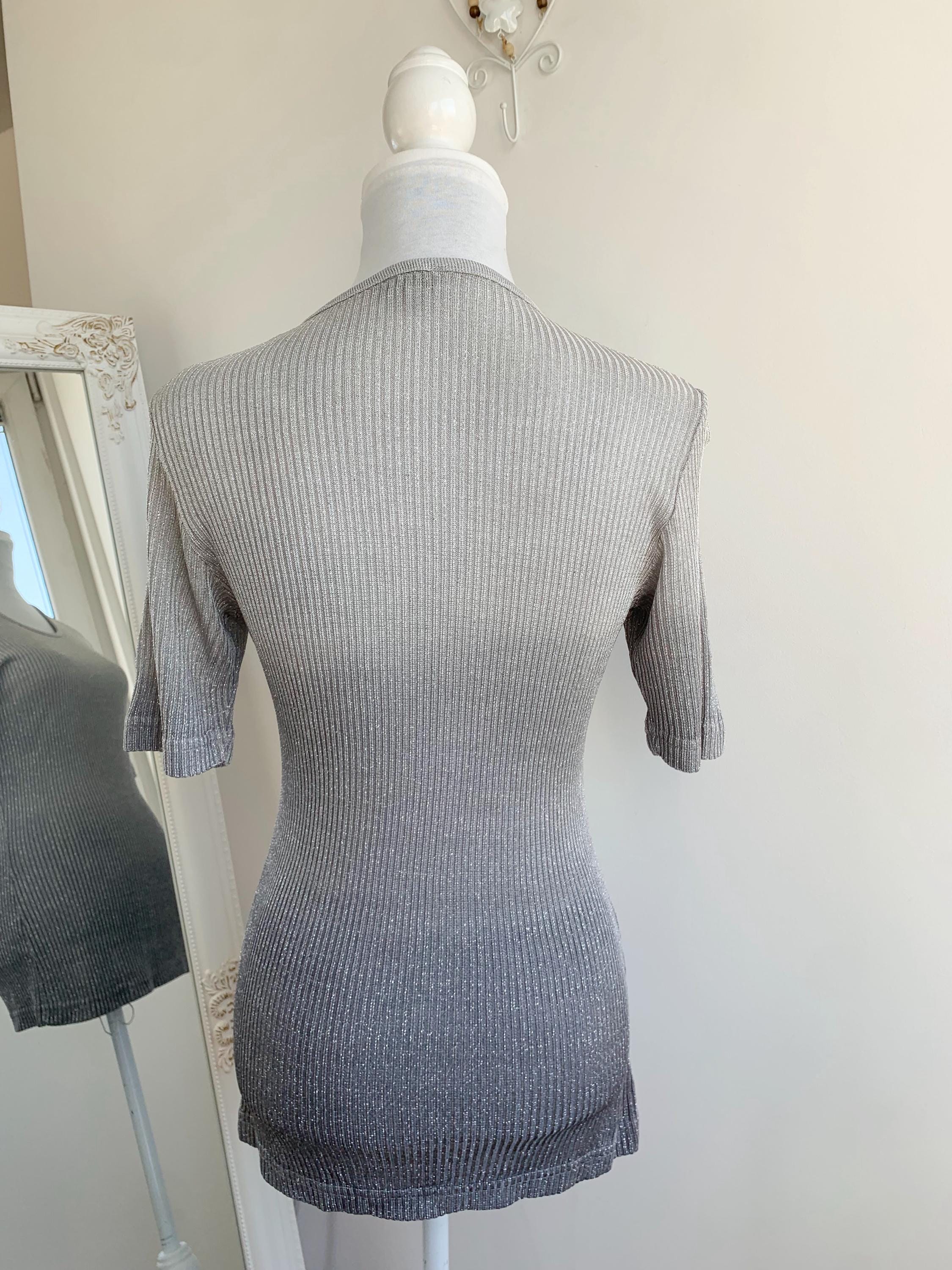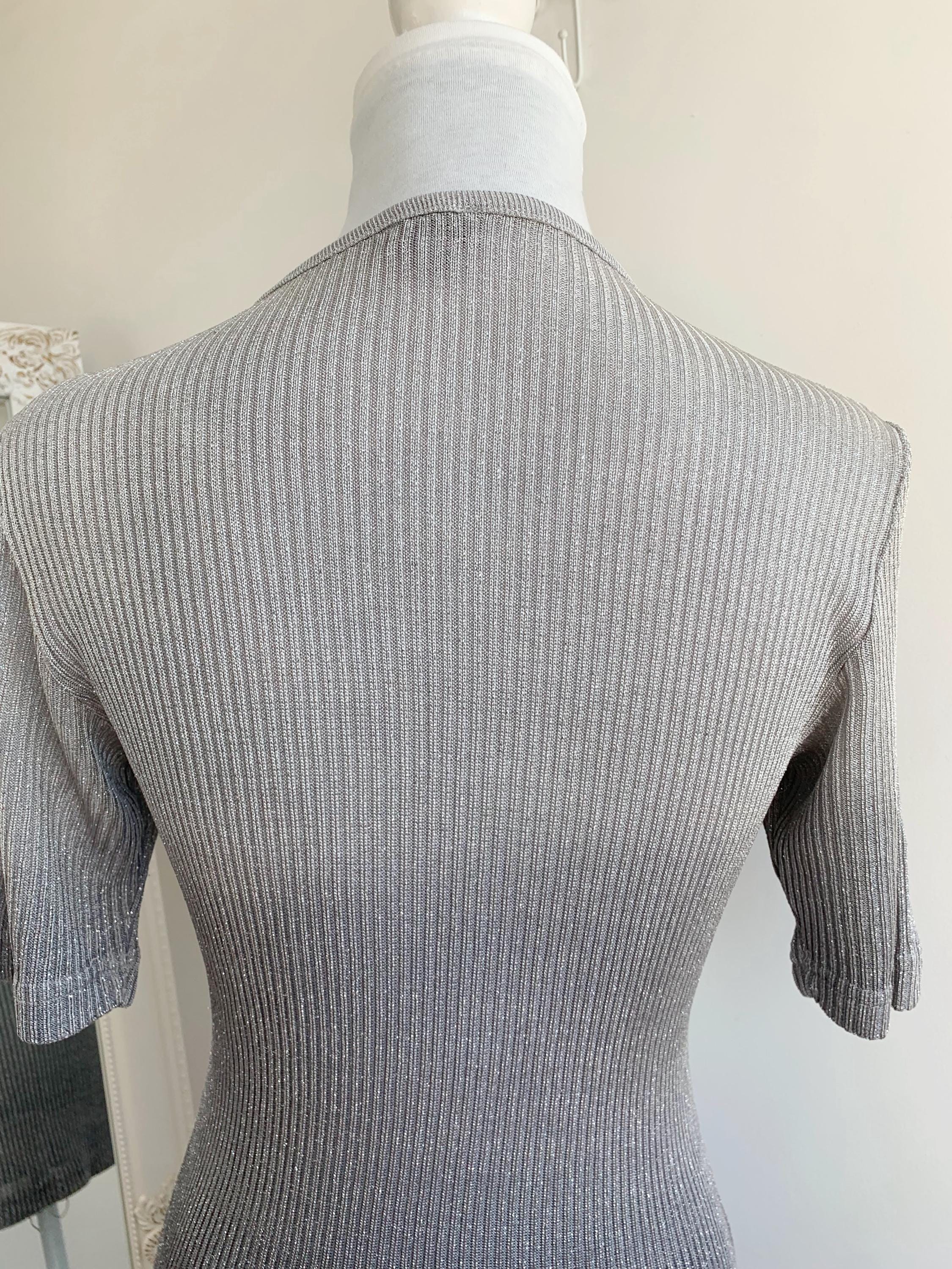 Step into the spotlight with this stunning and versatile vintage lurex top from the 90s. This silver glitted sleeveless sweater is a beautiful example of timeless glam. The ribbed knit fabric features a unique blend of viscose and metallic lurex thread, giving it a subtle yet captivating shimmer. The silver grey hue catches the light beautifully, making it perfect for a night out, a special occasion, or simply to add a touch of sparkle to your everyday style. This ombre shimmer top has a comfortable, body-hugging fit with plenty of stretch, adapting to your silhouette for a flattering and elegant look. It's a true statement piece that effortlessly combines retro charm with modern appeal.