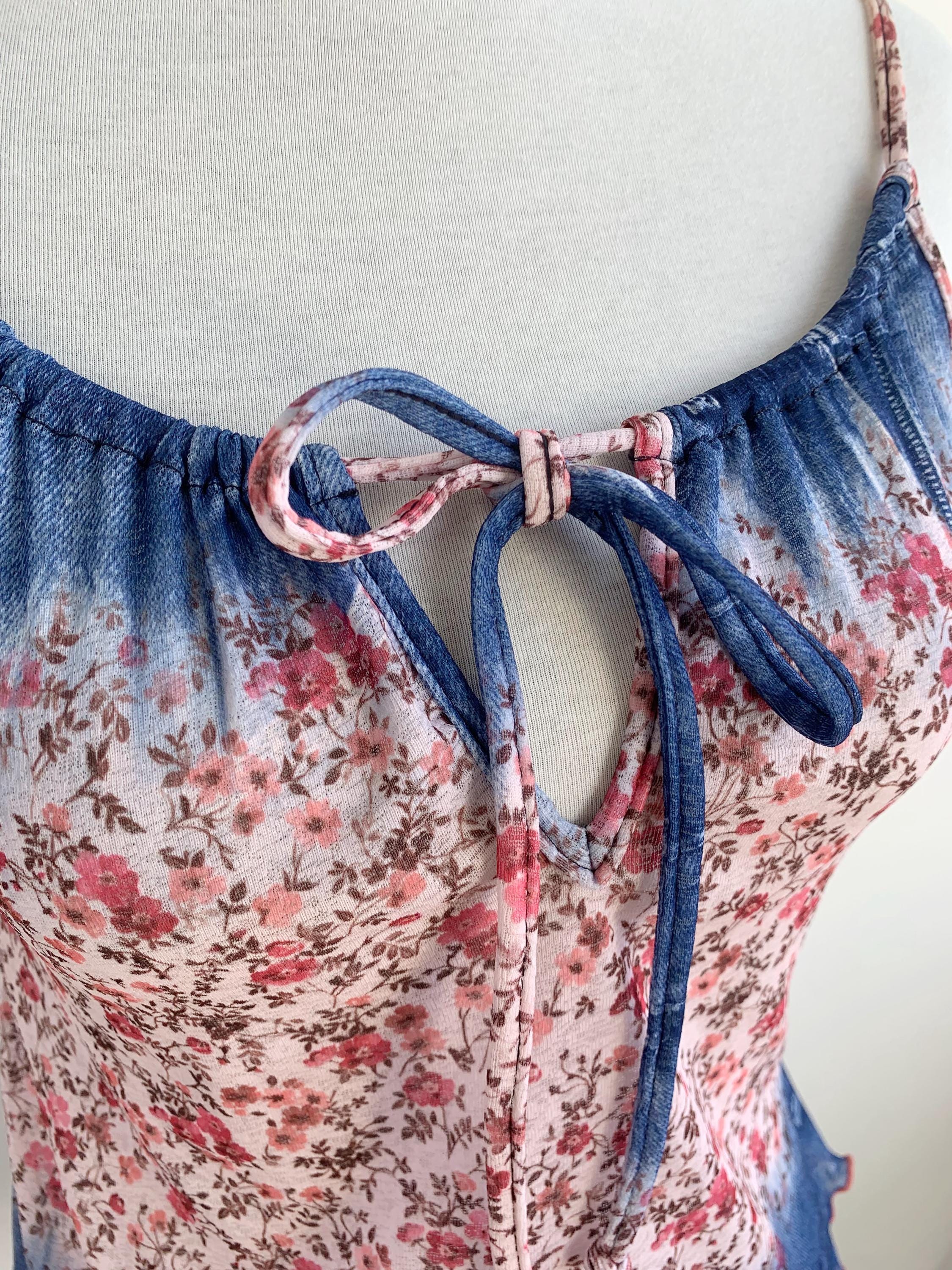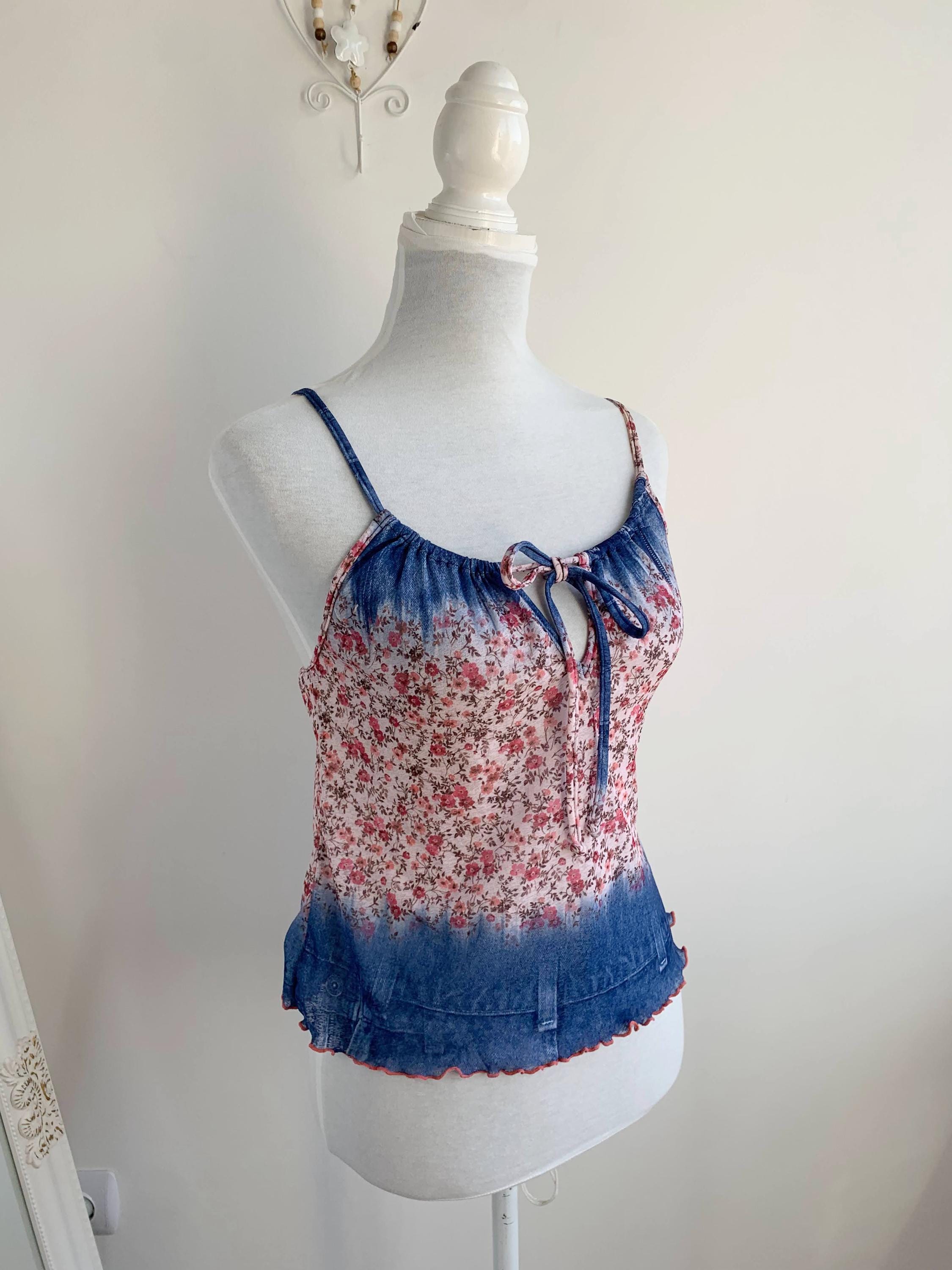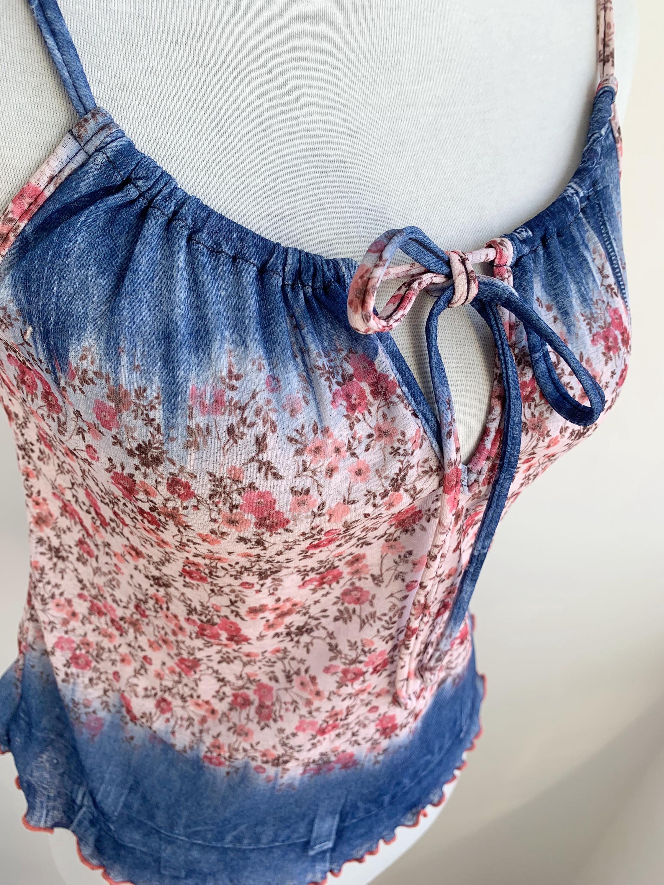 Step back into the early 2000s with this stunning and unique vintage Y2K cami top by Avec Plaisir. This isn't just a tank top, it's a nostalgic piece that perfectly captures the "fairycore" and "coquette" aesthetics that are so popular today. The top features a whimsical all-over floral pattern with denim-like print, creating a charming contrast. The neckline of the top is gathered by drawstring detailing. This Y2K top is incredibly stretchy, offering a comfortable and flattering fit that hugs the body. The thin spaghetti straps are adjustable, allowing for a personalized fit. This vintage camisole is a versatile statement piece that can be layered or worn on its own for a standout look. It's in excellent vintage condition, showing no signs of wear and ready to be the star of your wardrobe.