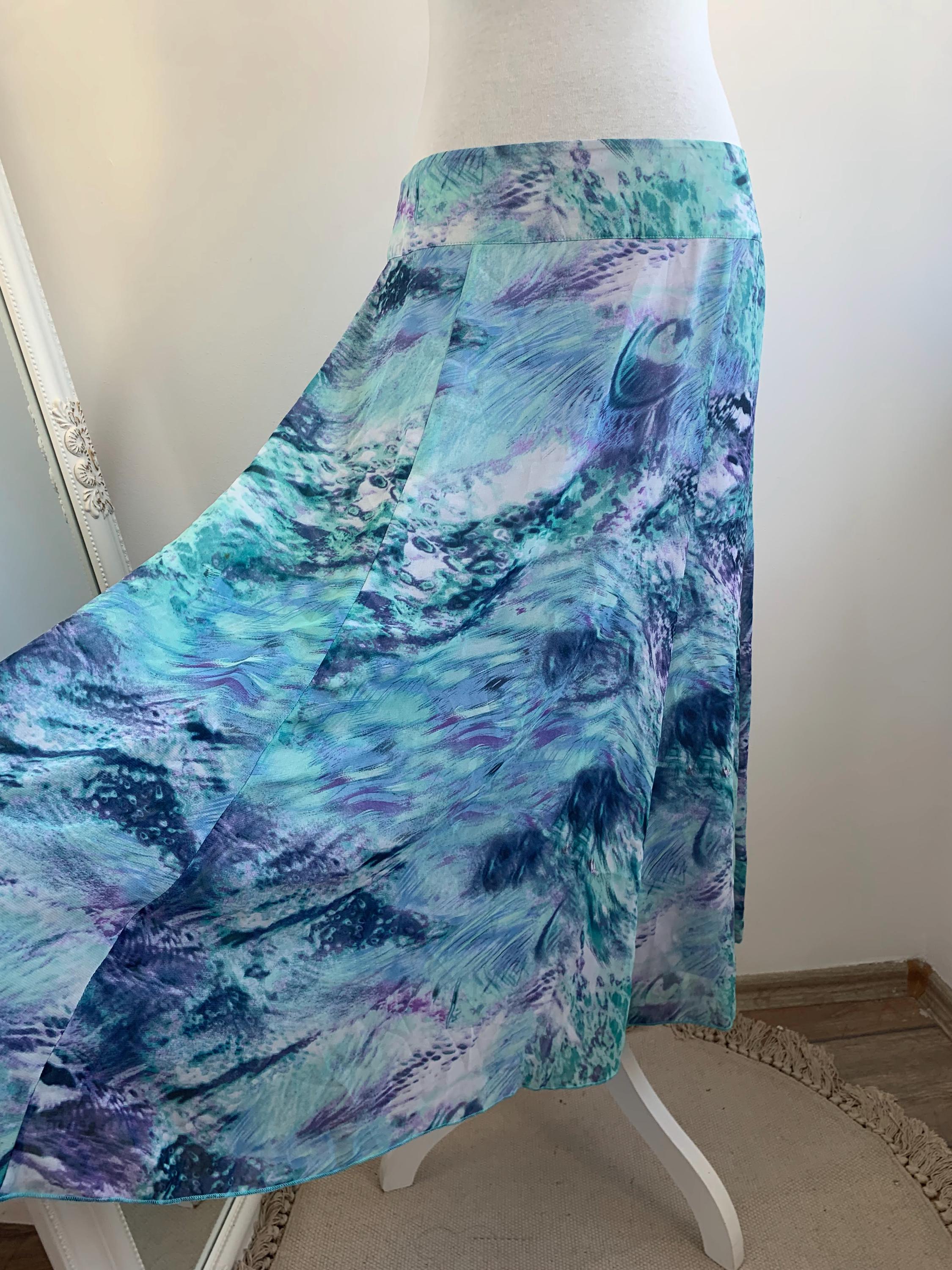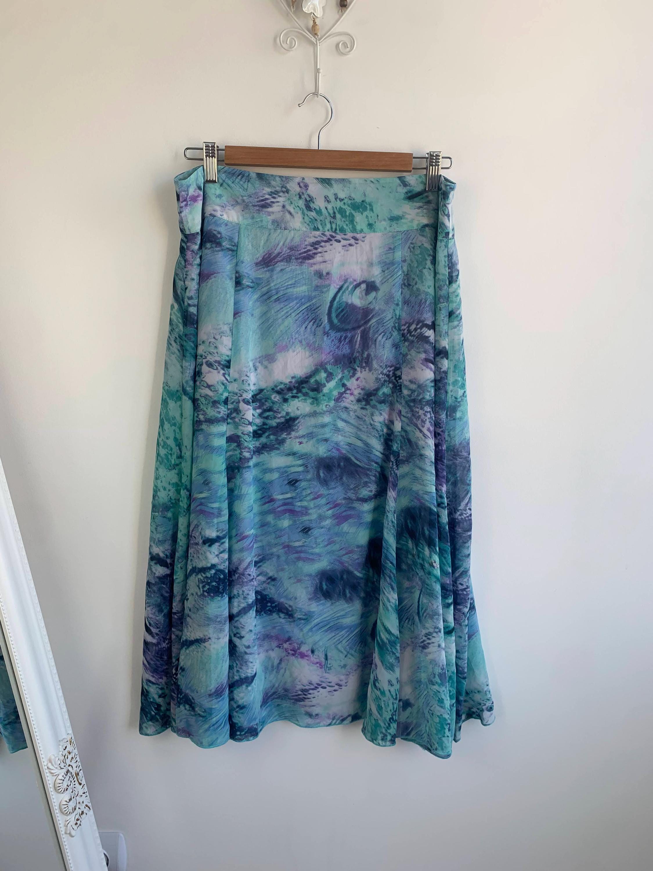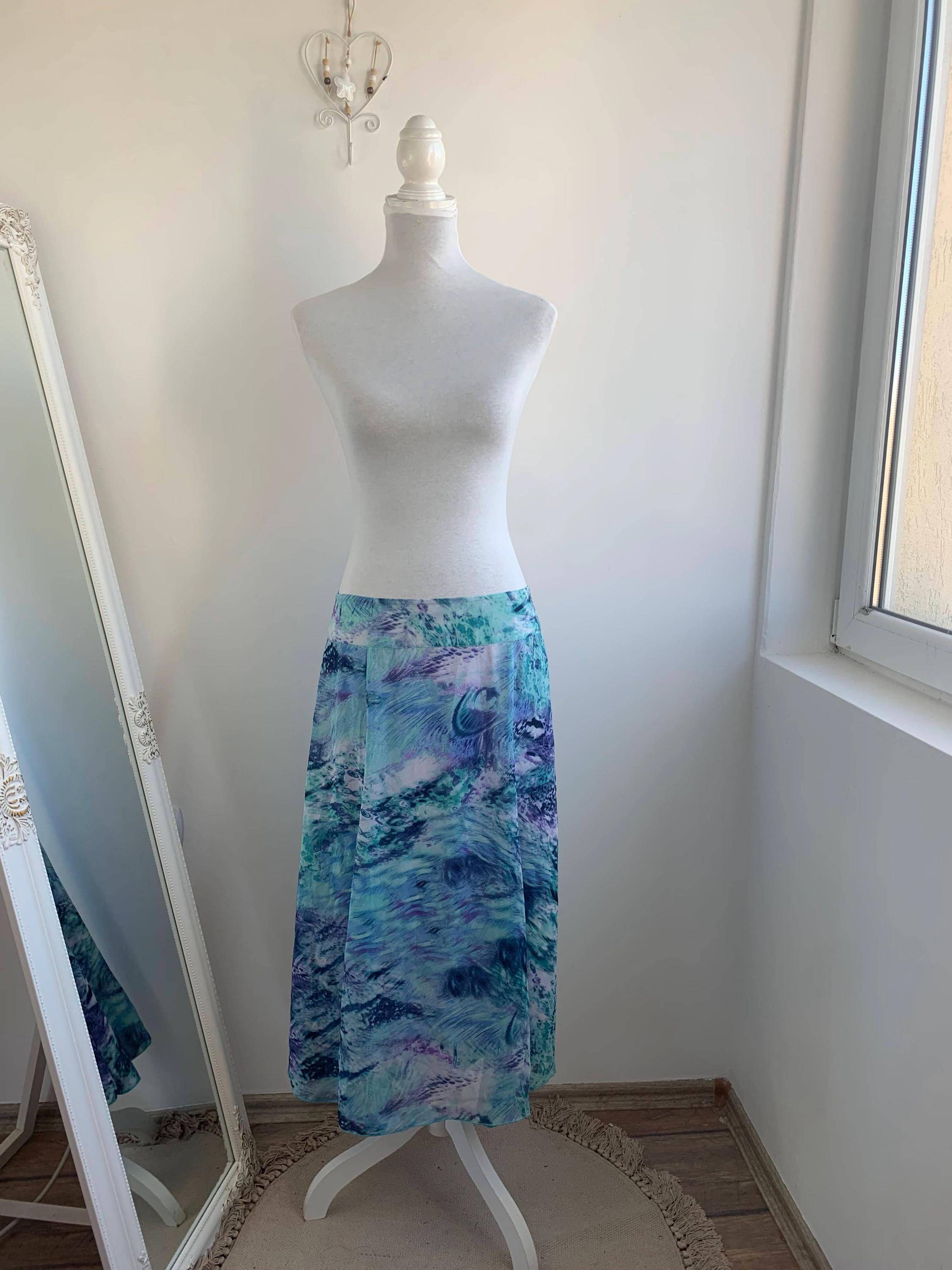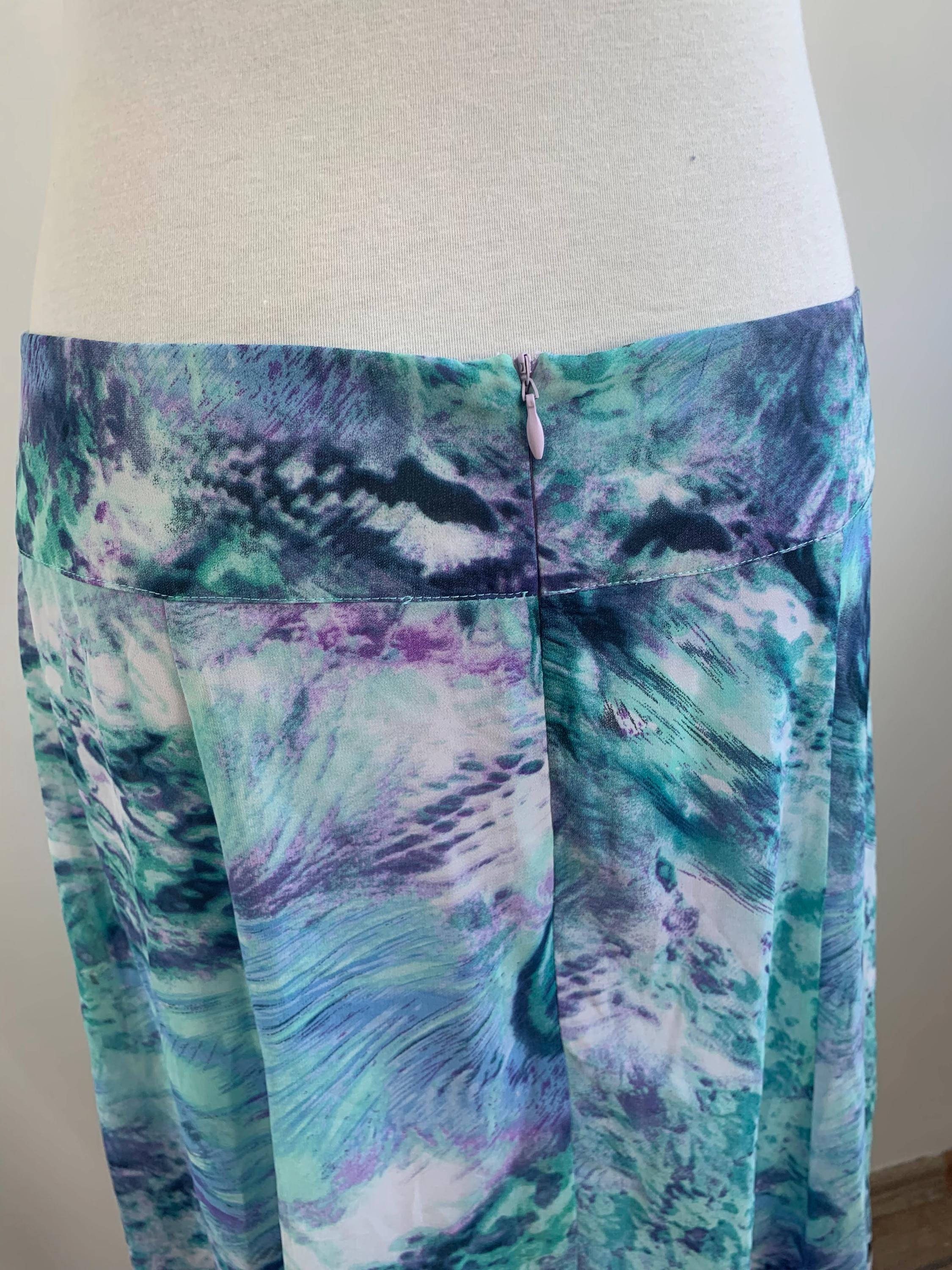 Transport your wardrobe back to the vibrant, carefree days of the early Y2K with this stunning vintage midi skirt. From the brand Andrea, this skirt features a mesmerizing all-over abstract art print that feels like a wearable masterpiece. The print, a swirl of deep blues, emerald greens, vibrant purples, and touches of navy and white, is both bold and beautifully fluid. Its lightweight, flowy polyester fabric drapes perfectly, creating a graceful, A-line silhouette that moves with you. The comfortable waist and a back zipper ensure a perfect fit.