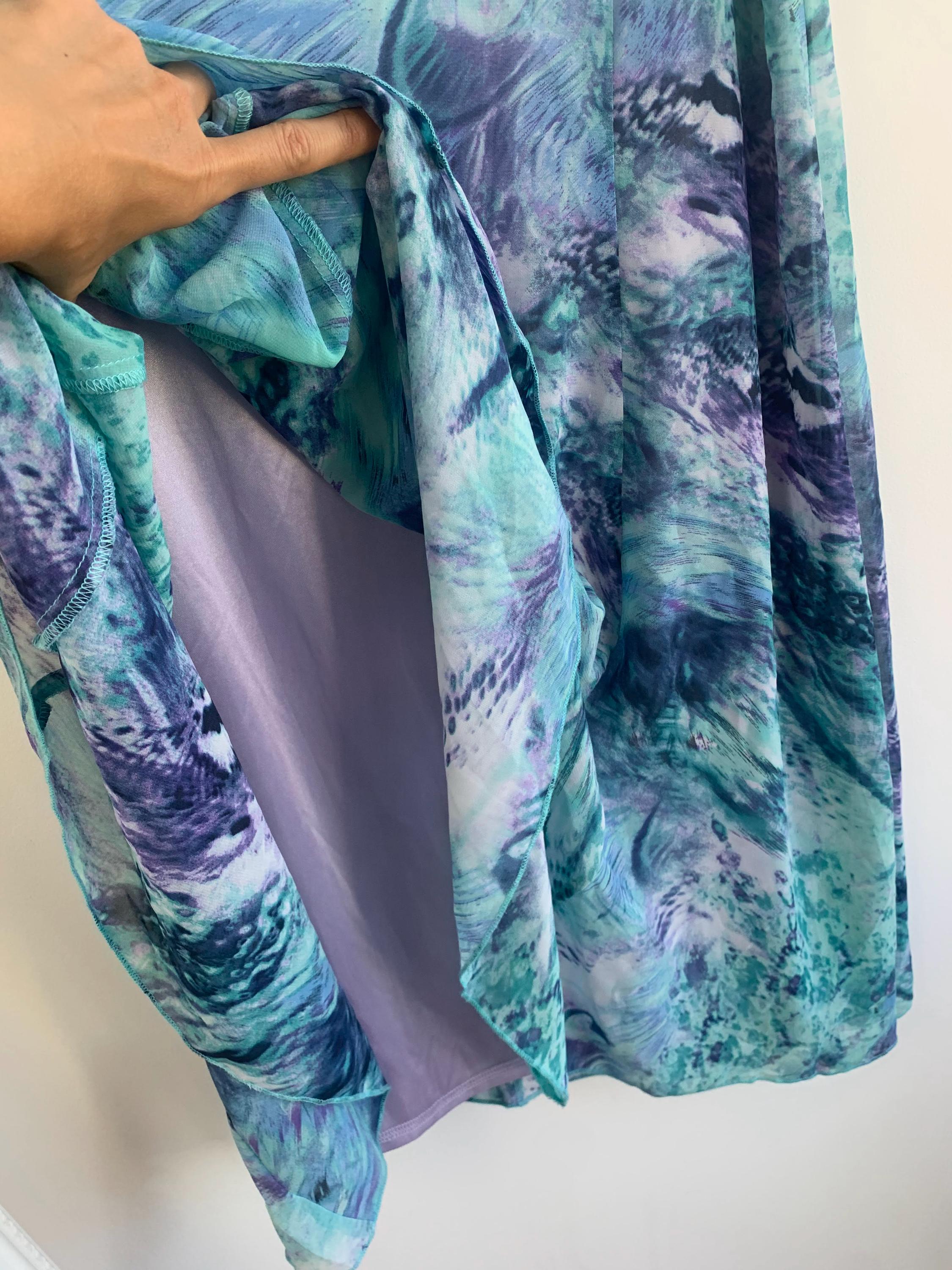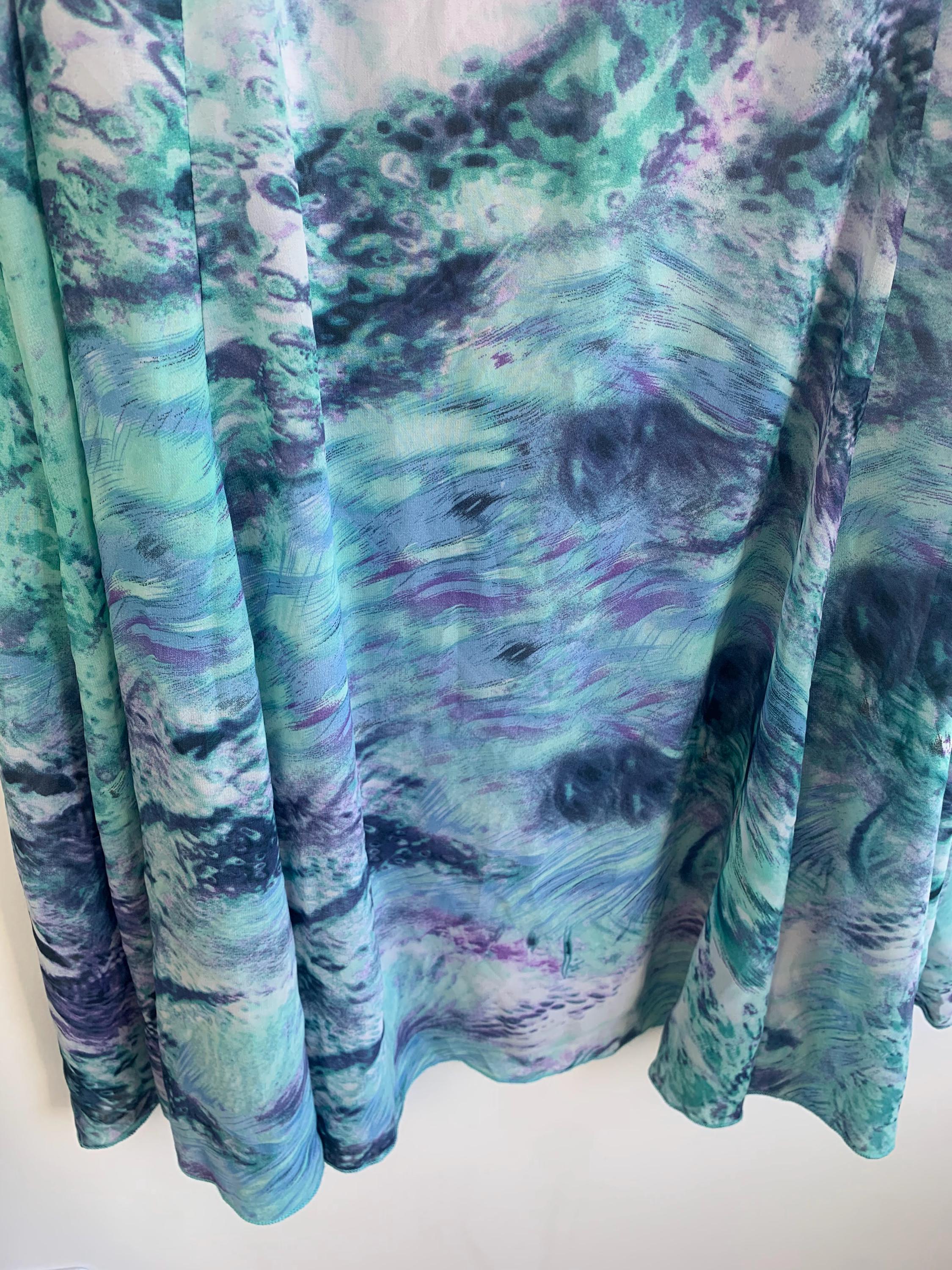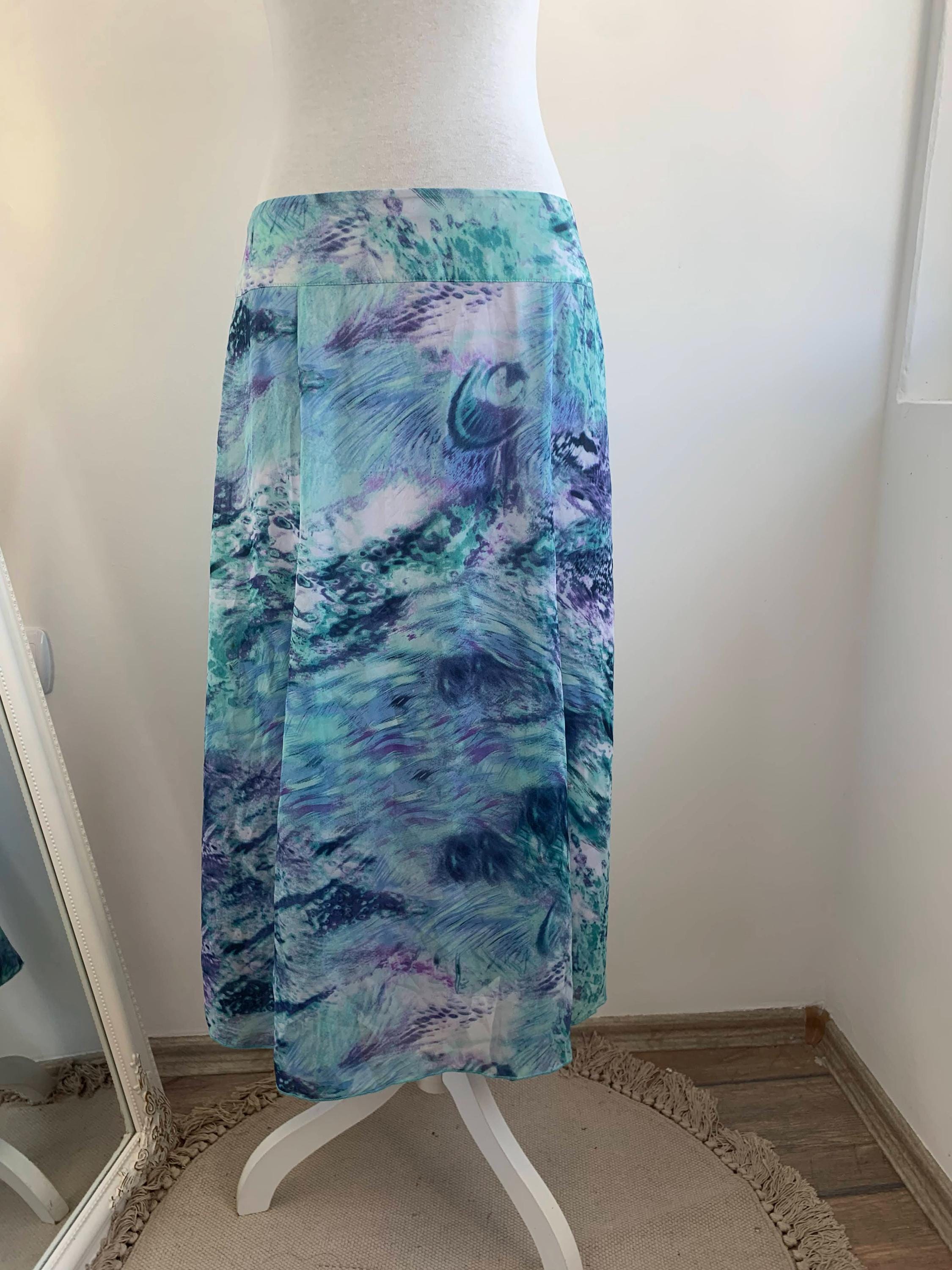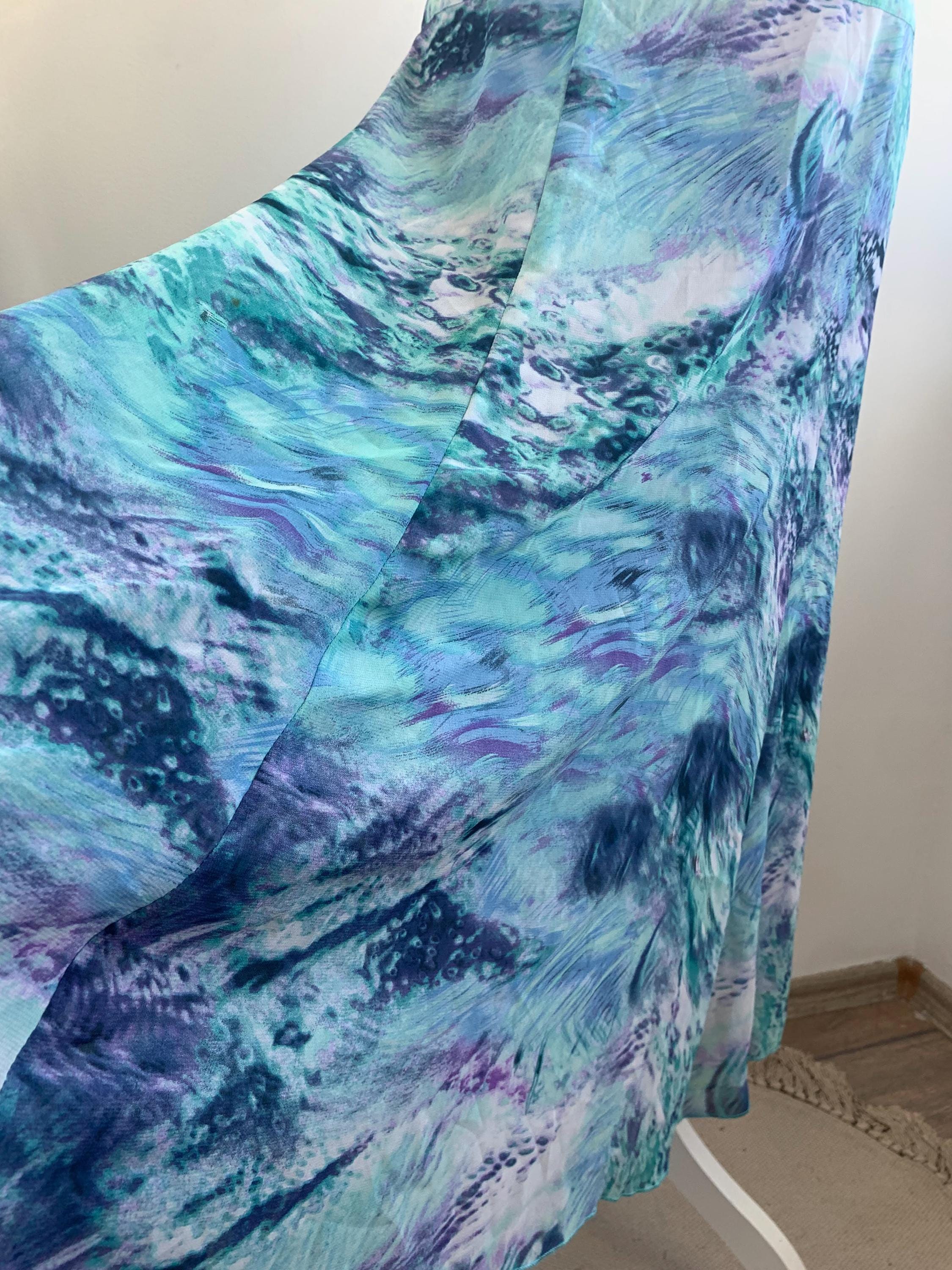 Transport your wardrobe back to the vibrant, carefree days of the early Y2K with this stunning vintage midi skirt. From the brand Andrea, this skirt features a mesmerizing all-over abstract art print that feels like a wearable masterpiece. The print, a swirl of deep blues, emerald greens, vibrant purples, and touches of navy and white, is both bold and beautifully fluid. Its lightweight, flowy polyester fabric drapes perfectly, creating a graceful, A-line silhouette that moves with you. The comfortable waist and a back zipper ensure a perfect fit.