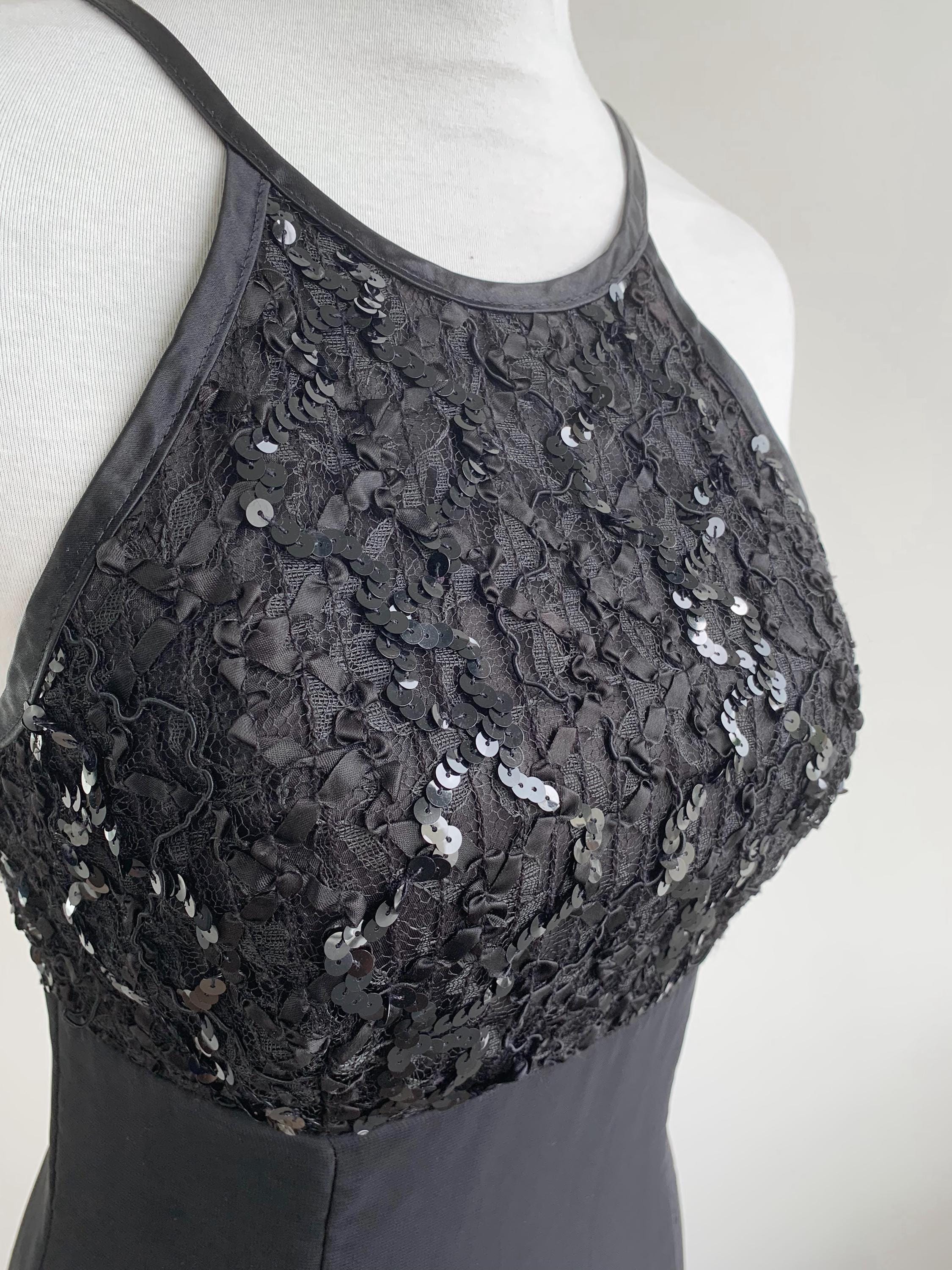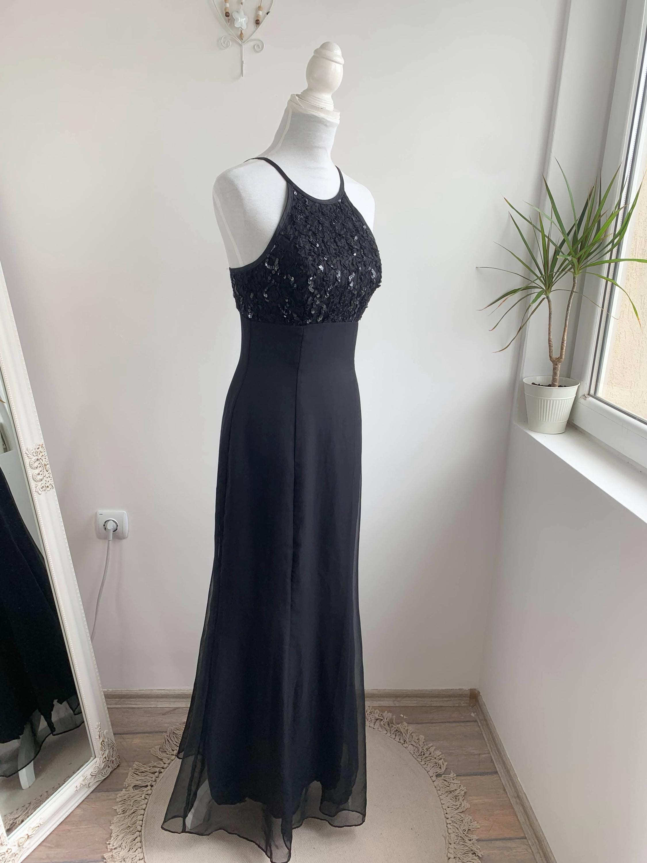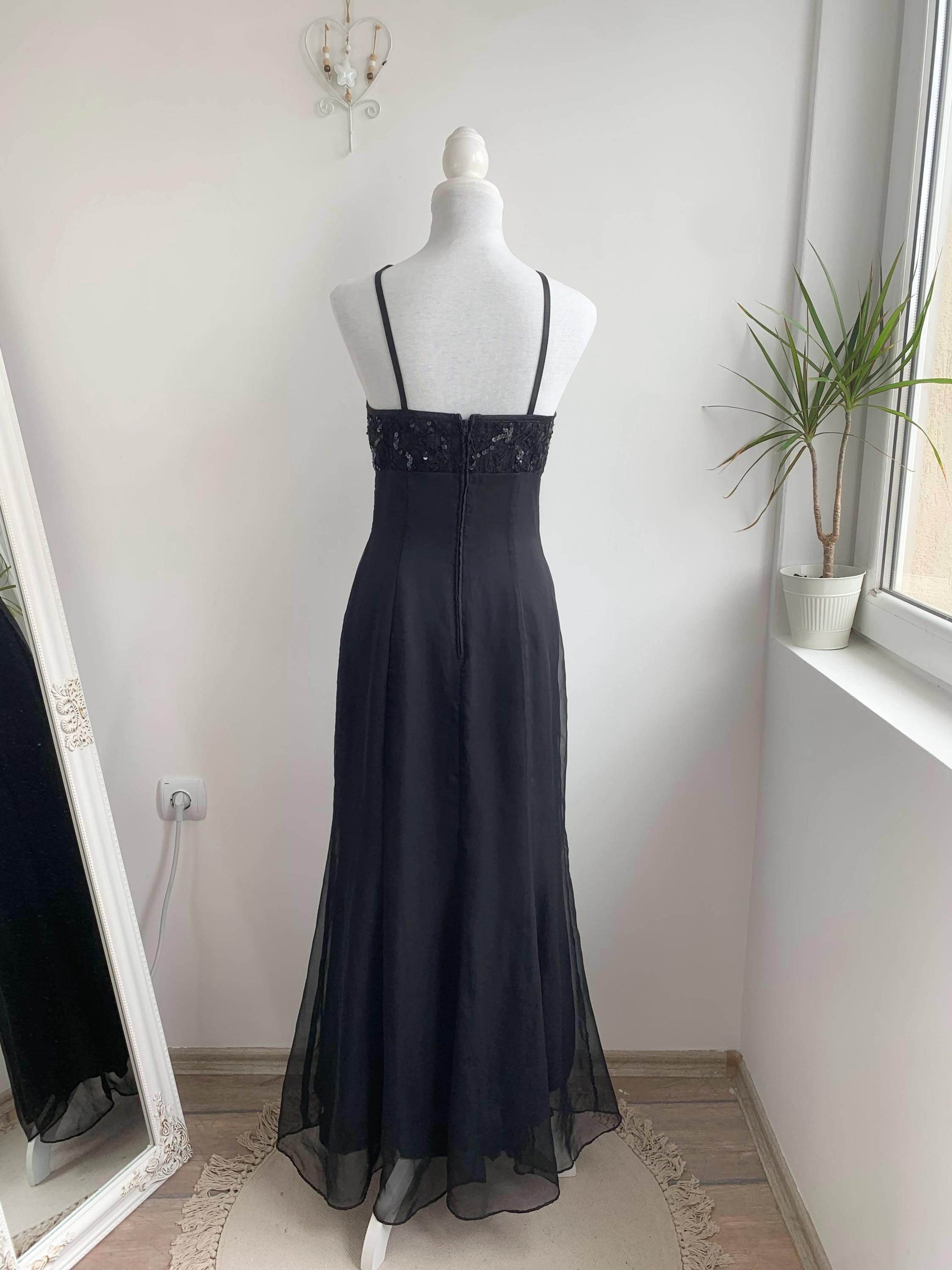 This stunning vintage De-Laru by Linda Bernell long black gown is a true showstopper from the 90s. The stylish halter neckline and sequin beaded top part create a captivating silhouette, while the sheer tulle fabric floats with every movement. The fitted bodice is subtly structured to enhance the figure, flowing into a long, dramatic maxi skirt. Perfect for a prom, formal event, or a special evening out, this elegant dress embodies the classic, slightly edgy glamour of the 90s era and would make an incredible addition to any vintage lover's collection.