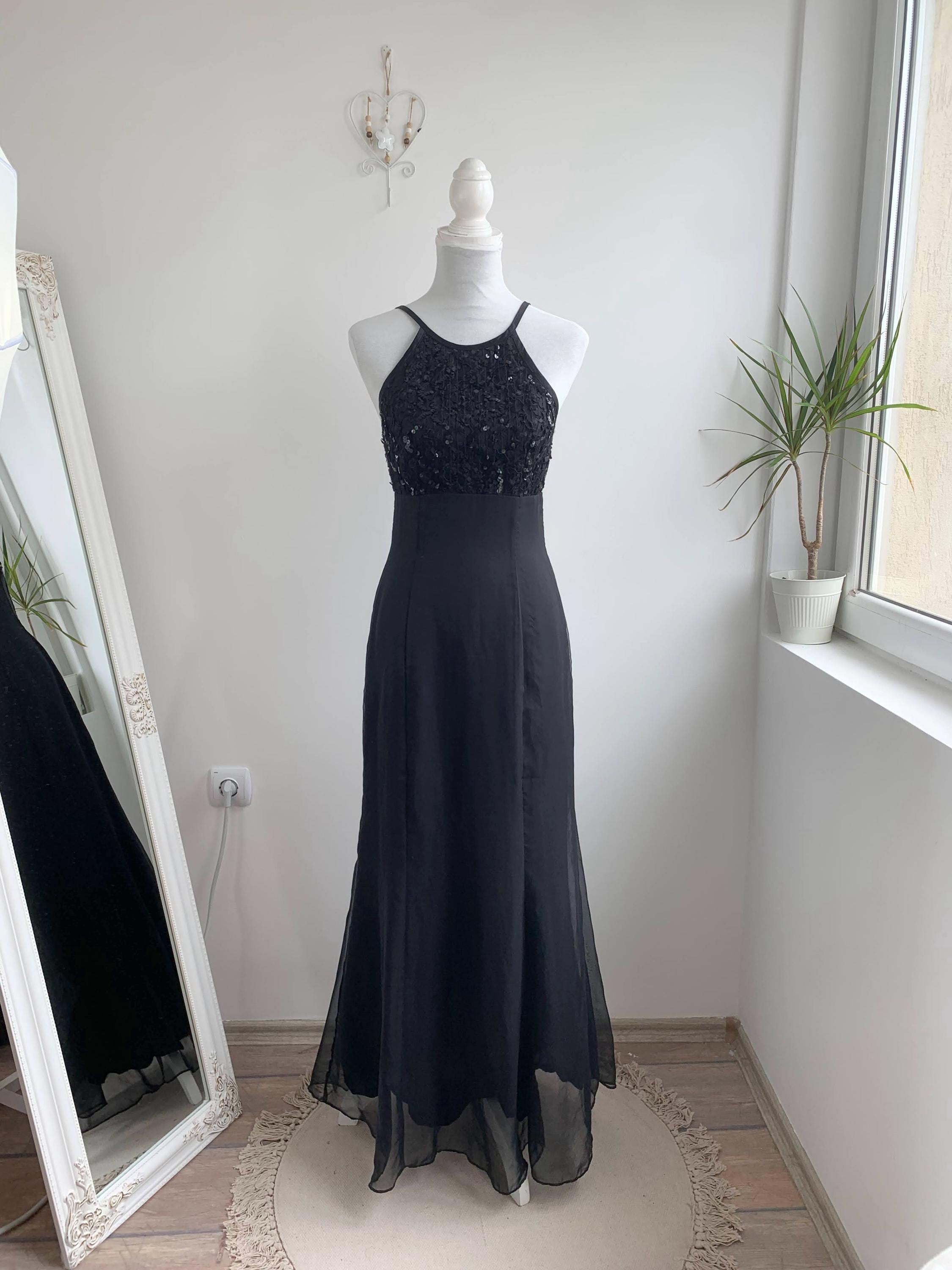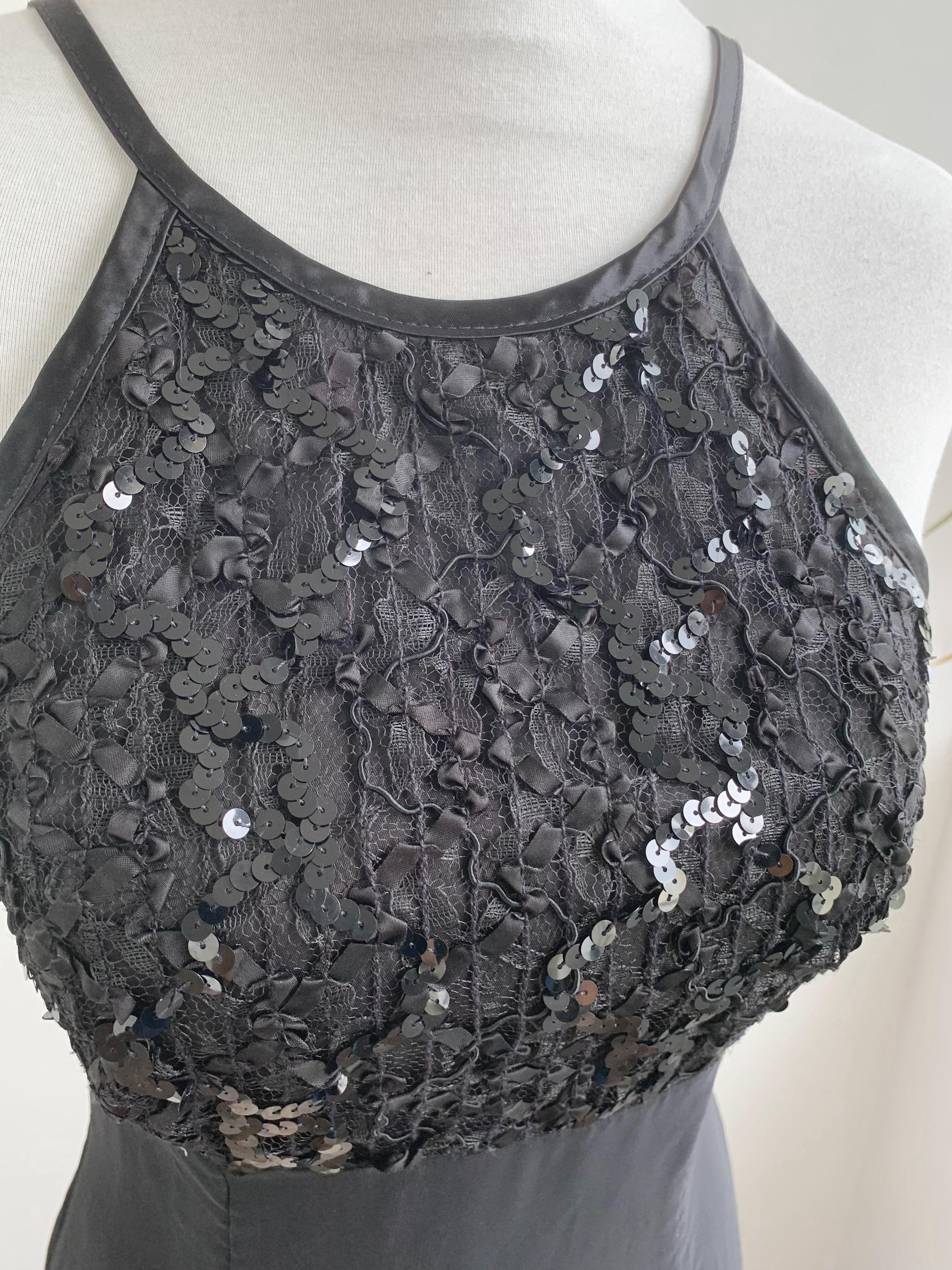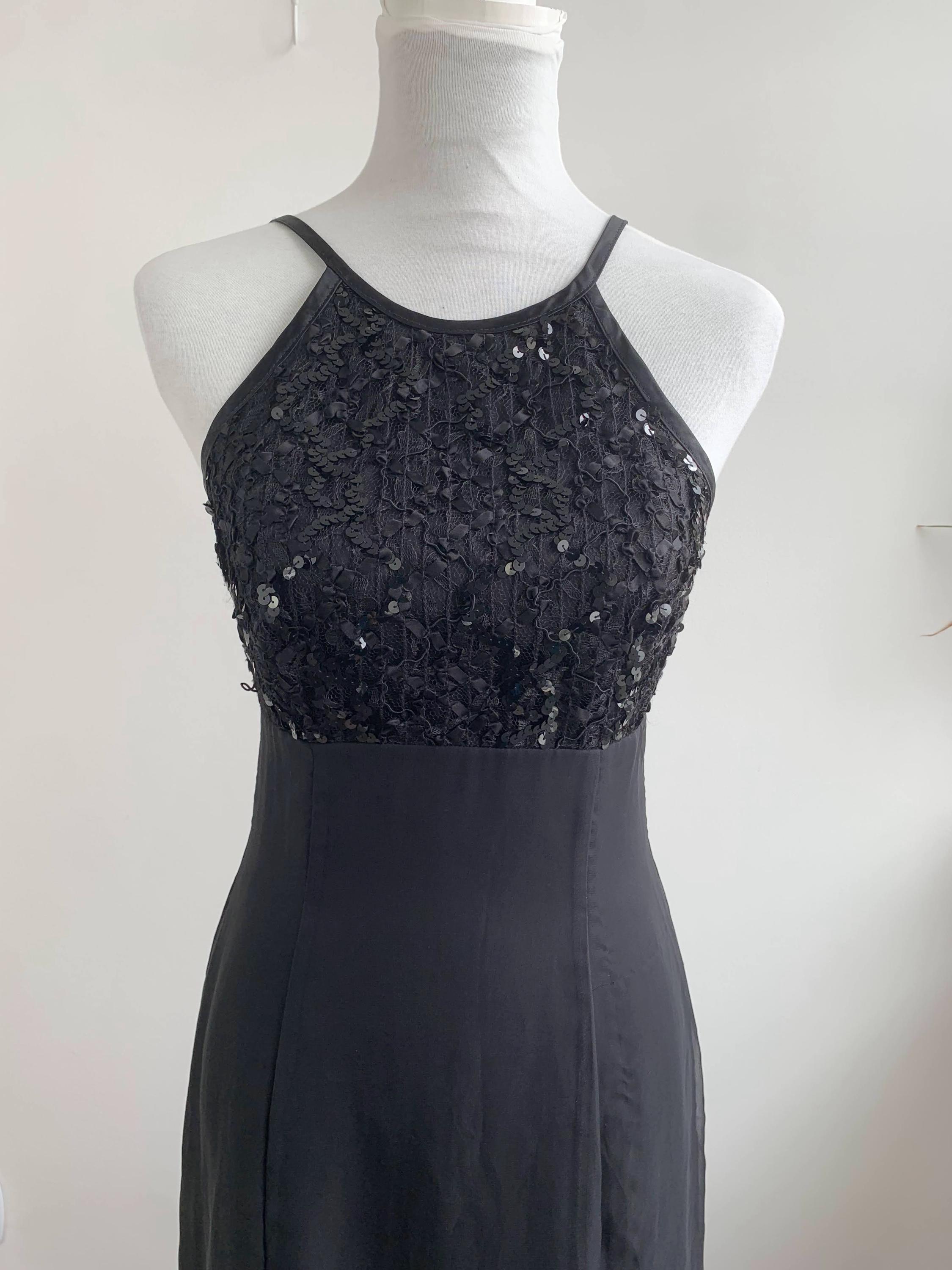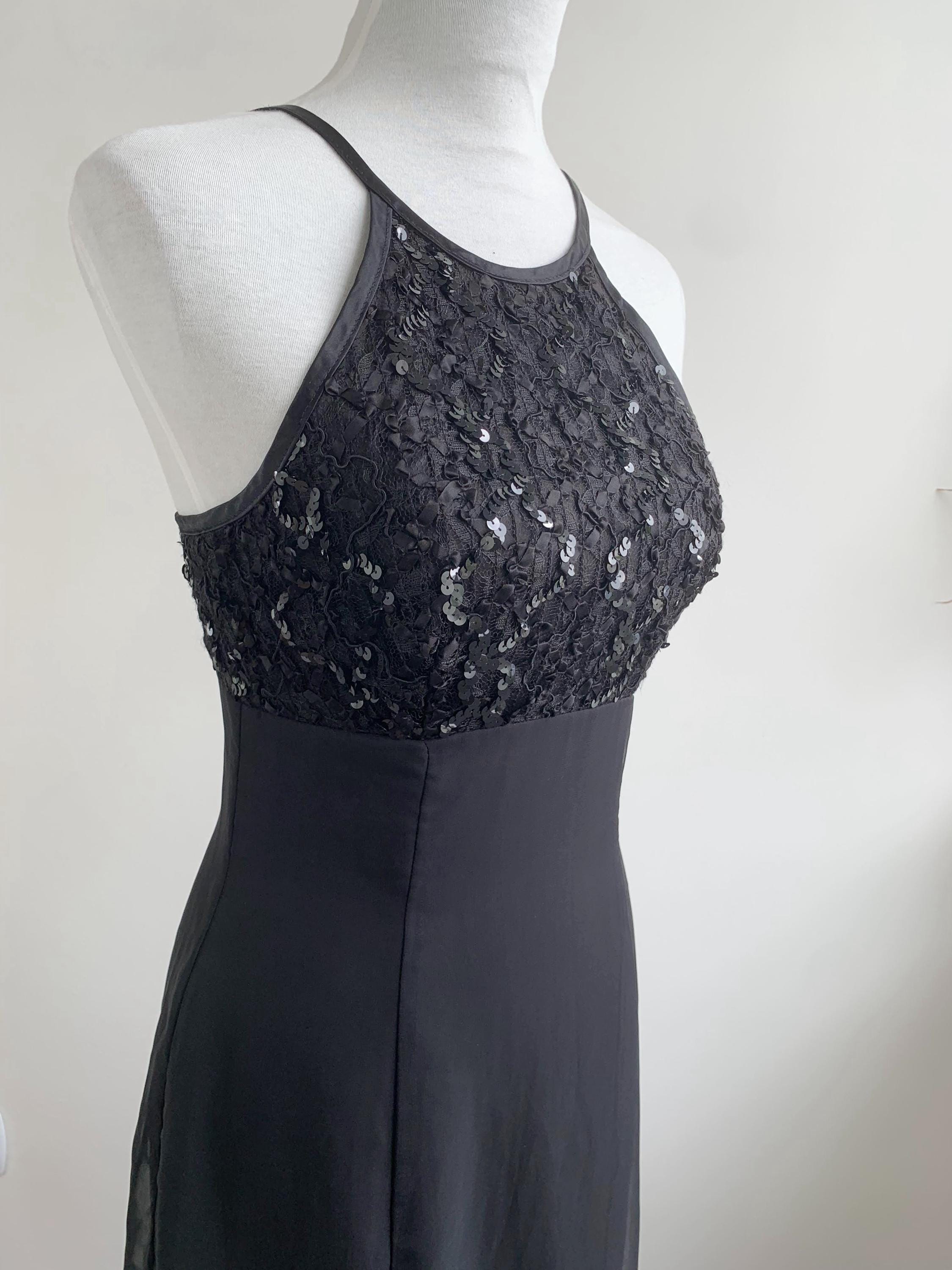 This stunning vintage De-Laru by Linda Bernell long black gown is a true showstopper from the 90s. The stylish halter neckline and sequin beaded top part create a captivating silhouette, while the sheer tulle fabric floats with every movement. The fitted bodice is subtly structured to enhance the figure, flowing into a long, dramatic maxi skirt. Perfect for a prom, formal event, or a special evening out, this elegant dress embodies the classic, slightly edgy glamour of the 90s era and would make an incredible addition to any vintage lover's collection.