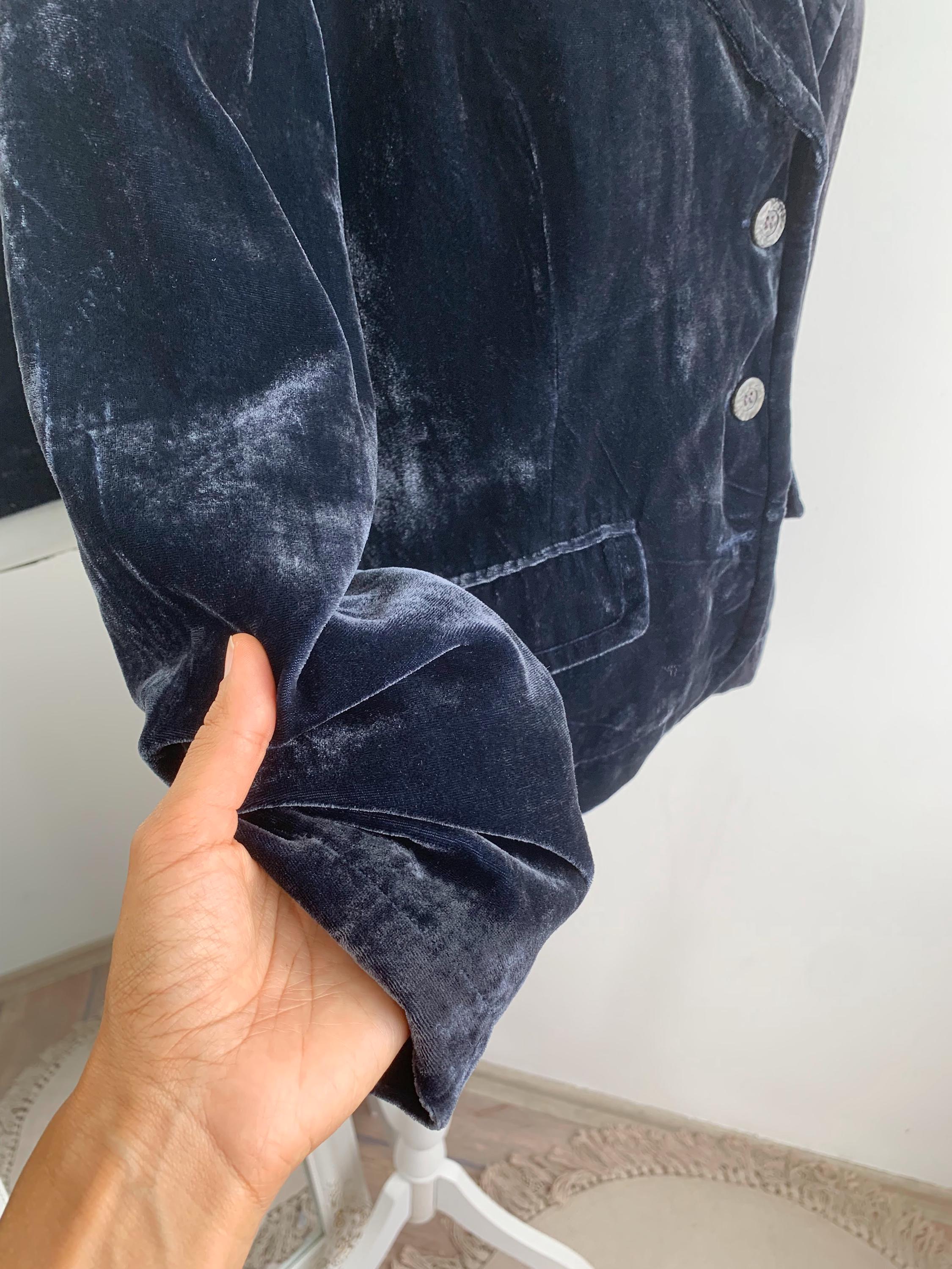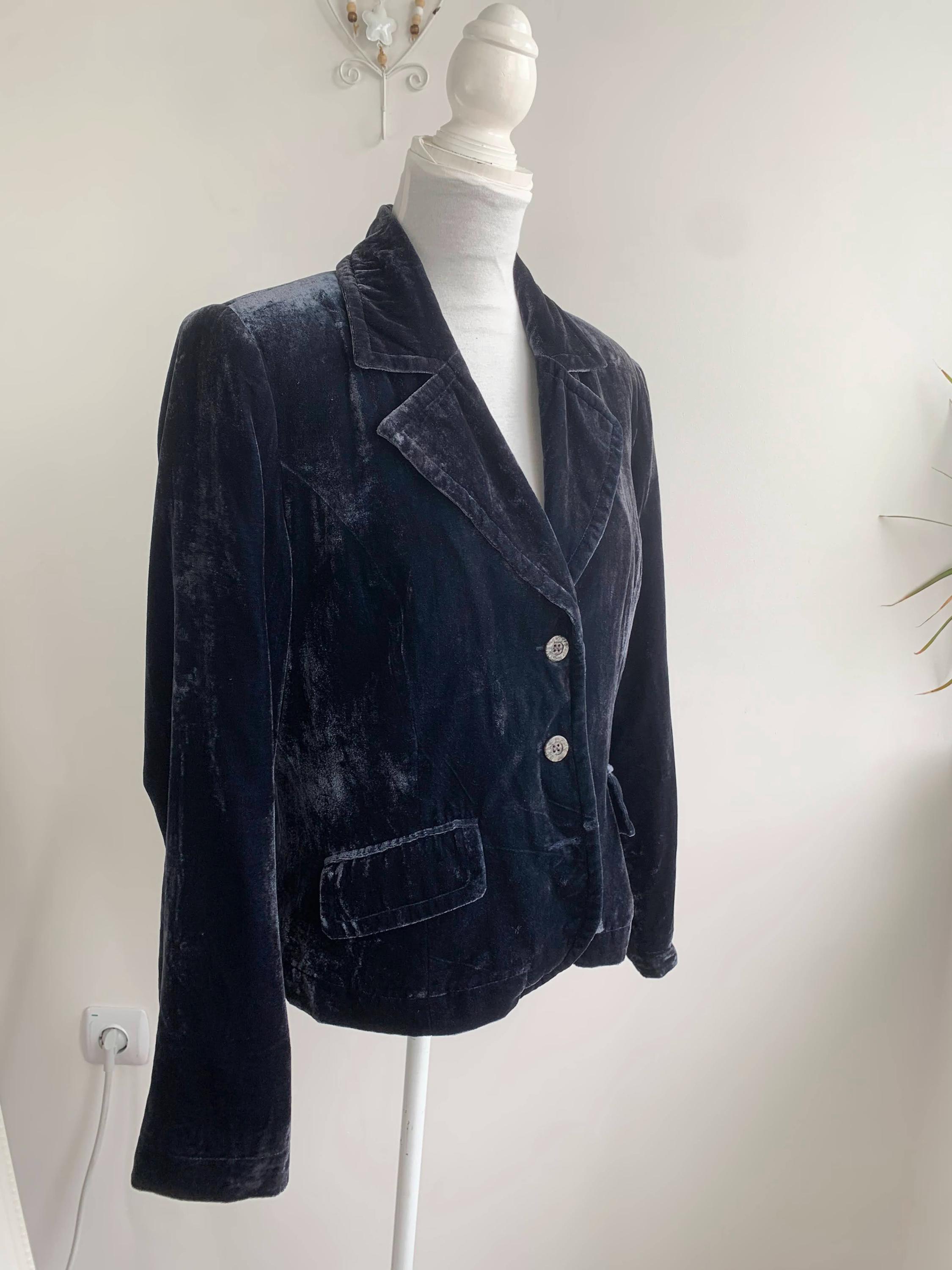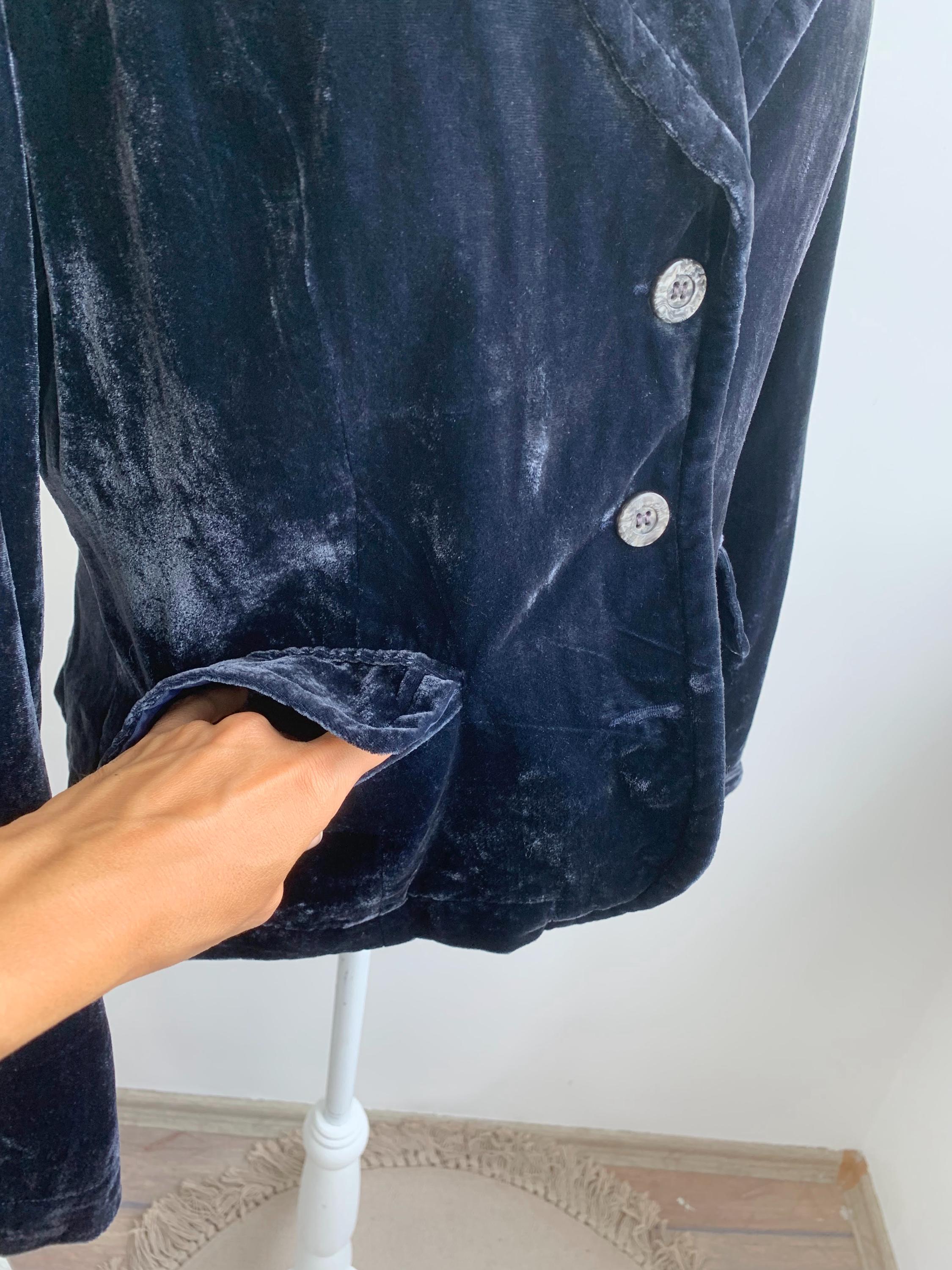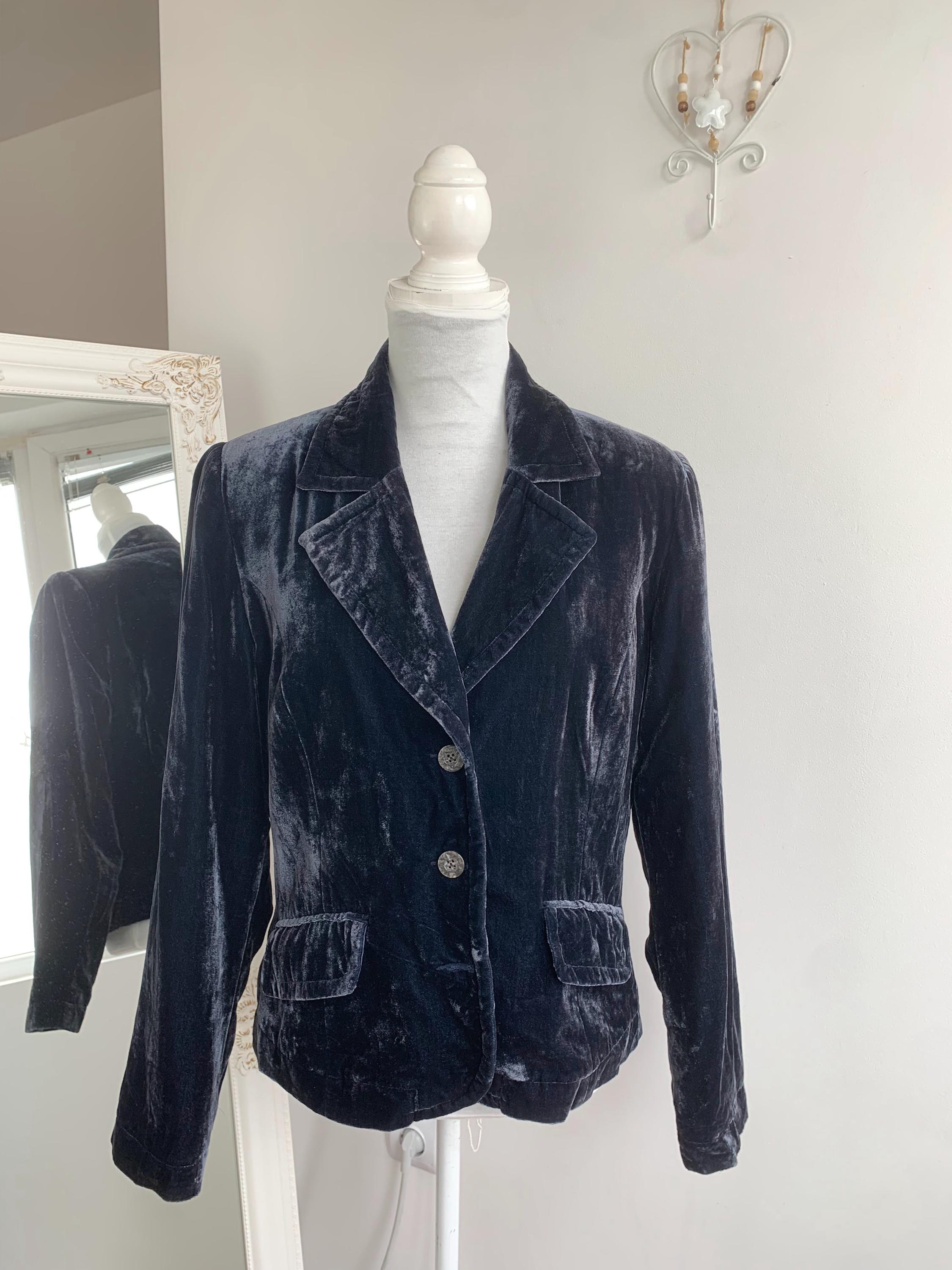 Step out in timeless elegance with this stunning vintage velvet blazer from the JENSEN brand in women's clothing size EUR 38 / fits like oversized M or even L. This jacket embodies a classic 90s silhouette with its structured shoulders and slightly oversized fit, perfect for layering and creating a powerful yet relaxed look. The deep dark navy color is rich and captivating, shifting beautifully in different lights to highlight the plush texture of the velvet.