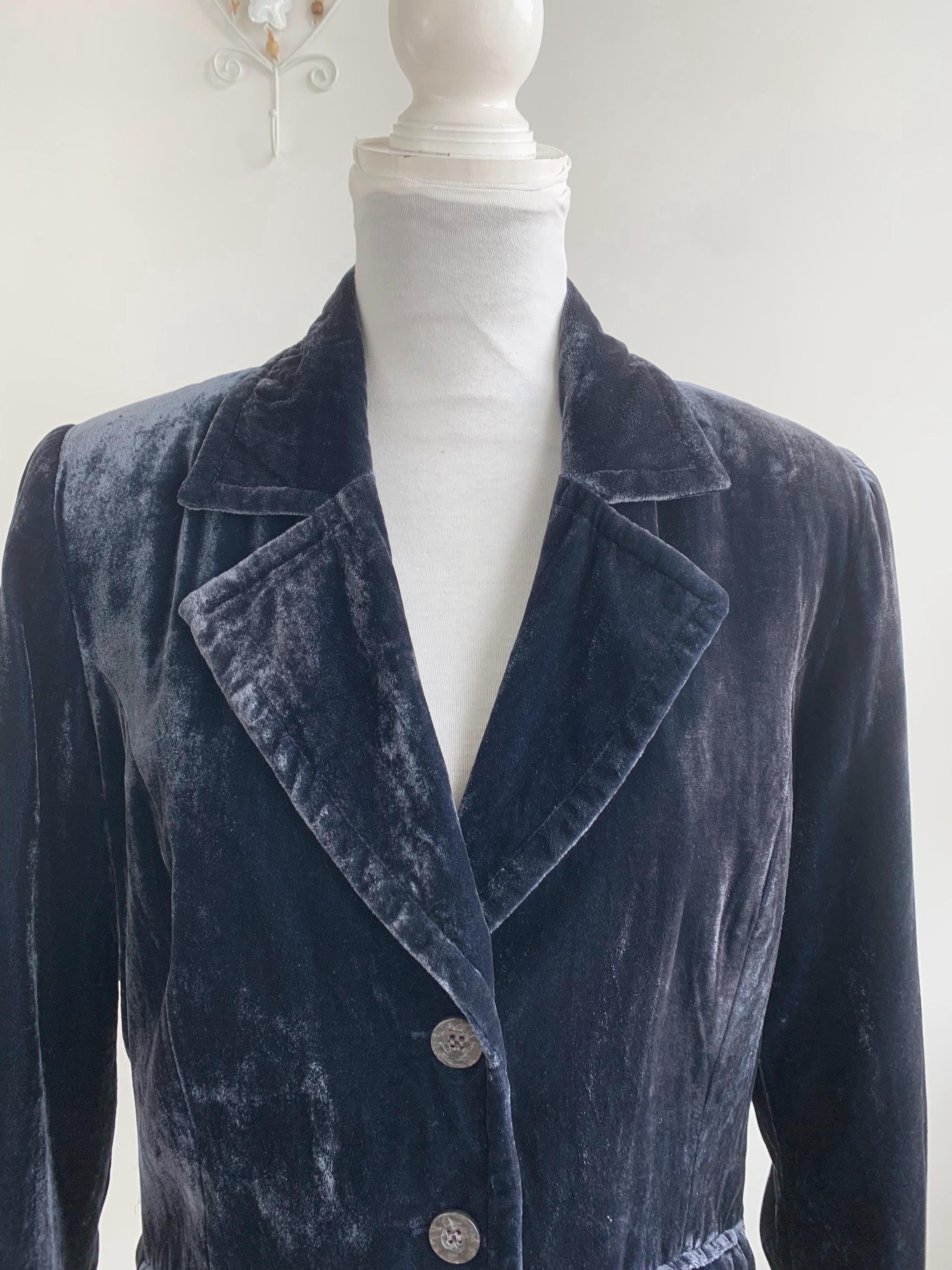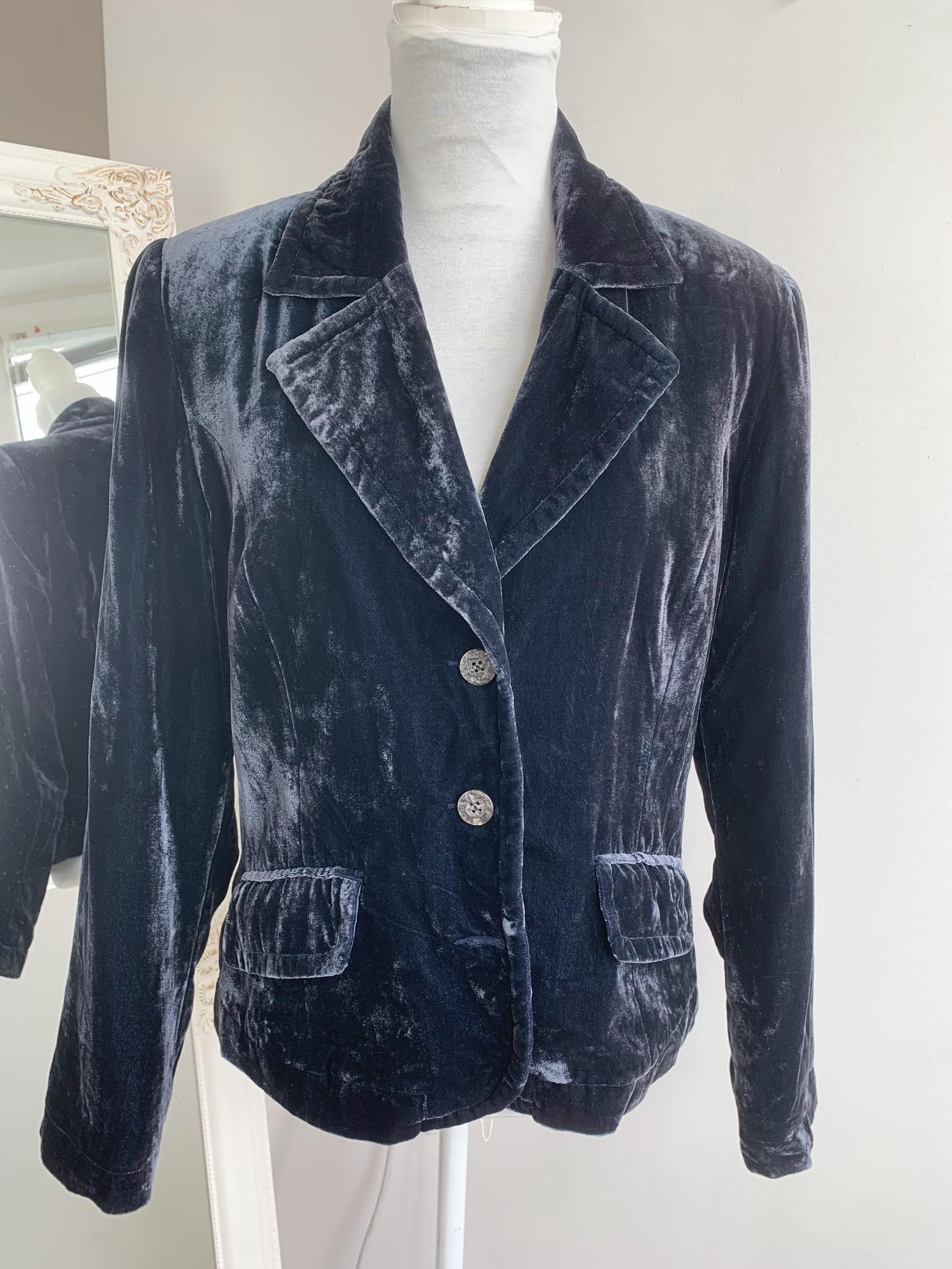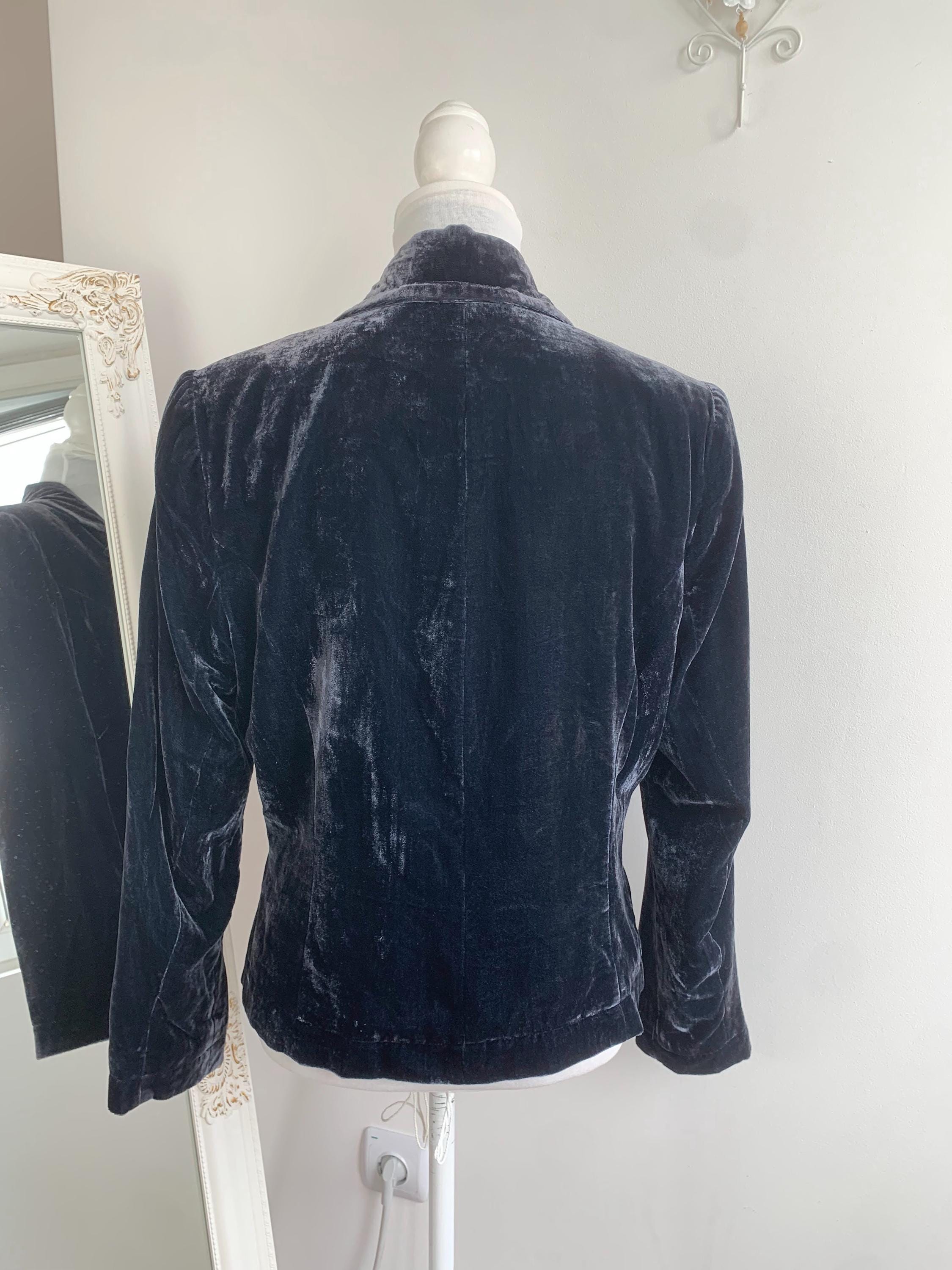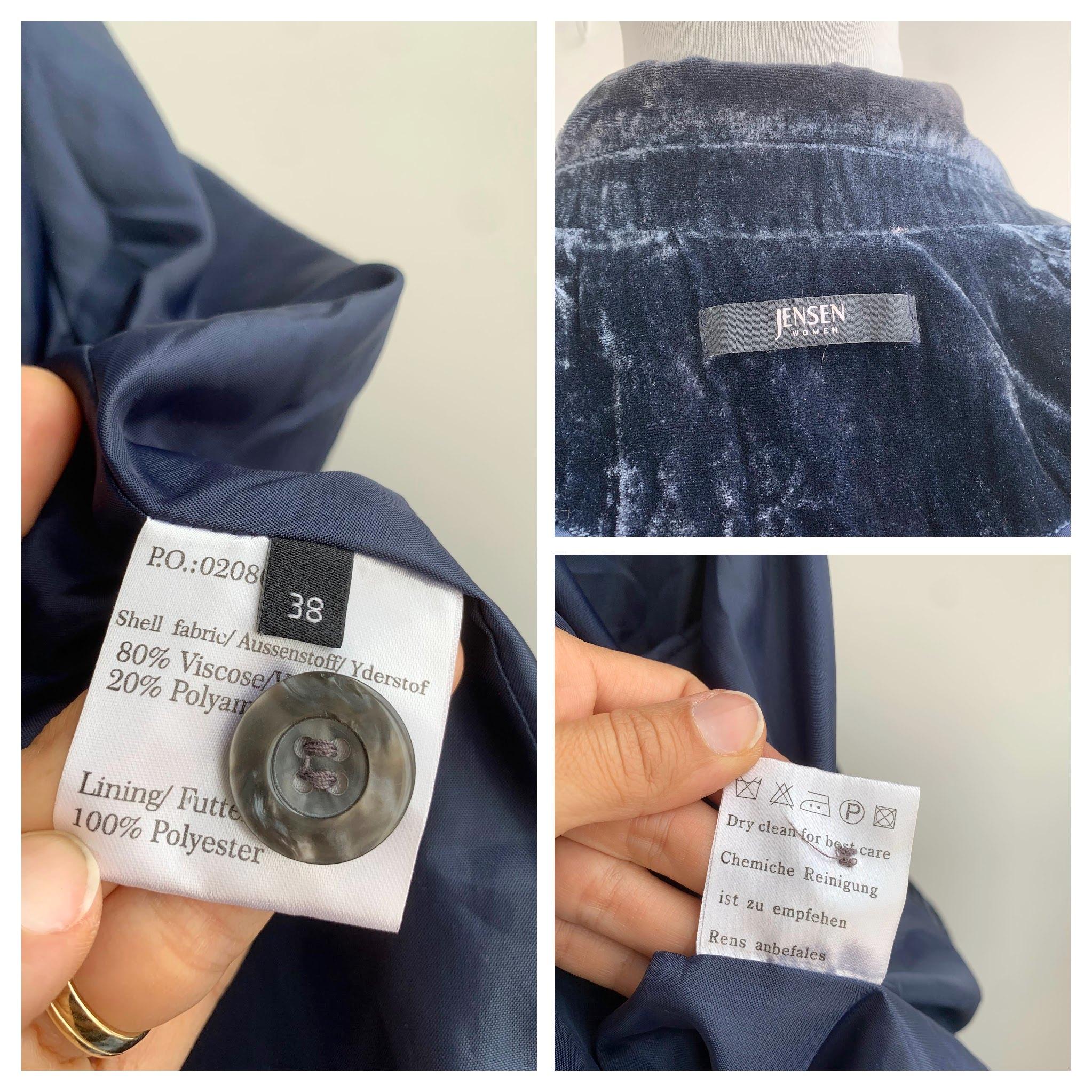 Step out in timeless elegance with this stunning vintage velvet blazer from the JENSEN brand in women's clothing size EUR 38 / fits like oversized M or even L. This jacket embodies a classic 90s silhouette with its structured shoulders and slightly oversized fit, perfect for layering and creating a powerful yet relaxed look. The deep dark navy color is rich and captivating, shifting beautifully in different lights to highlight the plush texture of the velvet.