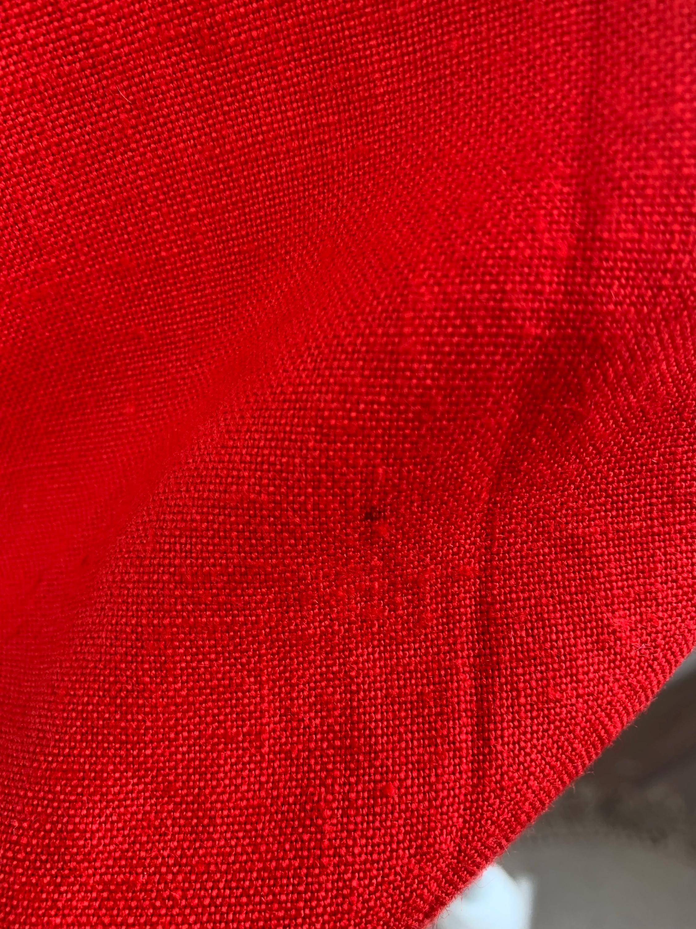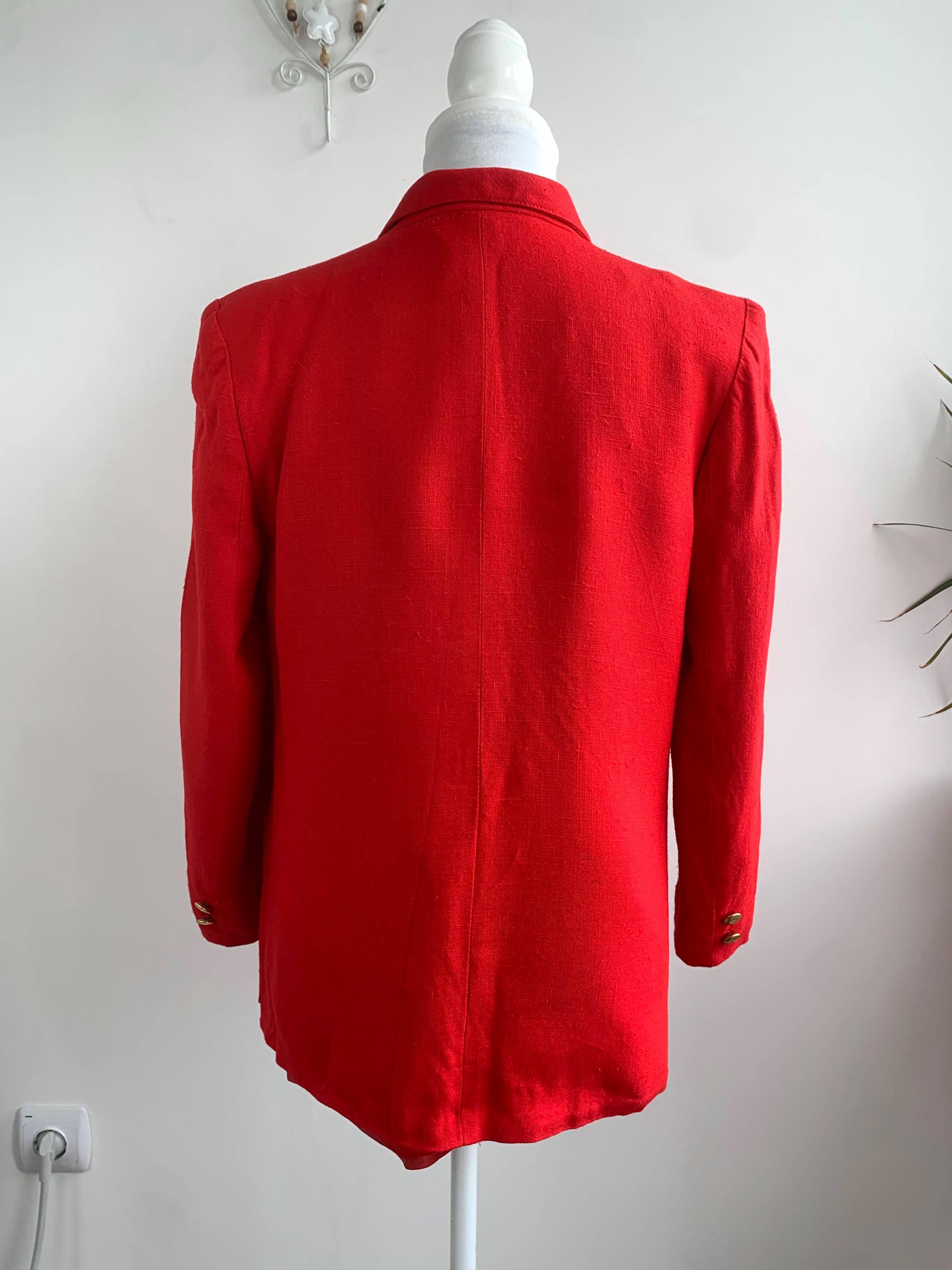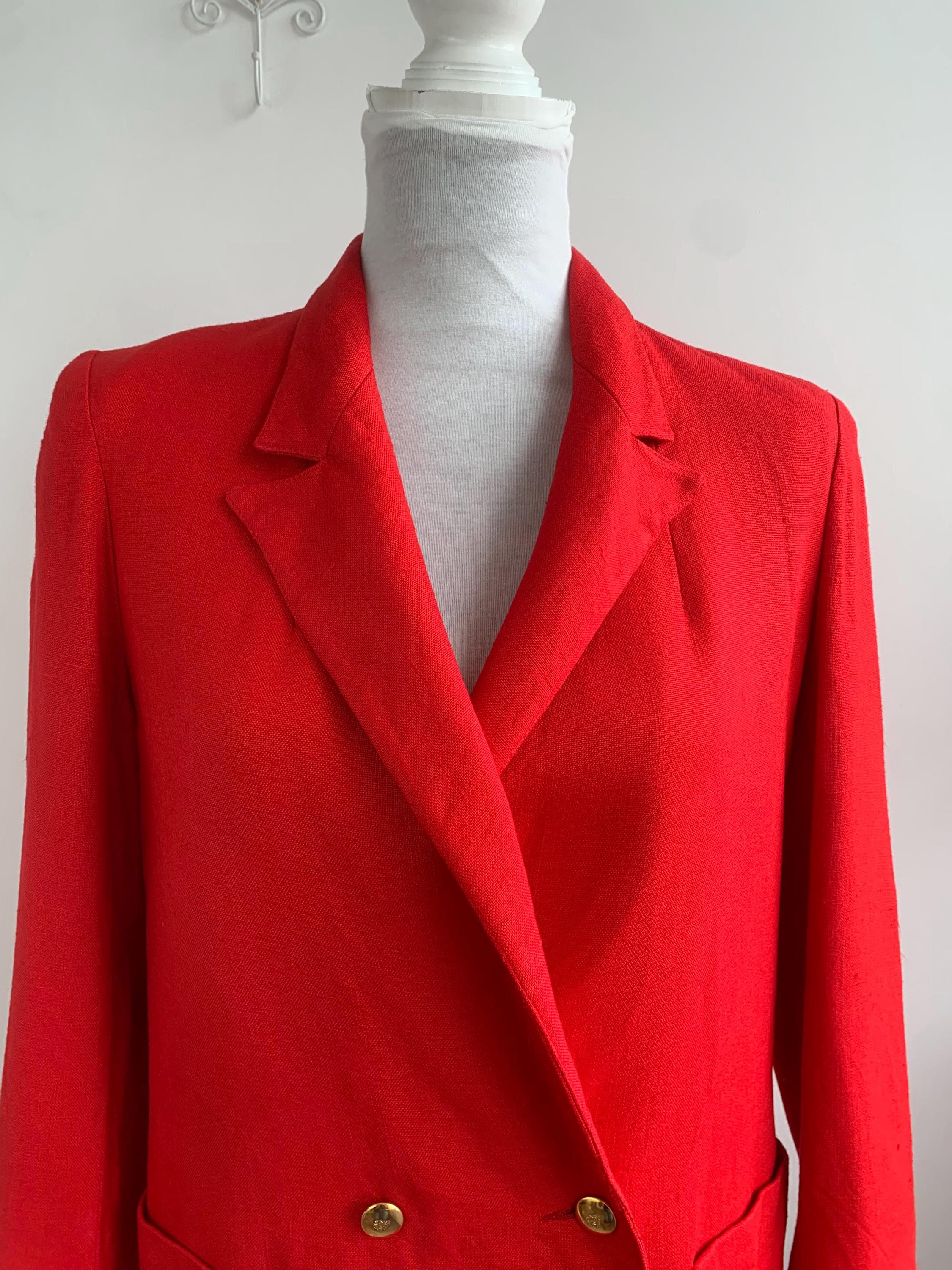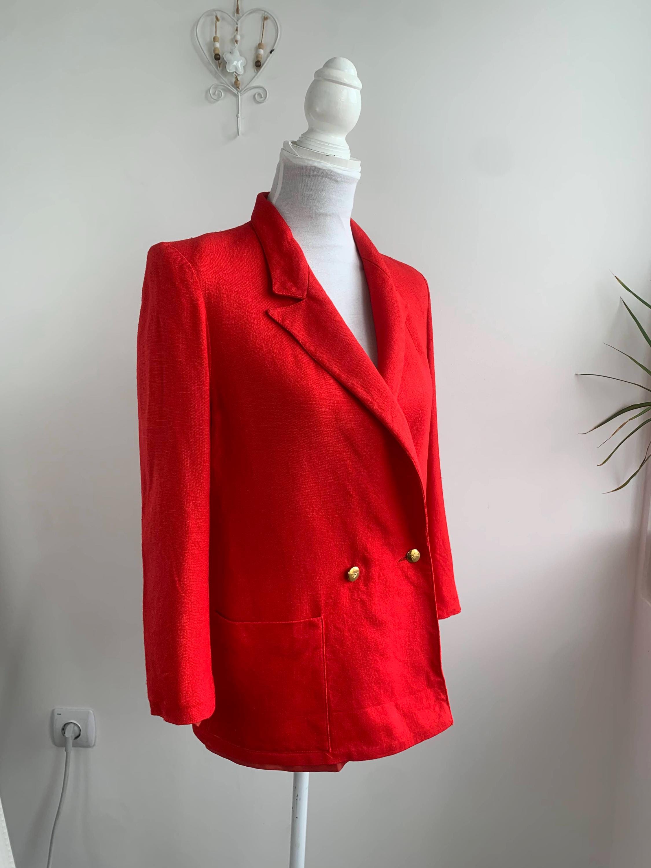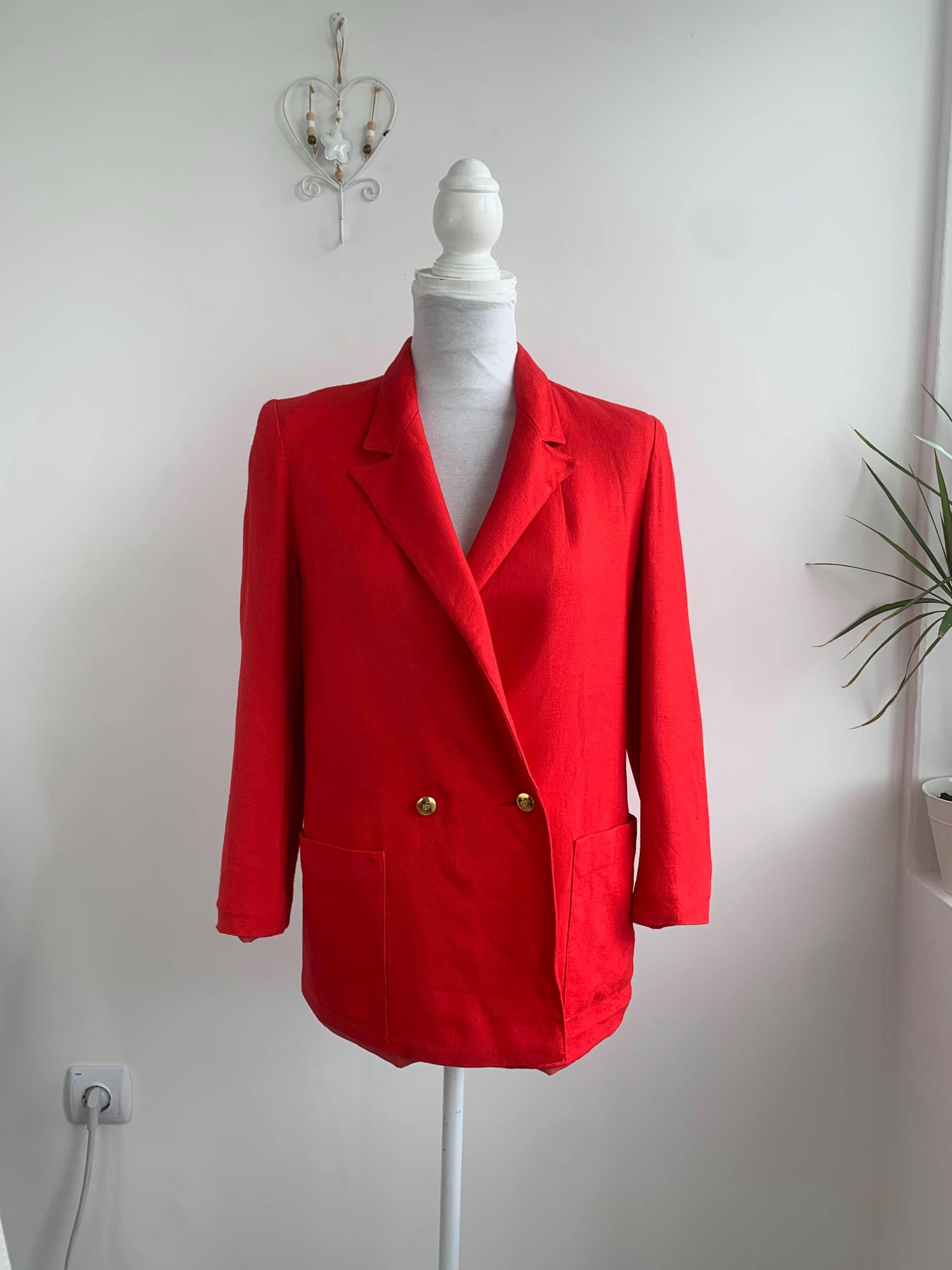 Step out in timeless style with this striking vintage red blazer in size M with bracelet sleeves, a true gem from the 90s. This isn't just a jacket; it's a statement piece that effortlessly combines classic tailoring with a relaxed, modern sensibility. Made with a comfortable linen feel viscose and polyester blend, it has a beautiful drape and a vibrant red hue that instantly elevates any outfit. The double breasted closure and subtle notch lapels give it a clean, sophisticated line, perfect for a professional setting or a chic casual look.