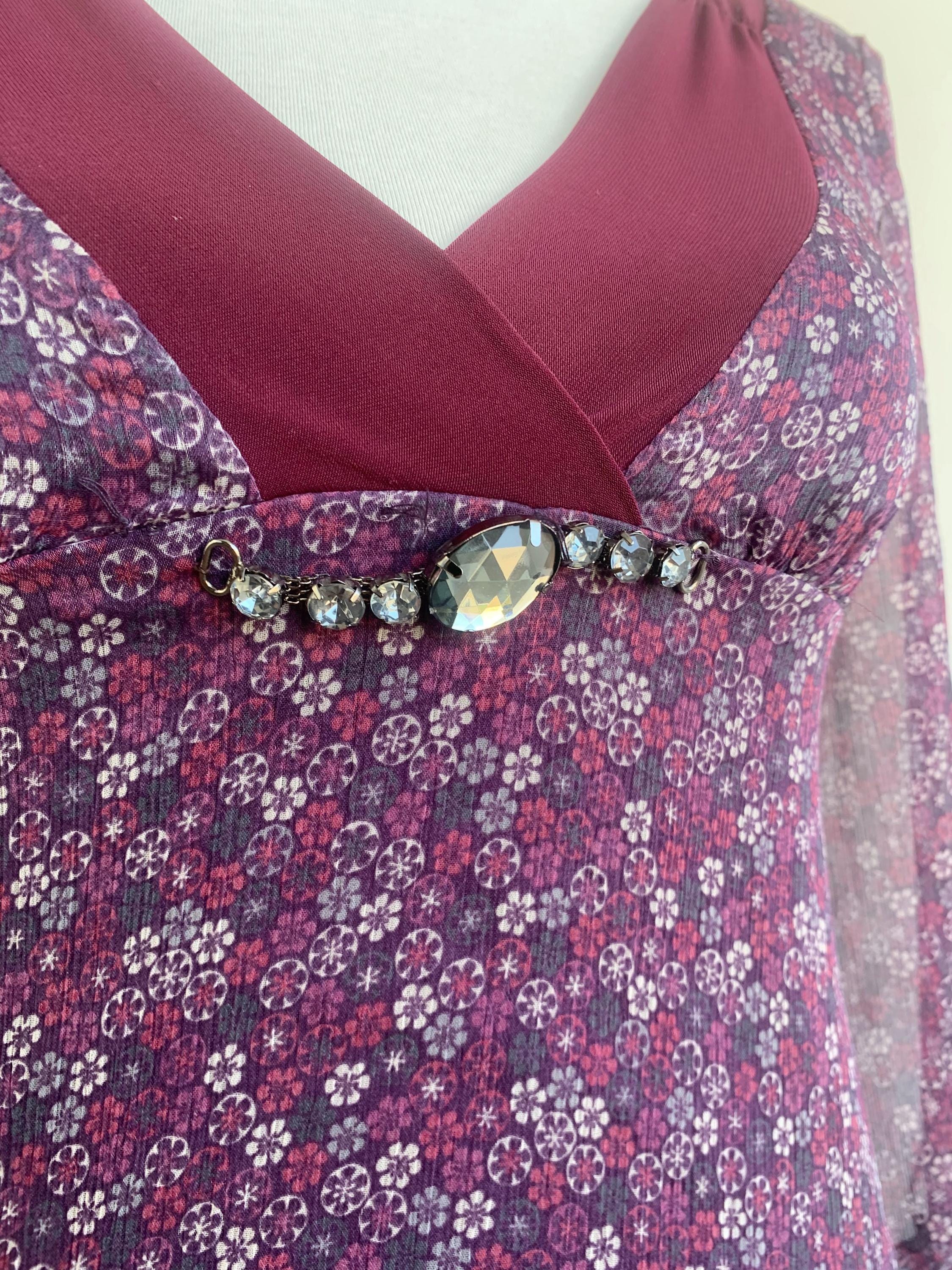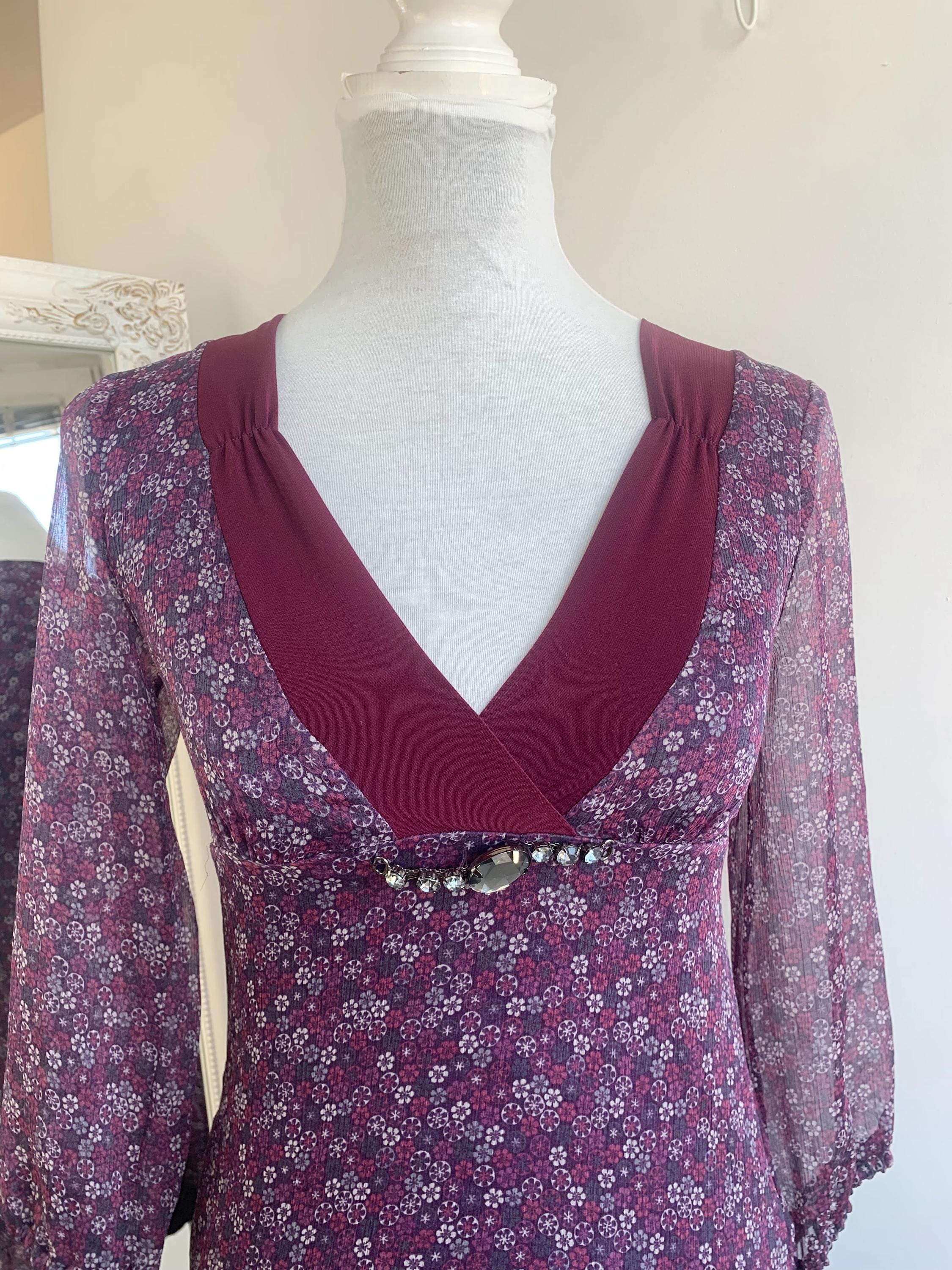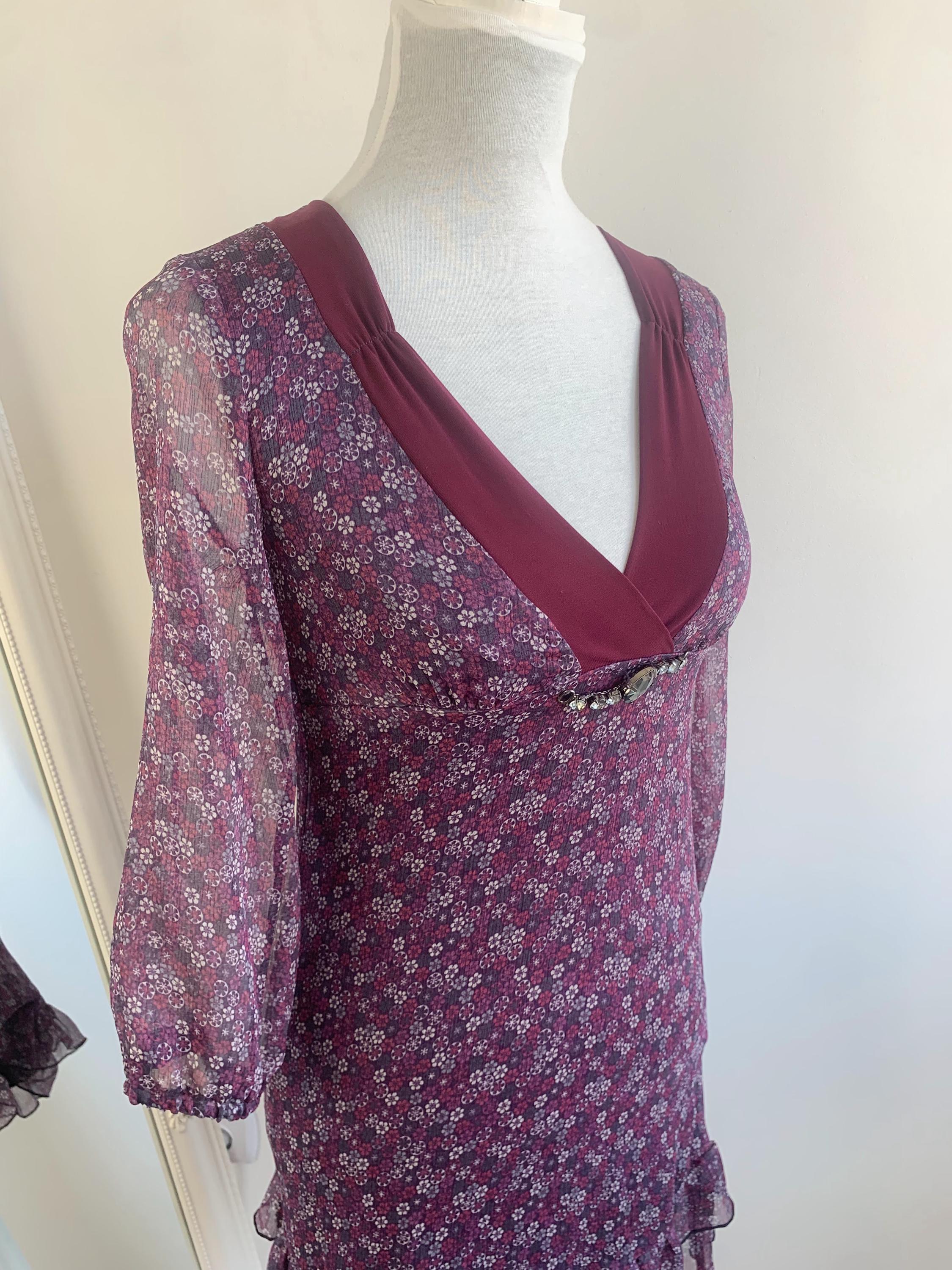 This is a charming vintage Motivi dress in size XS, a perfect piece for capturing that whimsical early 2000s aesthetic. This Y2K-era mini dress is a true gem, featuring a beautiful floral pattern in shades of purple, pink, and white. The sheer chiffon fabric creates a light and airy feel, making it ideal for warmer weather or layered styling. The dress has an empire waist silhouette, elegantly adorned with a striking rhinestone and beaded embellishment that adds a touch of sparkle and glamour. The V-neckline and gathered bust offer a flattering fit, while the 3/4 length sheer sleeves with elasticized cuffs and a double-tiered ruffled hem complete the romantic, boho-inspired look. The hidden side zip closure ensures a perfect fit.