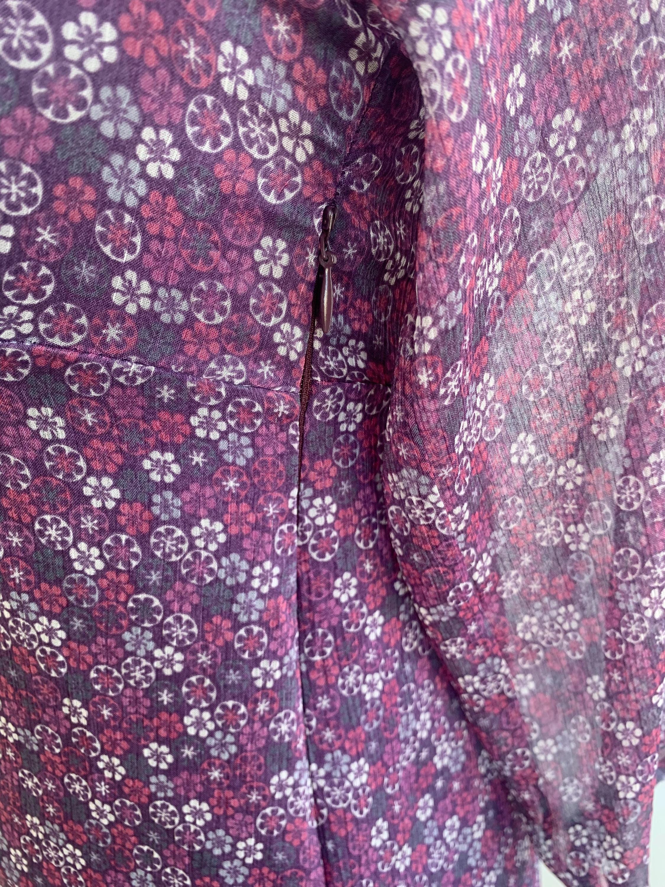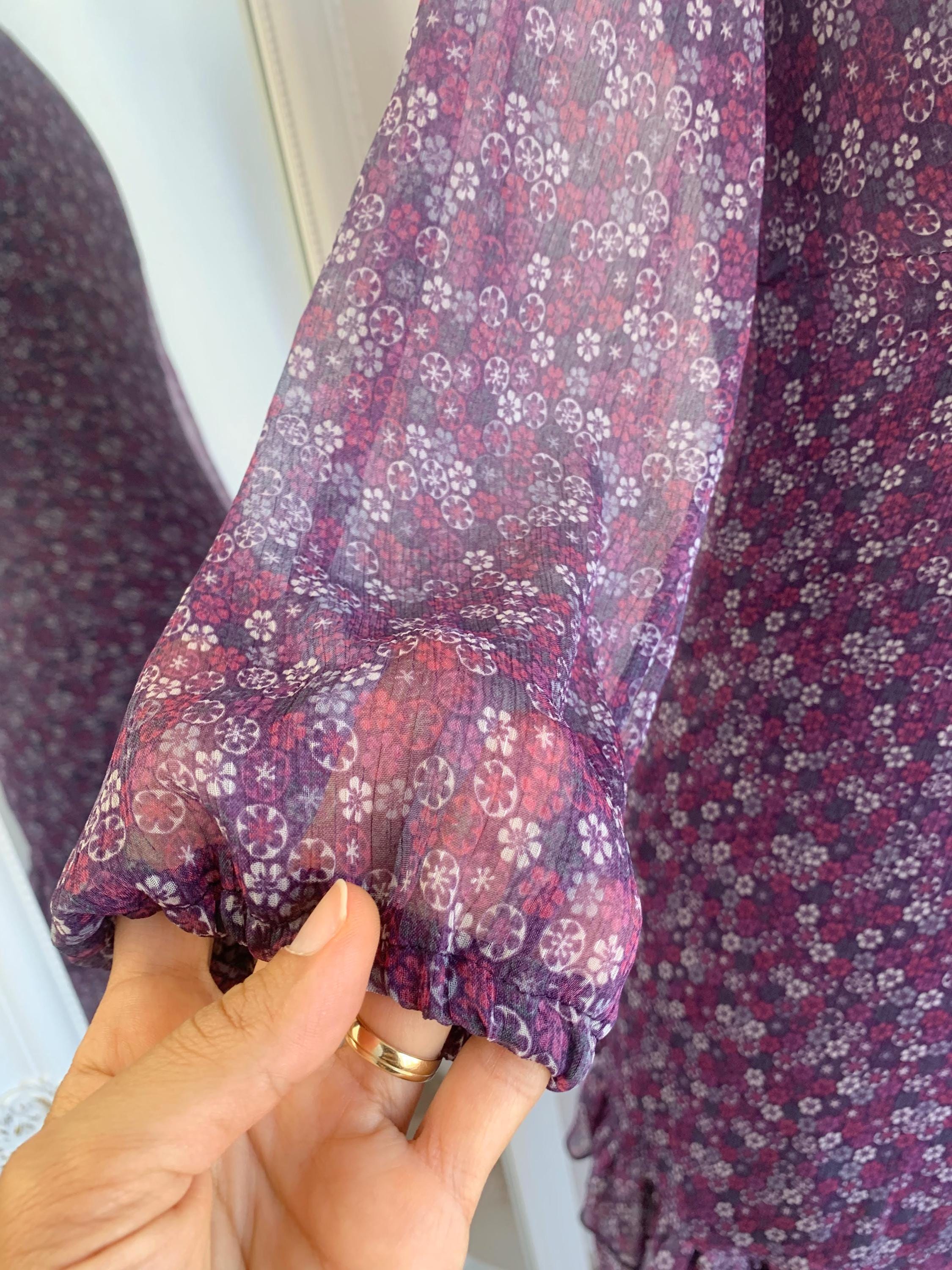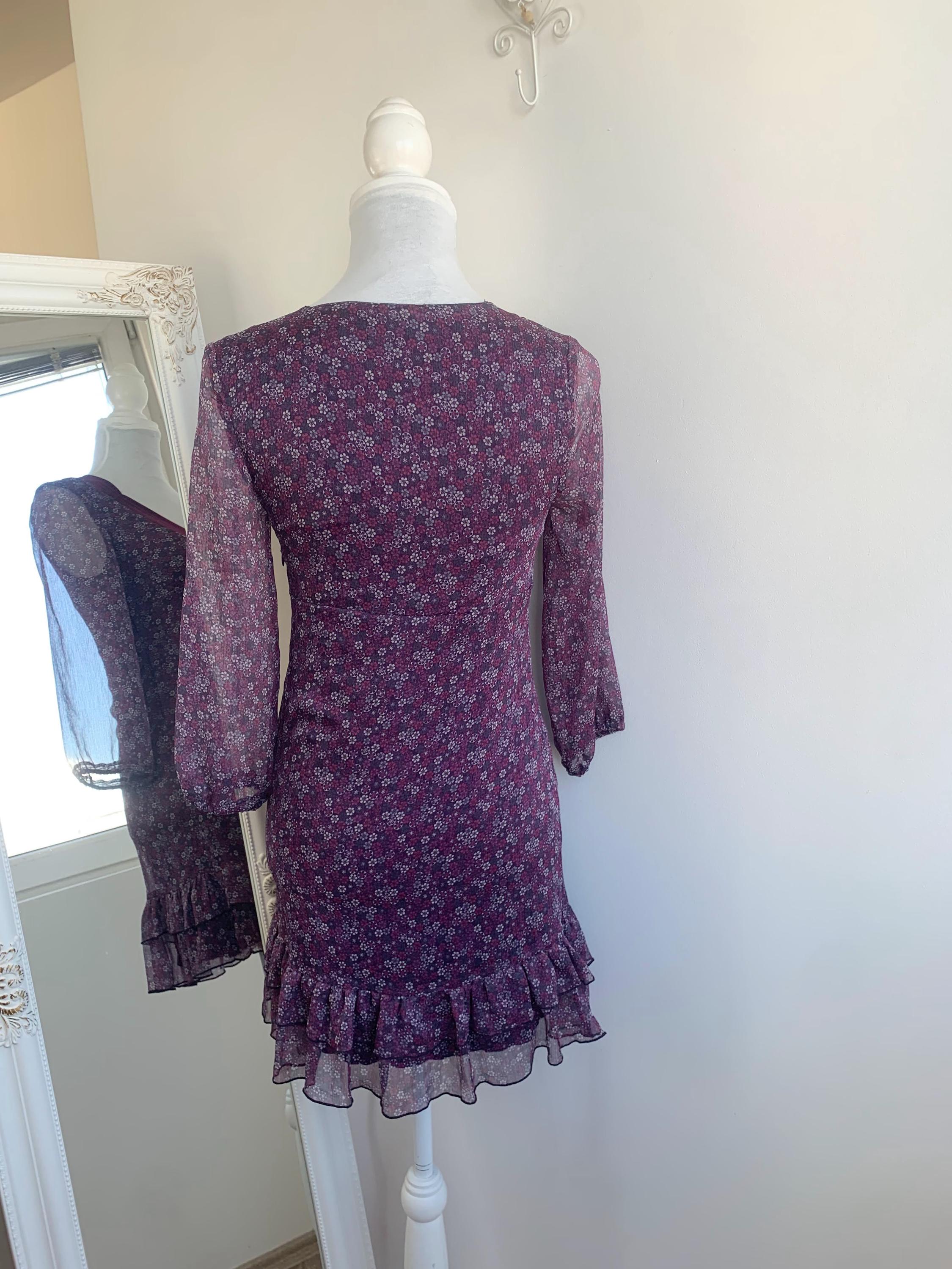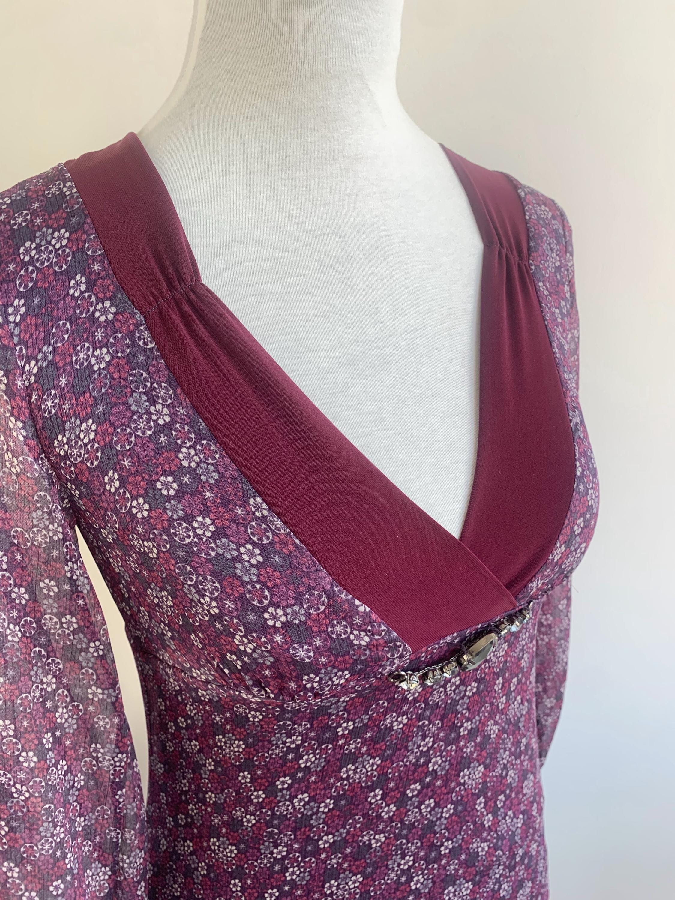 This is a charming vintage Motivi dress in size XS, a perfect piece for capturing that whimsical early 2000s aesthetic. This Y2K-era mini dress is a true gem, featuring a beautiful floral pattern in shades of purple, pink, and white. The sheer chiffon fabric creates a light and airy feel, making it ideal for warmer weather or layered styling. The dress has an empire waist silhouette, elegantly adorned with a striking rhinestone and beaded embellishment that adds a touch of sparkle and glamour. The V-neckline and gathered bust offer a flattering fit, while the 3/4 length sheer sleeves with elasticized cuffs and a double-tiered ruffled hem complete the romantic, boho-inspired look. The hidden side zip closure ensures a perfect fit.