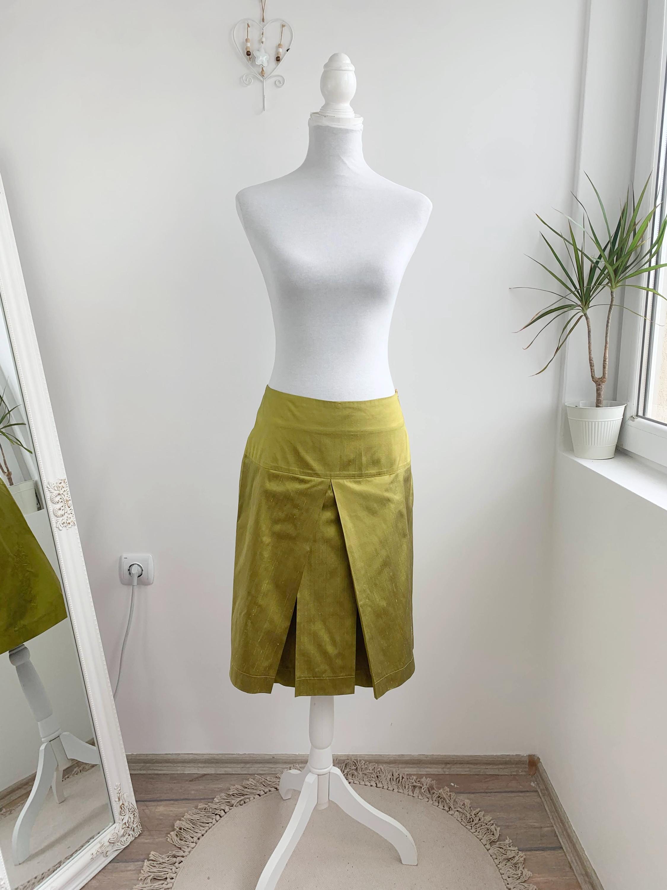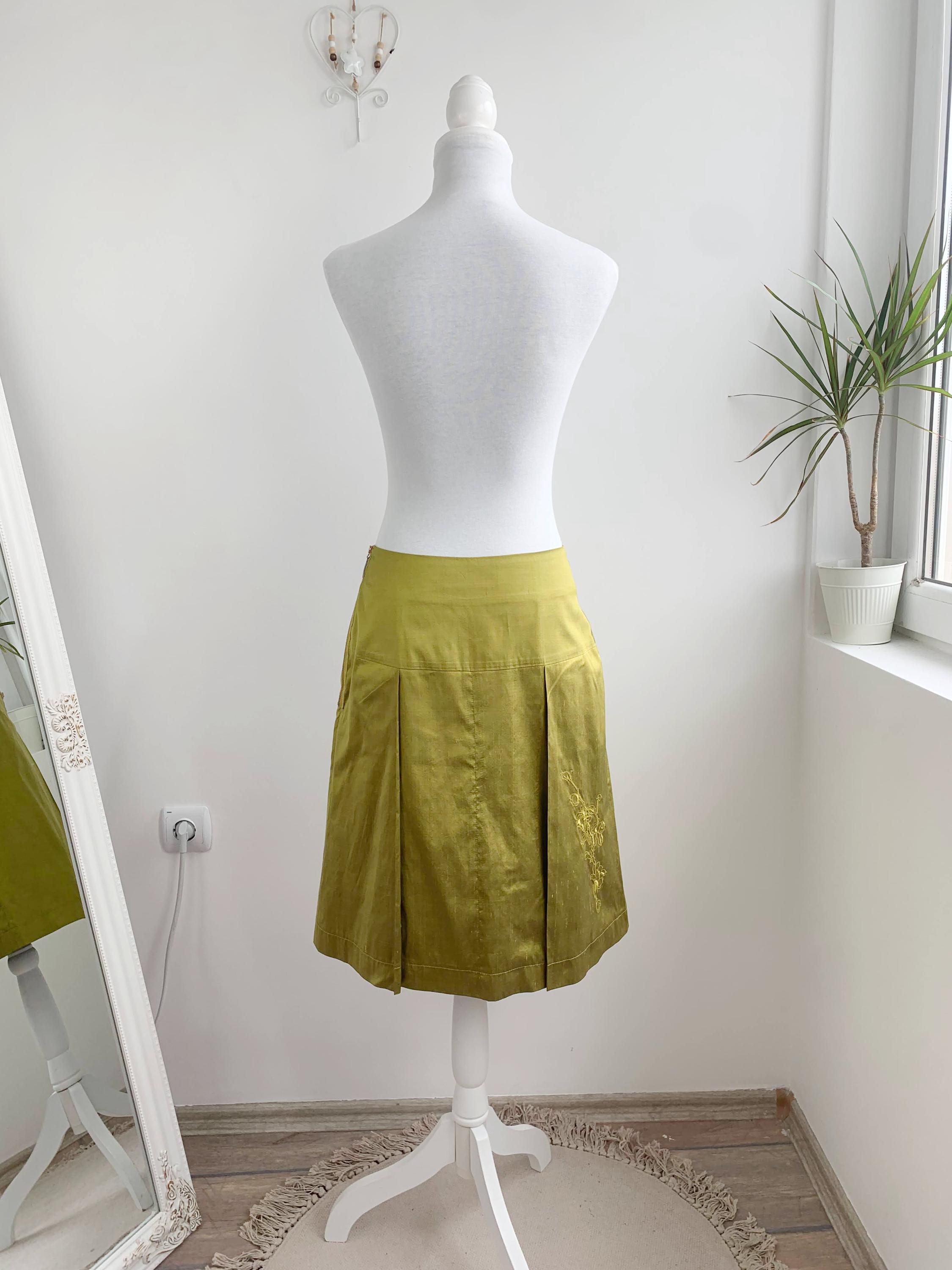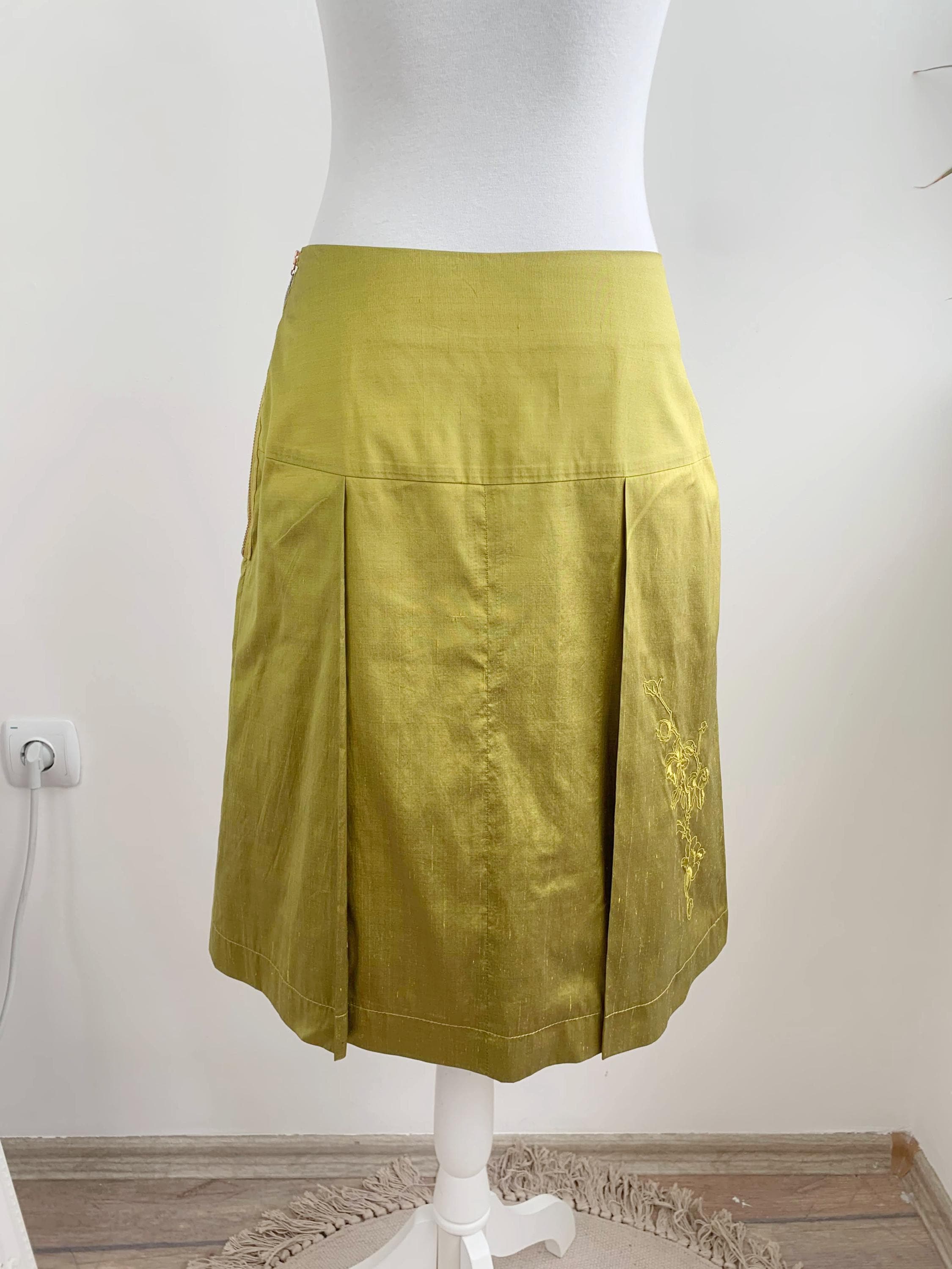 This vintage olive green skirt by Eva Claudi is a timeless and elegant piece perfect for collectors and lovers of unique fashion. Featuring a structured silhouette with a deep box pleat at the front, this skirt offers a flattering fit and a touch of refined detail. The delicate floral embroidery at the back, adds an extra eye catching detail. The subtle sheen of the fabric elevates its look, making it versatile enough to wear for both everyday chic styling and special occasions. This silk midi skirt has size zip closure for a perfect fit. The size marked is EUR 38, which fits like size M. Please check the measurements below.