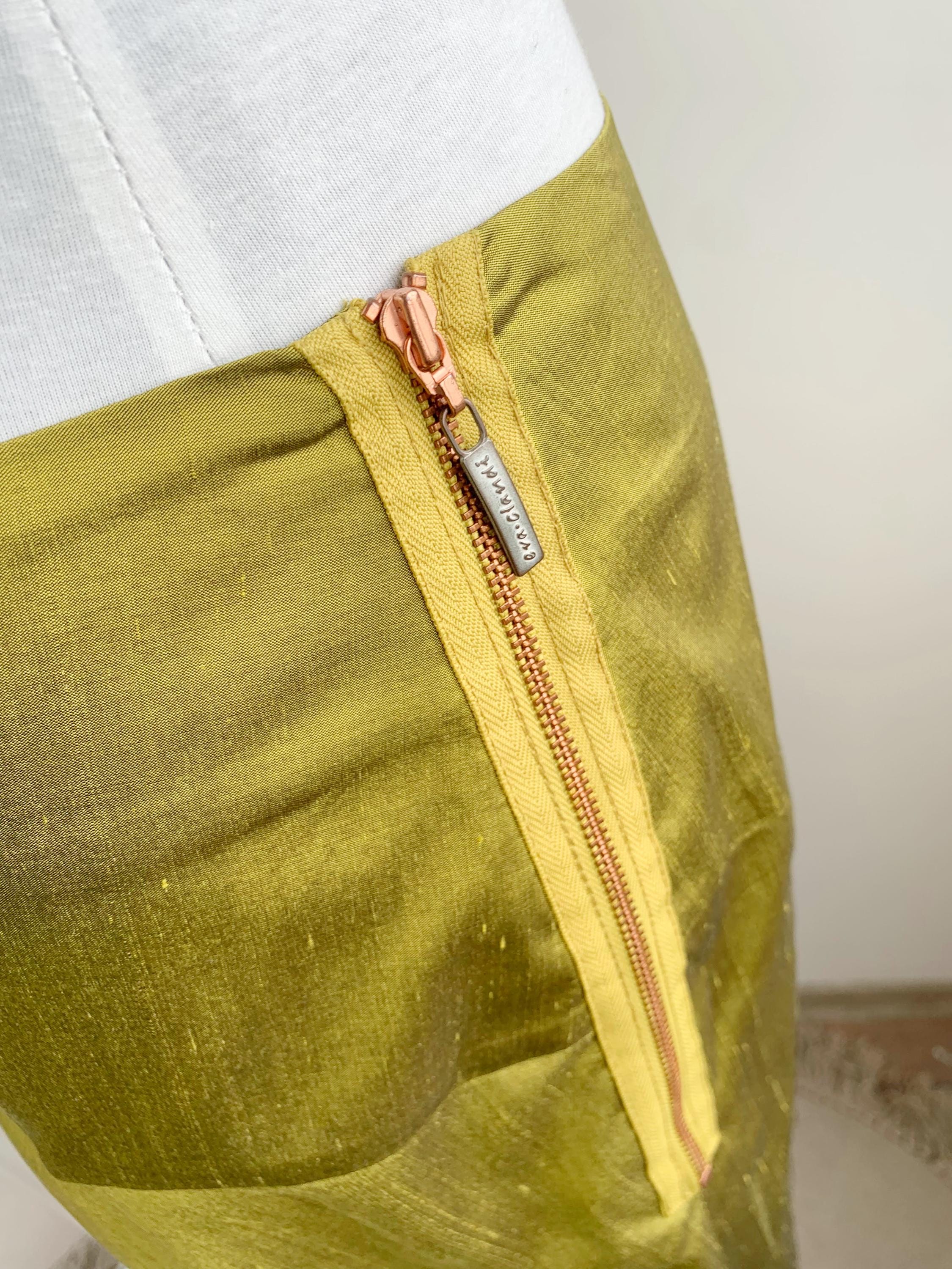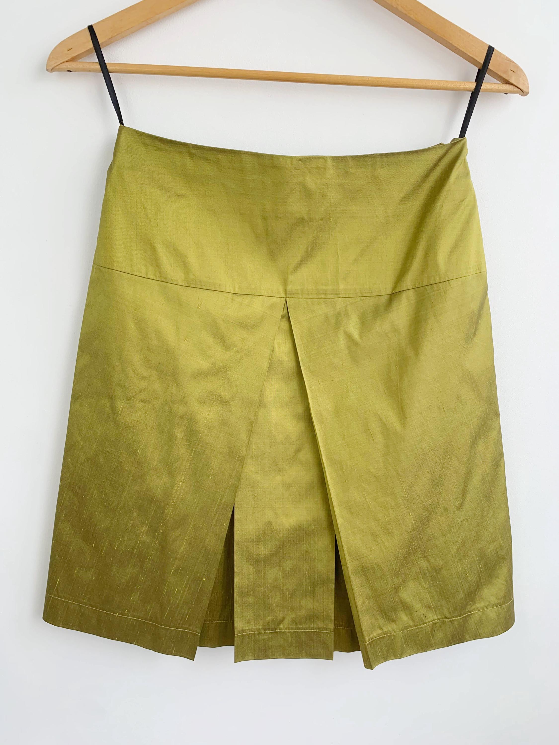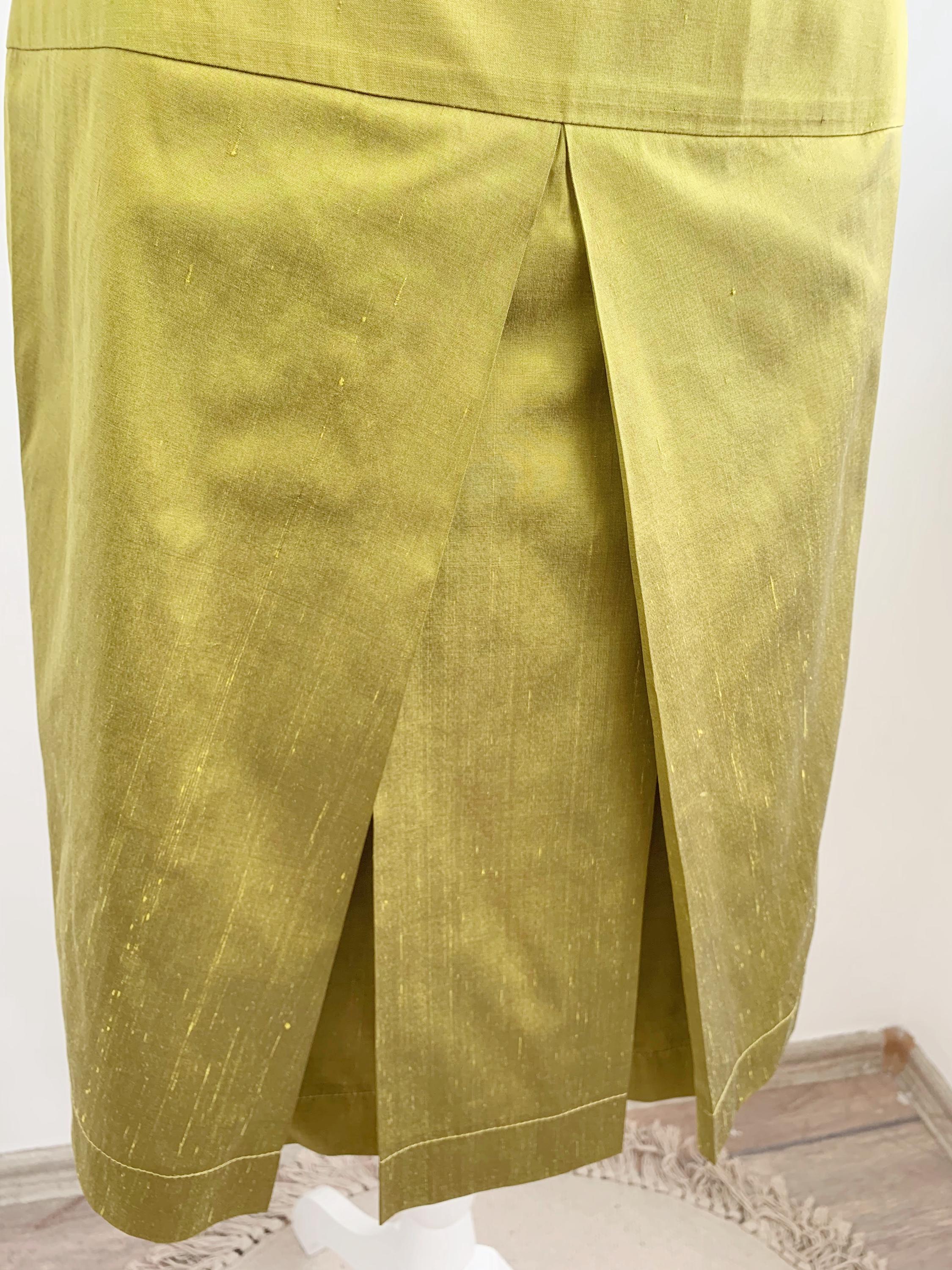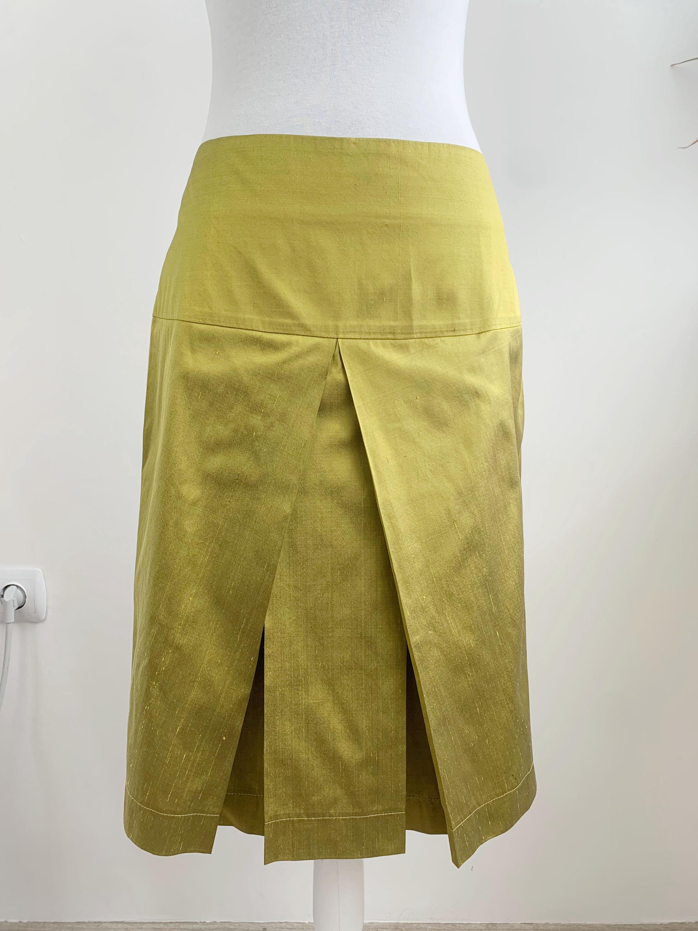 This vintage olive green skirt by Eva Claudi is a timeless and elegant piece perfect for collectors and lovers of unique fashion. Featuring a structured silhouette with a deep box pleat at the front, this skirt offers a flattering fit and a touch of refined detail. The delicate floral embroidery at the back, adds an extra eye catching detail. The subtle sheen of the fabric elevates its look, making it versatile enough to wear for both everyday chic styling and special occasions. This silk midi skirt has size zip closure for a perfect fit. The size marked is EUR 38, which fits like size M. Please check the measurements below.