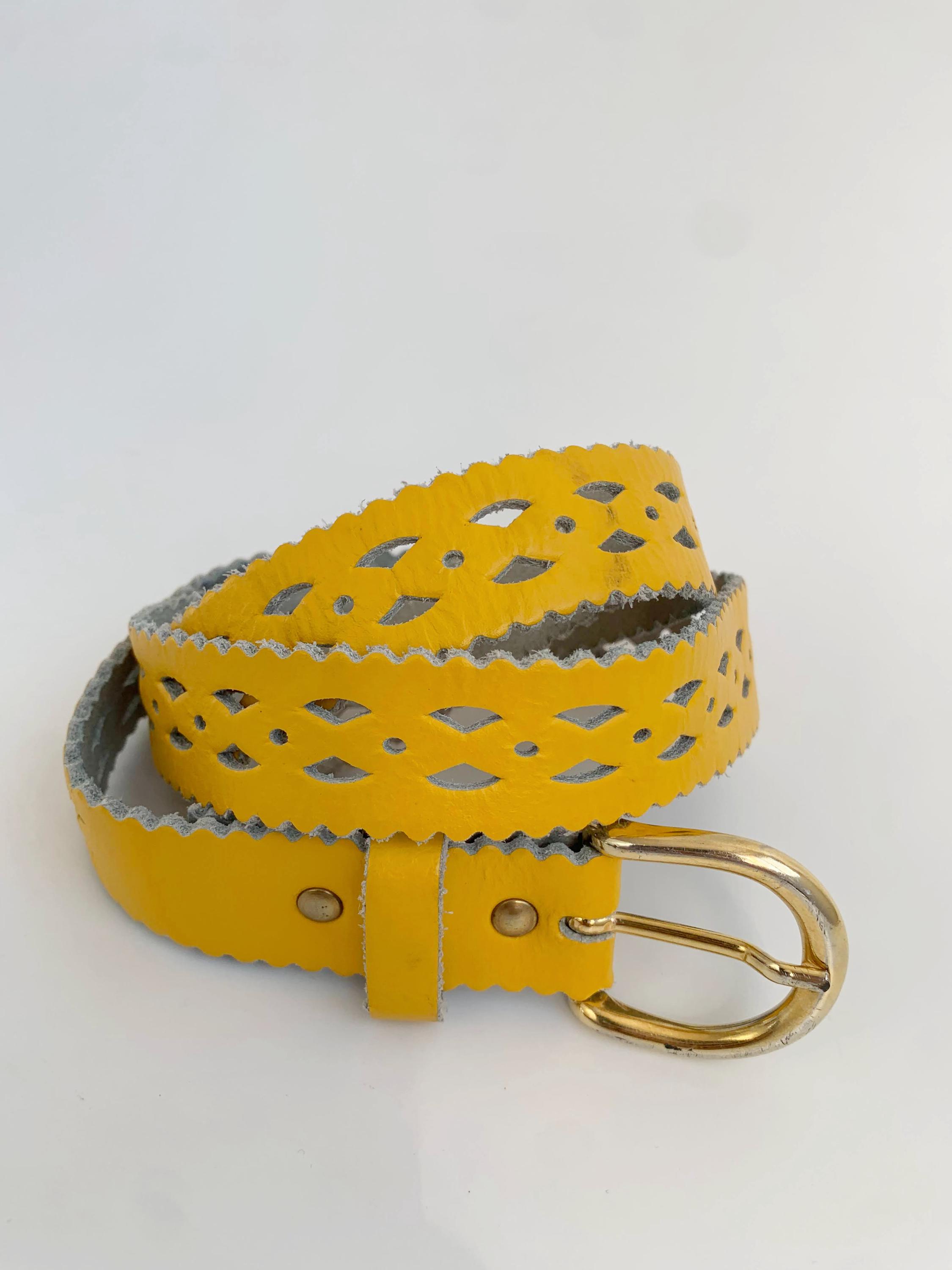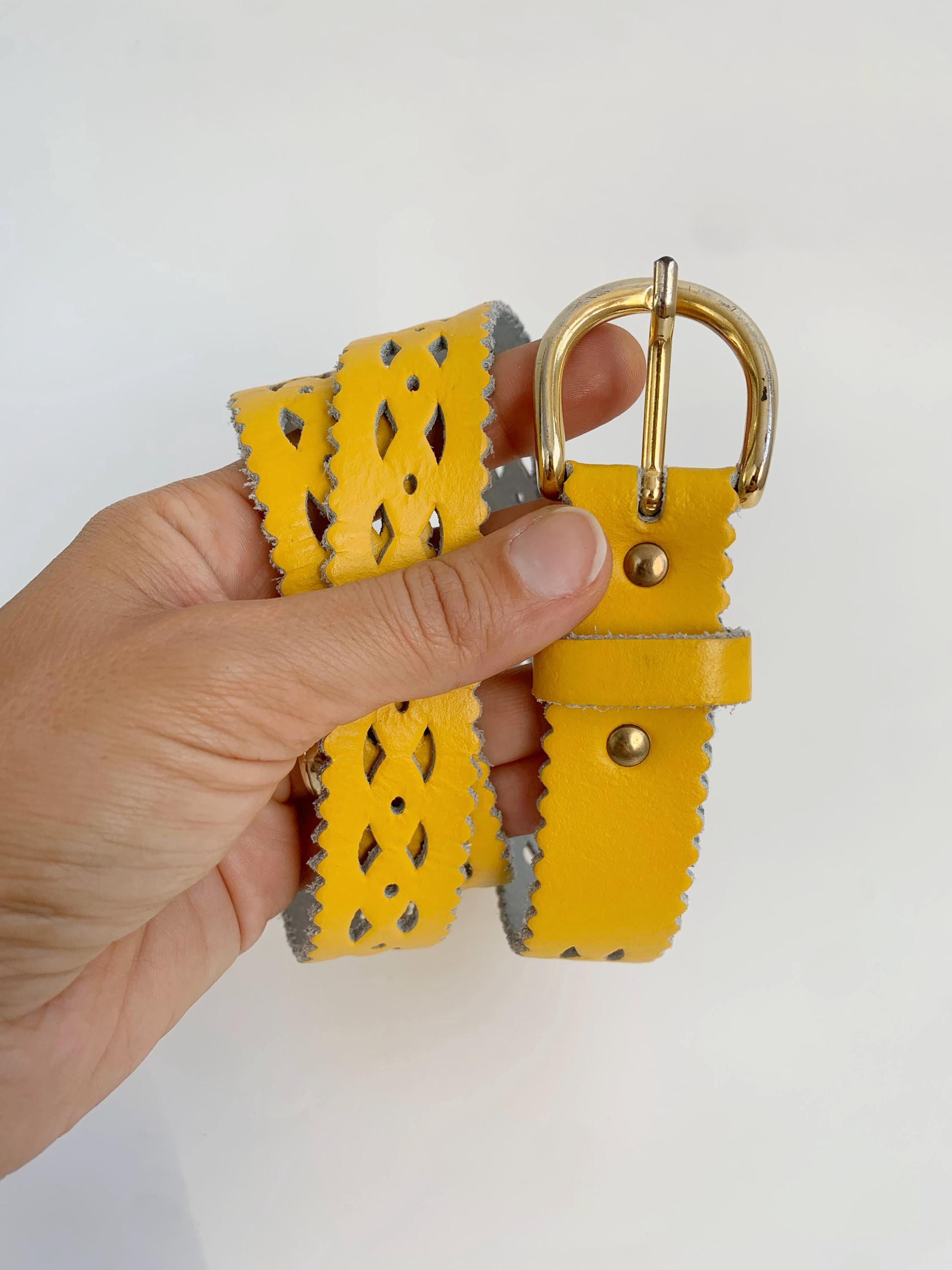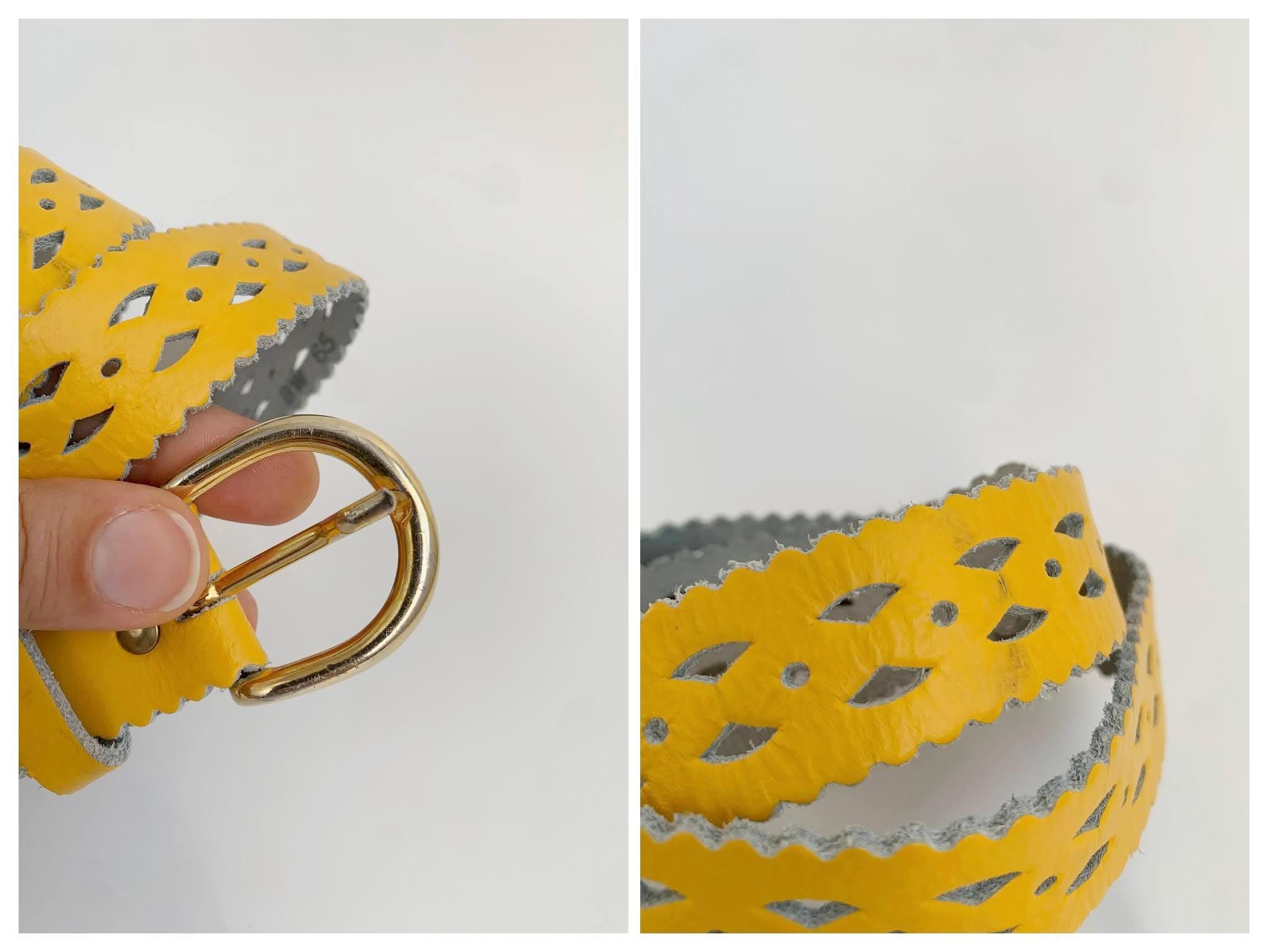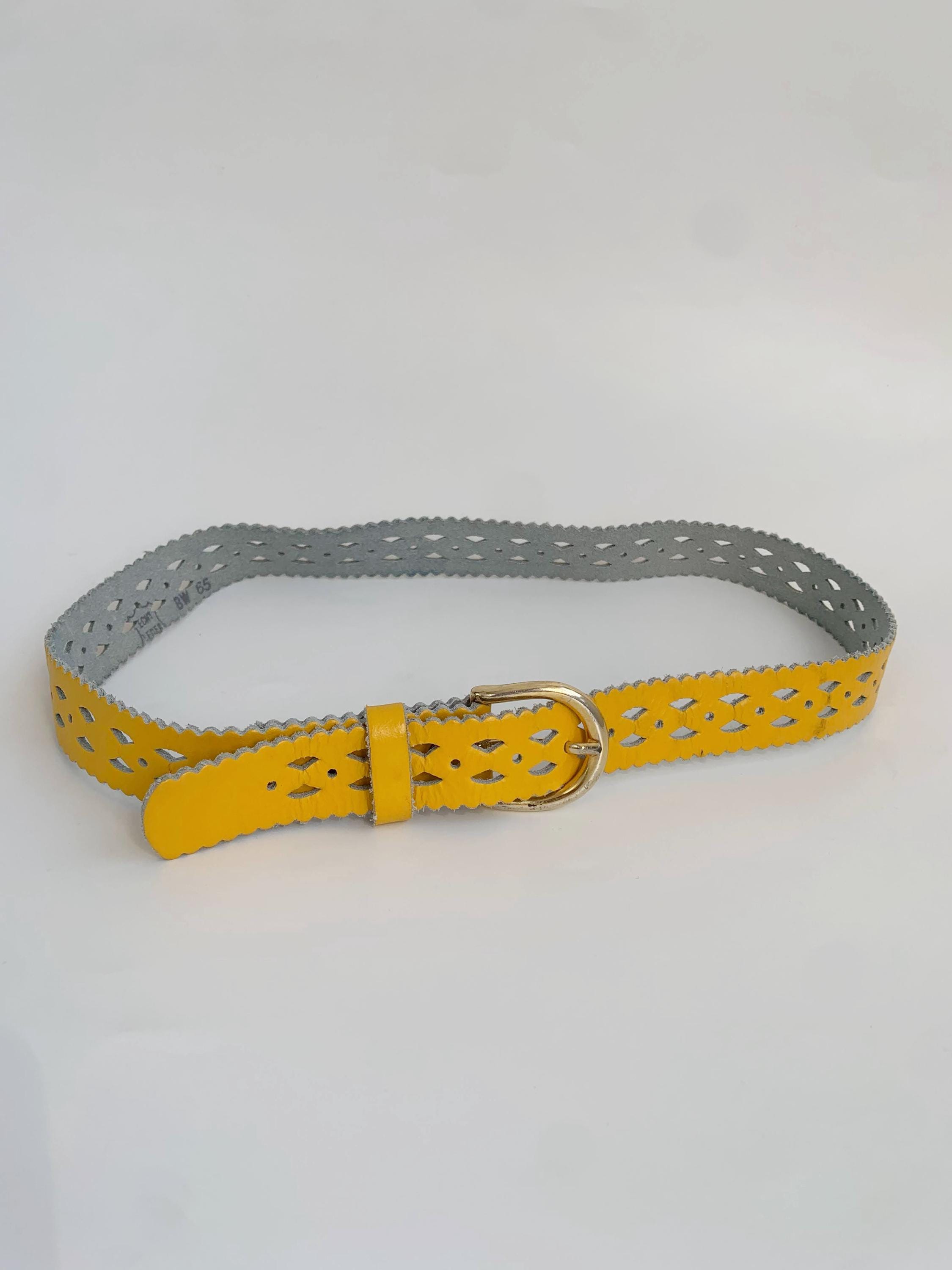 Add a pop of vibrant color and unique style to your outfit with this stunning vintage 80s yellow leather belt for women in size 65 cm / 25.5" . Crafted from genuine leather, this eye-catching accessory features intricate cut out designs and playful scalloped edges, giving it a distinct bohemian flair. The eye catching yellow shade is perfect for adding a sunny, cheerful touch to dresses, skirts, or high-waisted jeans. The gold-tone buckle is a classic touch, and the craftsmanship of this piece truly shows its quality and durability. Whether you’re looking to cinch a flowy dress or complete a retro-inspired look, this yellow leather belt is a chic and sustainable choice.